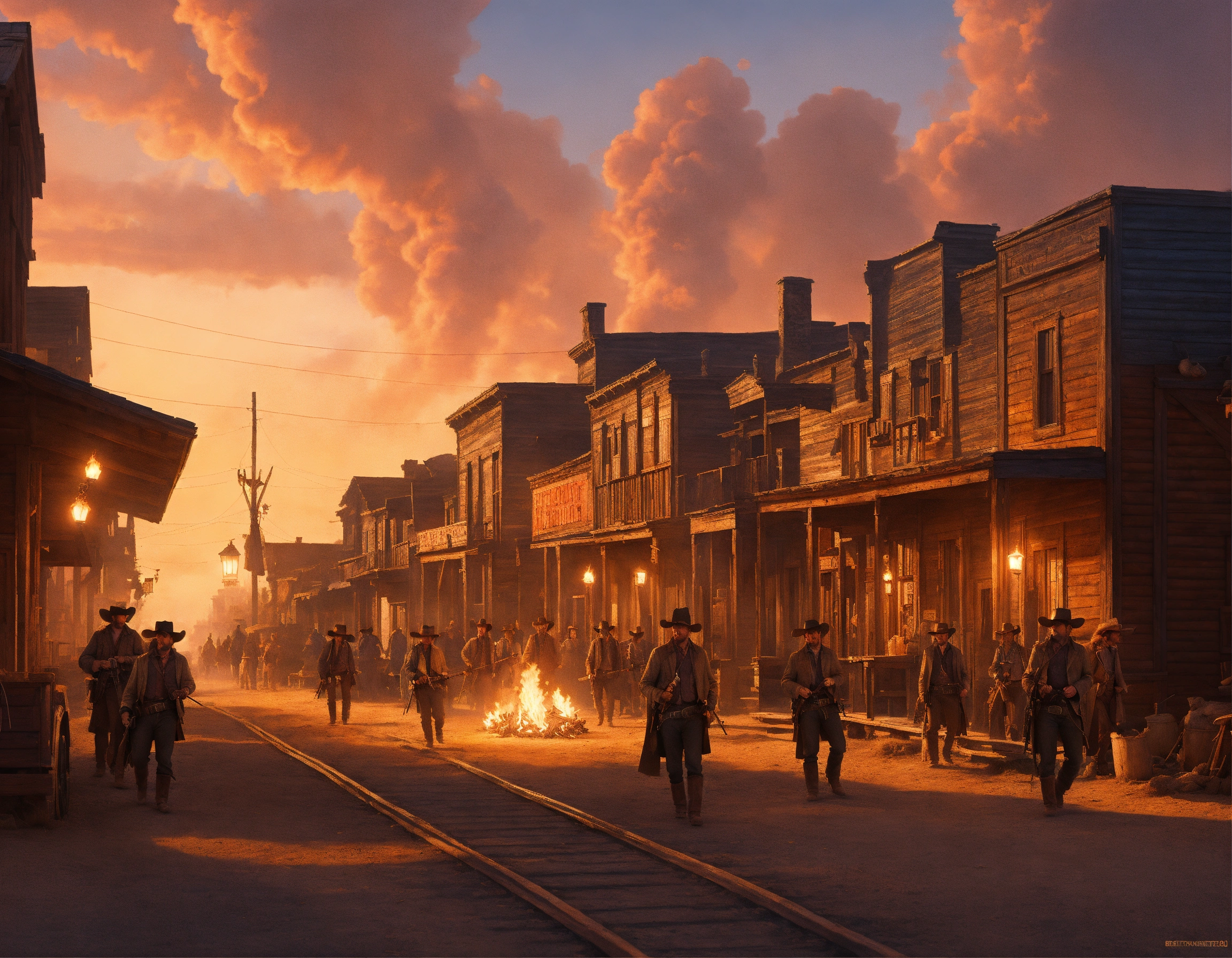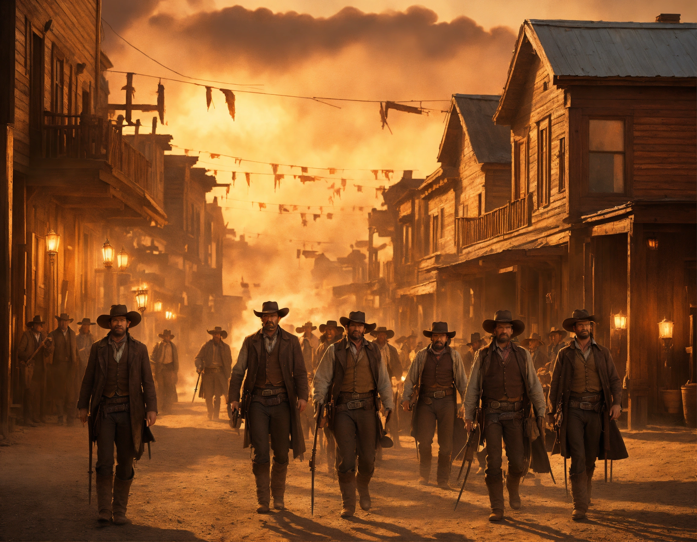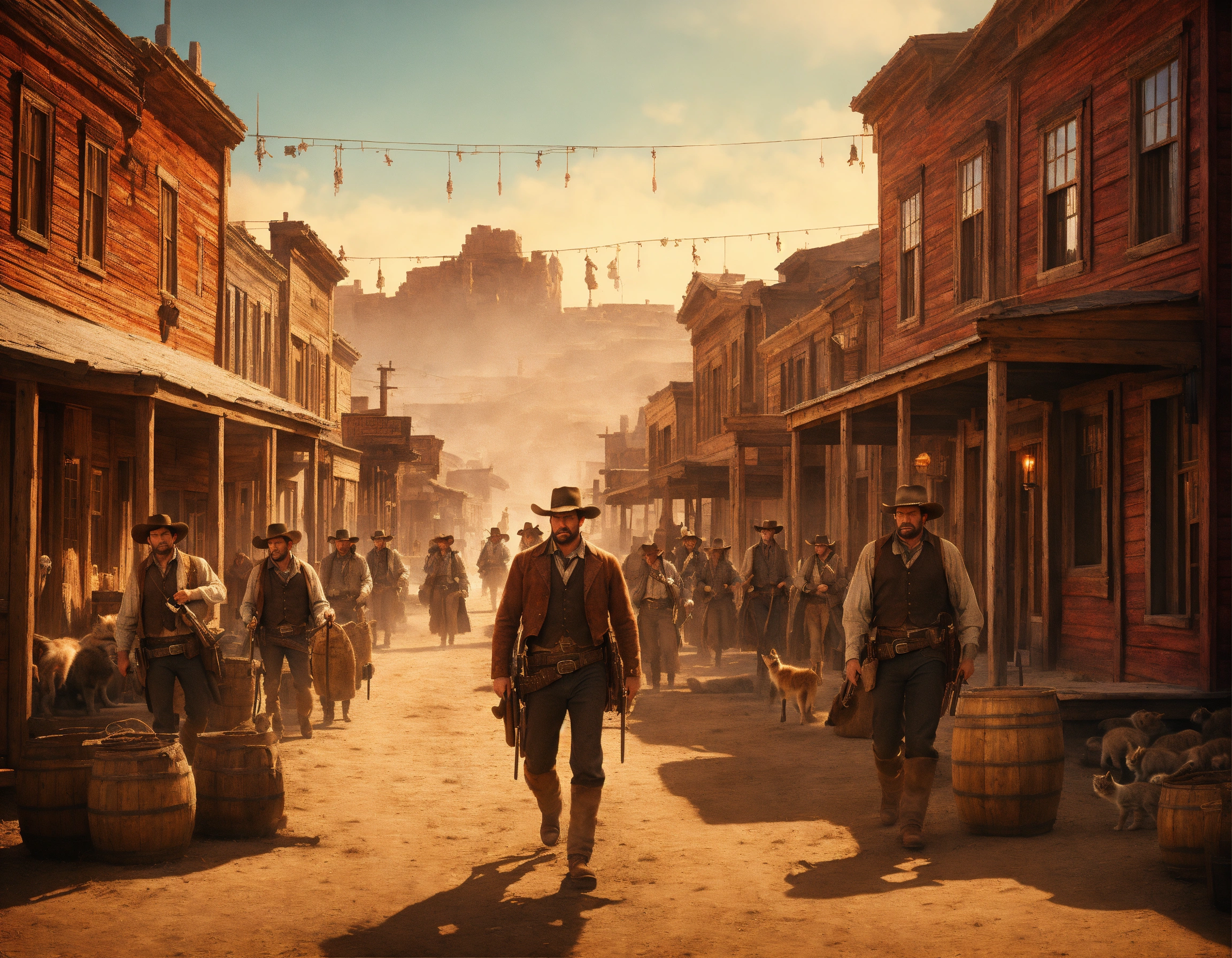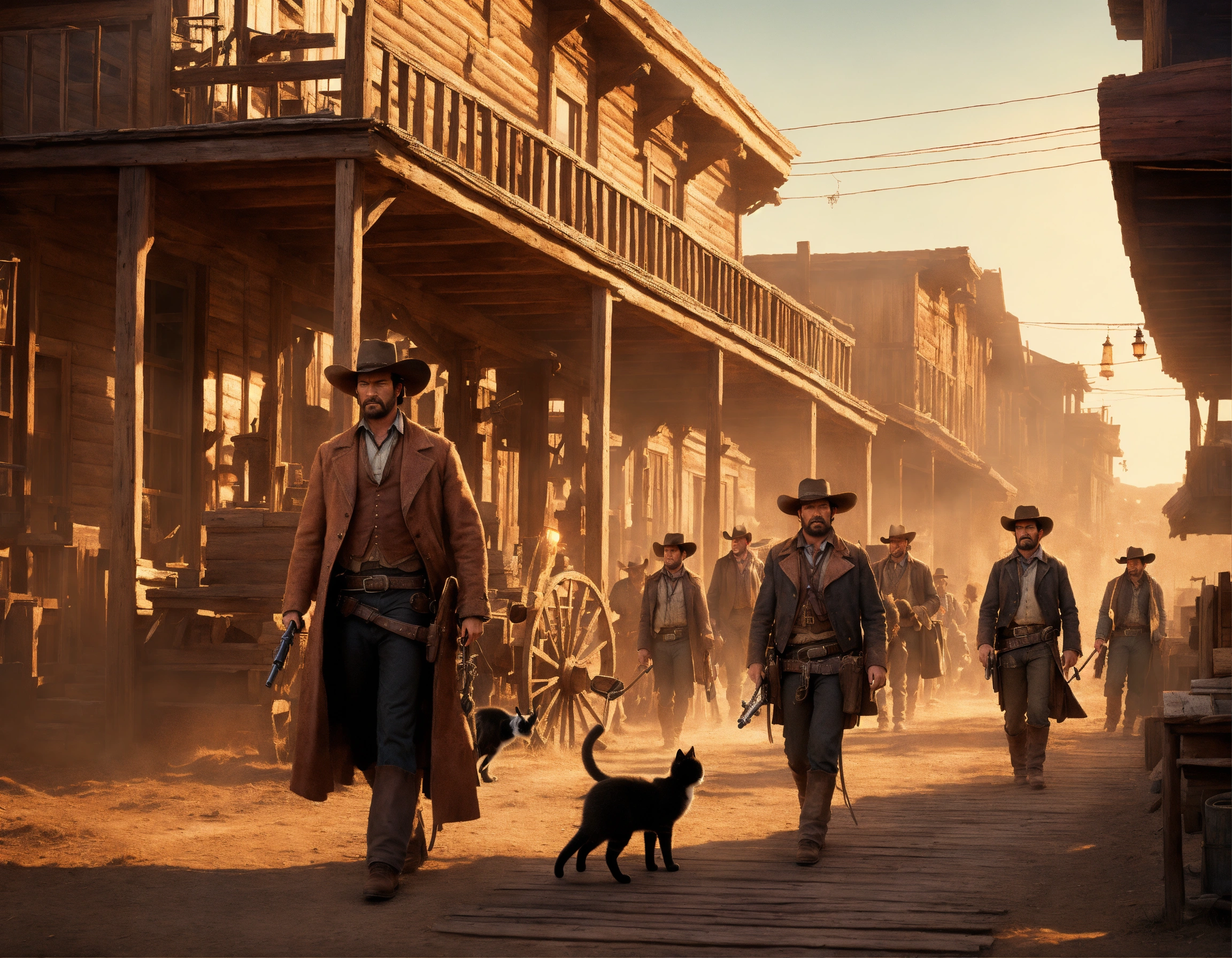 Holding pitchfolks and torches, a group of angry frontier pioneer farmers and townsfolk marches down the main street of an 1800's boom town with wooden buildings in south dakota, style of the good, the bad and the ugly movie poster, no text, stray kittens, sharp details, colorful old west scene, sharp focus, comedy scene, elegant, 3d cinematic, intricately detailed, epic, pixar, digital art, digital illustration, anatomically correct, symmetrical architecture, style of spaghetti western, style of jordan grimmer, style of ben crane, style of greg rutkowski, style of remington