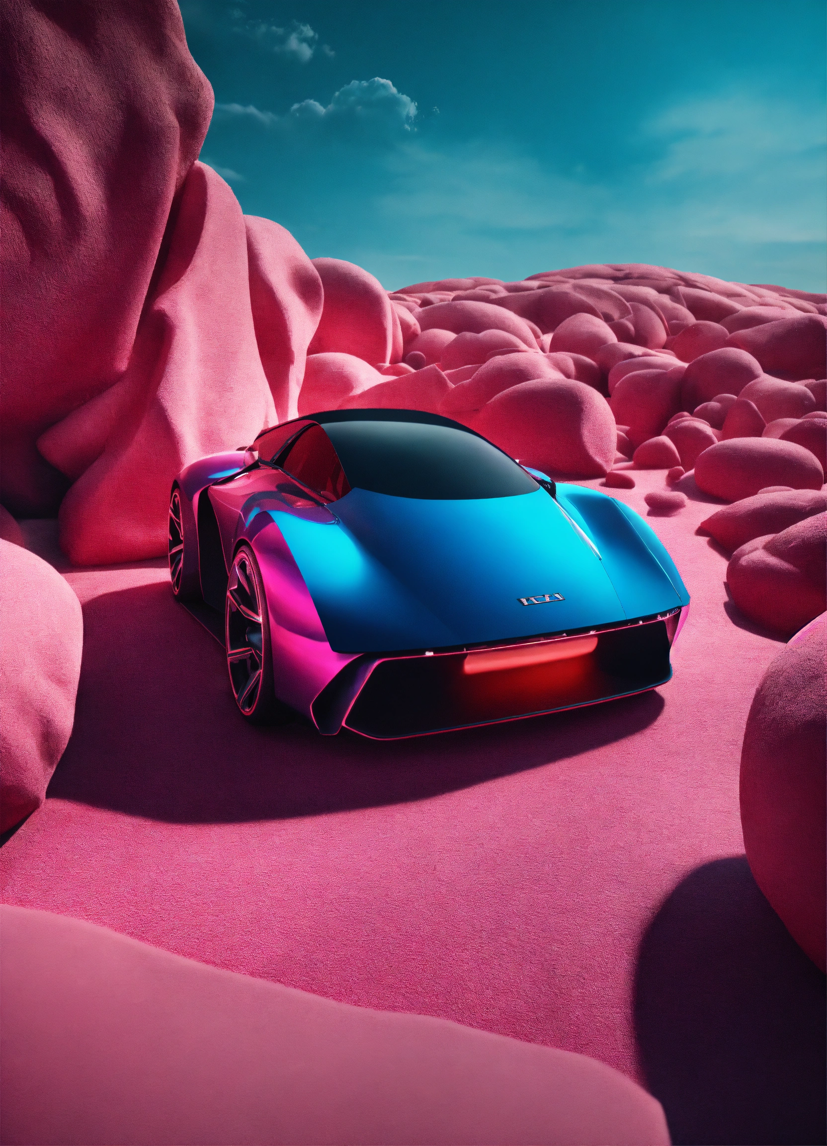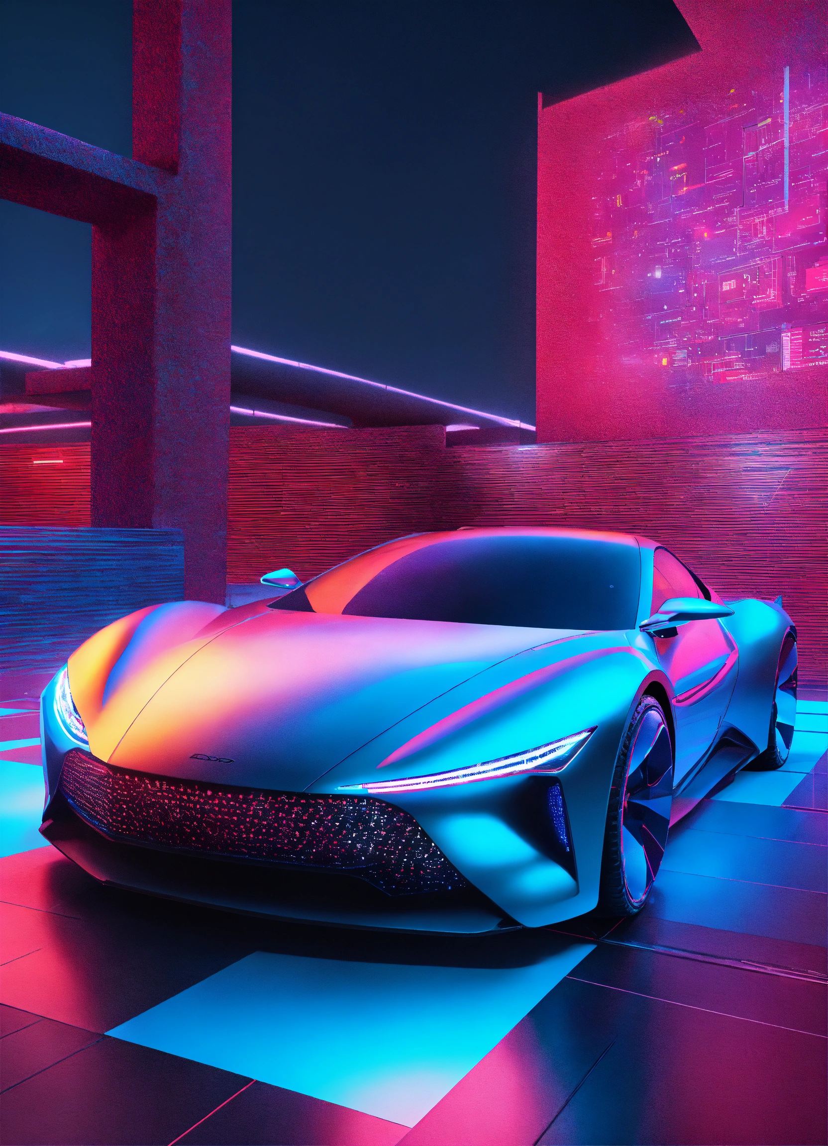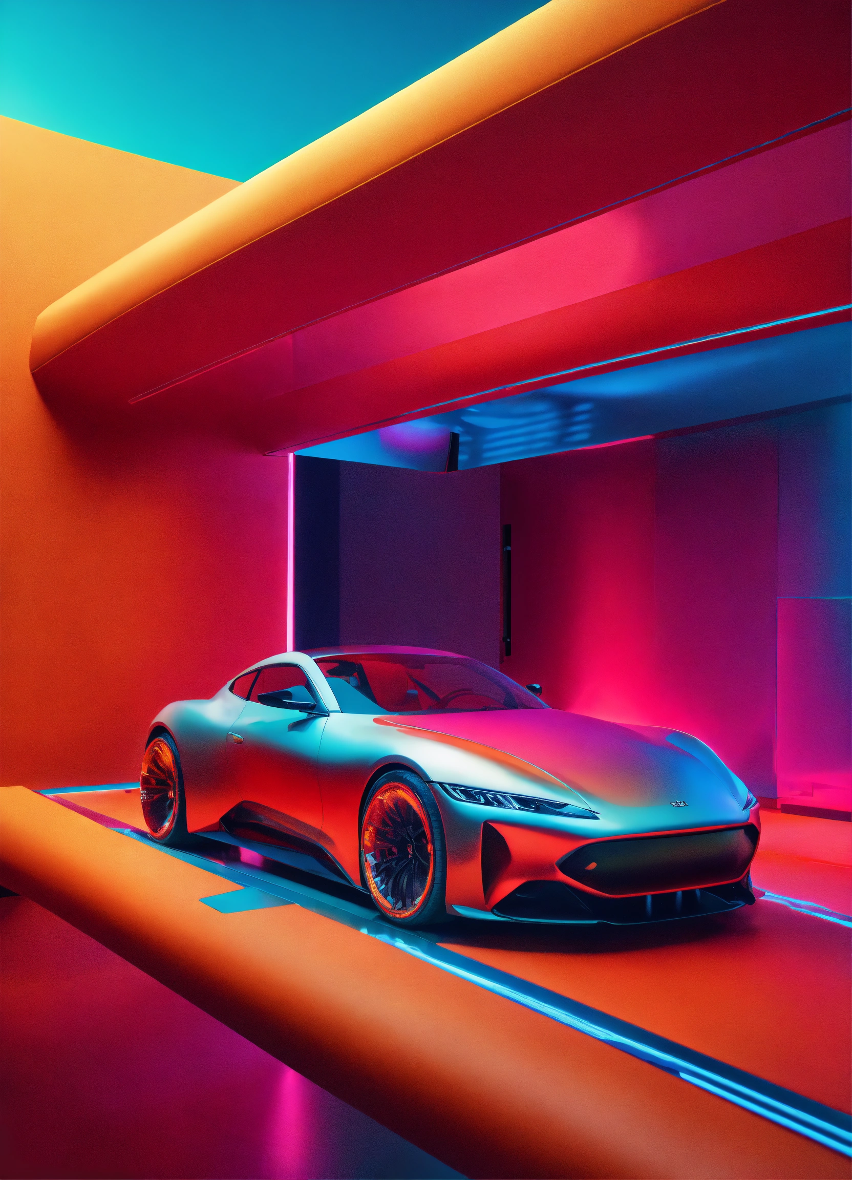 Car visualization, work of ai 3d modelling in computer, on a lab of automotive design. data science in business, finance and innovation.. surrealistic landscape. colorful, minimal. hiper realistic fashion technology. 35mm. award winning photography.