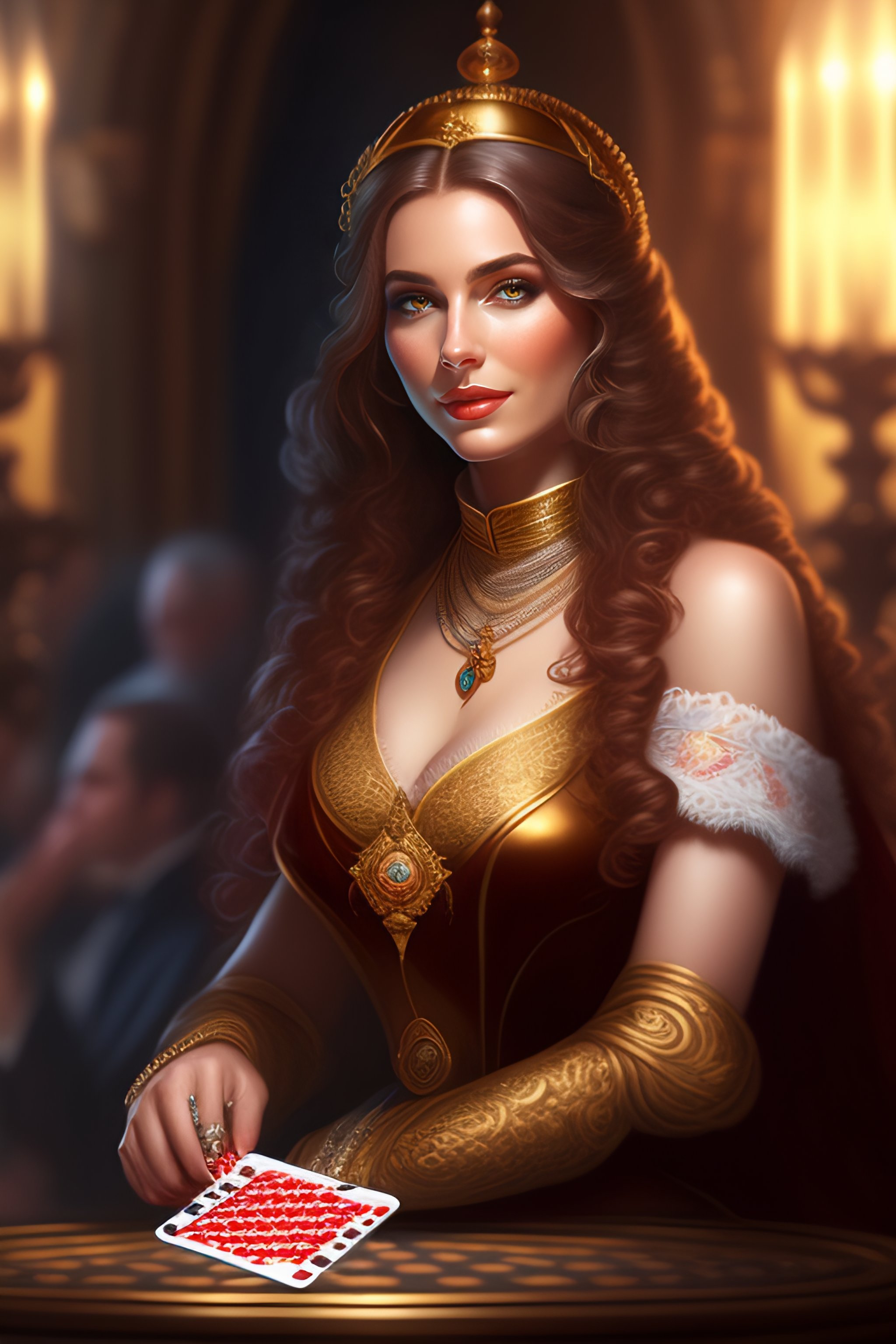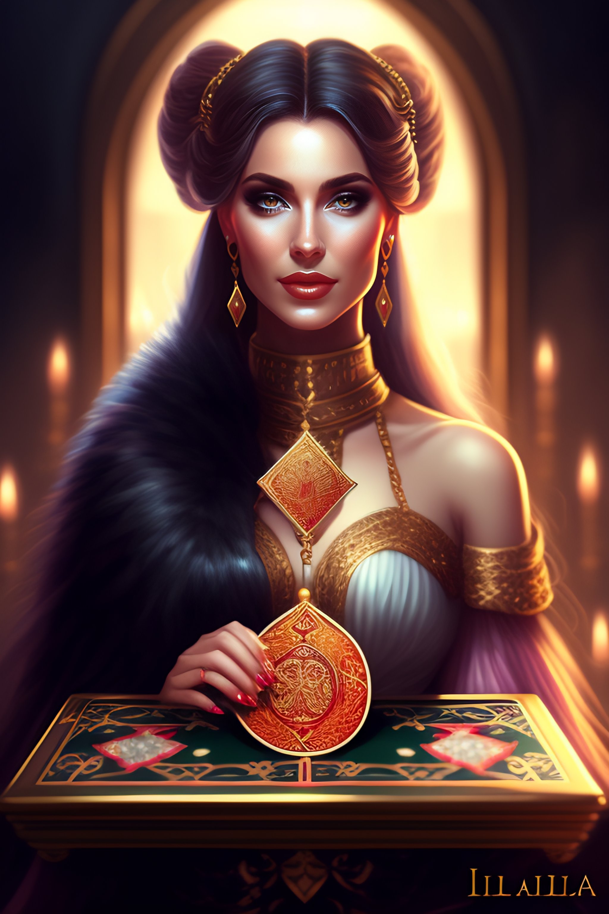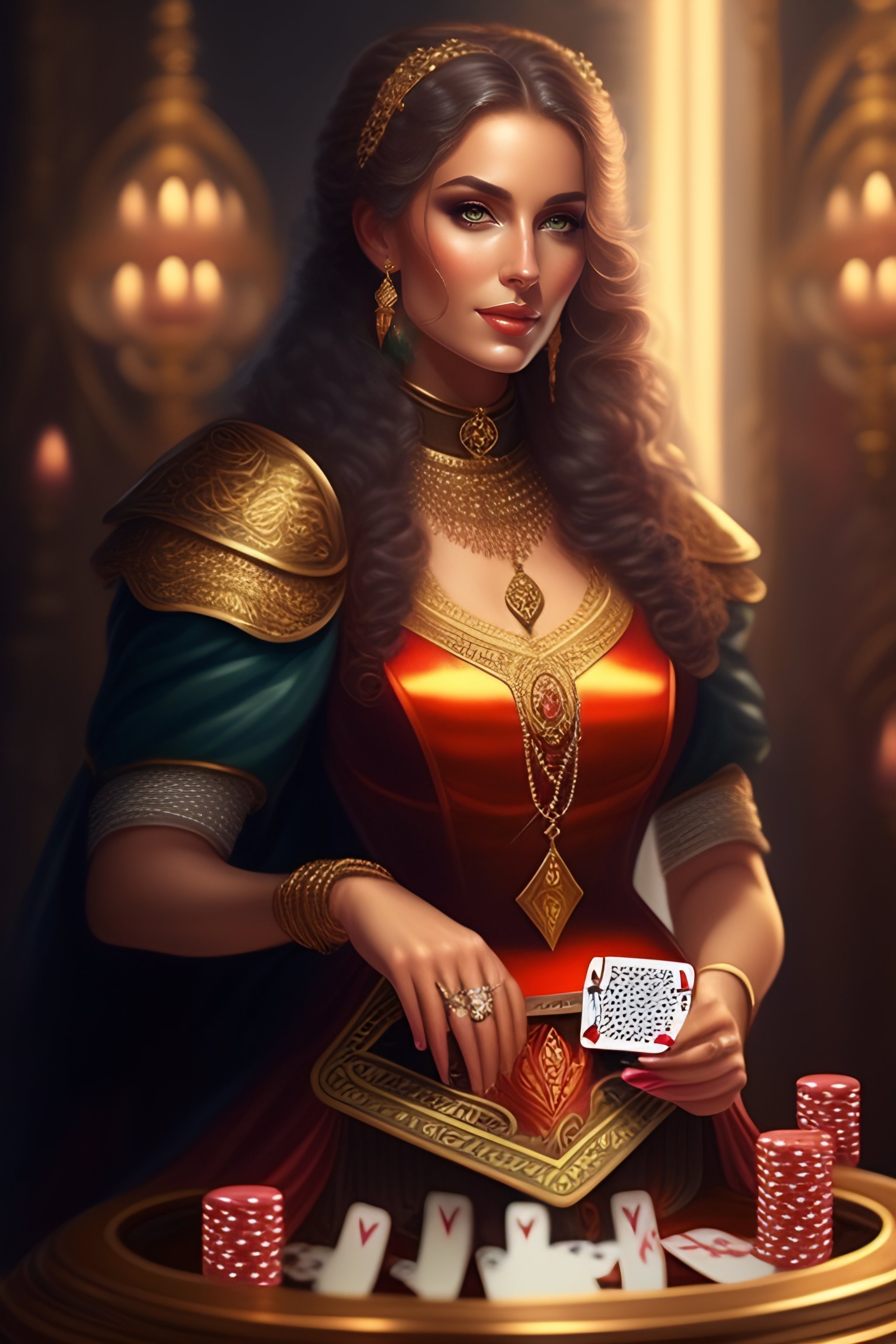 Very happy female magician looking the table full of playing cards, fantasy, intricate, elegant, highly detailed, digital painting, artstation, concept art, addiction, chains, smooth, sharp focus, illustration, art by ilja repin
