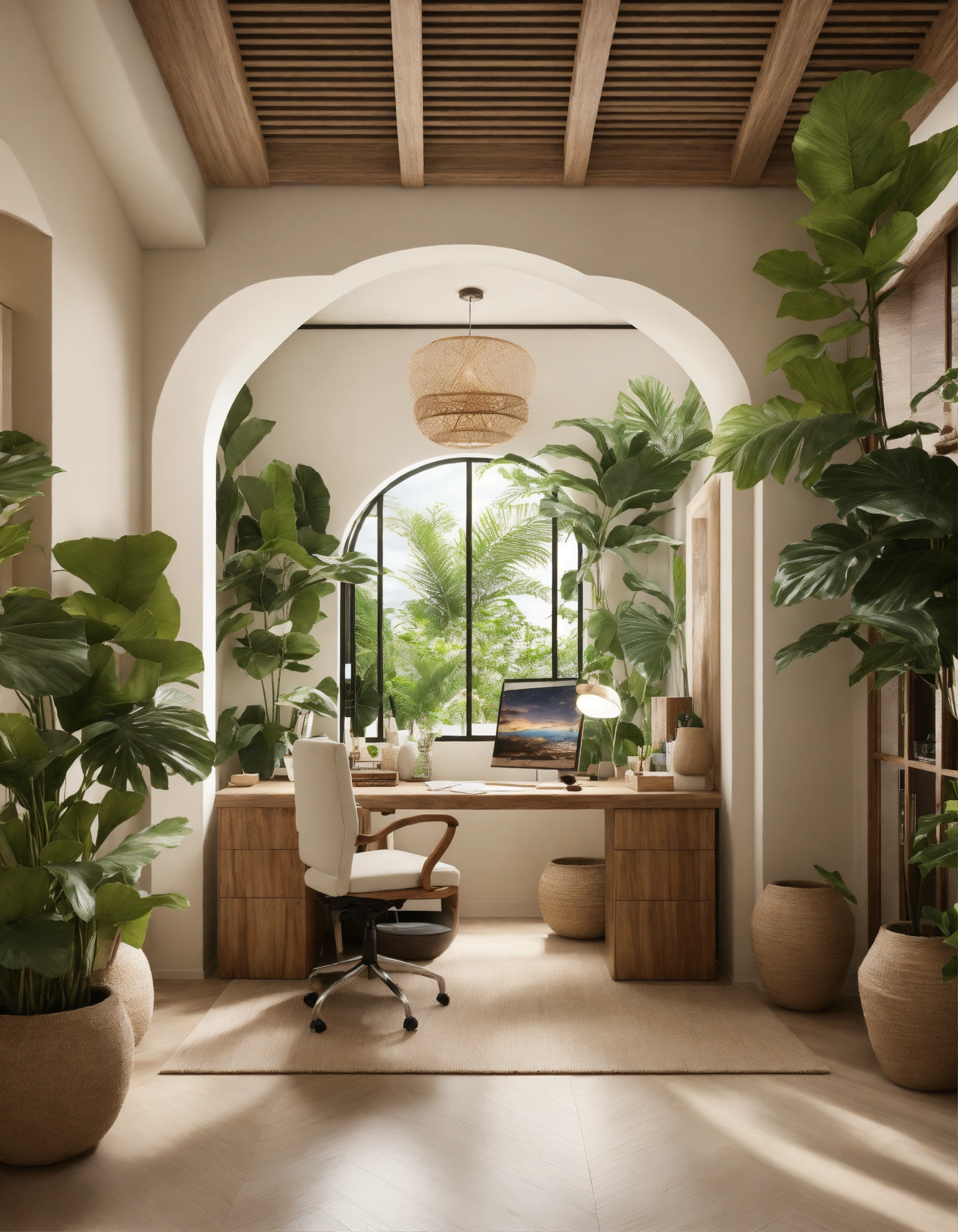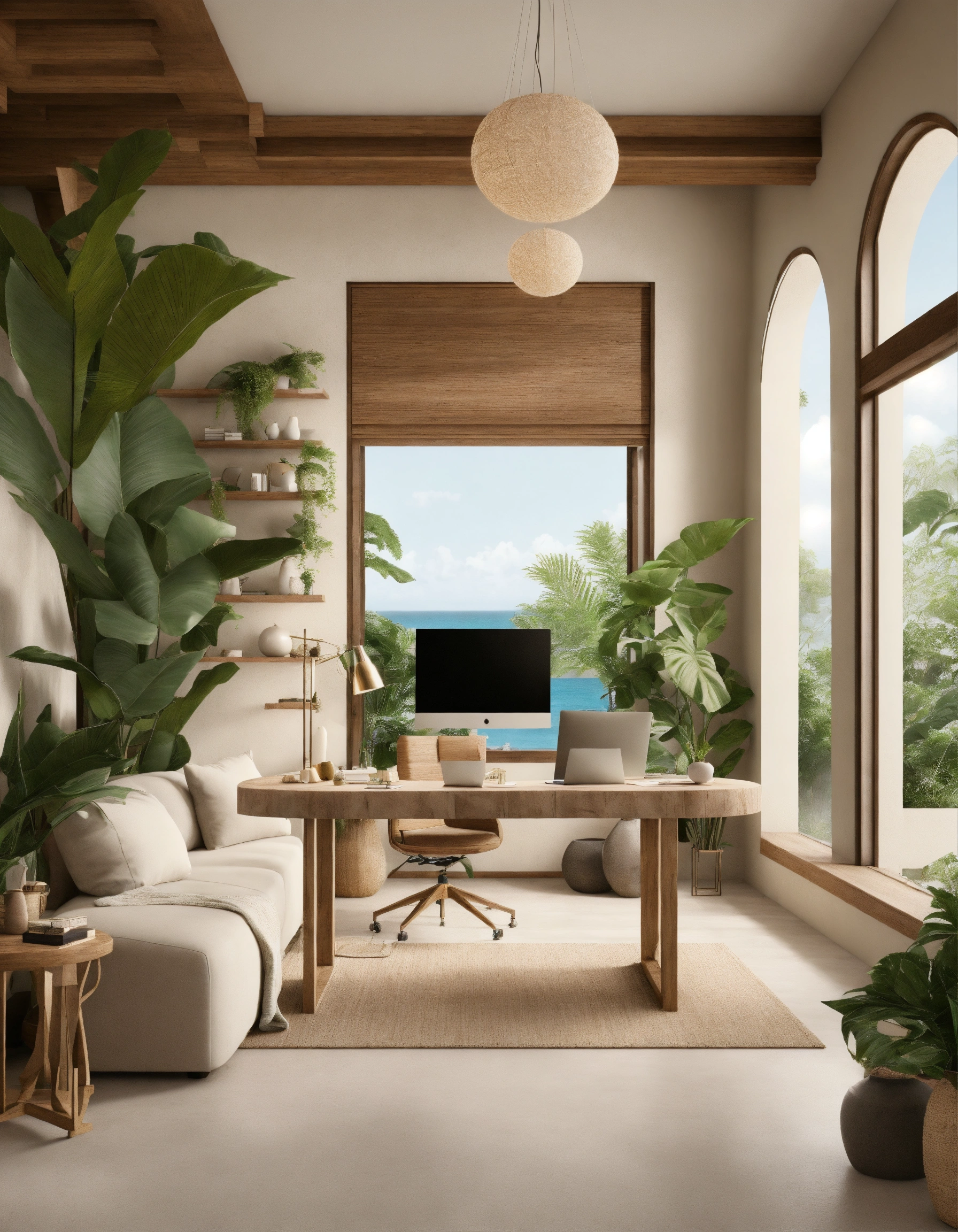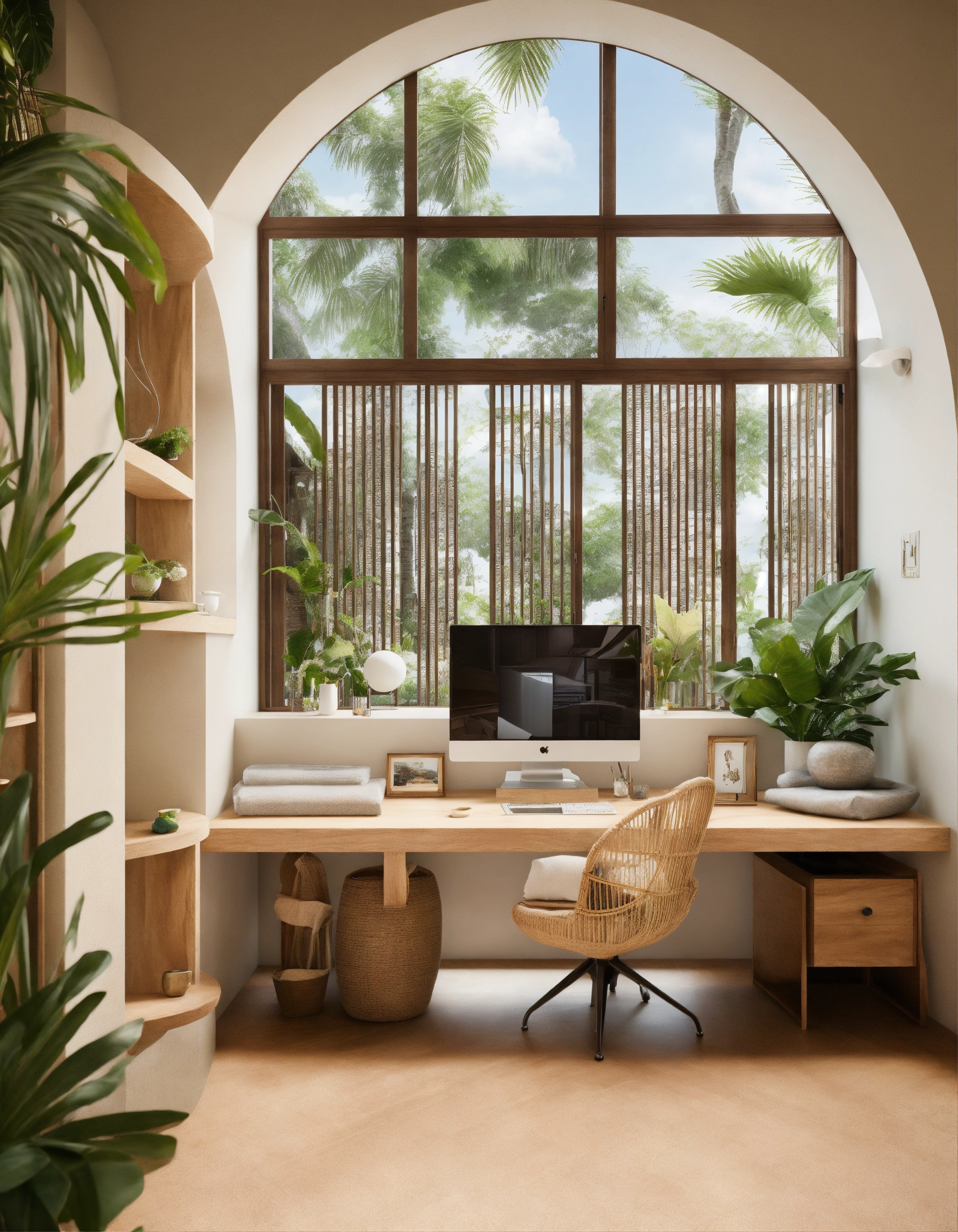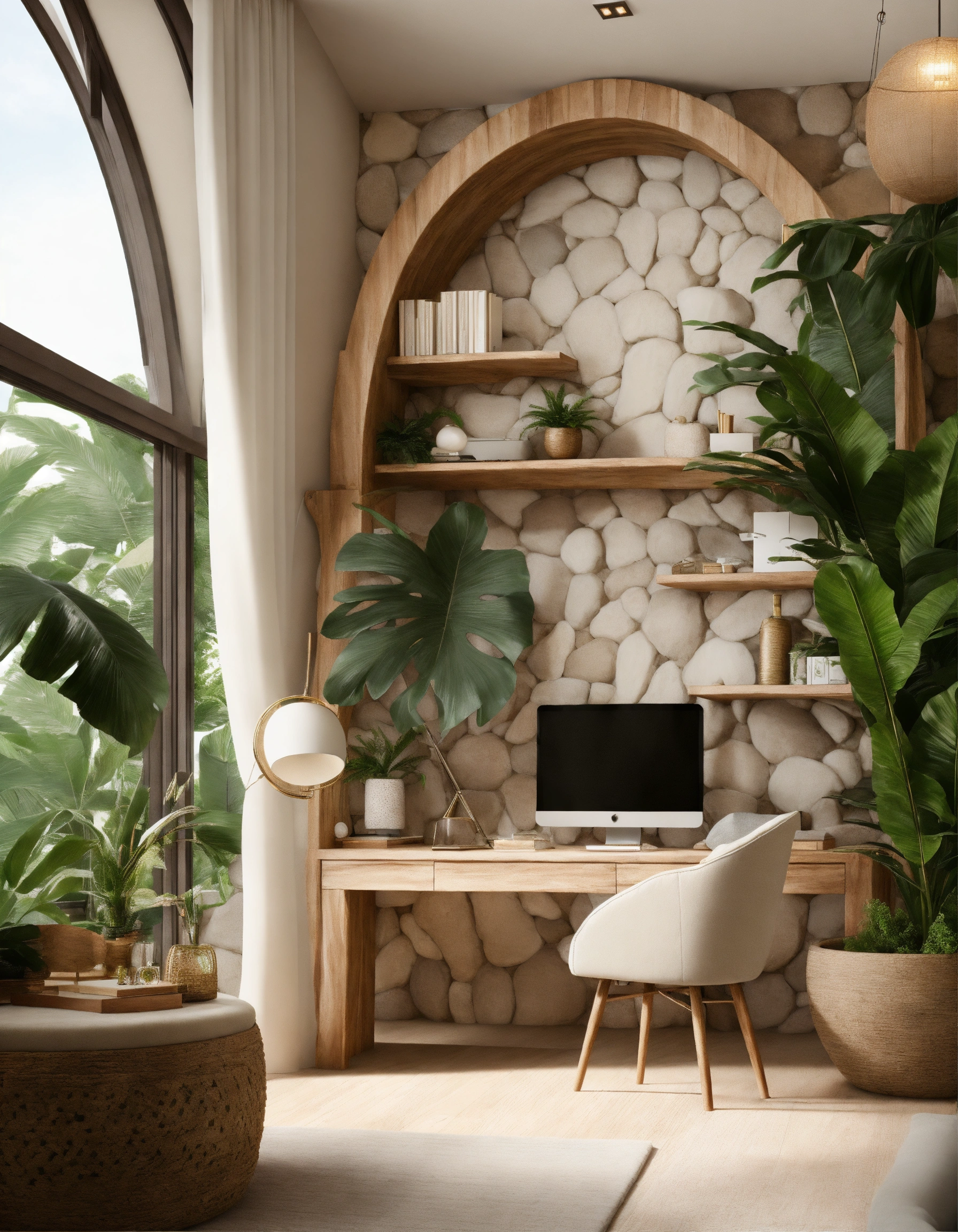 Ultra realistic photo of modern take on upscale bali inspired small condo white cream stone, light wood round arches interor view of home office with tropical foliage