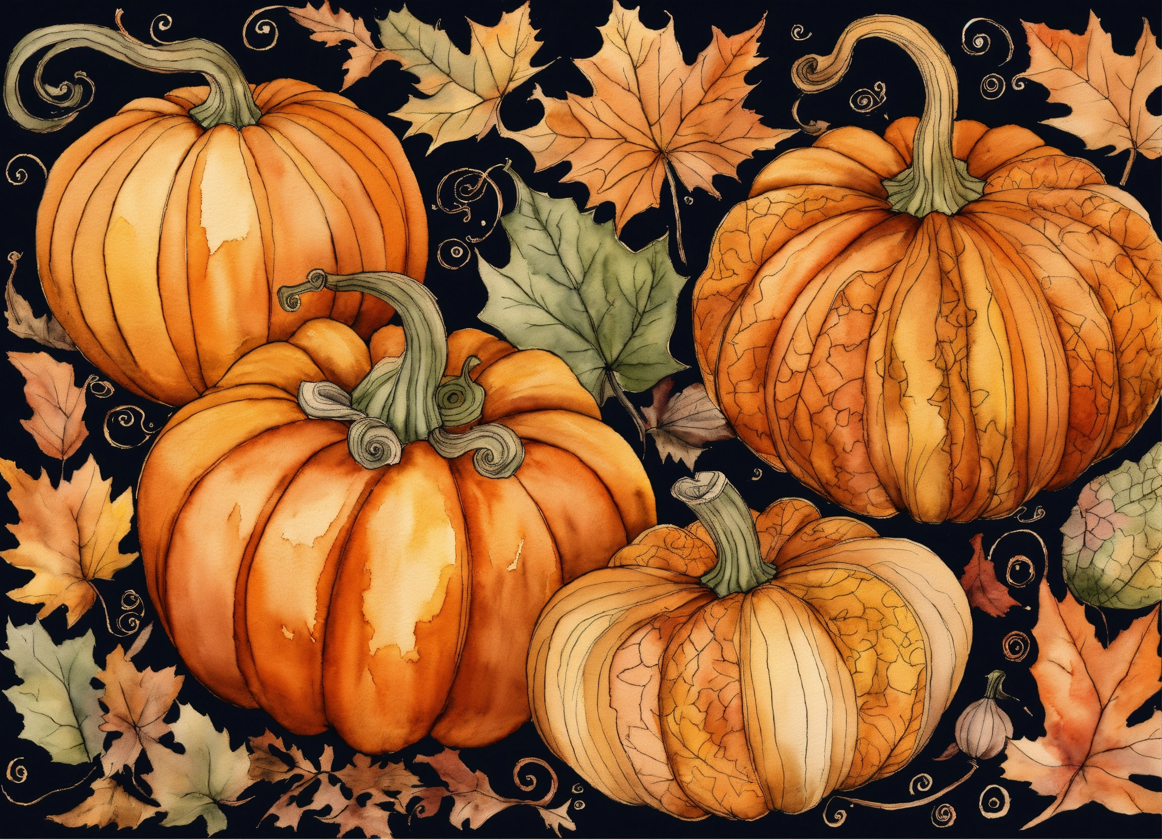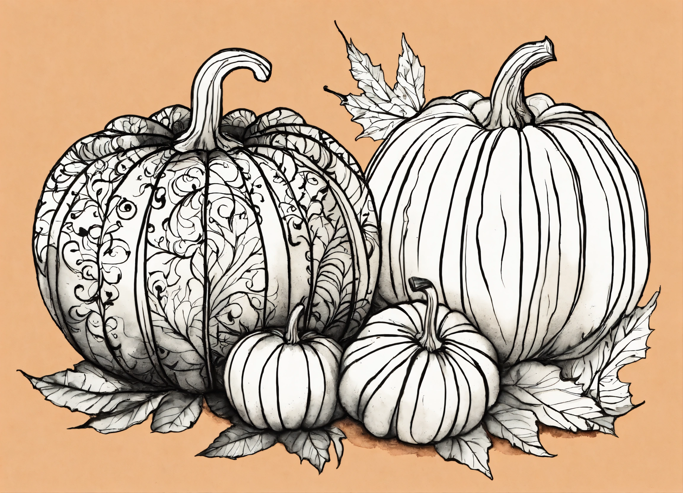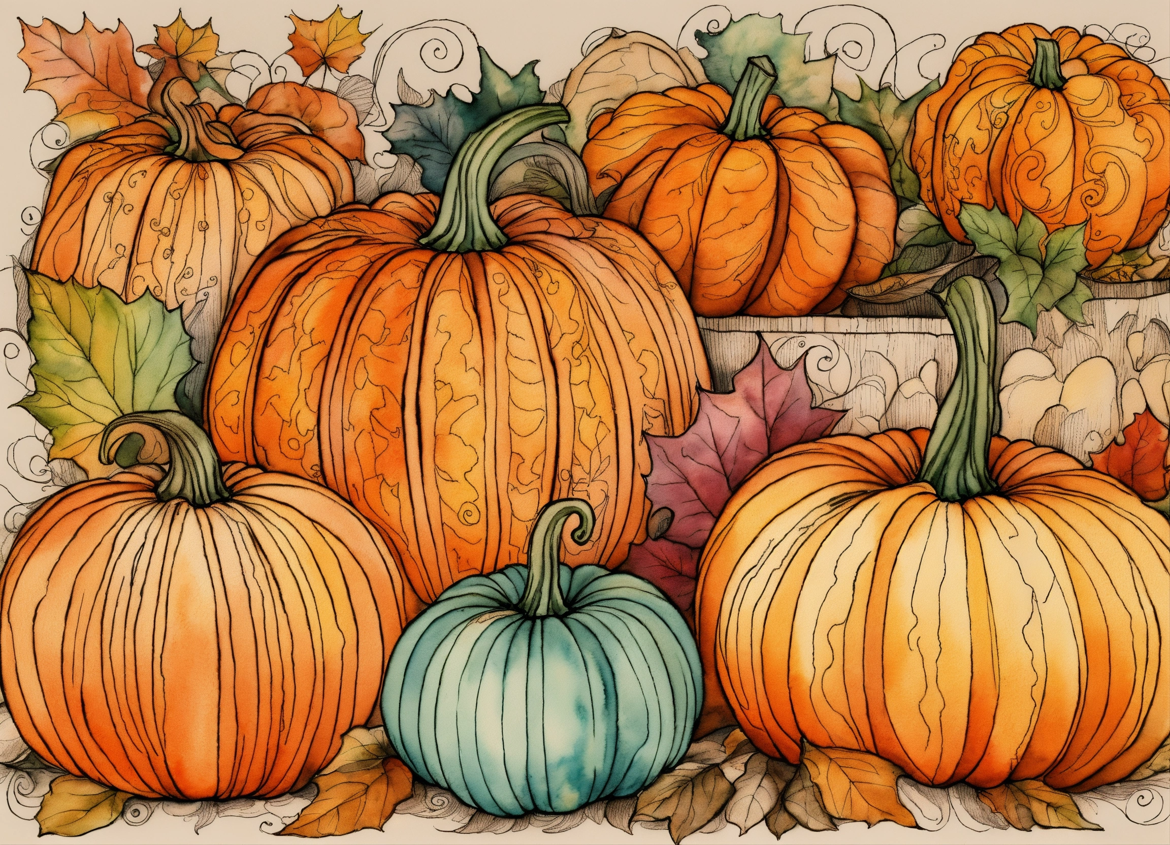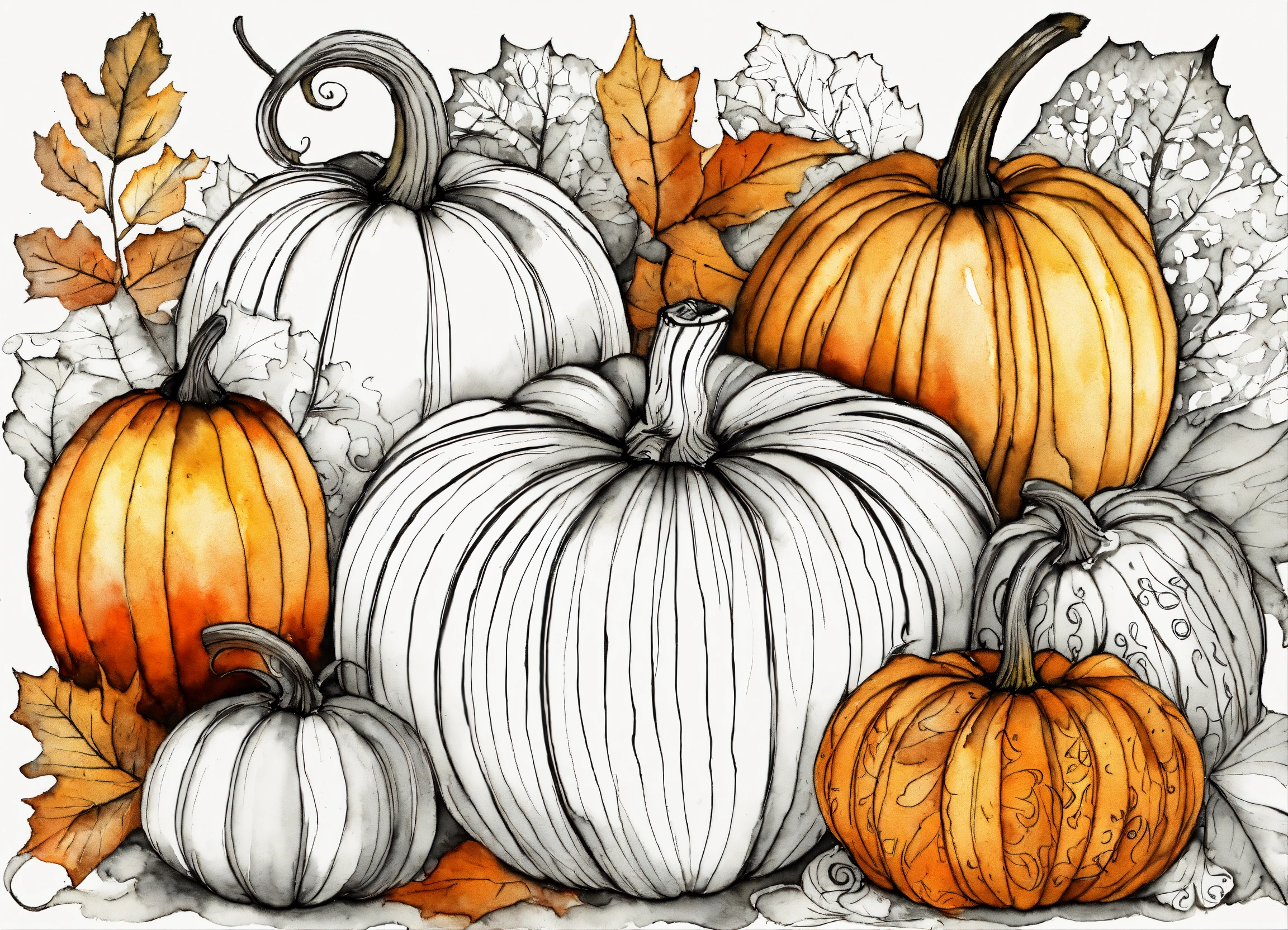 Beautiful autumn pumpkins, classic zentangle style line art designs, eclectic, detailed; watercolor and ink