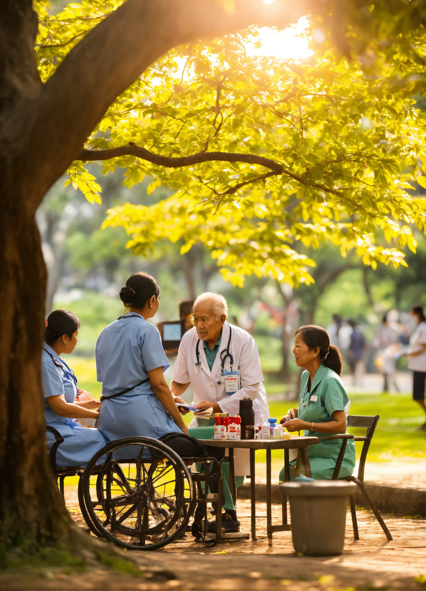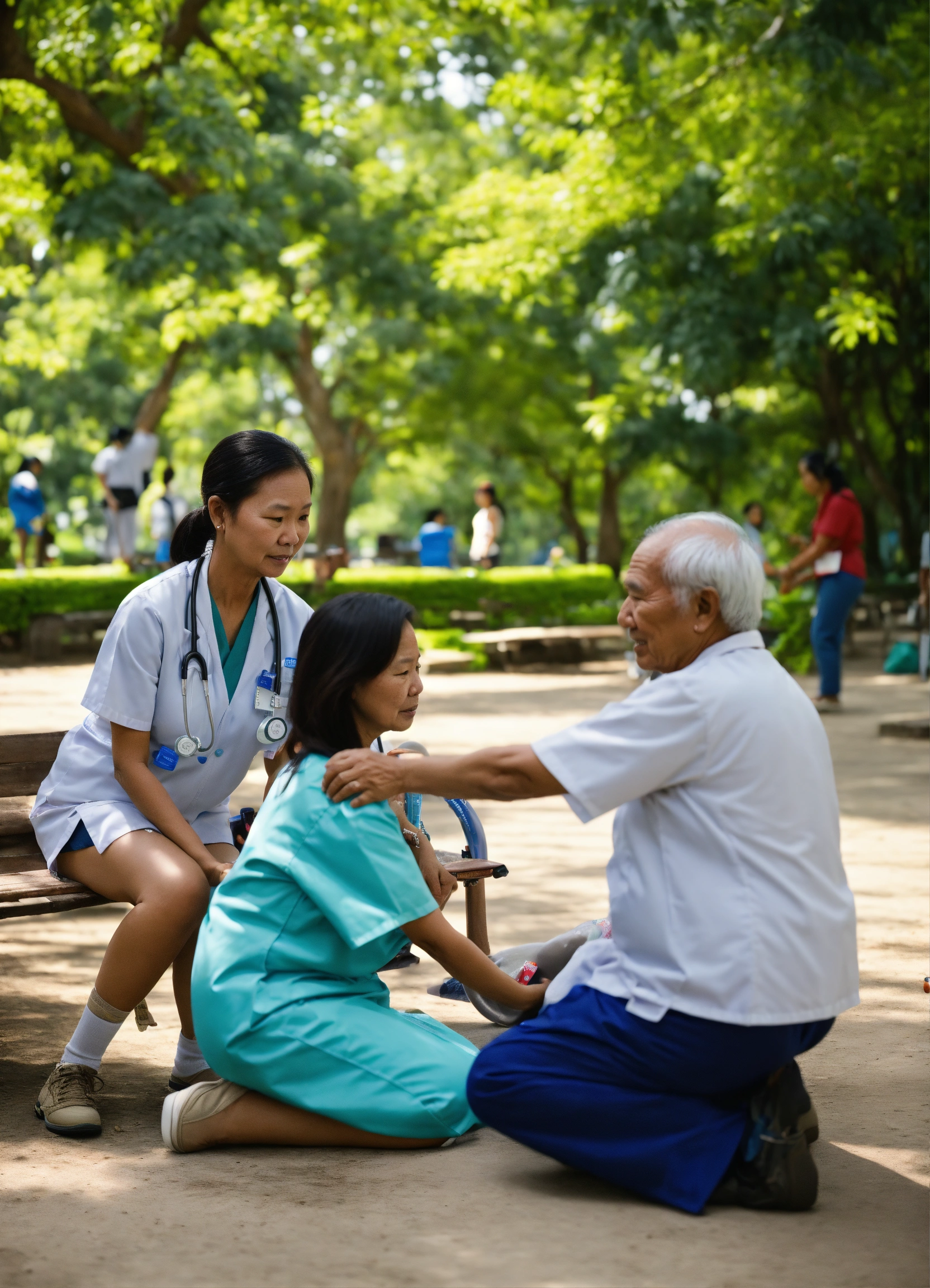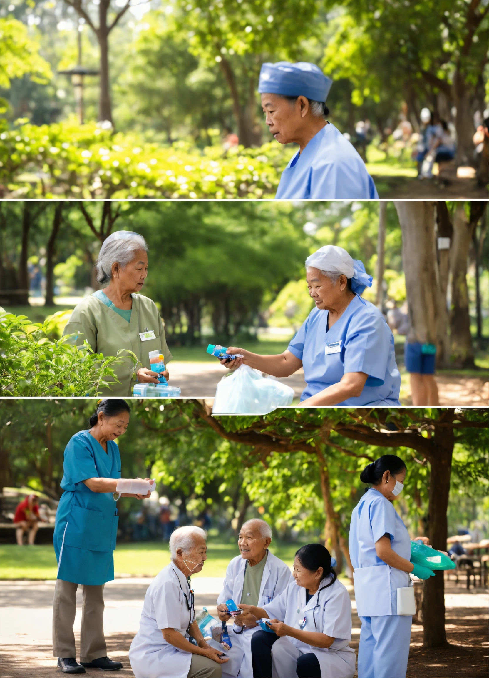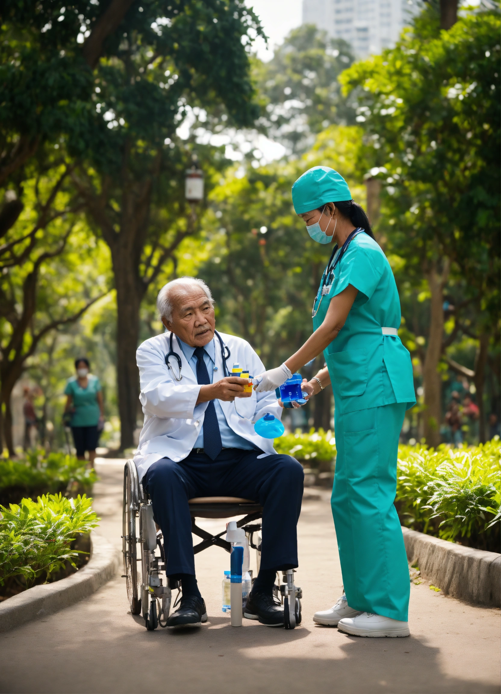 Generate real live pictures of filipina healthcare aides assisting with medication with an old man in parks, realistic, 8k