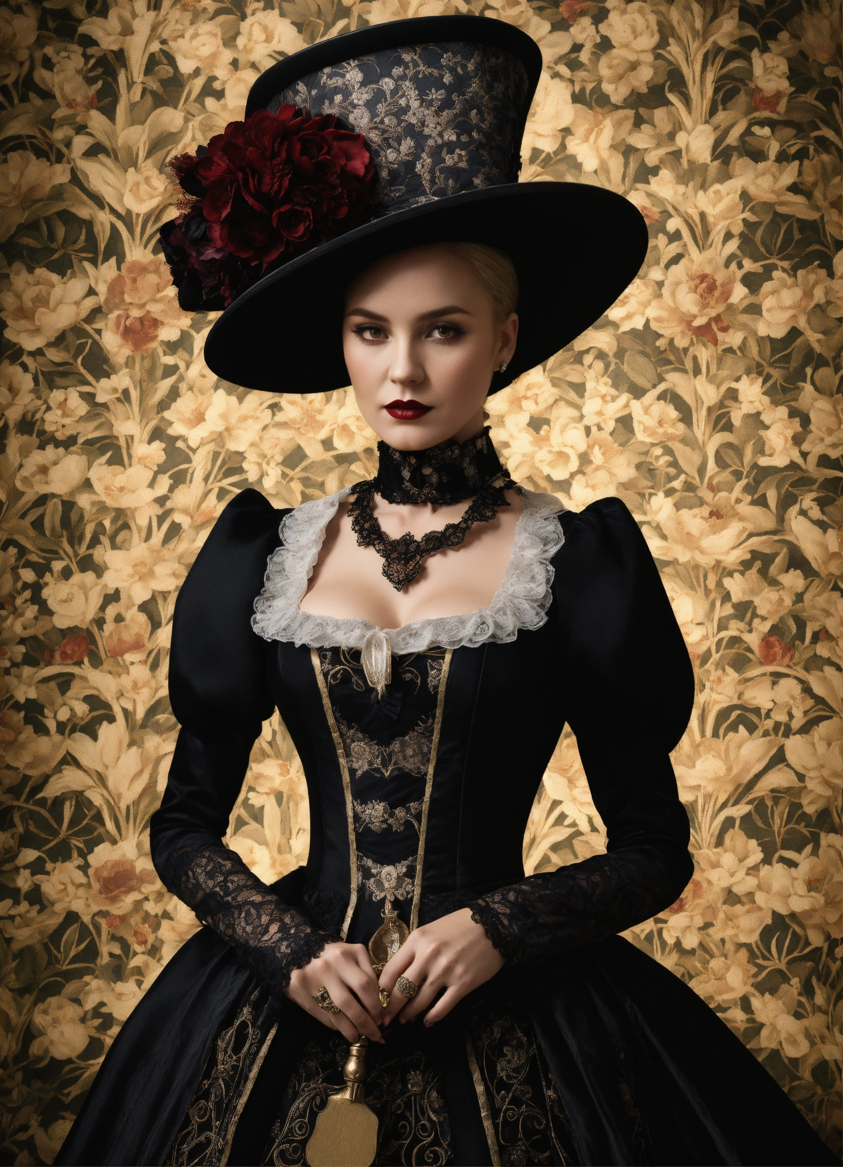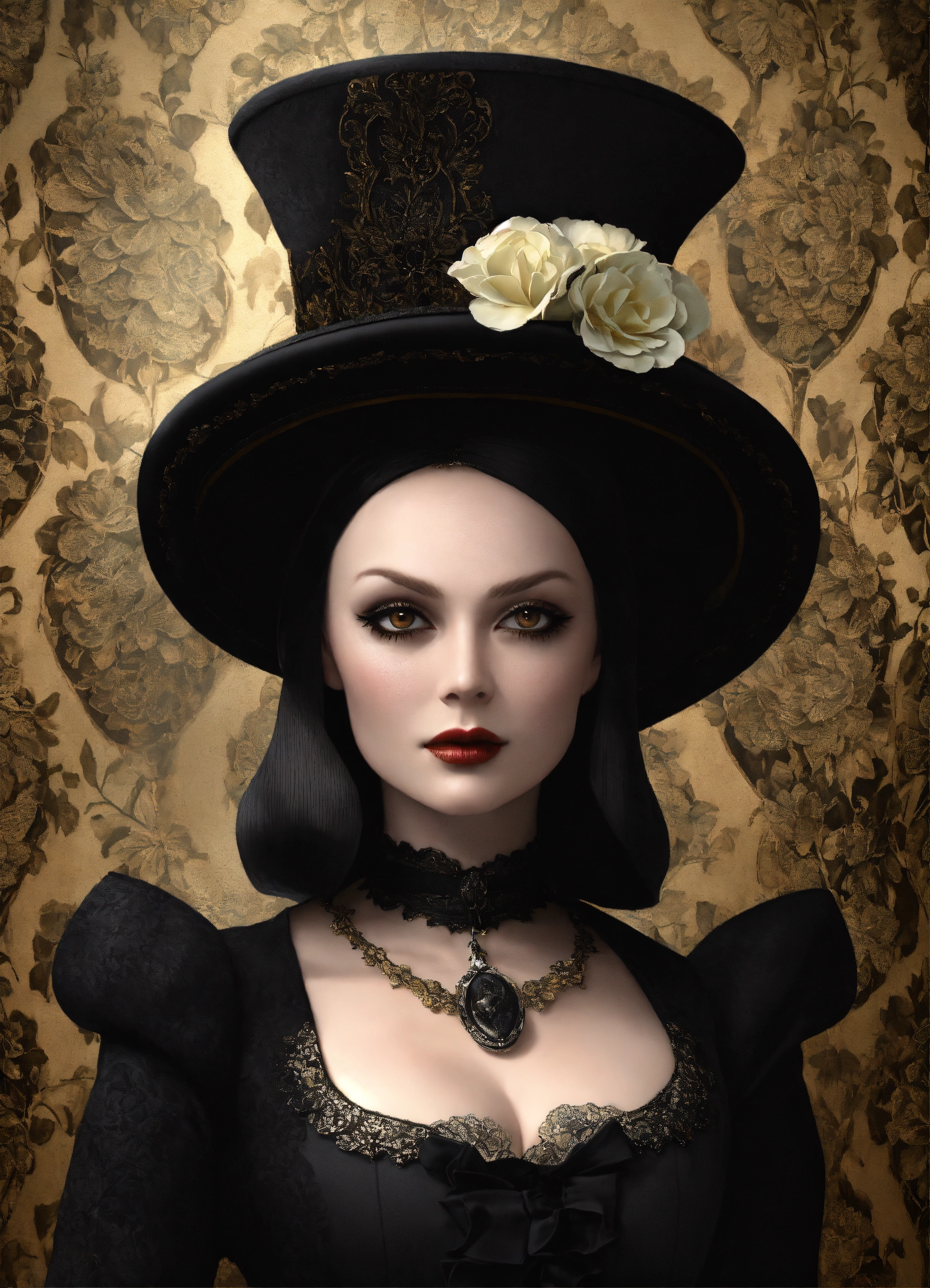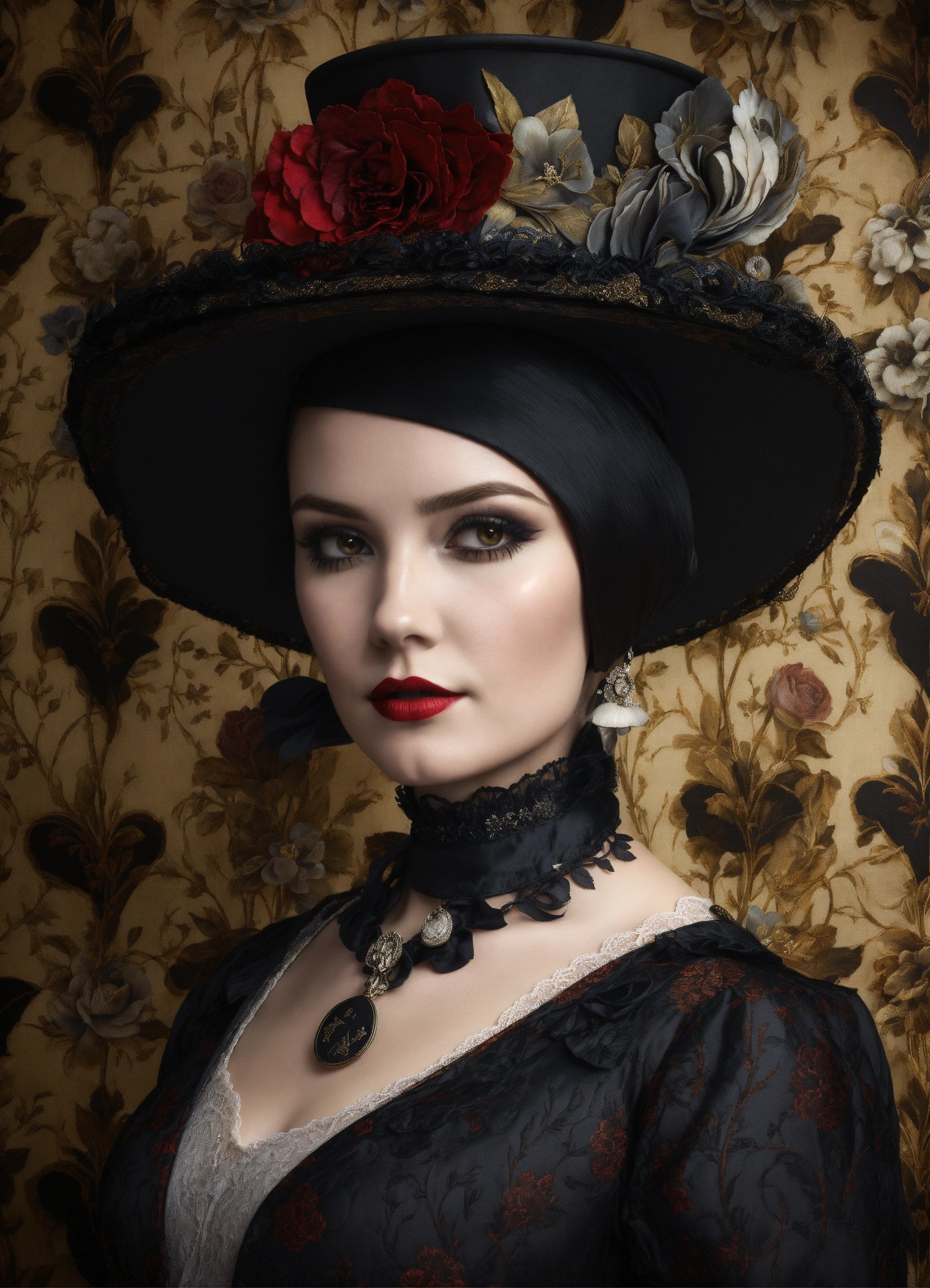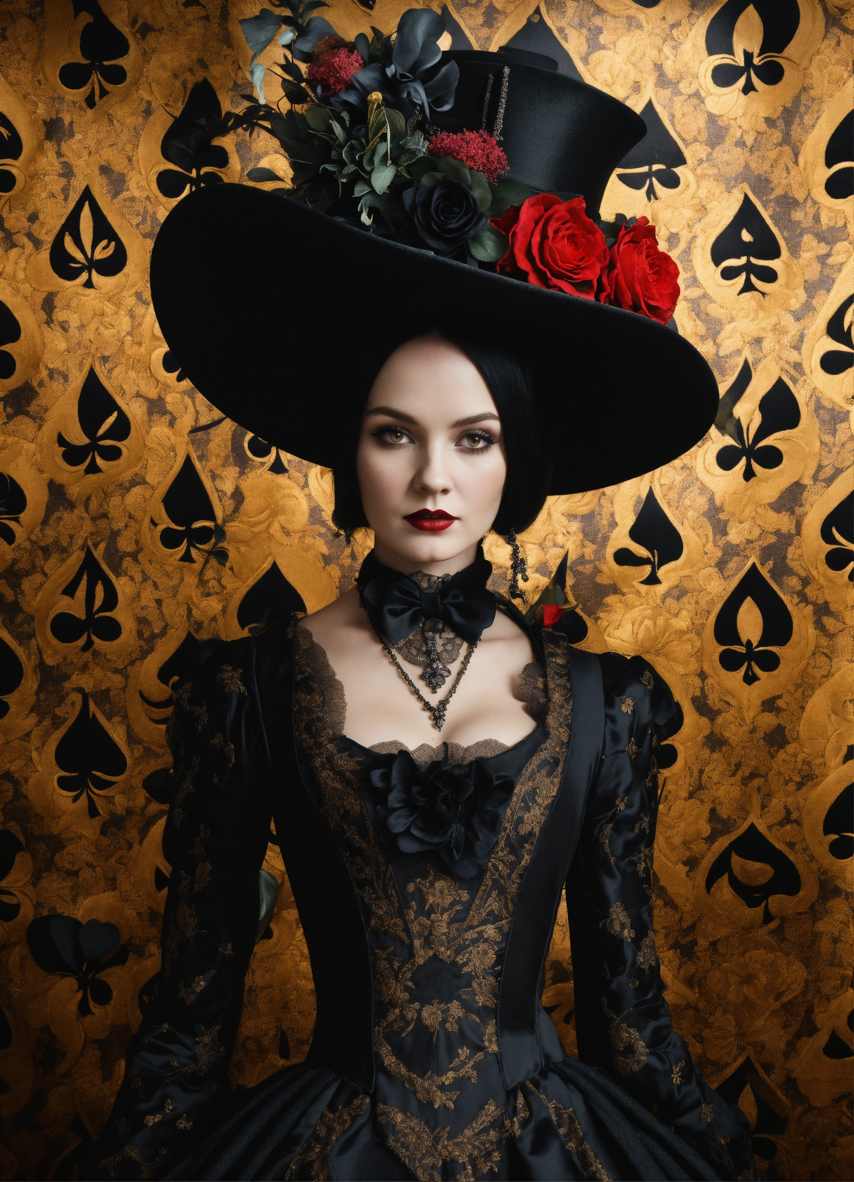 Elaborate gothic wednesday adams queen of spades aged 36 in an elegant and intricate gothic costume and wearing a fascinating hat, background with flower patterned wallpaper, 3d, 32k, photorealistic and very detailed.