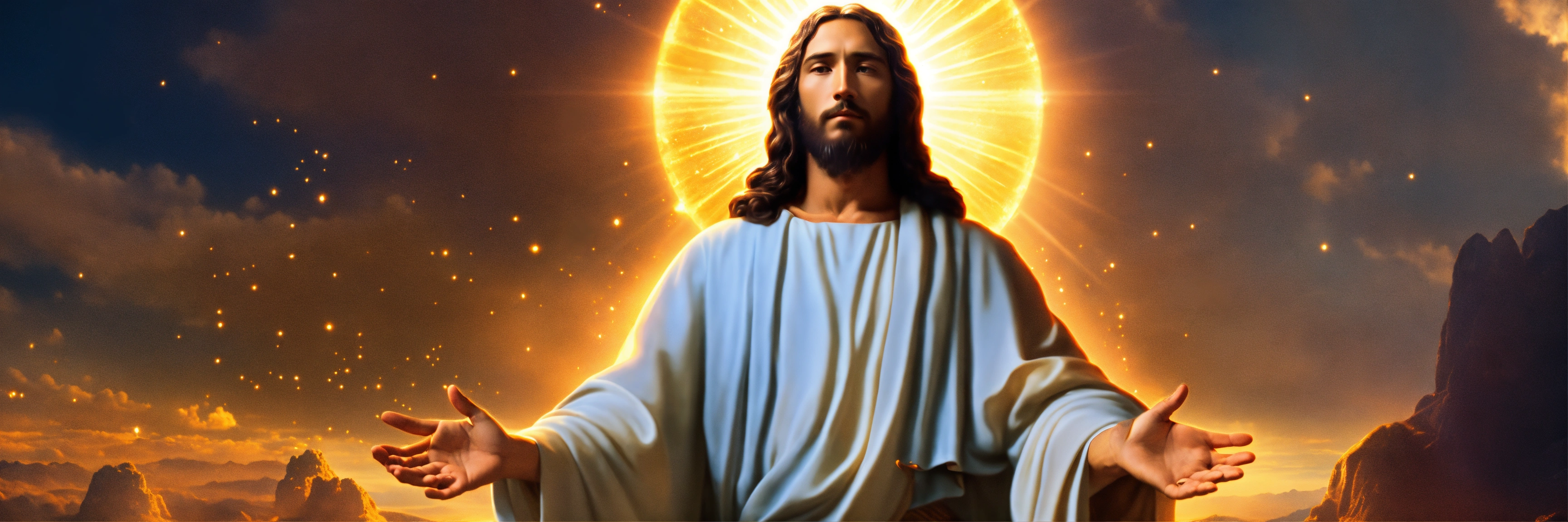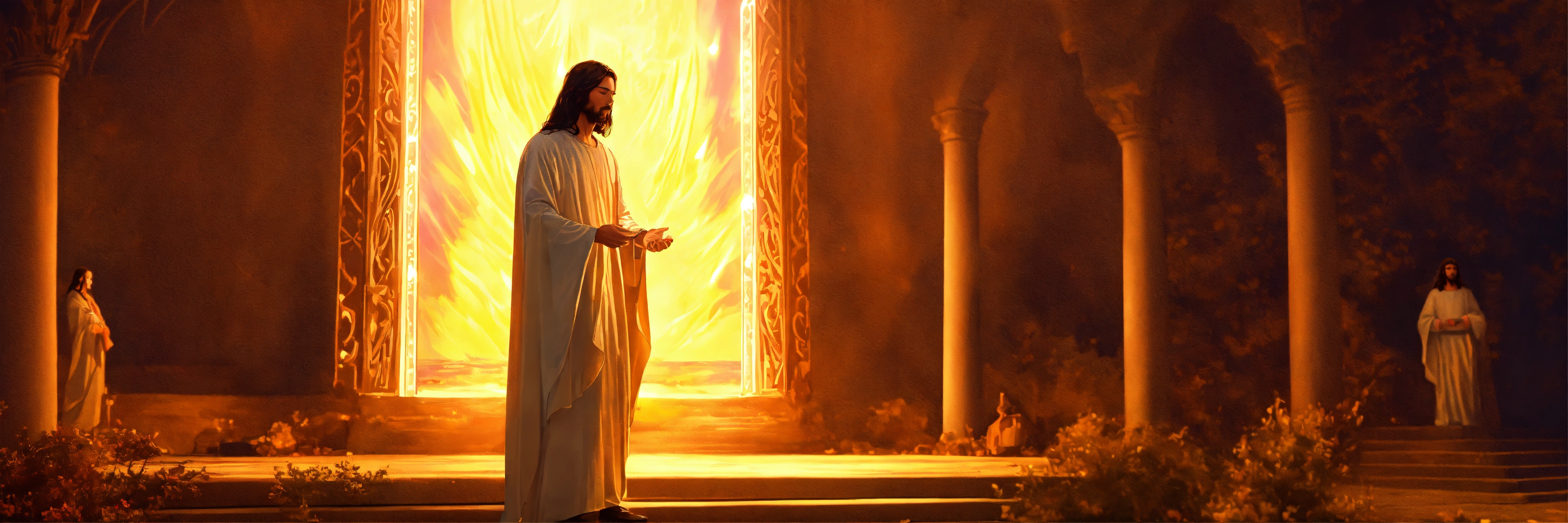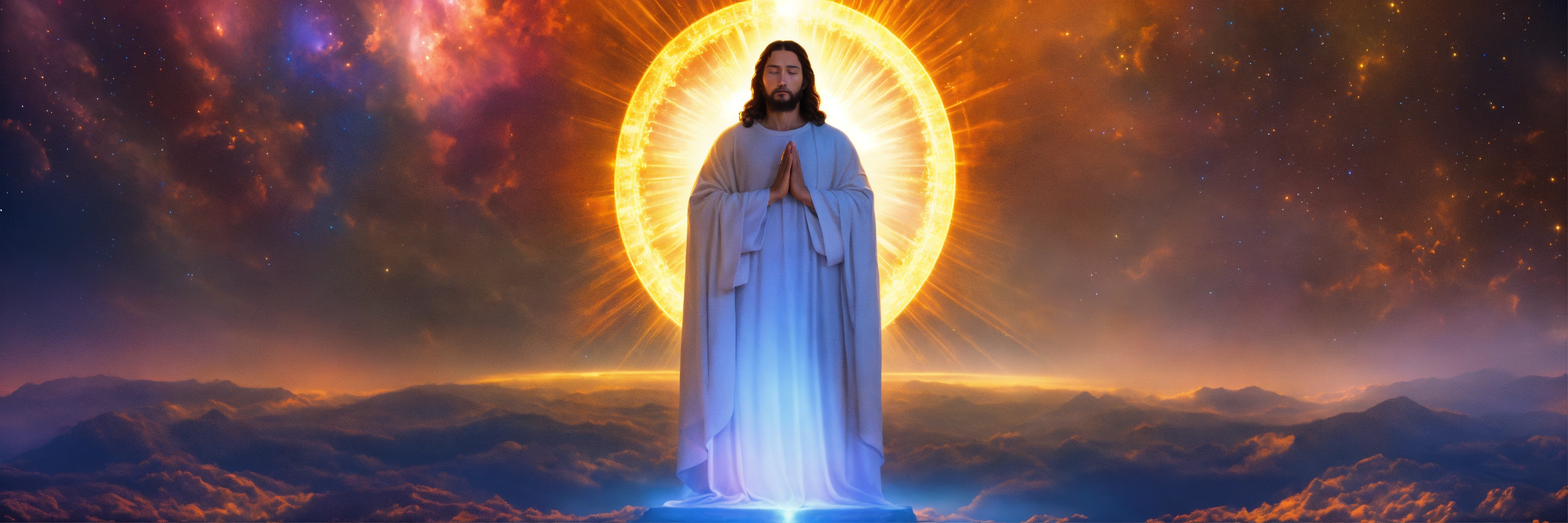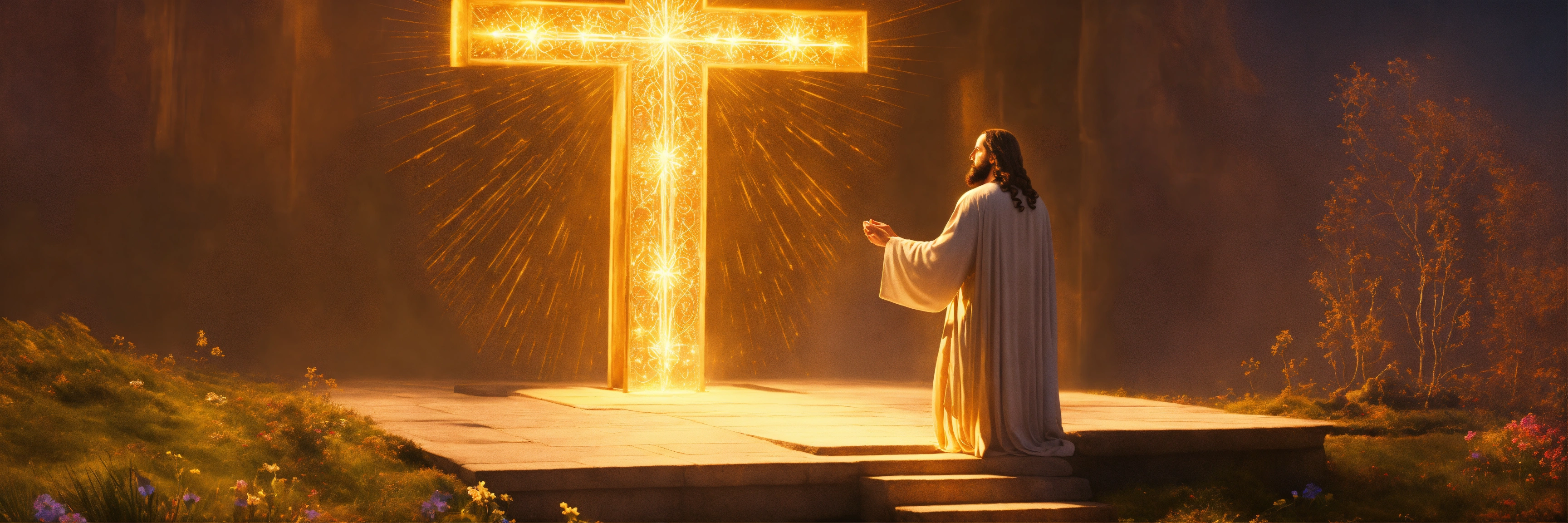 Experience the divine presence as you kneel before a glowing image of jesus, surrounded by the peaceful solitude of your own thoughts, detailed, 16k, focused, extreme details, super resolution, cinematic, masterpiece