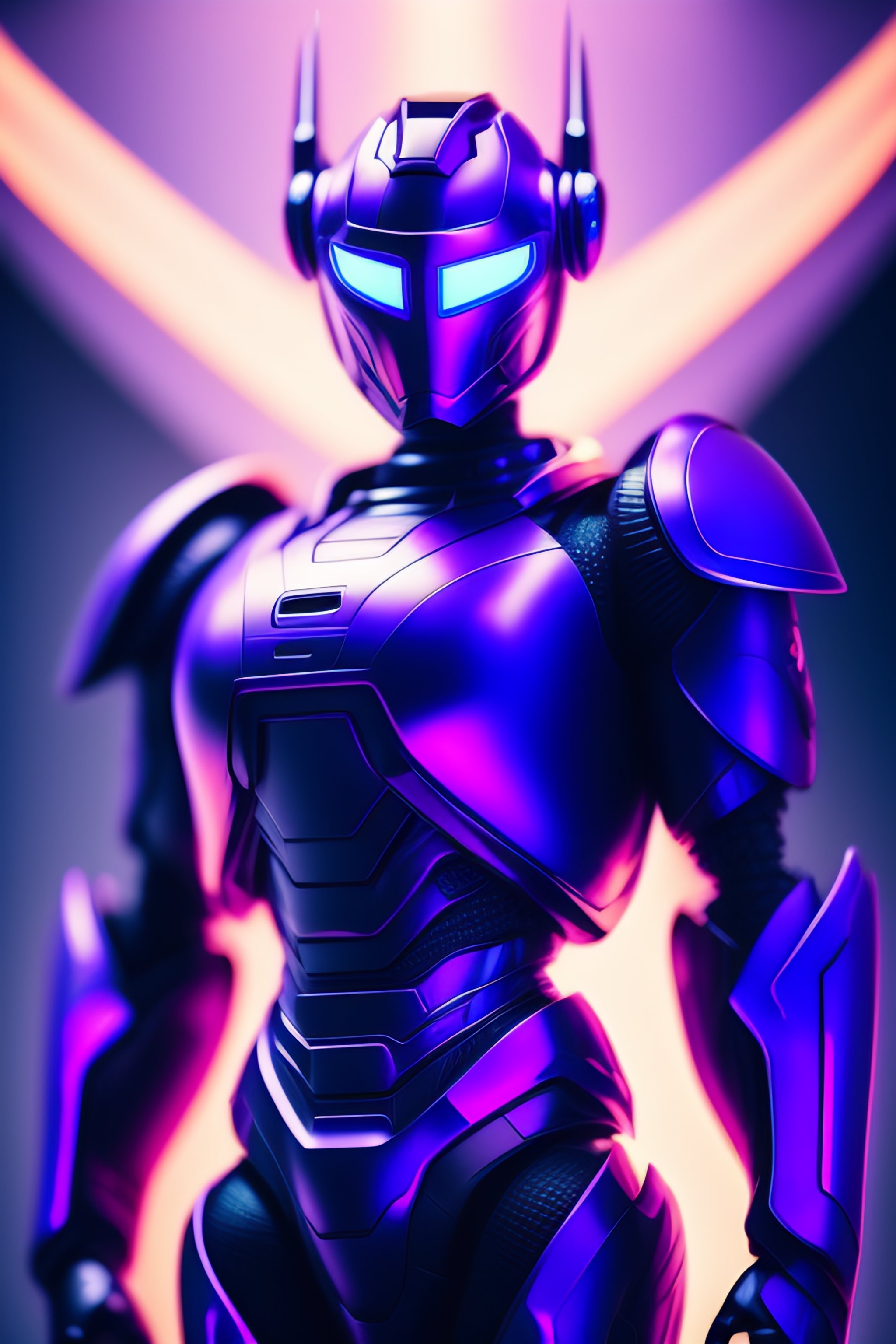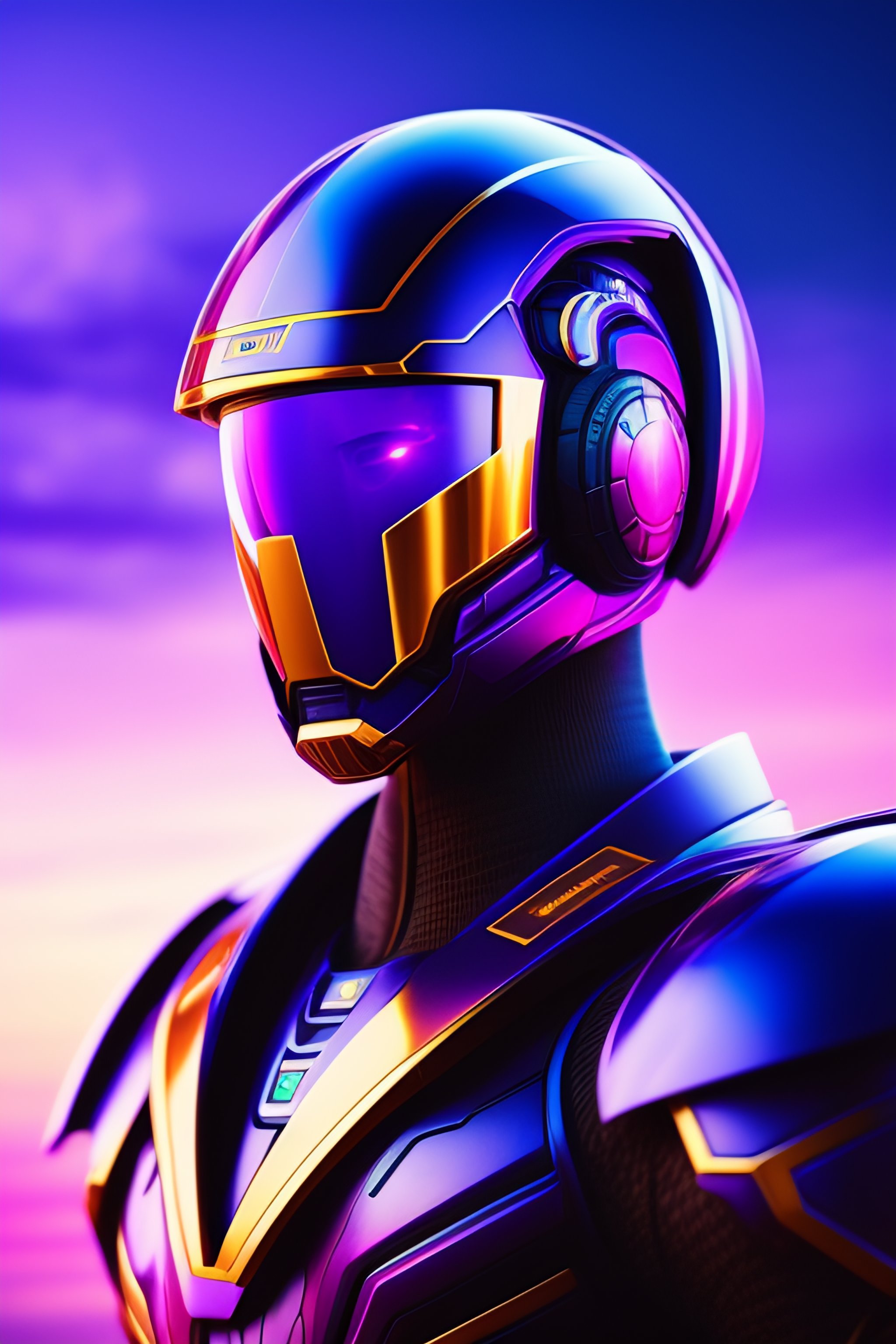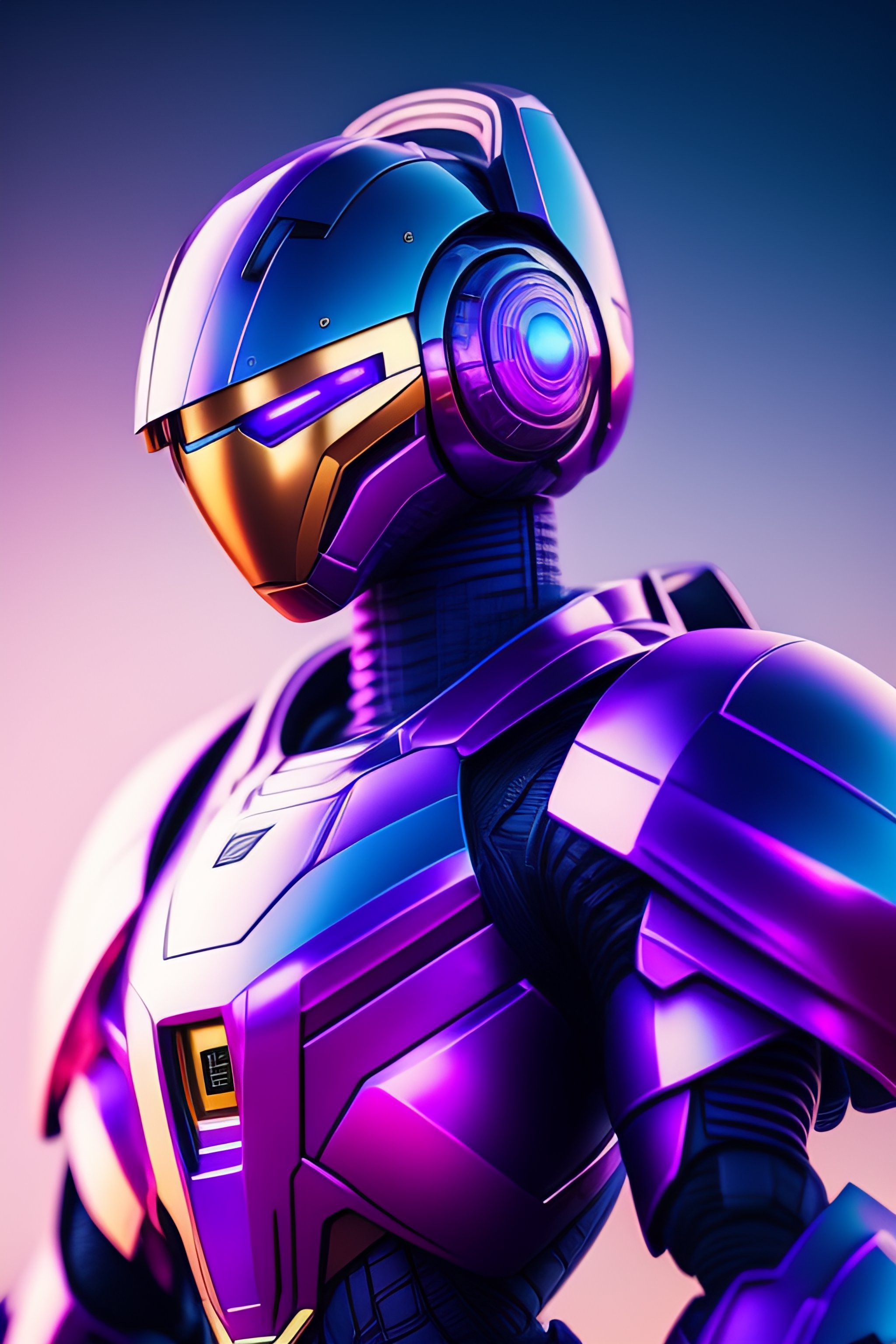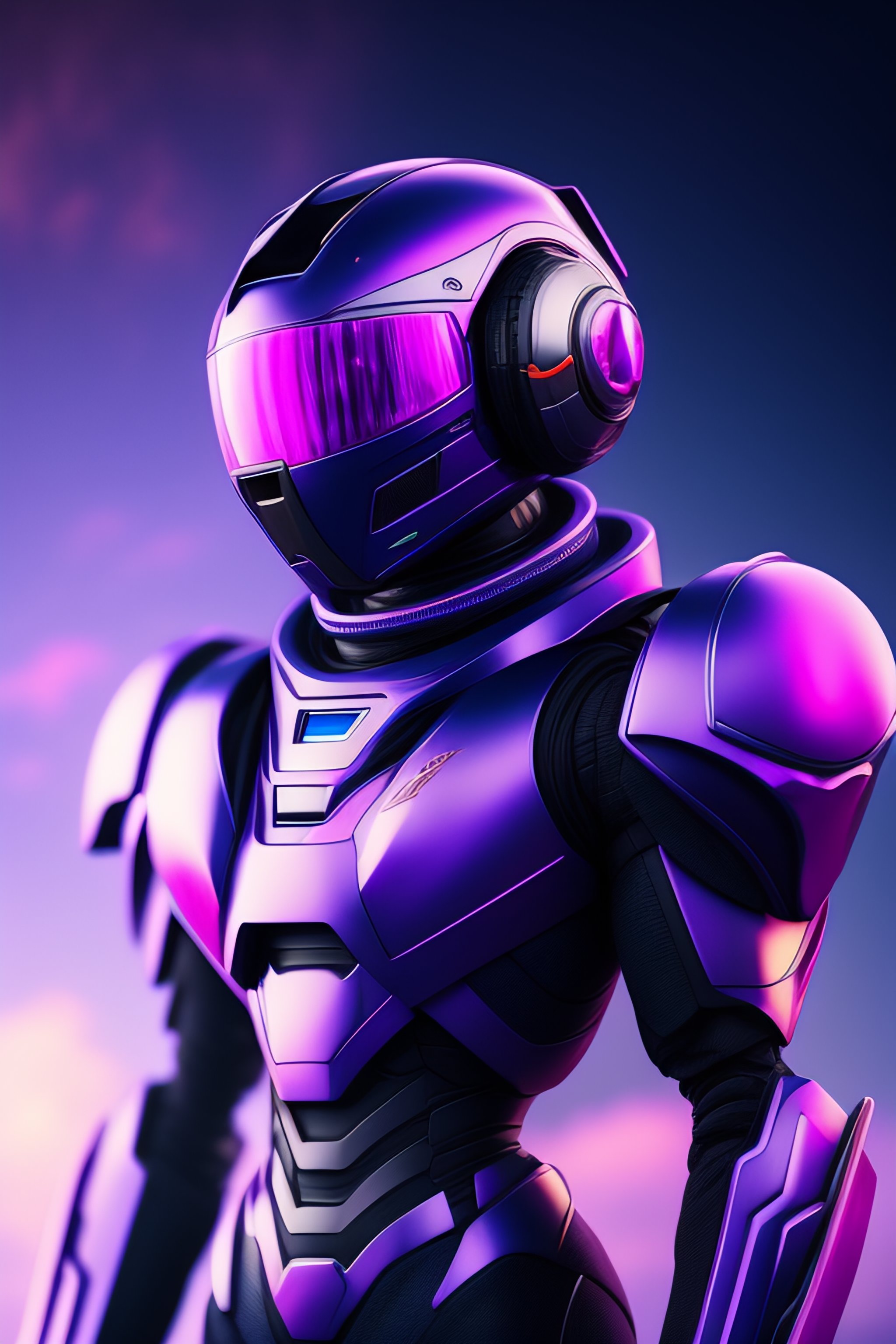 A hero robot portrait, bluish purple background, magnificent sky, spinning top logo on suit, with cute humanoid face, looking at camera