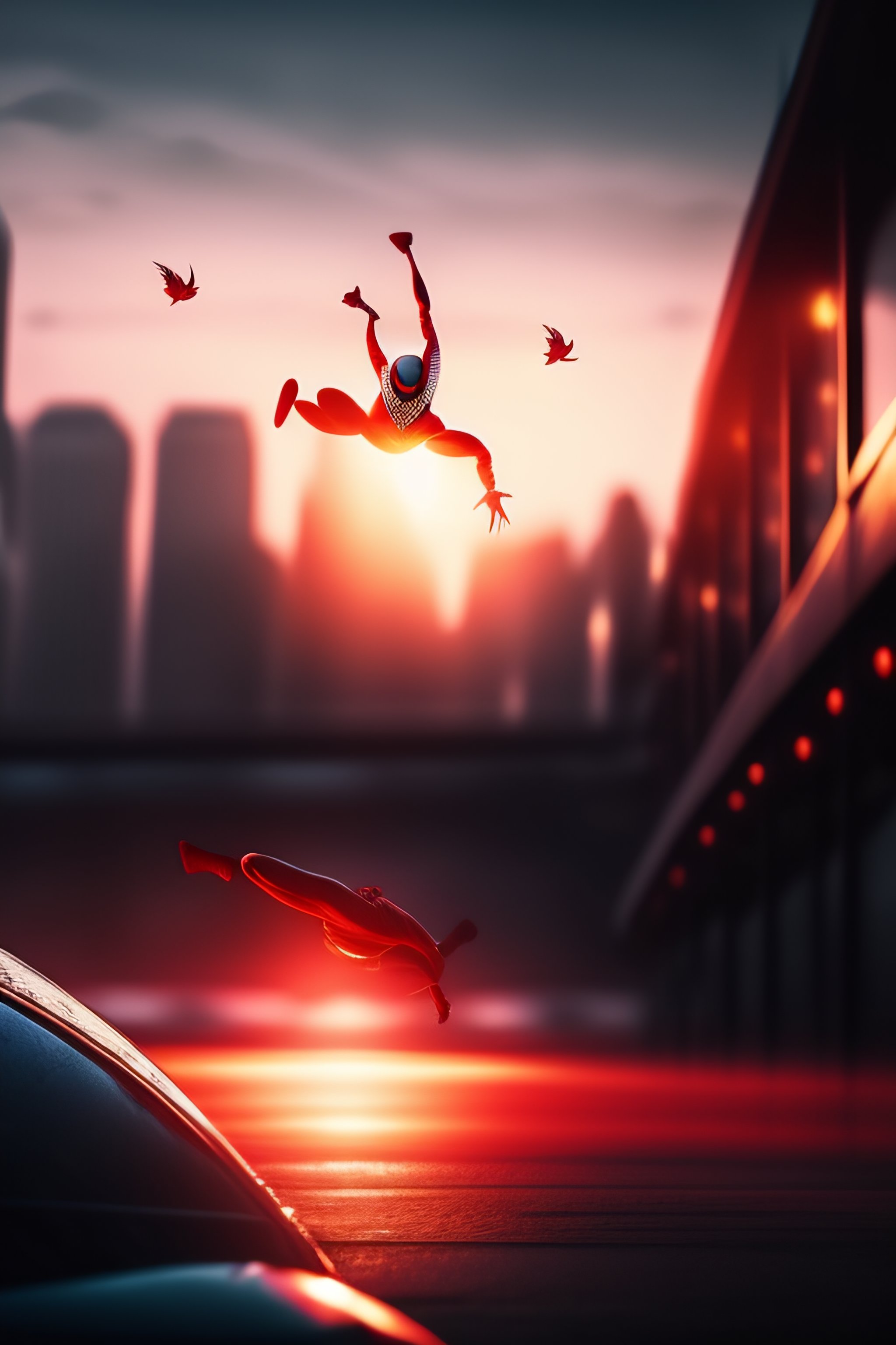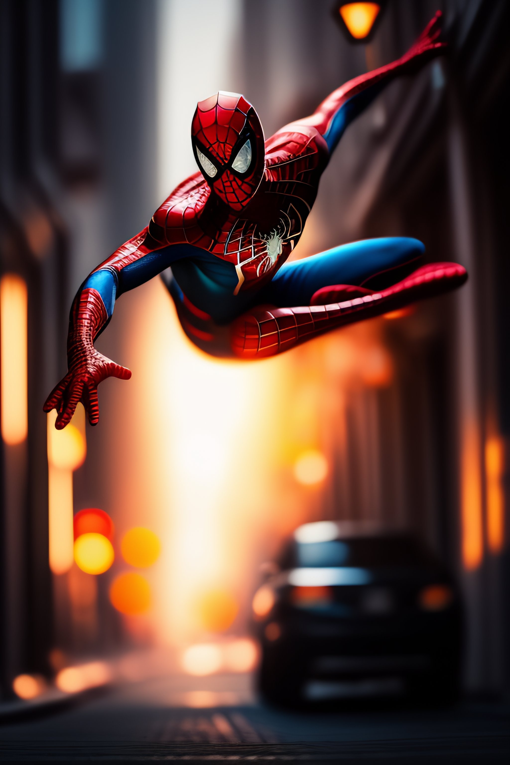 Spiderman falling, cinematic composition, dramatic pose, beautiful lighting, sharp, details, hyper-detailed, hd, hdr, 4k, 8k