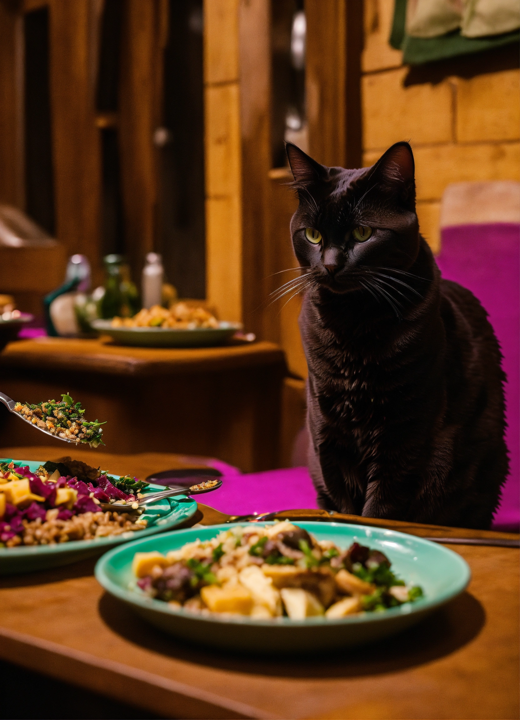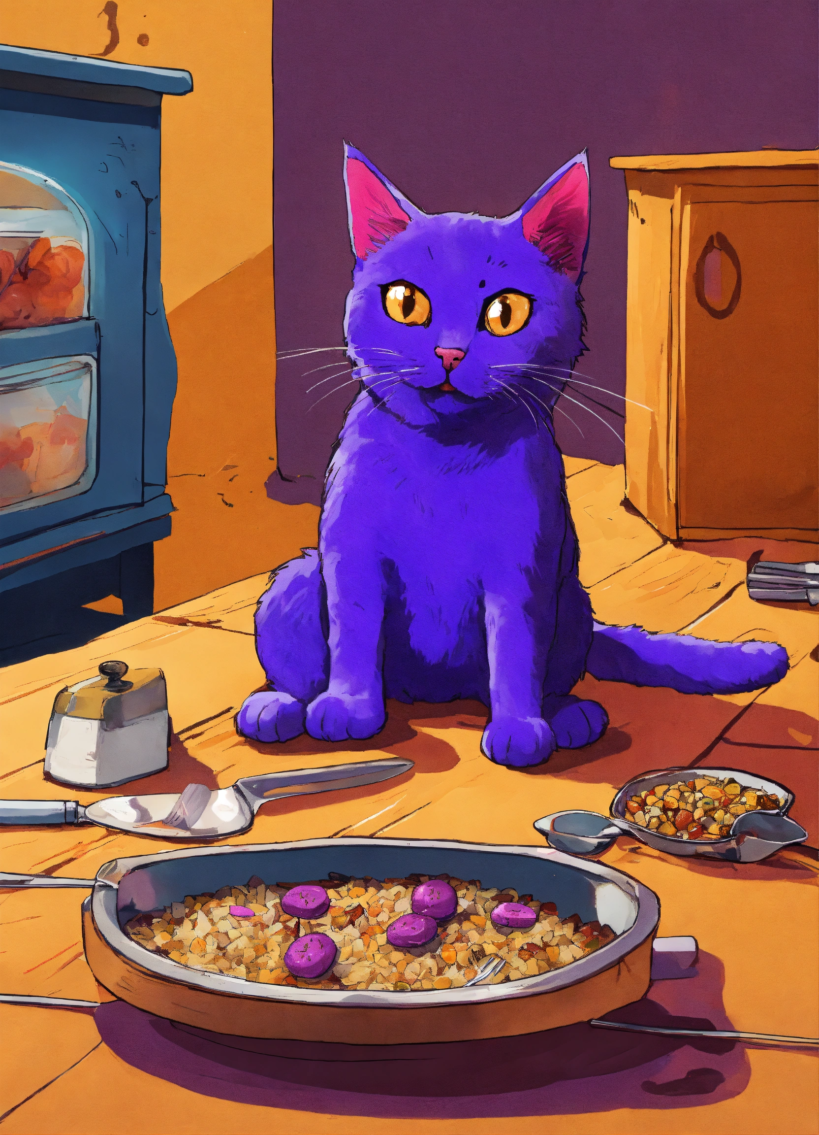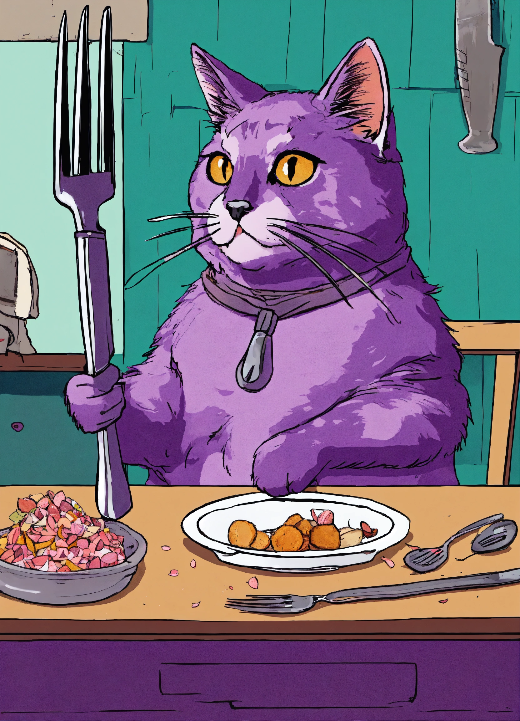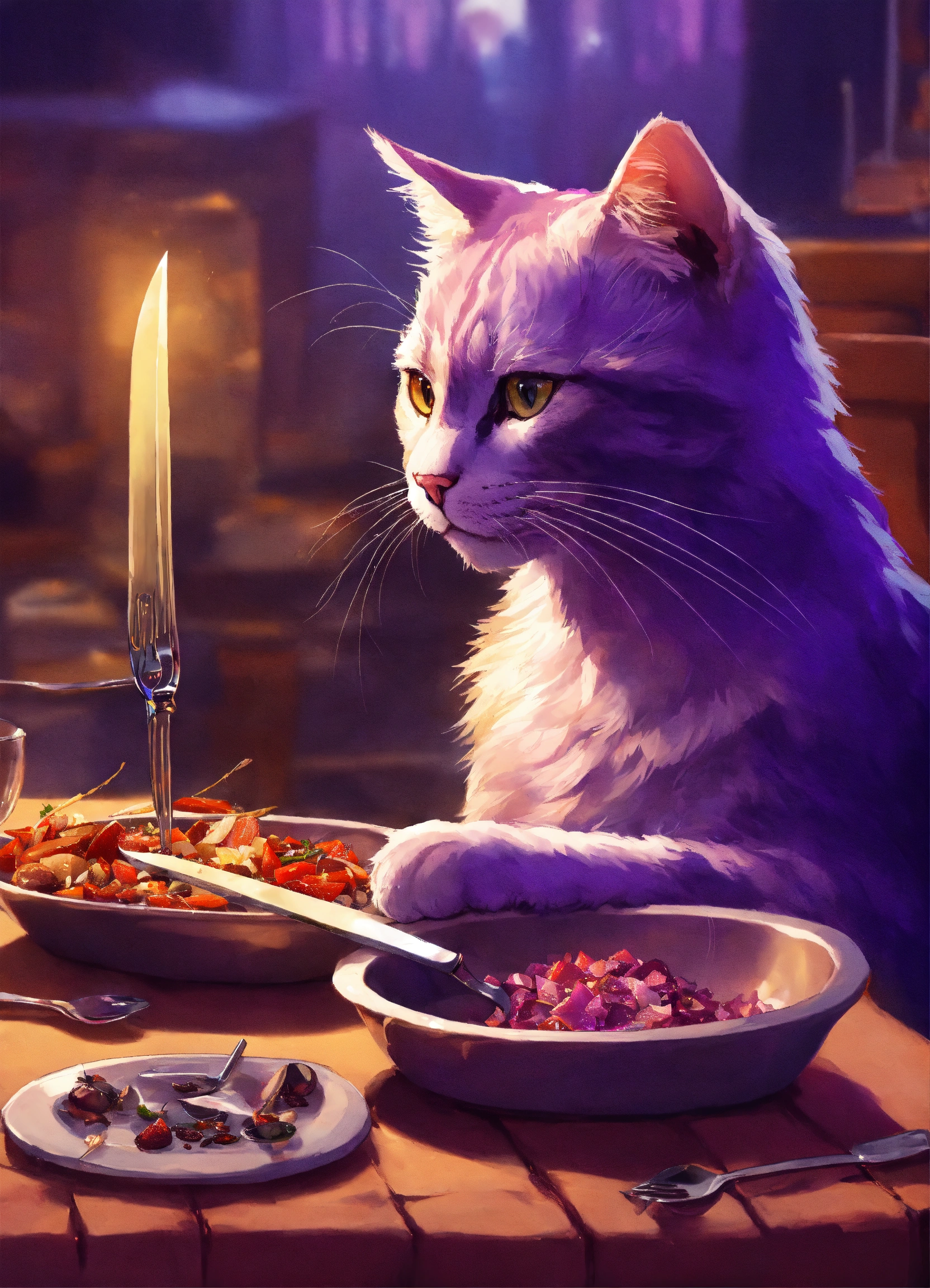 A cat holding a knife and fork and waiting for food