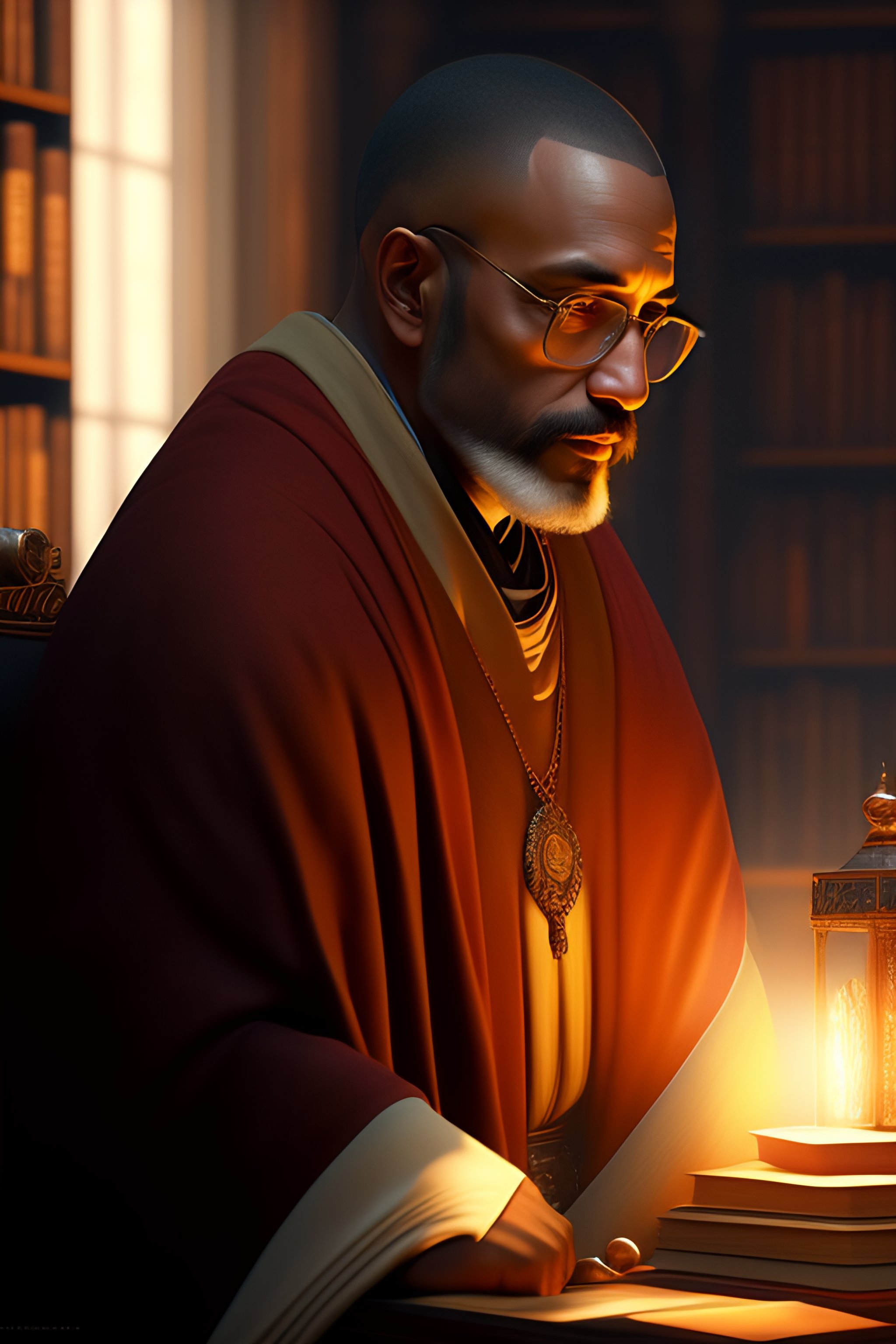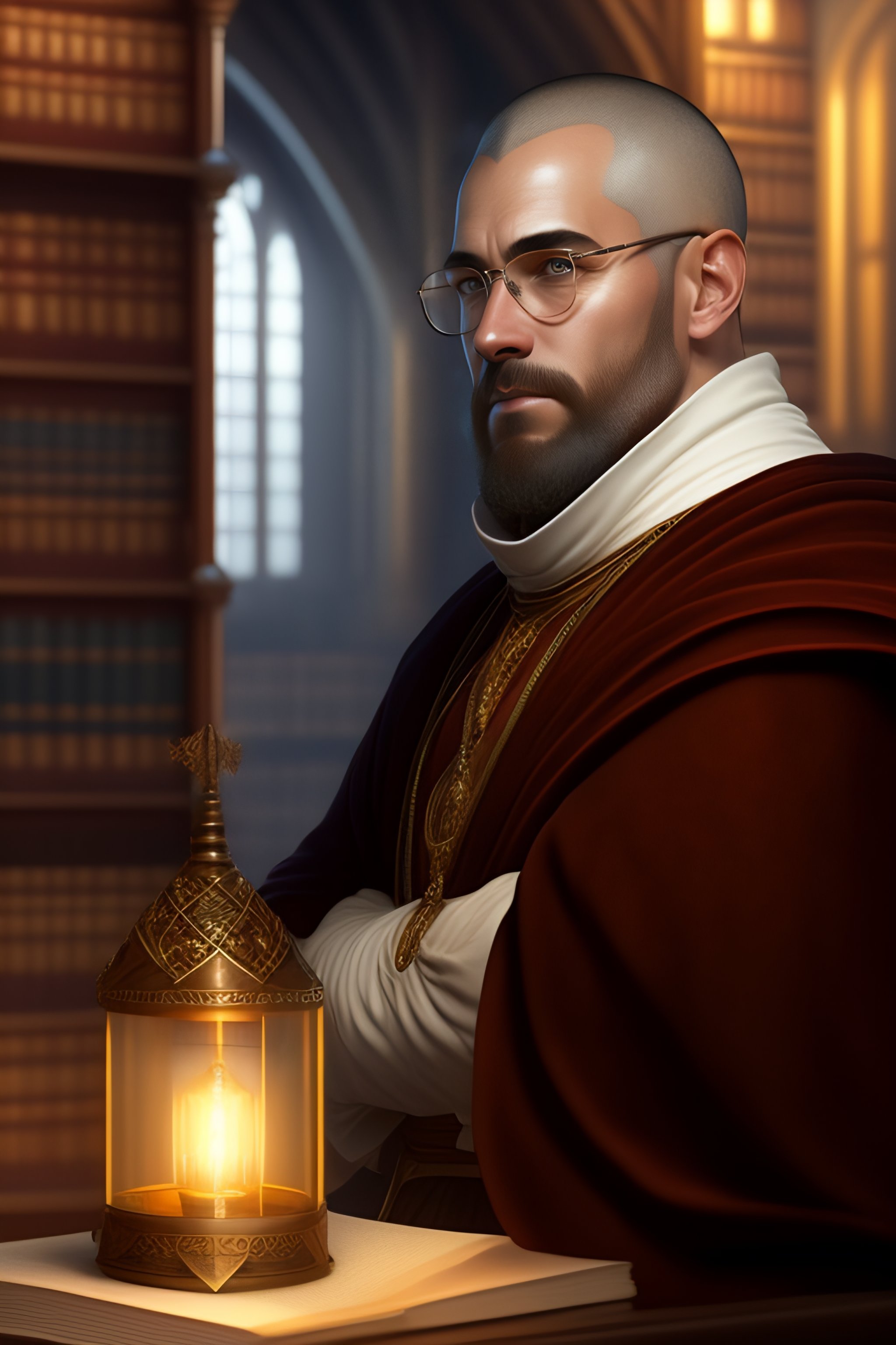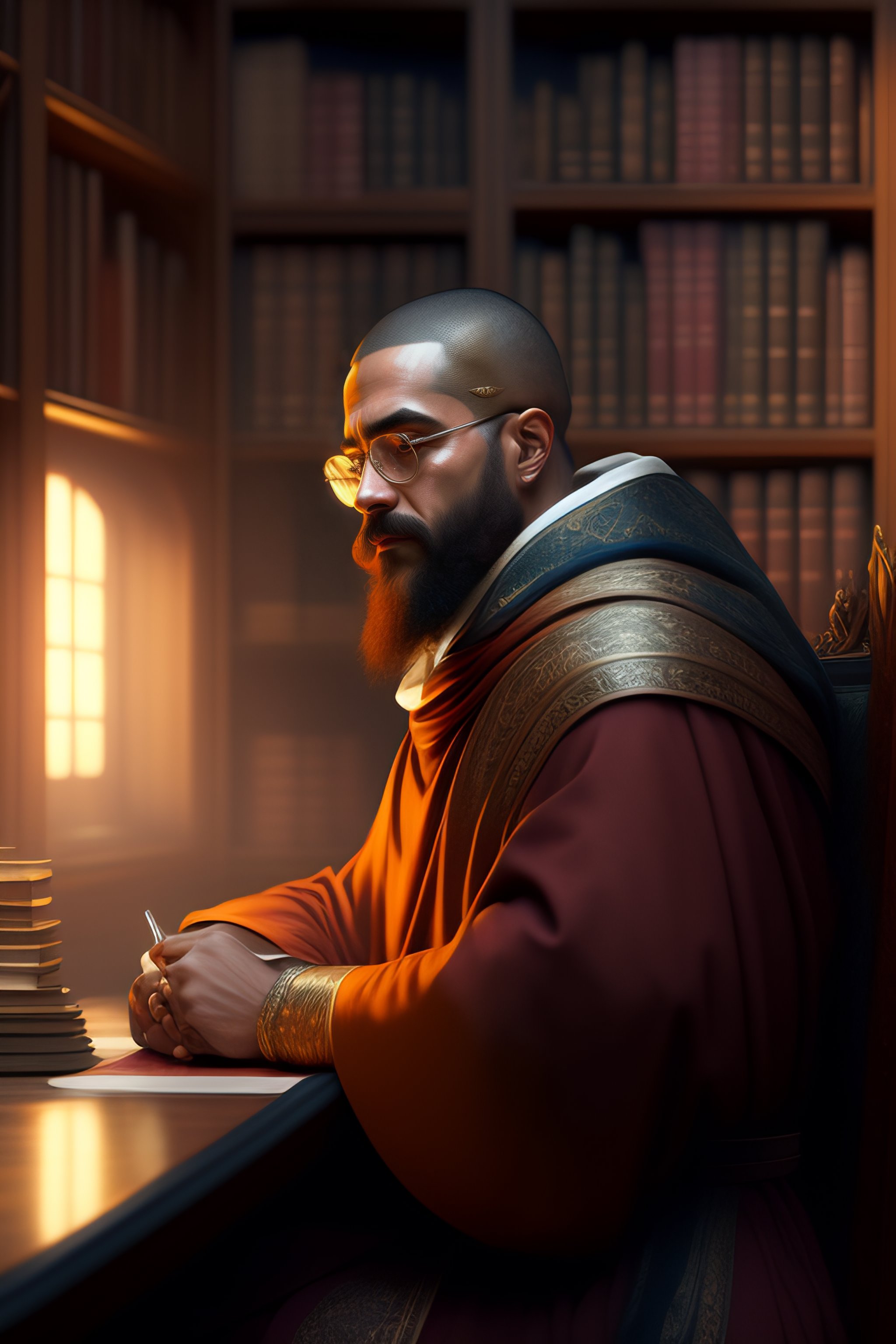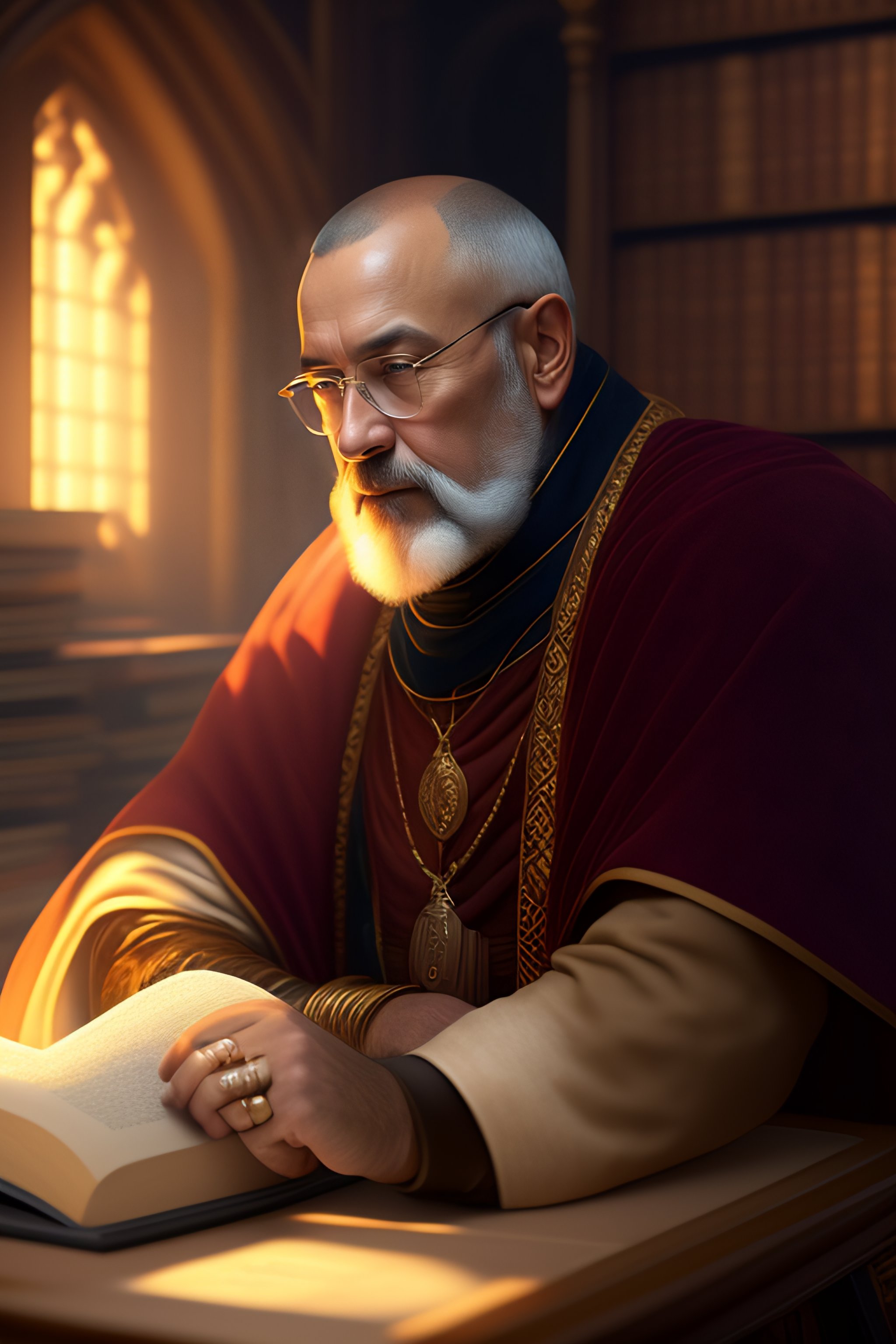 Portrait of medieval librarian monk wizard seated in a library at a desk by greg rutkowski and raymond swanland, trending on artstation, ultra realistic digital art