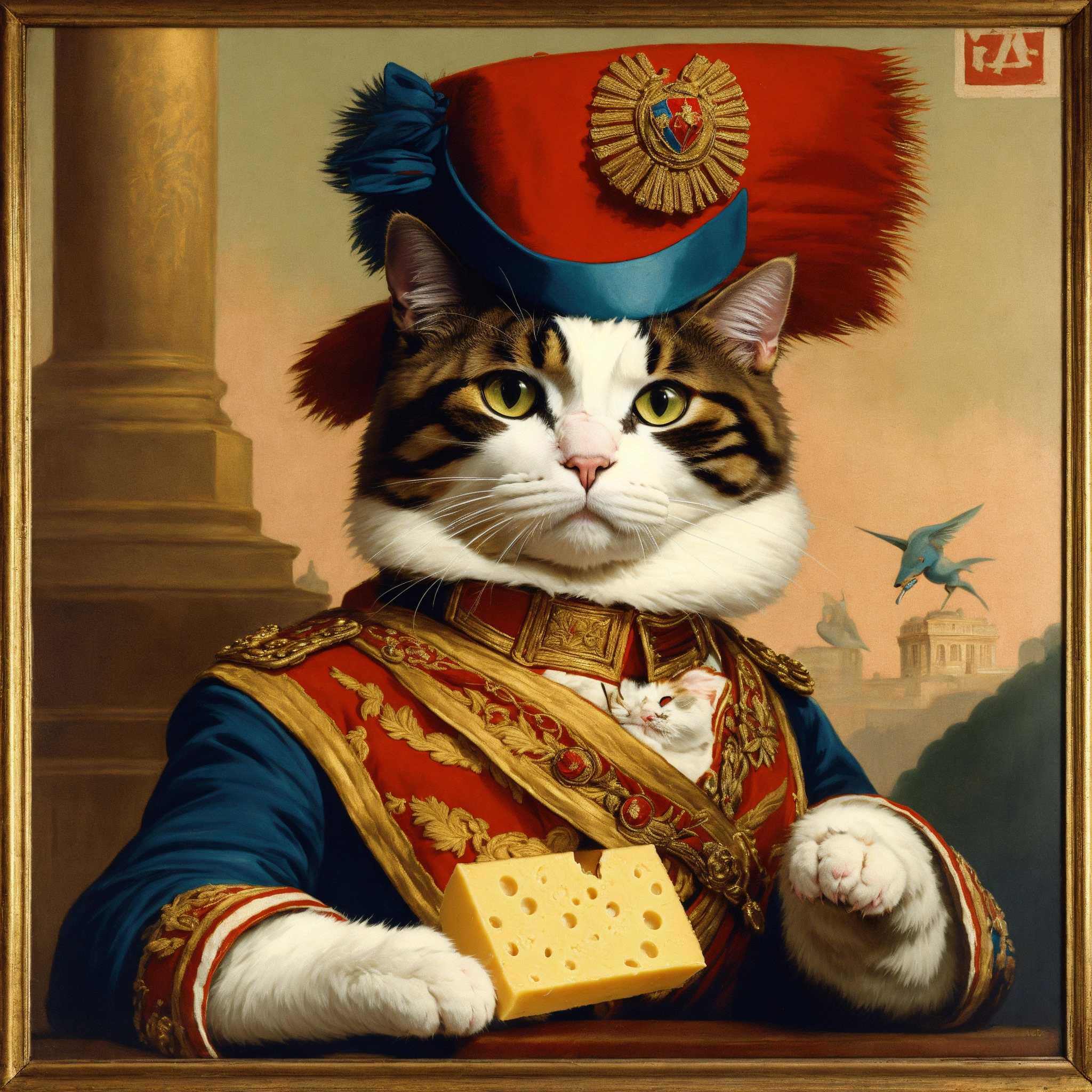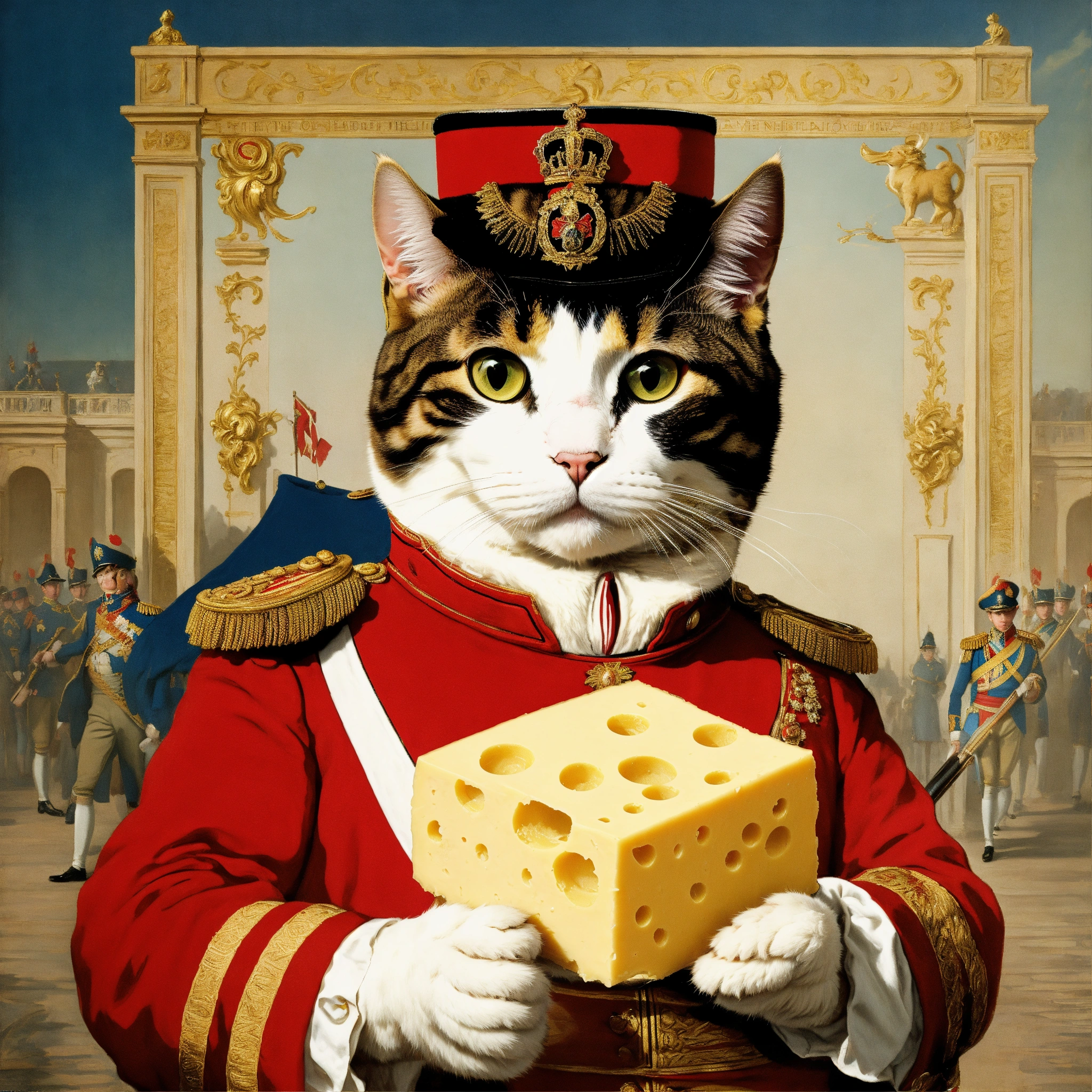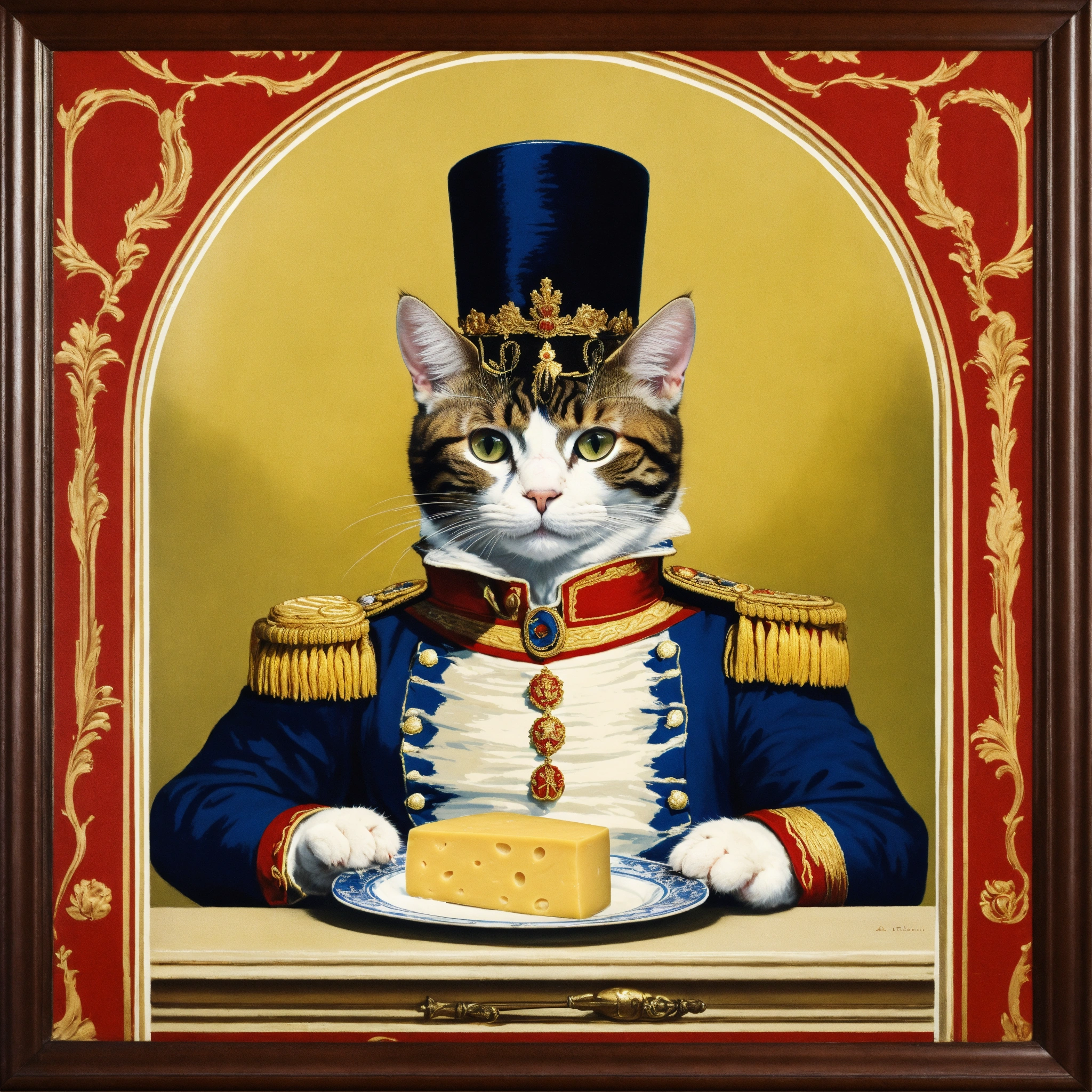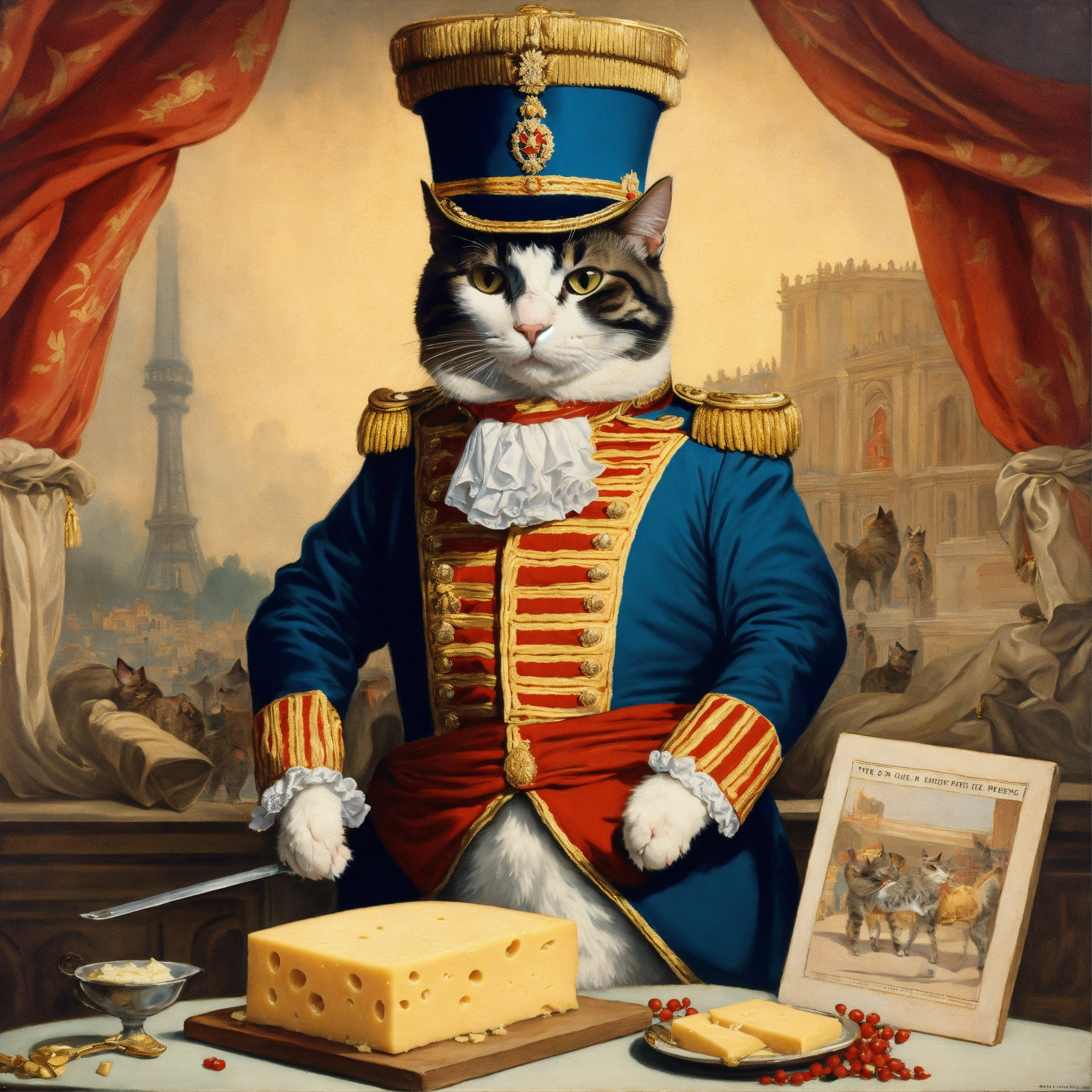 A propaganda poster depicting a cat dressed as french emperor napoleon holding a piece of cheese