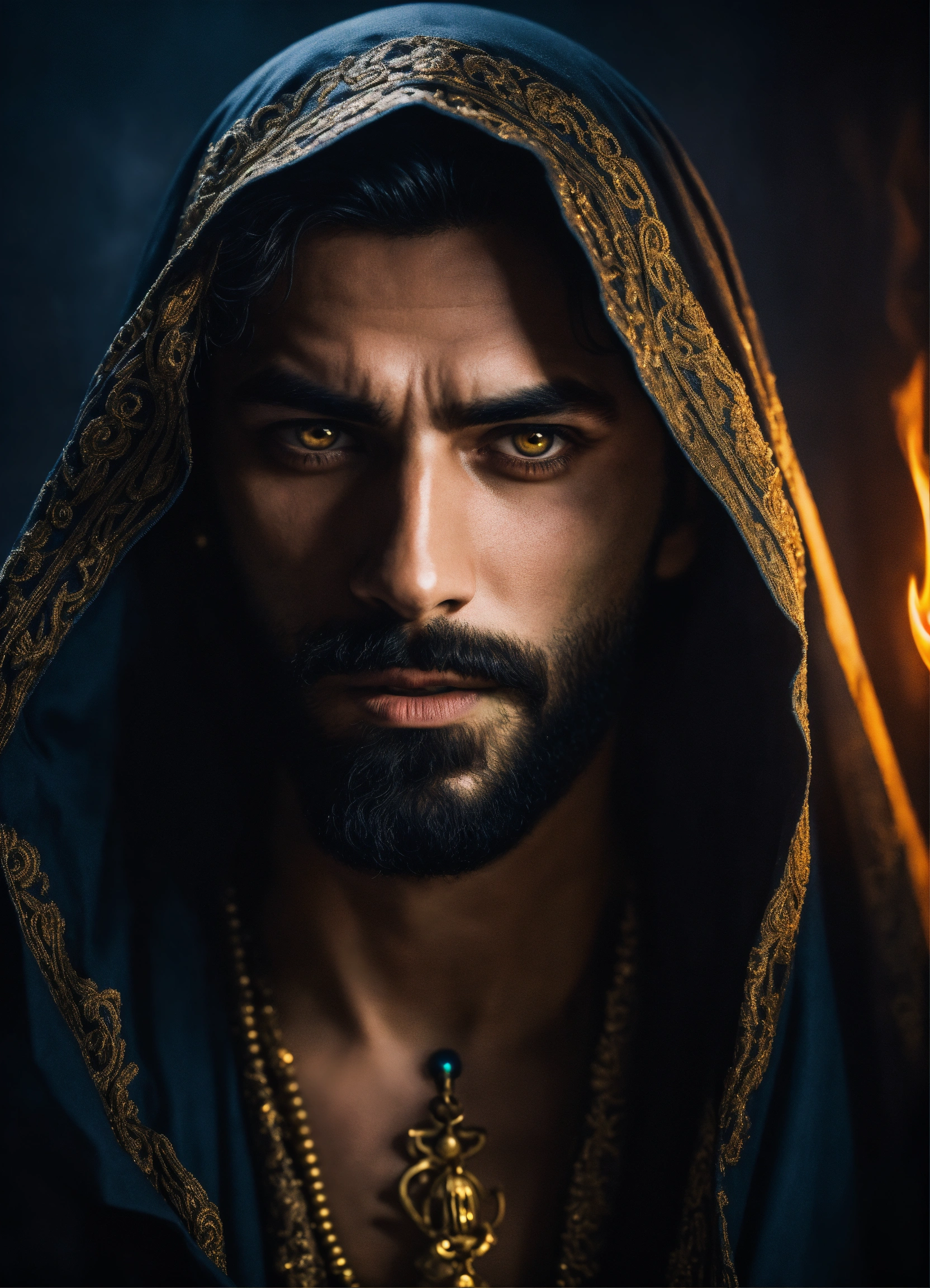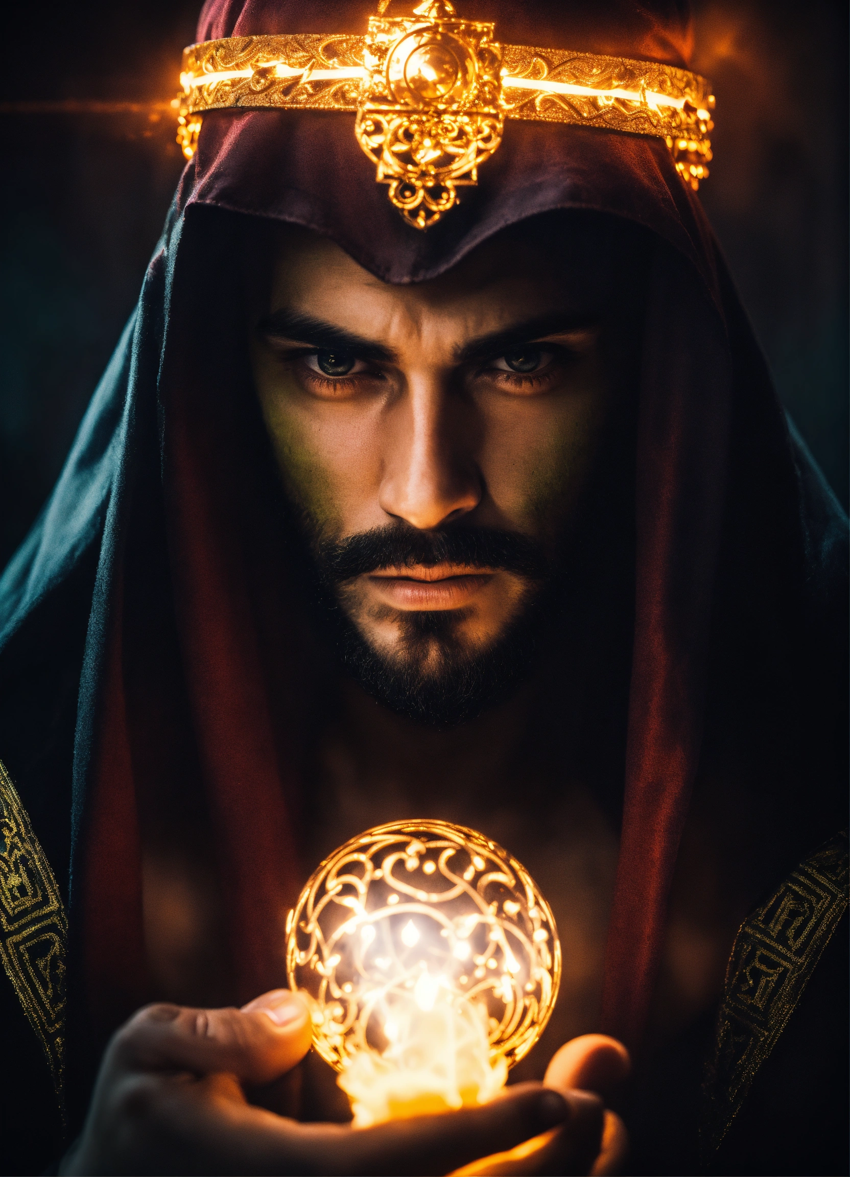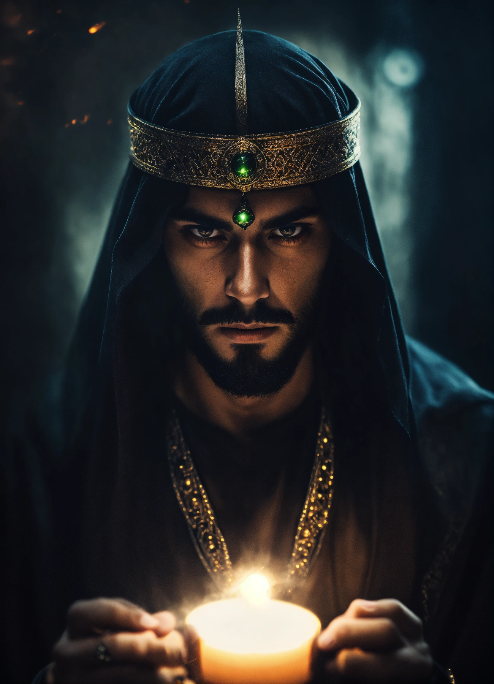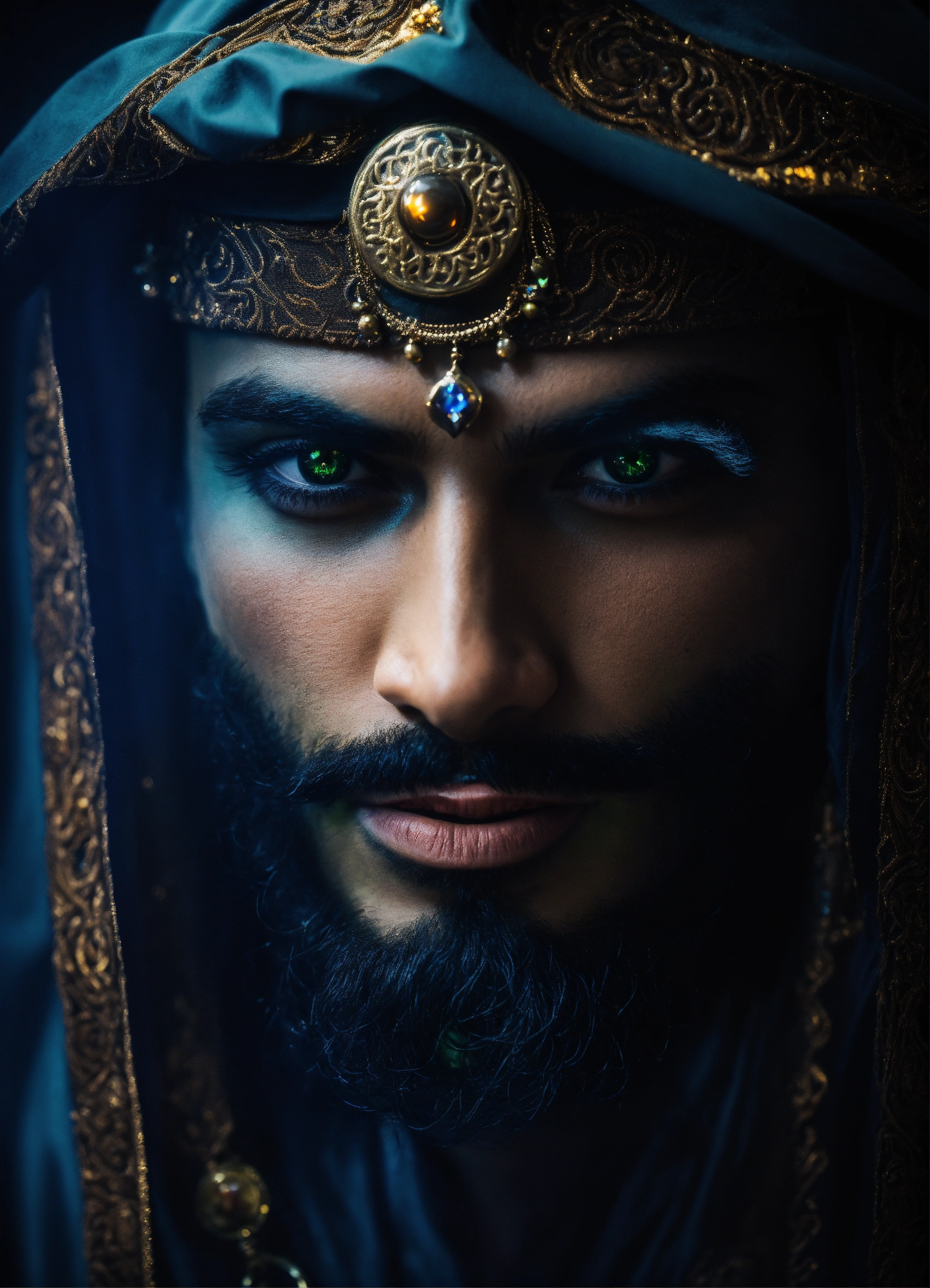 Dark, mysterious and dramatic headshot of a handsome arabic wicked sorcerer with a mesmerizing glowing trance-inducing stare, occult powers, sinister aura.
