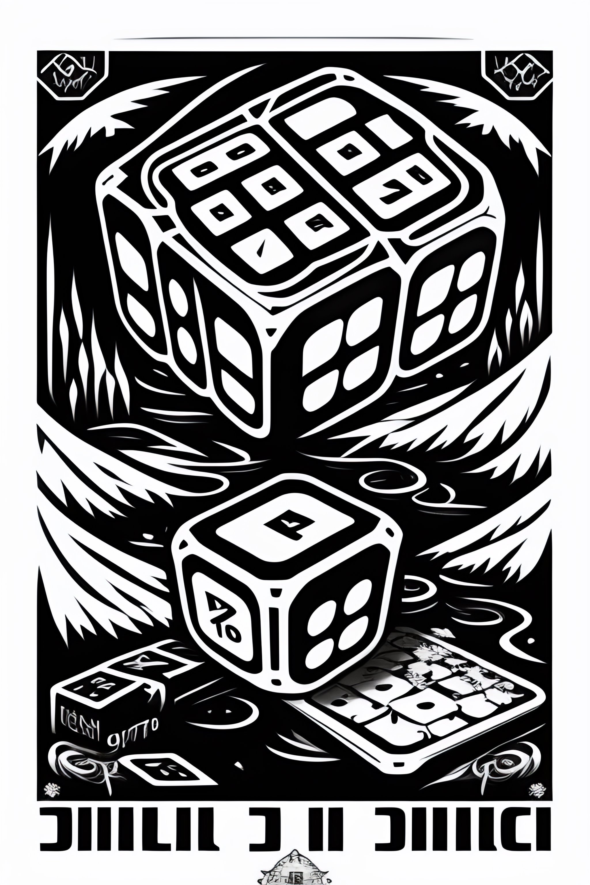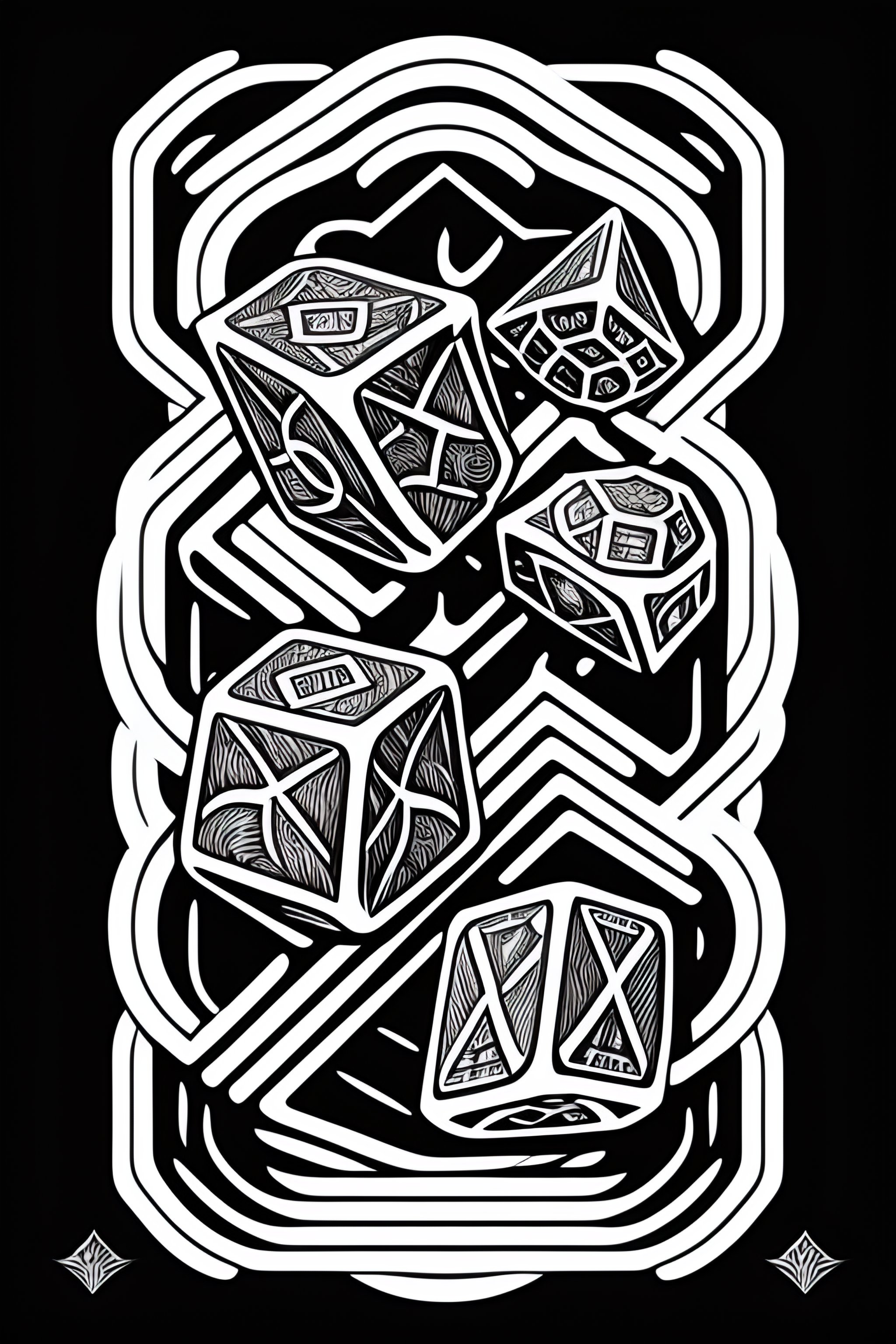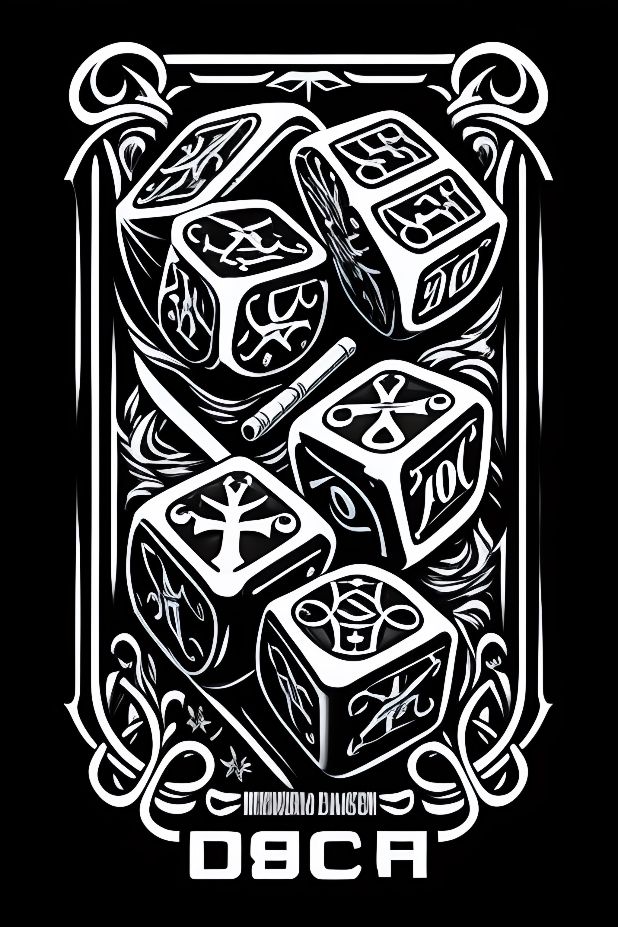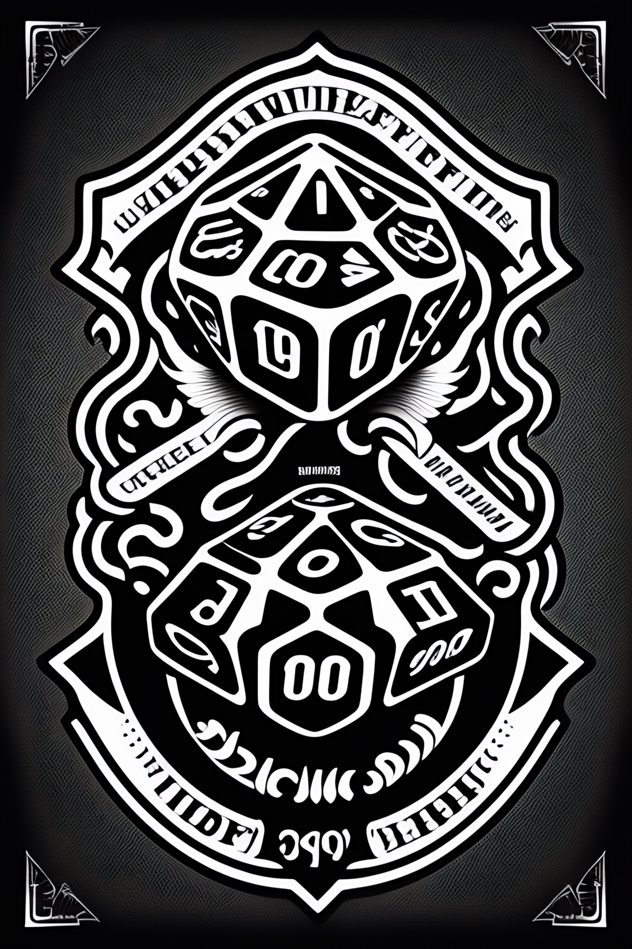 Skeletal hands holding d20 dice, black and white, line drawing, death metal style, 80s style, vector, vectorcore, tshirt design, 300dpi, highly detailed
