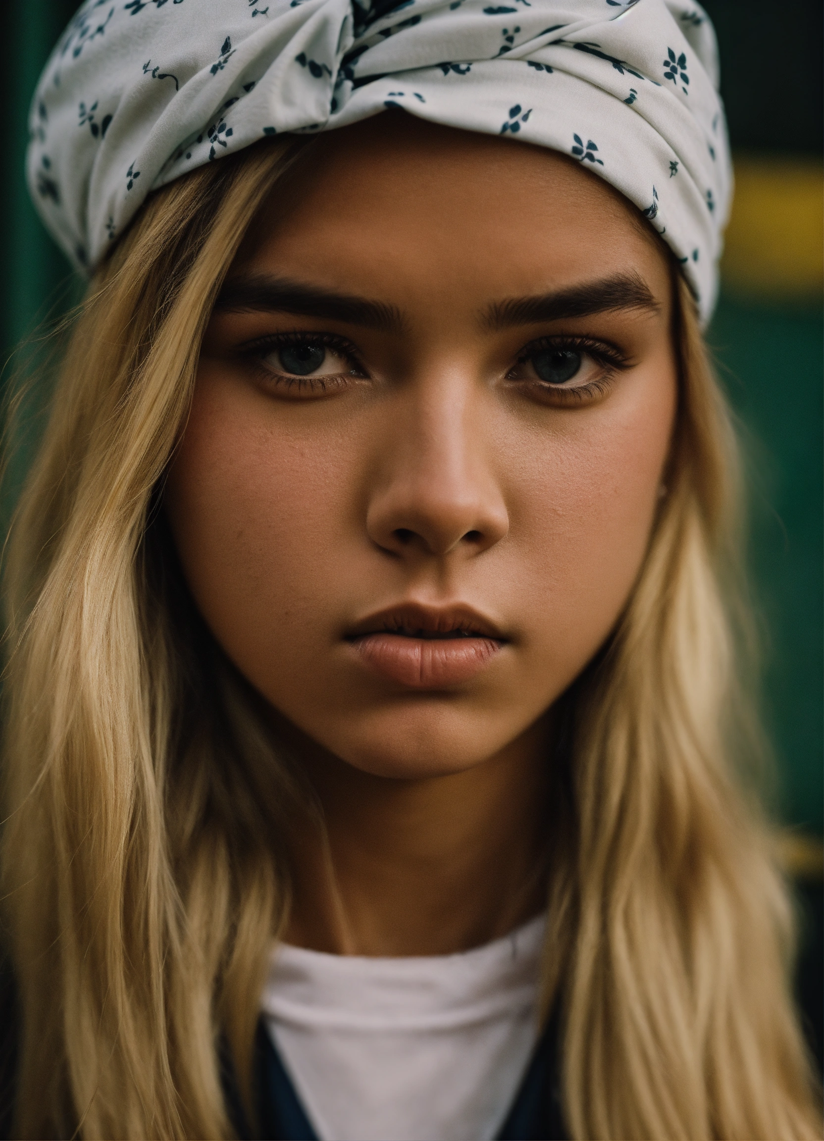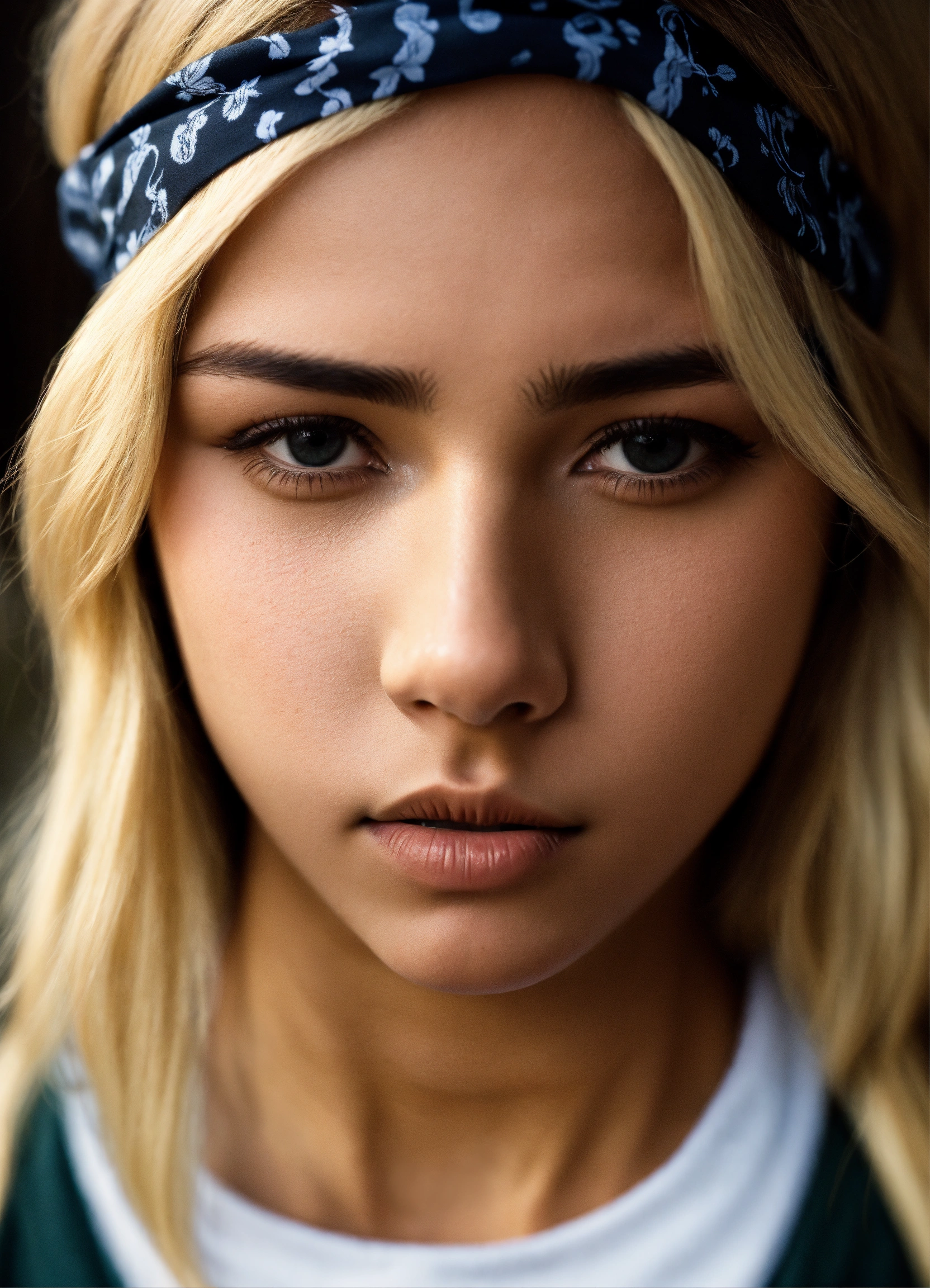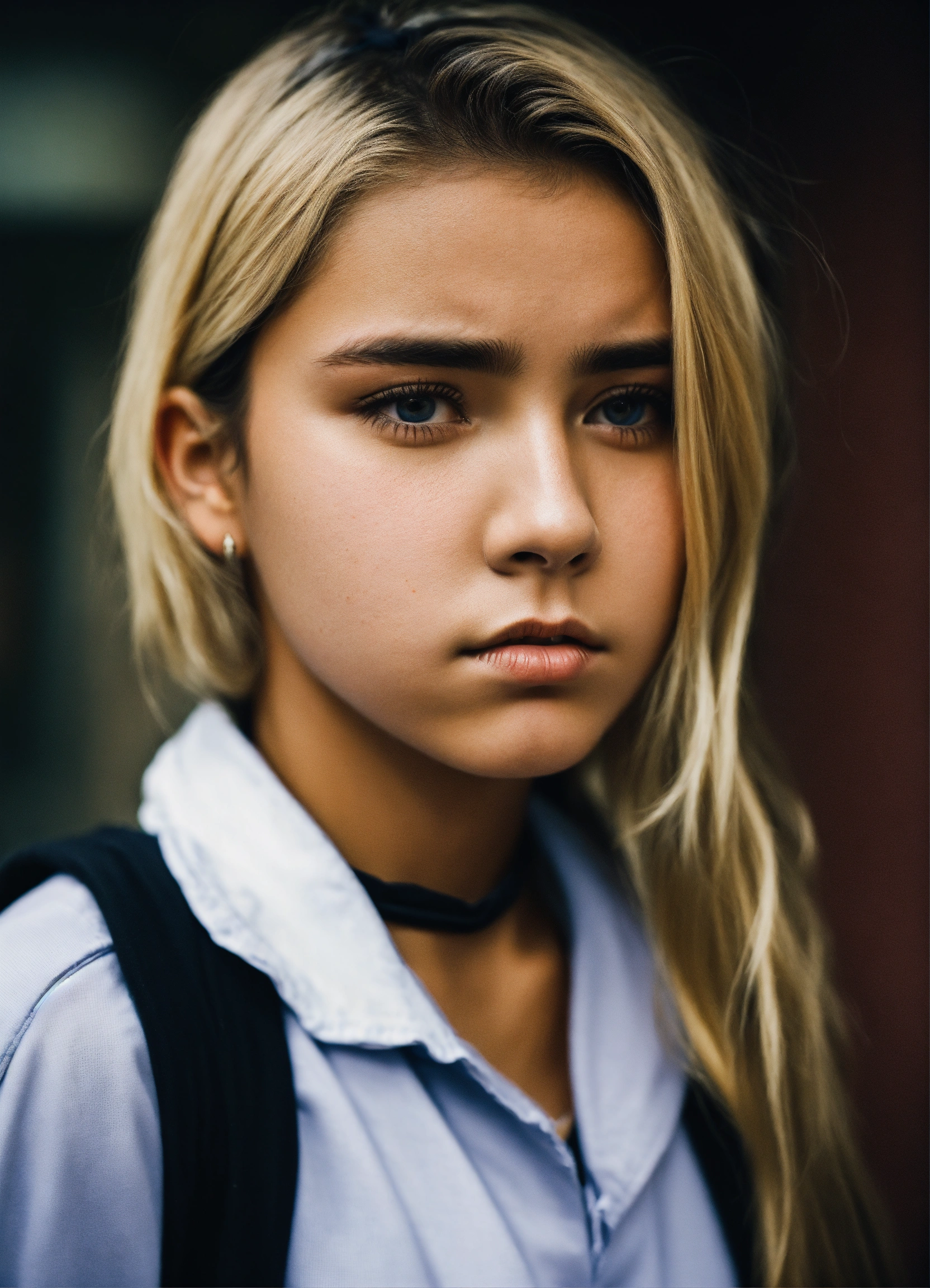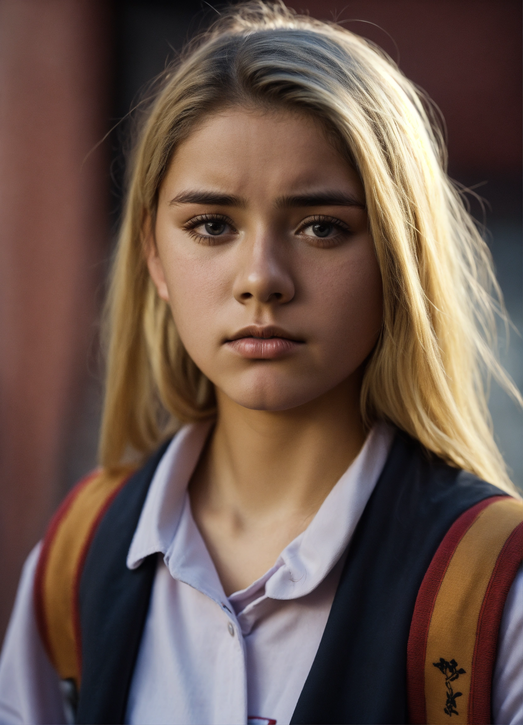 14 yo girl blonde latina, black bandana on head, hopeless, hopelessness, feeling lost, fear, closeup, cinematographic, school uniform, looking front