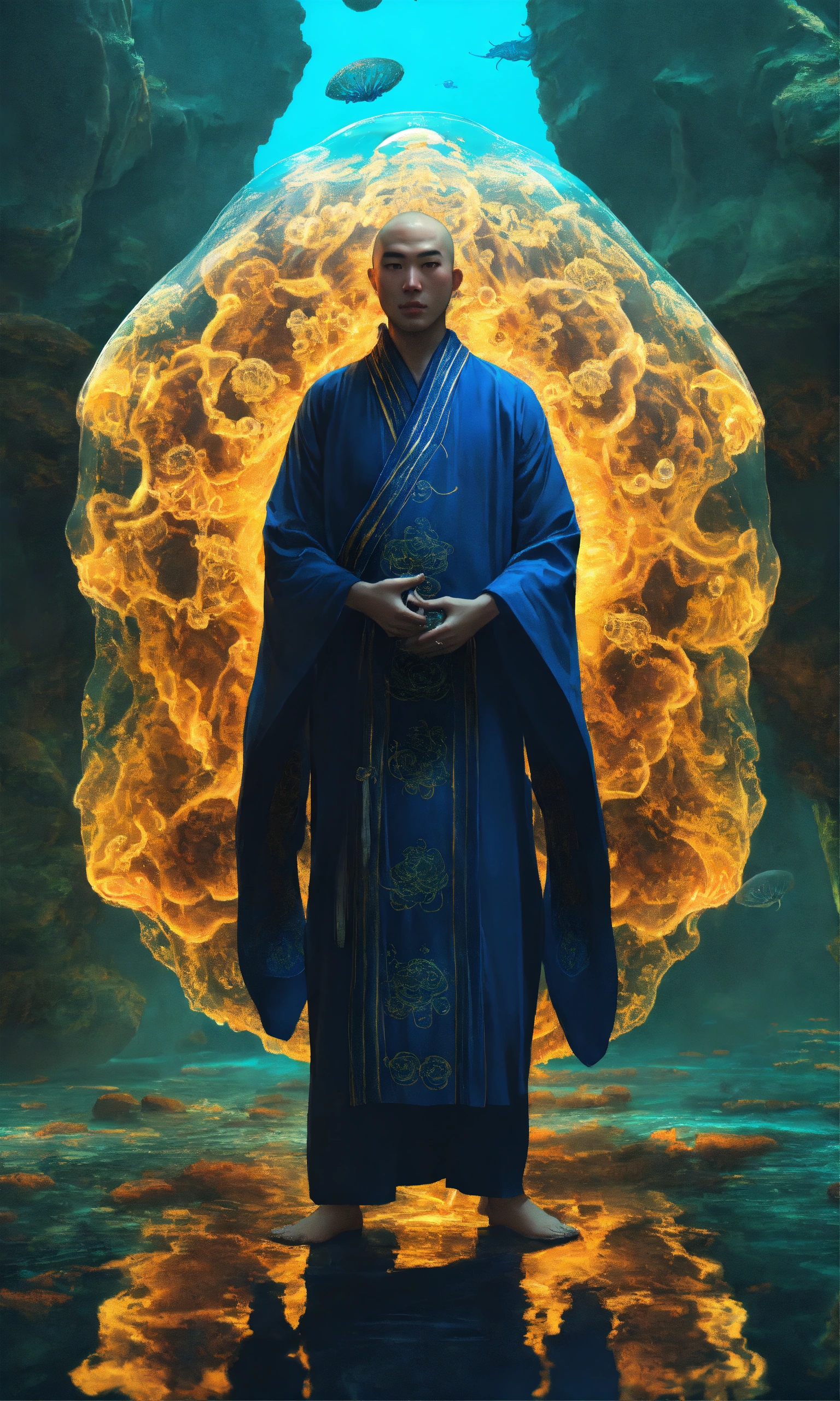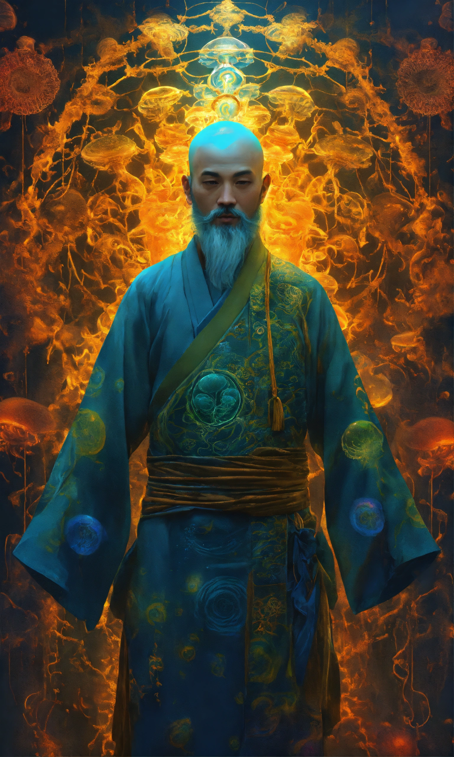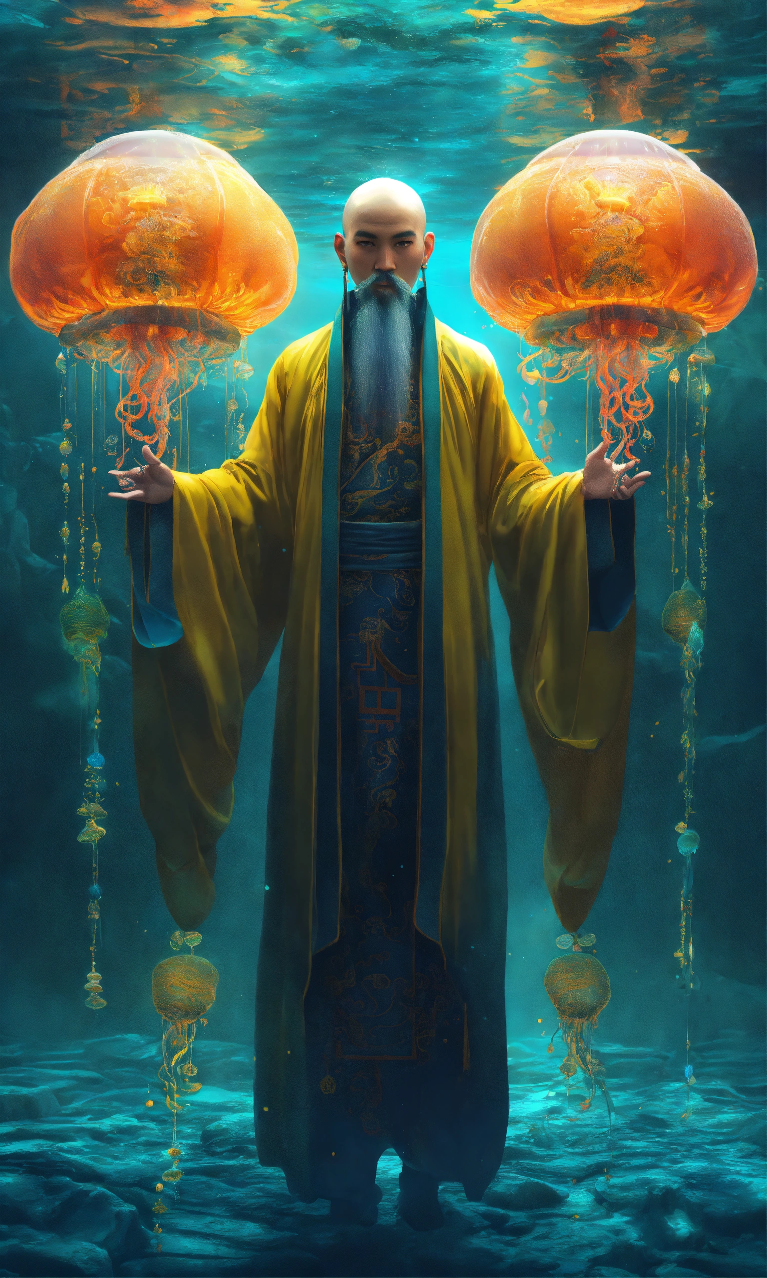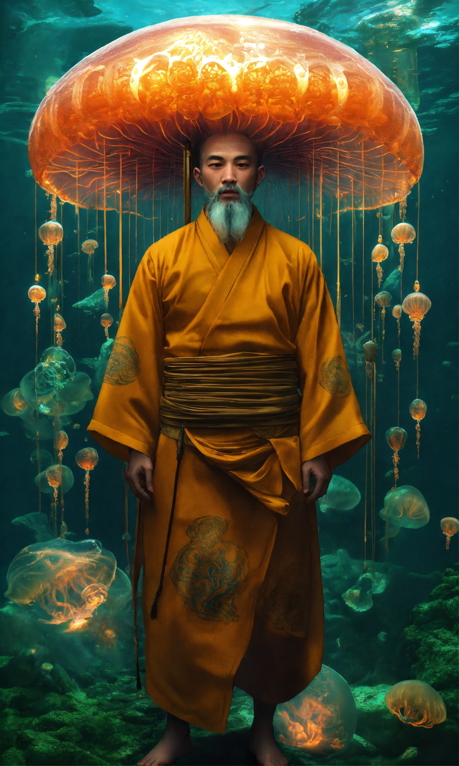 Taoist monk shaolin tesseract fractal underwater realiistic faces jellyfish wizard turkish cyborg lines, full body