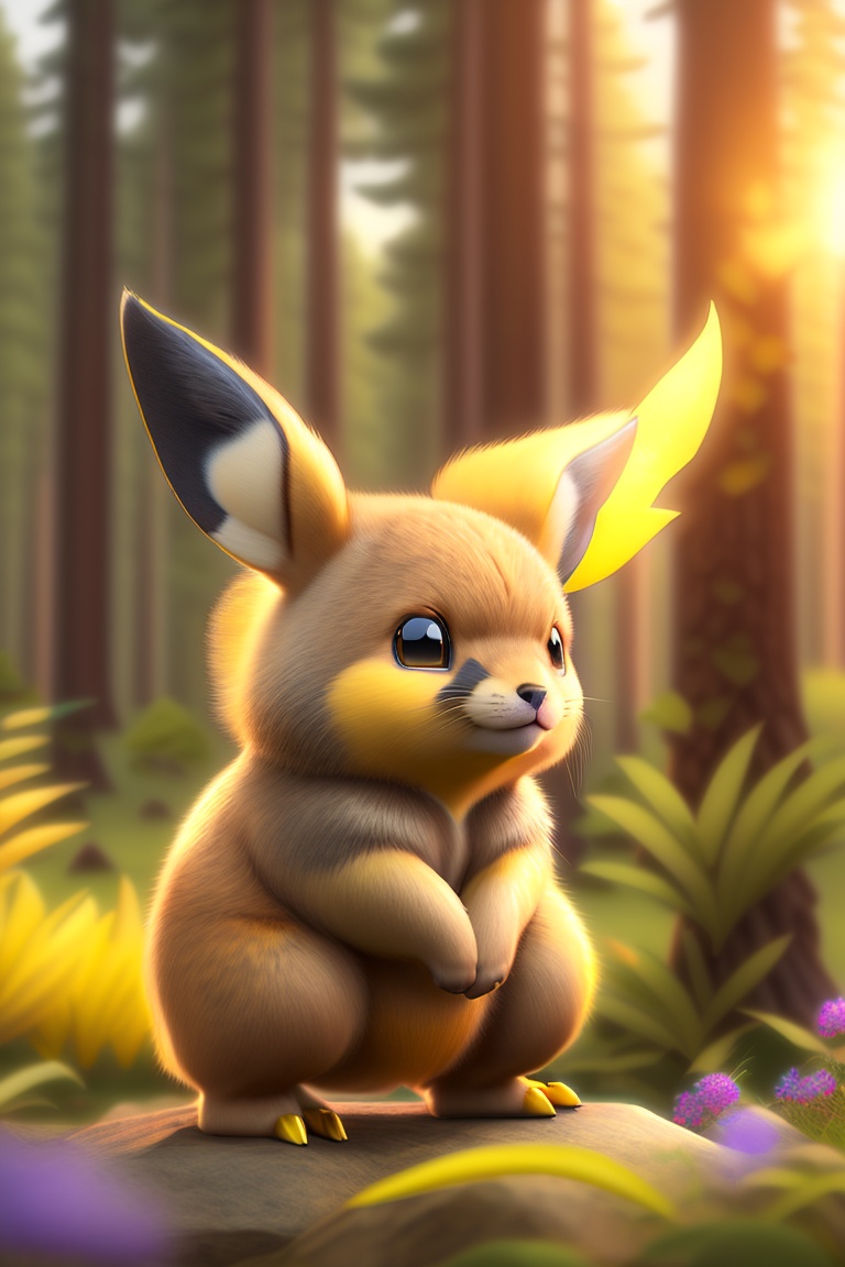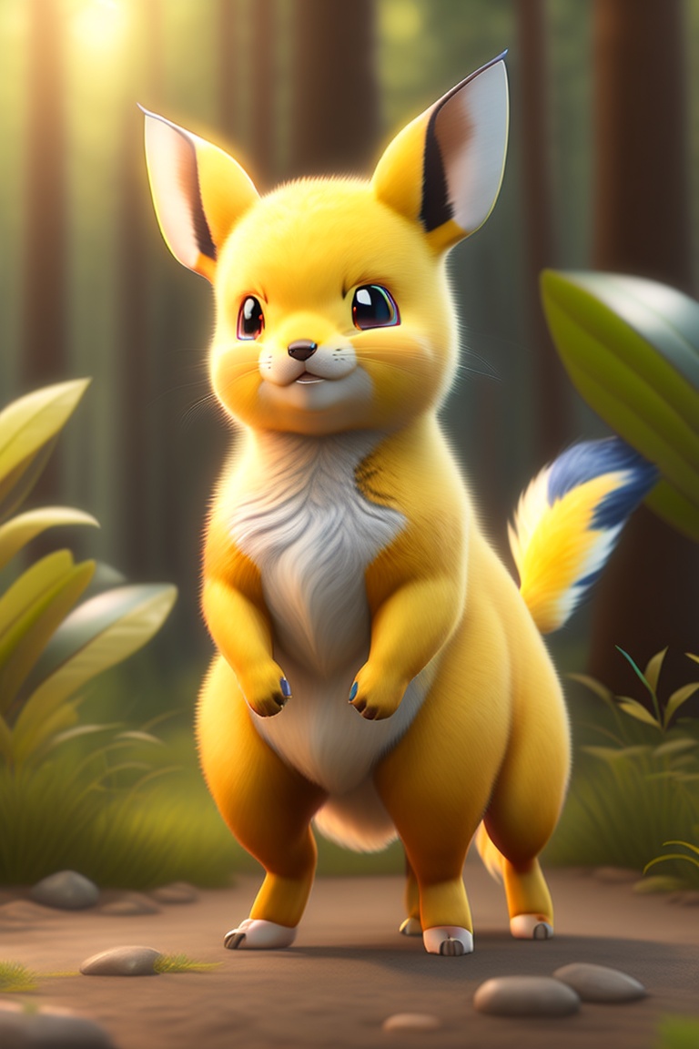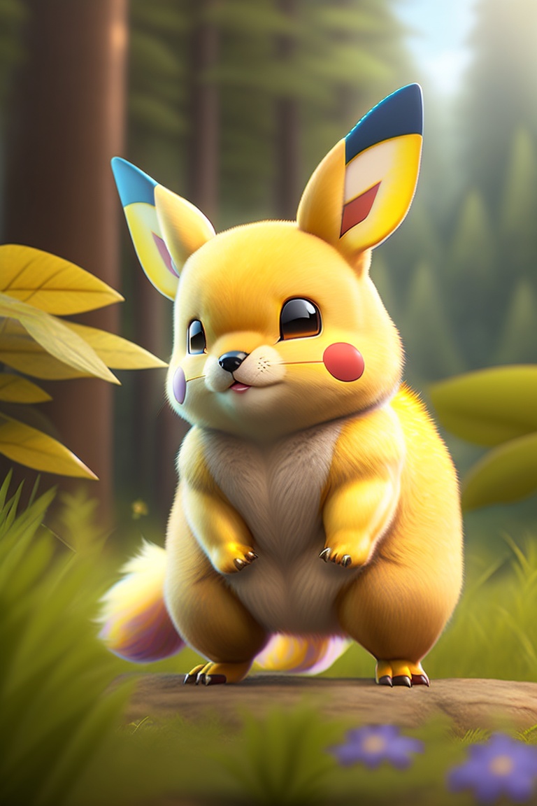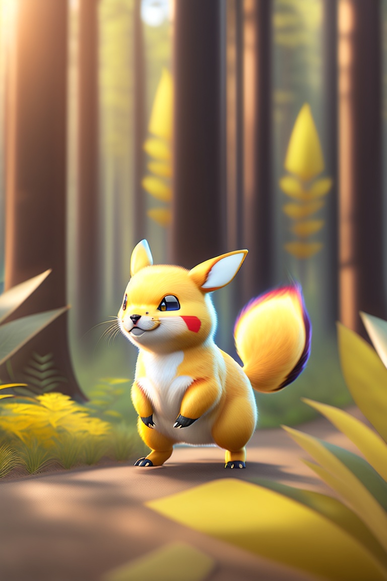 Pikatchu pokemon standing lightning bolt tail 8k render, detailed, hyper realistic, forest background