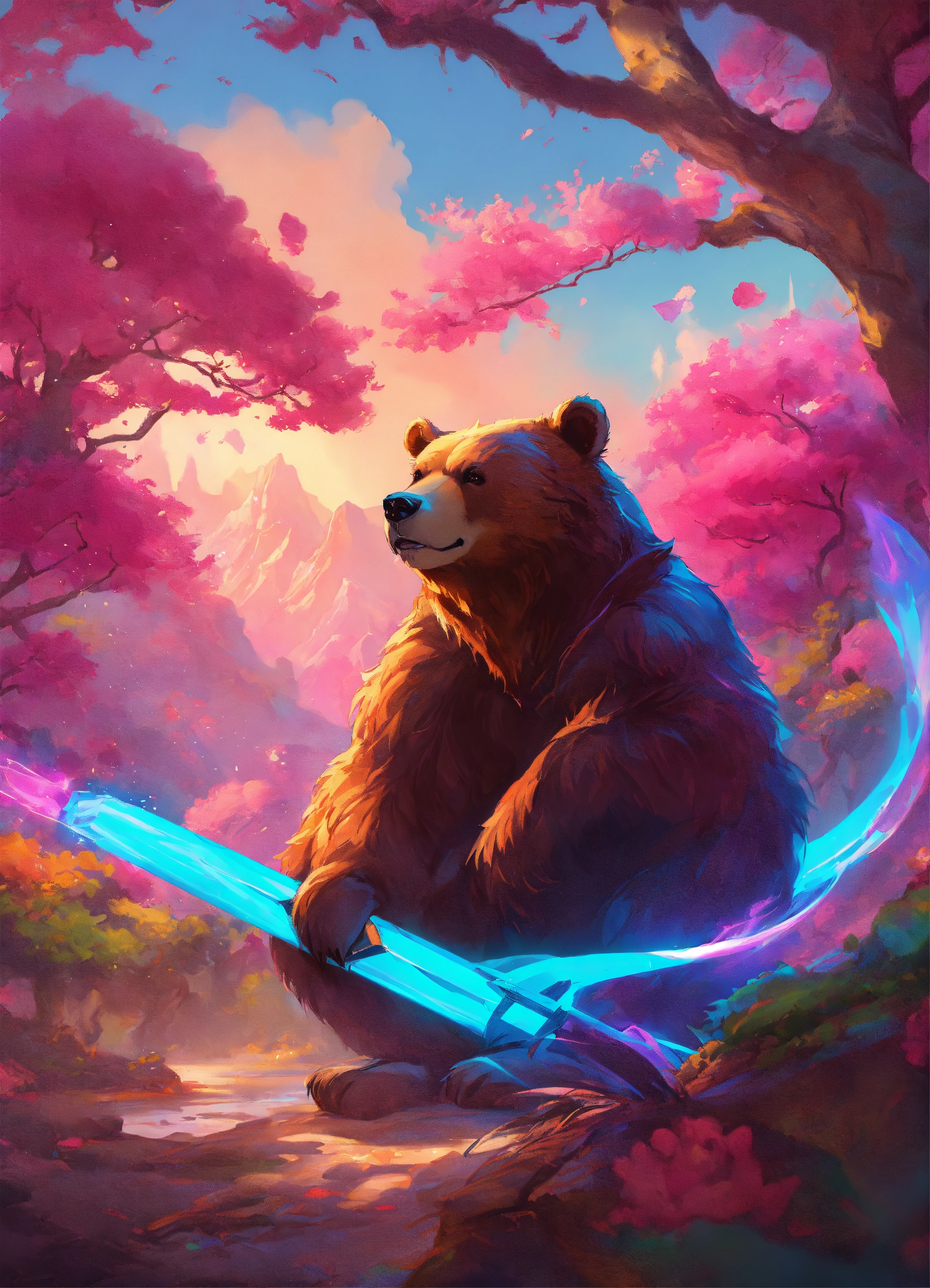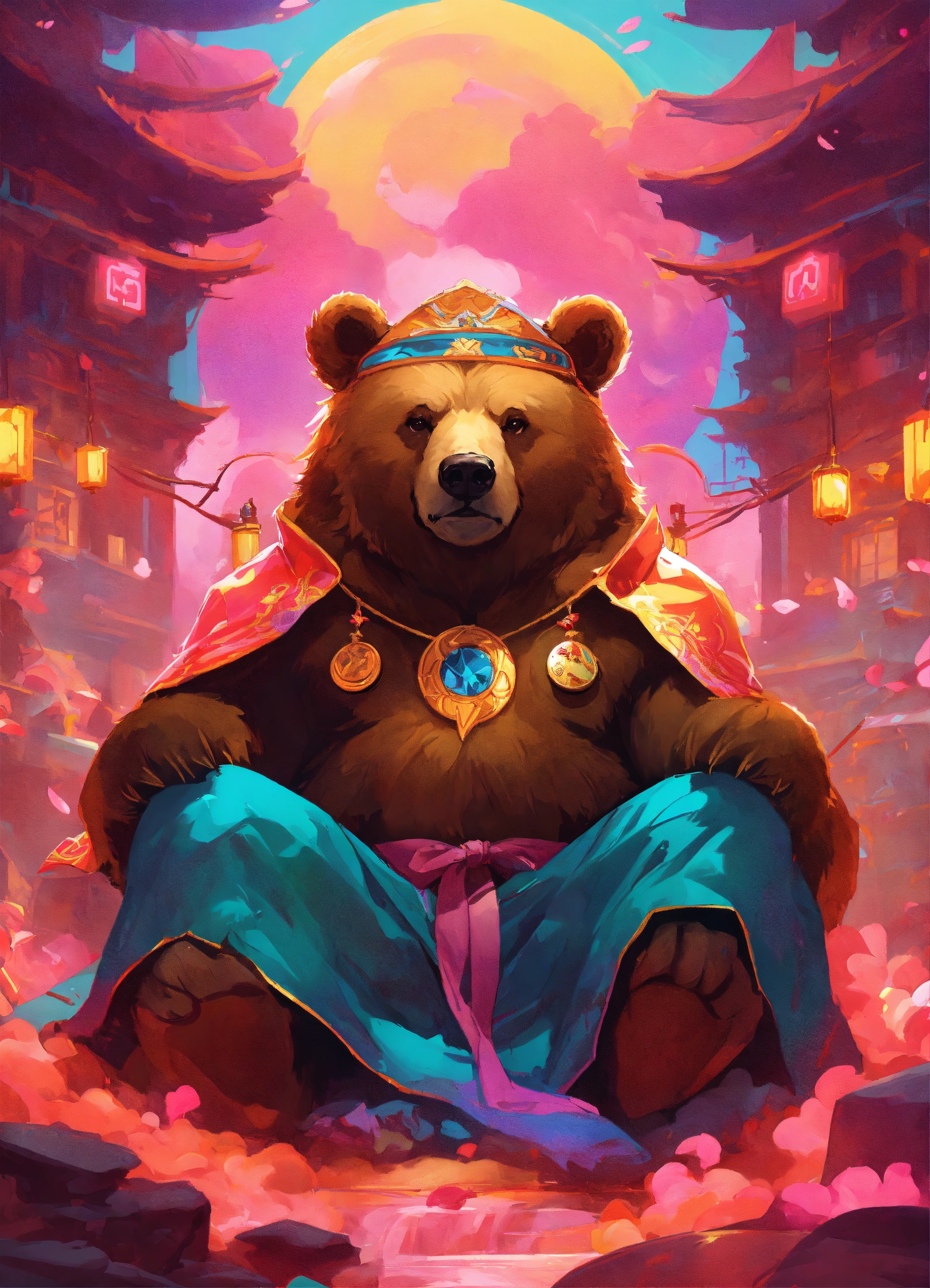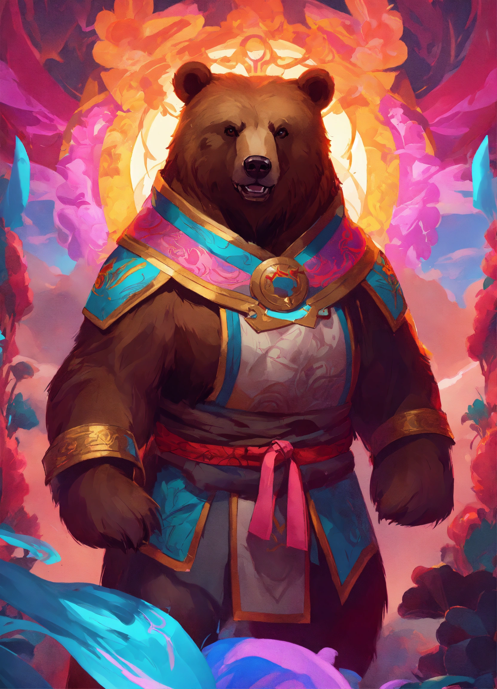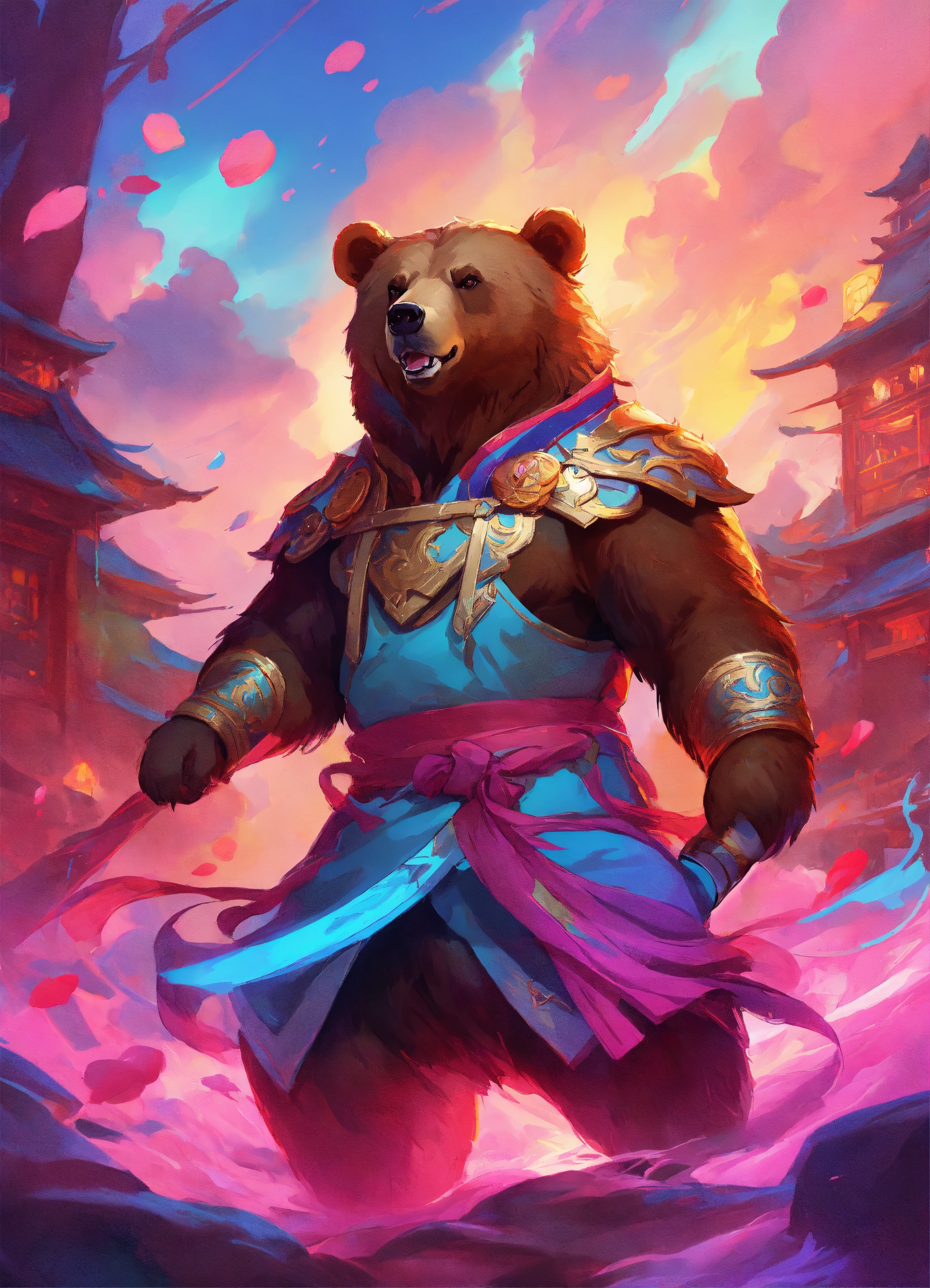 Bear, league of legends, three kingdom chinese clothing, rage, dark brown bear, vaporwave aesthetic, colorful, psychedelic, digital painting, artstation, concept art, smooth, sharp focus, illustration, art by artgerm and greg rutkowski and alphonse mucha, wide shot, nikon 14 mm