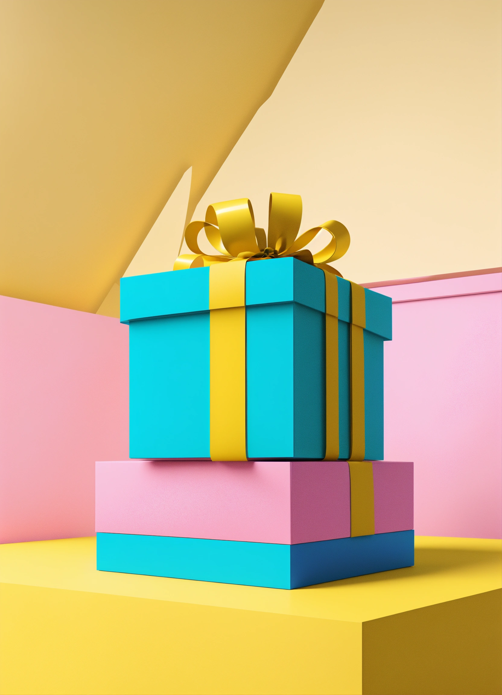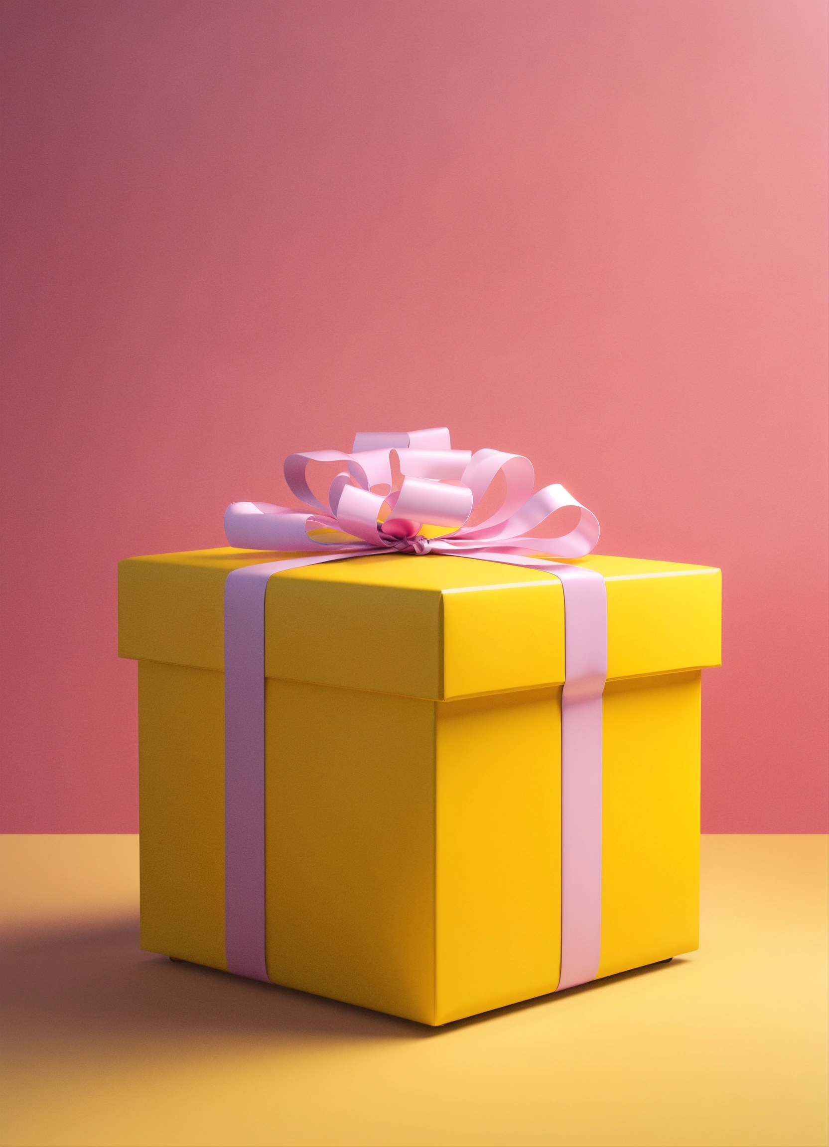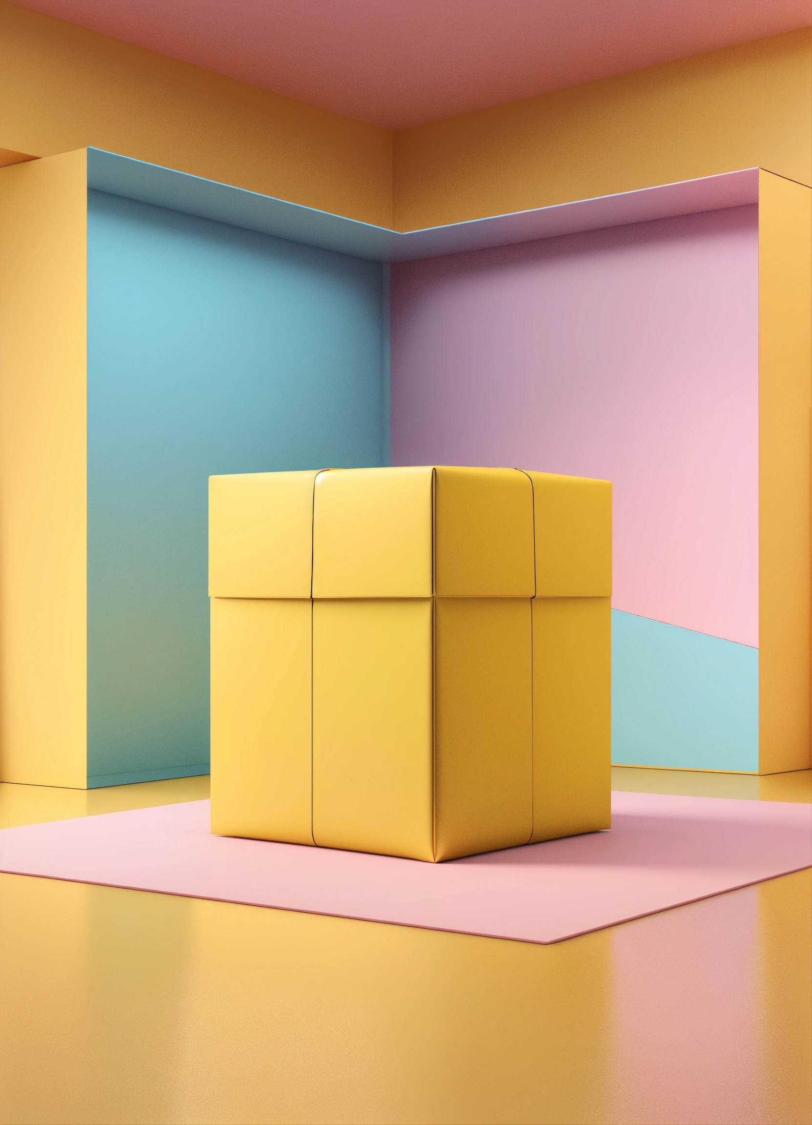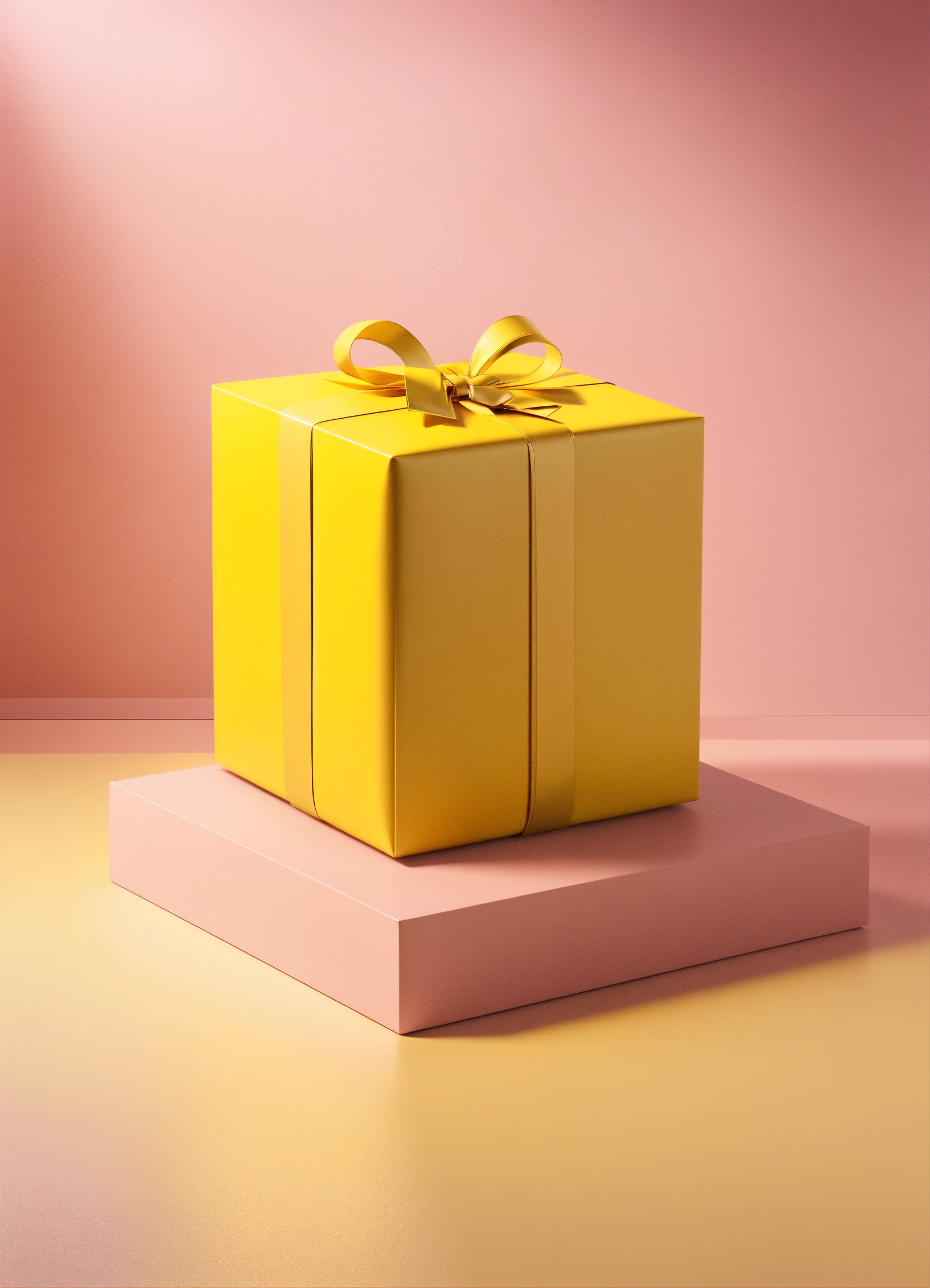 Ultra hd! realistic, pastel, dreamy, realistic, futuristic, sharp focus, octane render! digital art, photorealistic, soft, minimal, emptyness, background, giant yellow present box