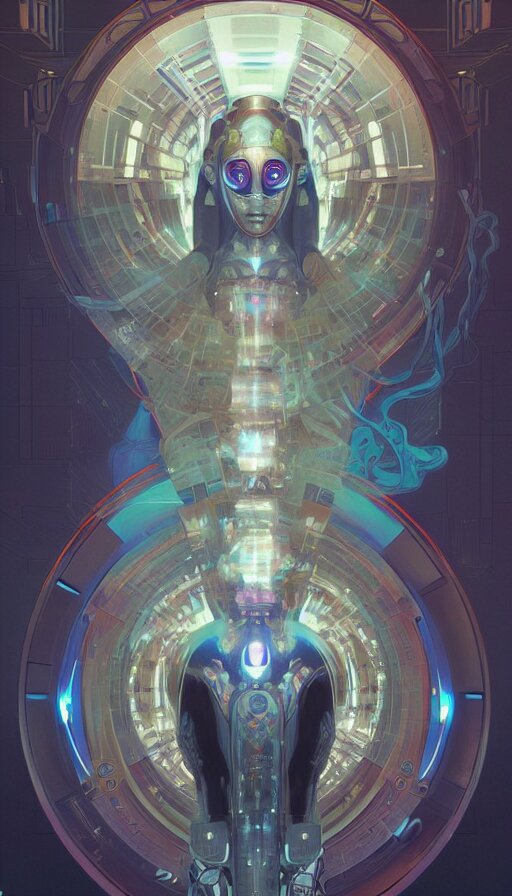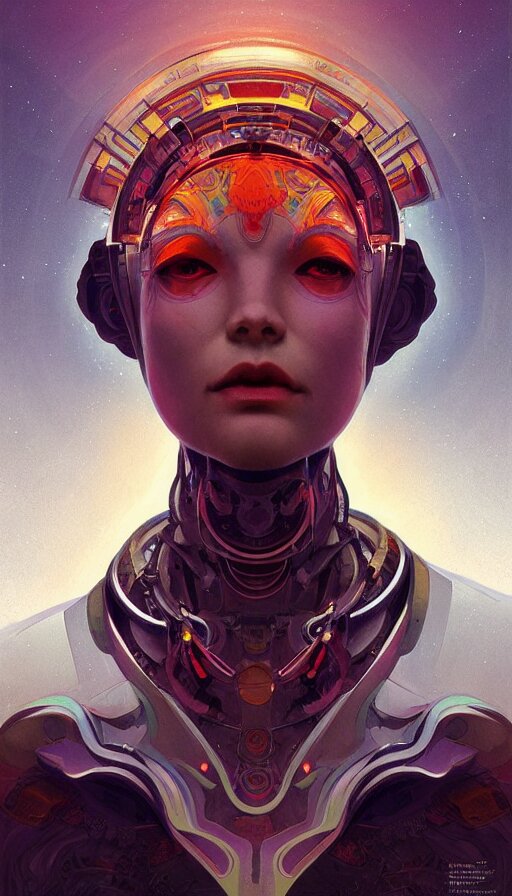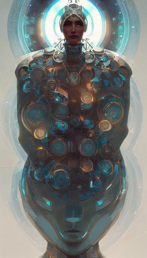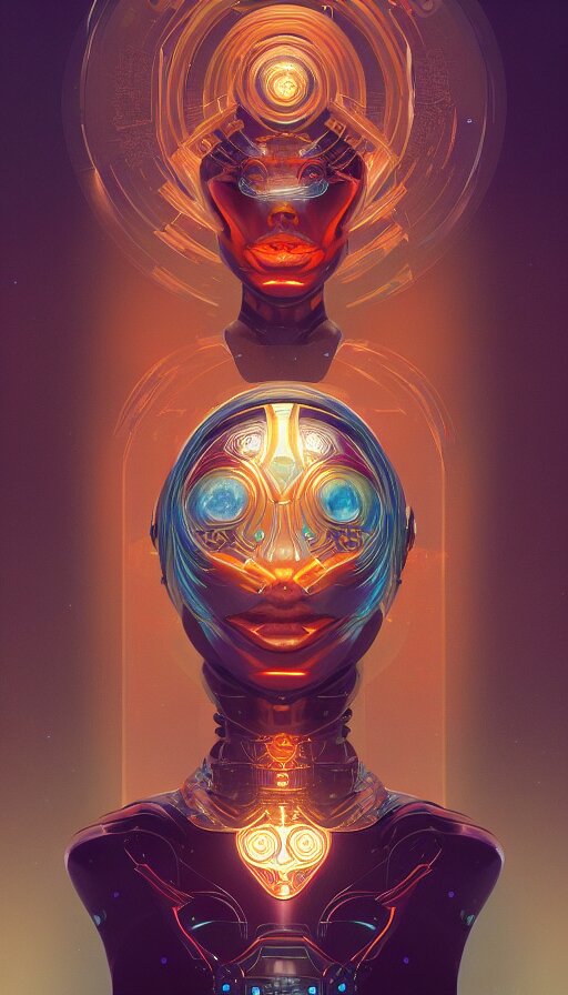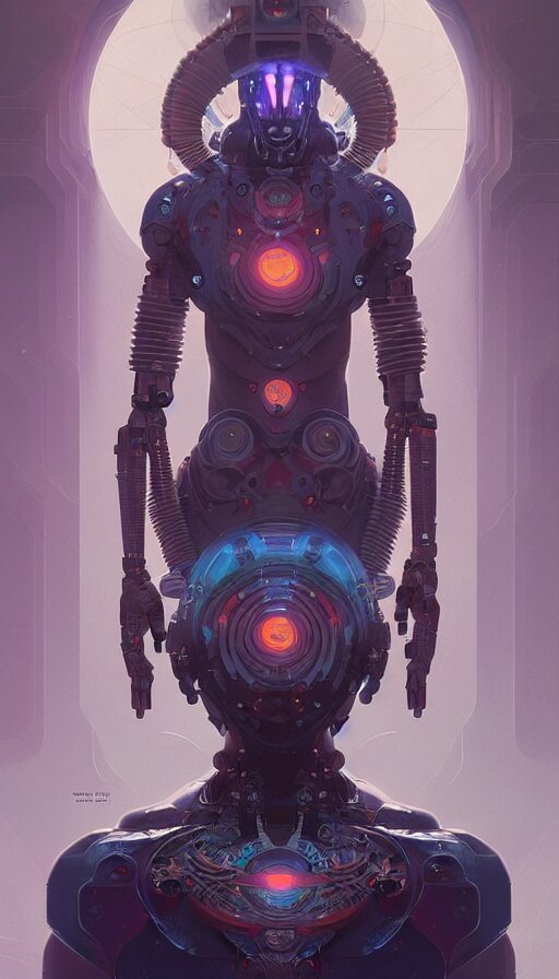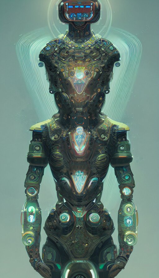 Character design of a scifi psychedelic robot shaman, symmetrical, center punched, archviz, elegant, intricate, digital painting, artstation, concept art, smooth, sharp focus, illustration, art by artgerm and greg rutkowski and alphonse mucha