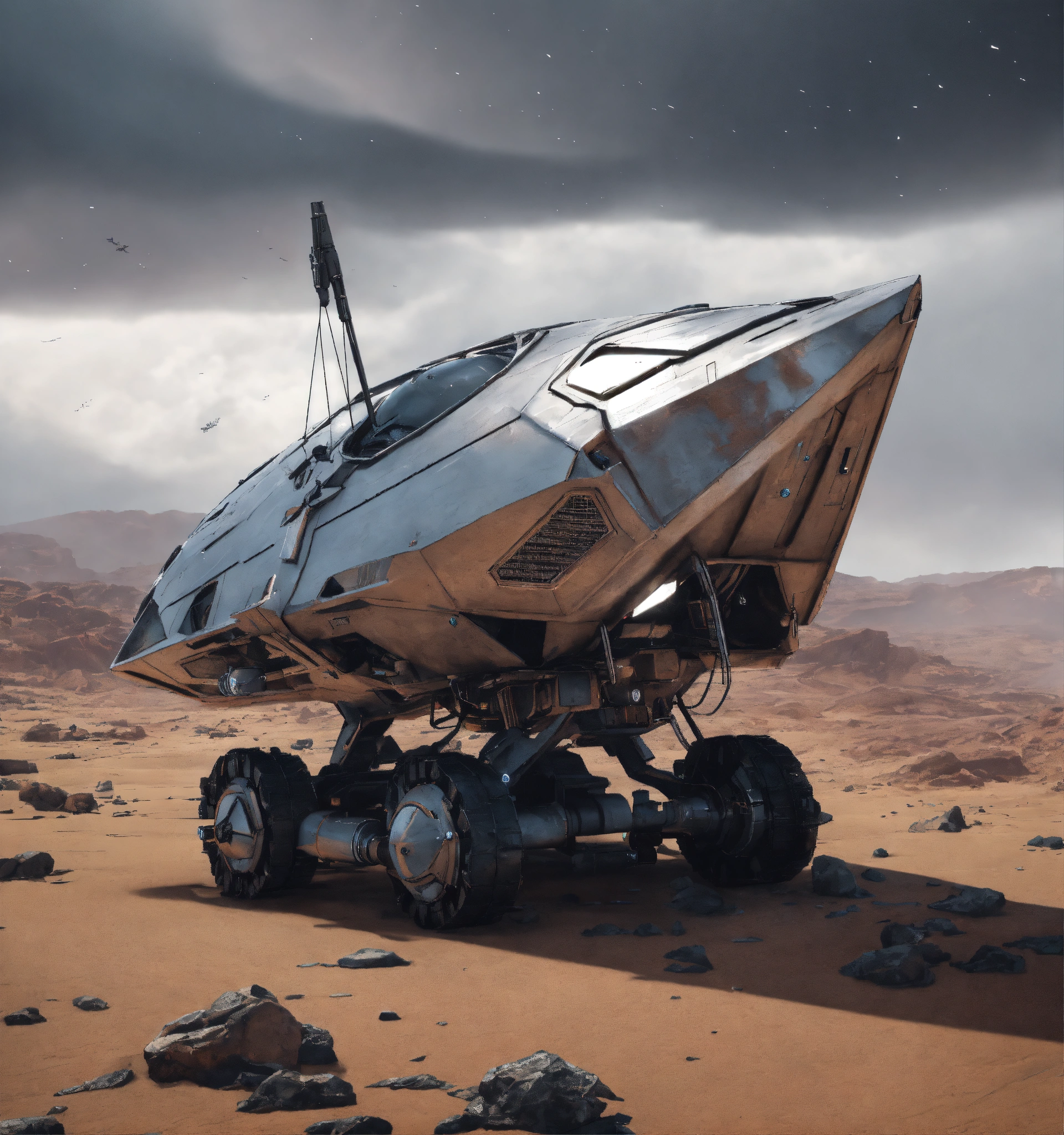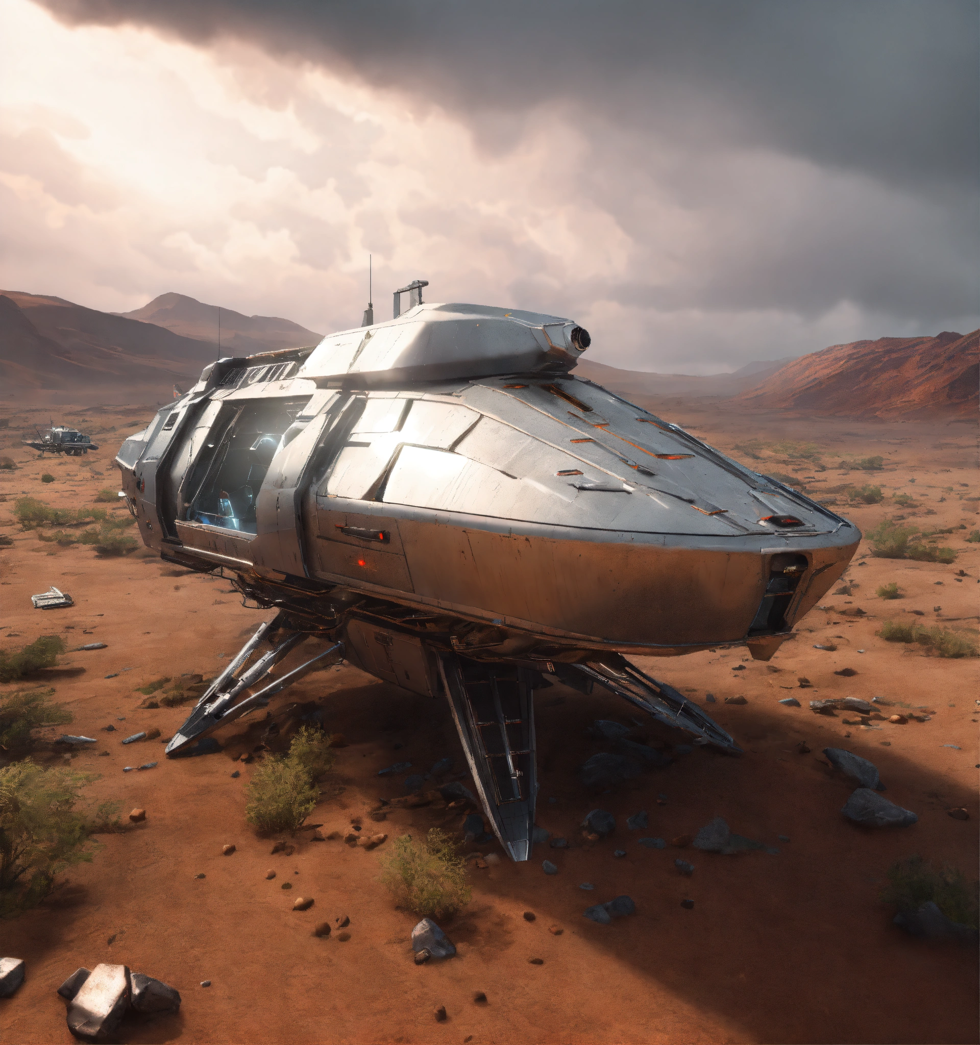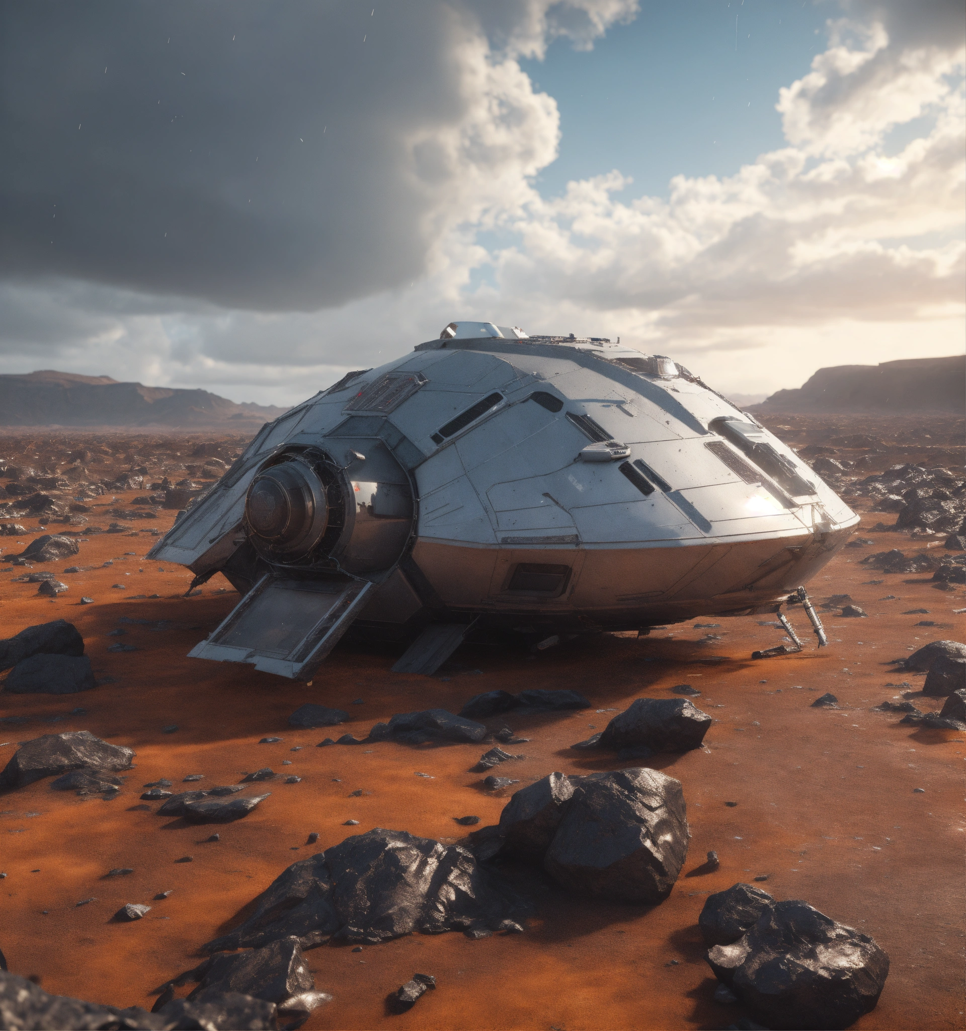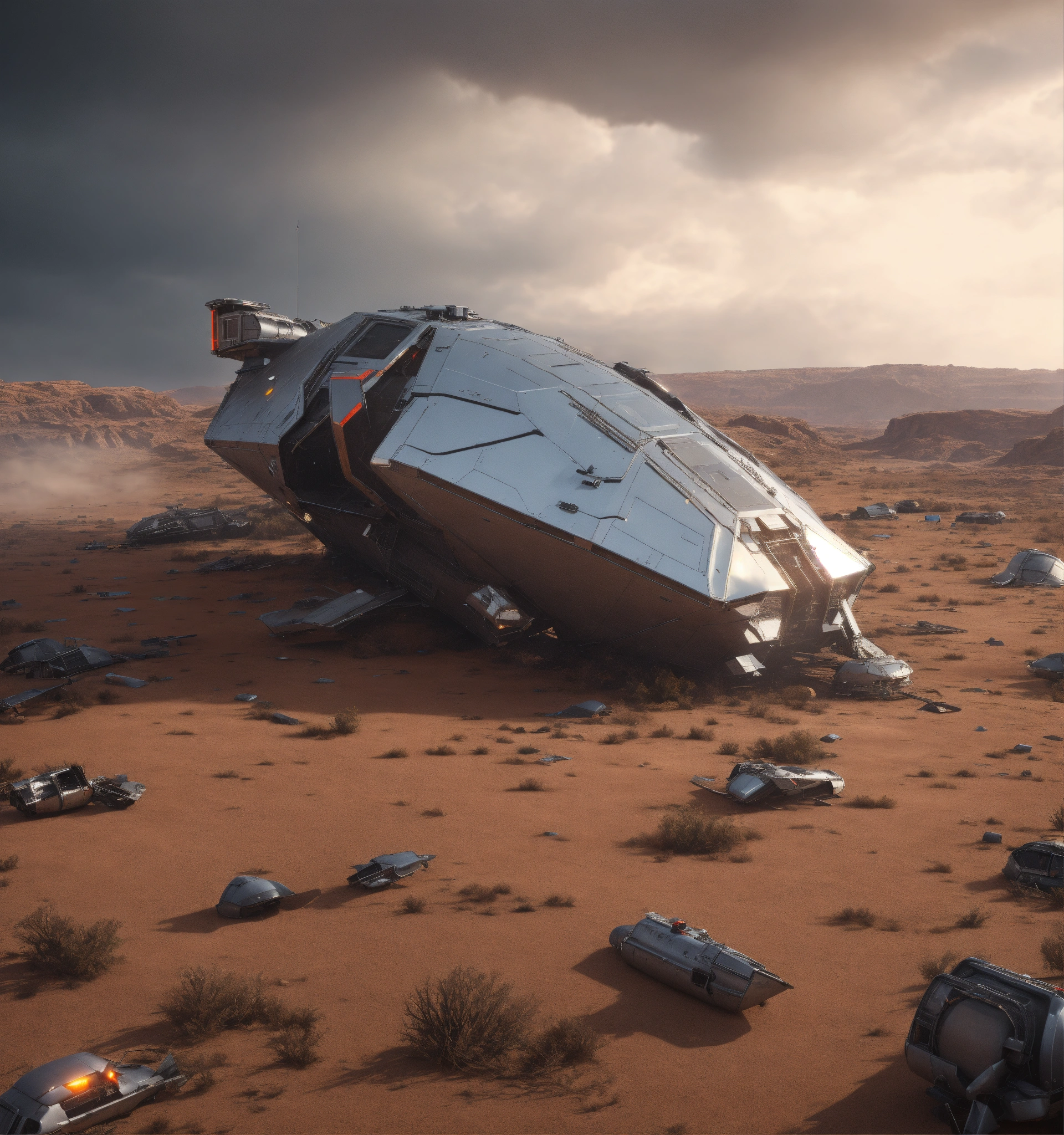 Zoom out on a small silver futuristic evacuation craft crashed in the middle of a wasteland, ominous, stormy, realistic, futuristic, sci-fi, 8k, unreal engine, pixar