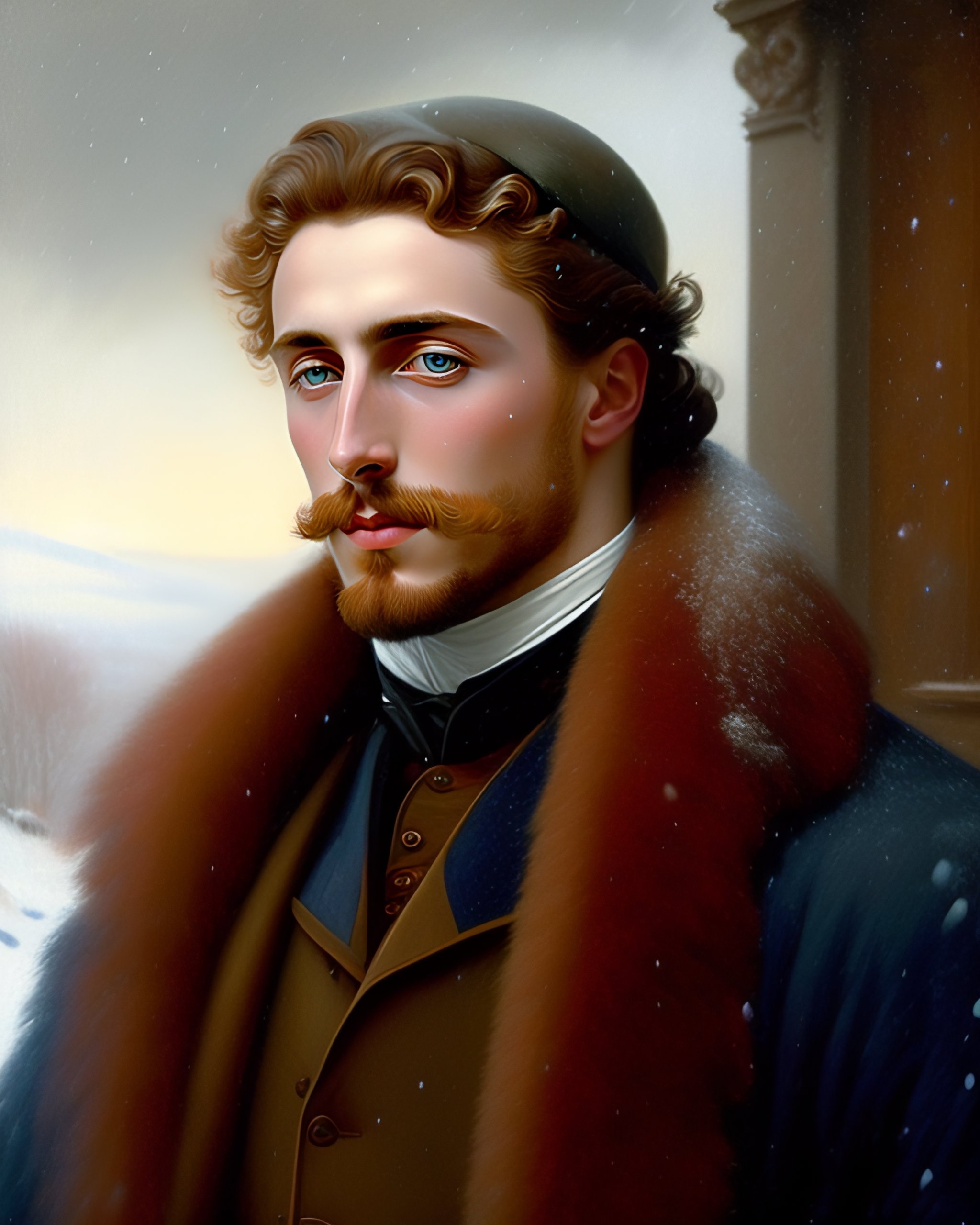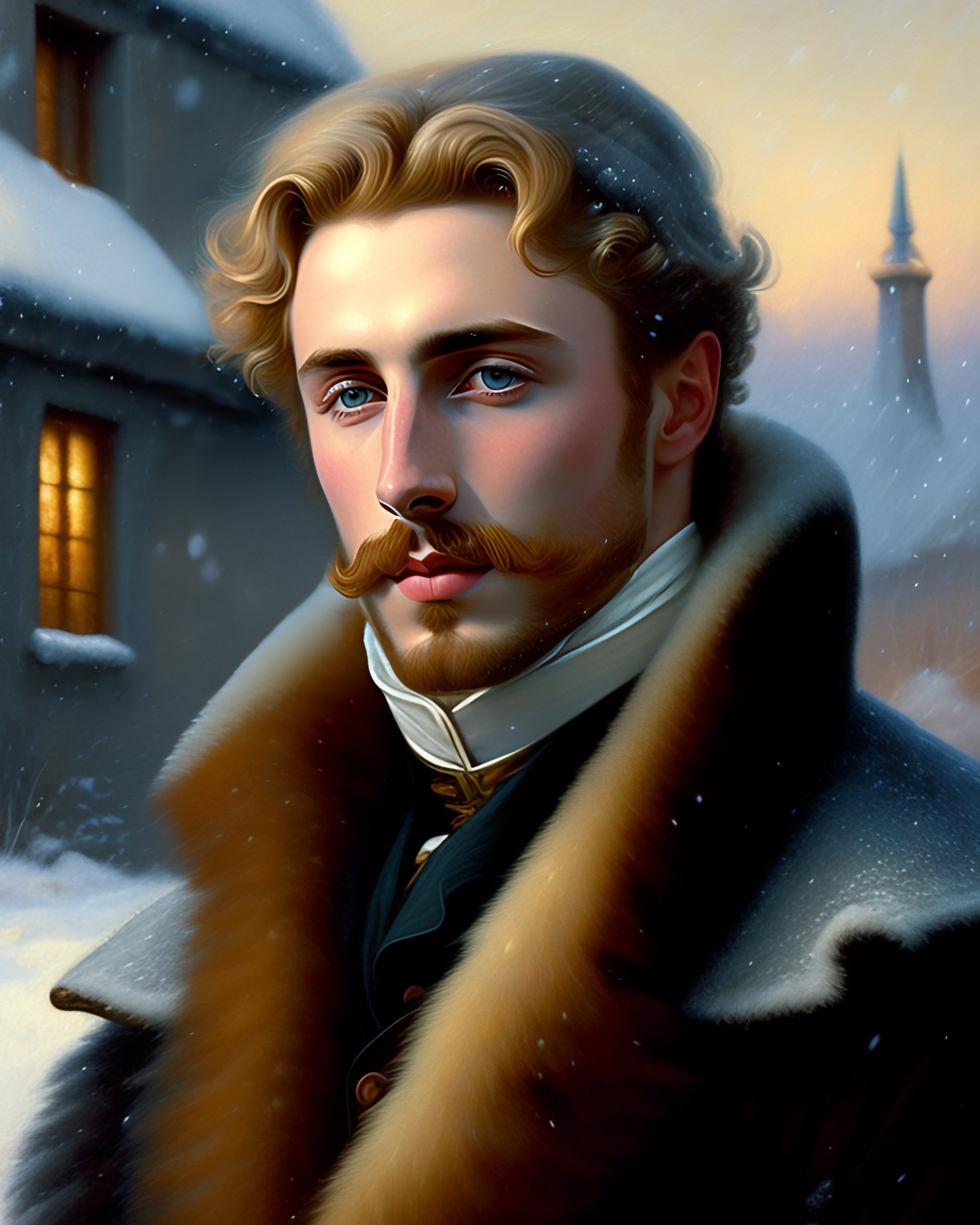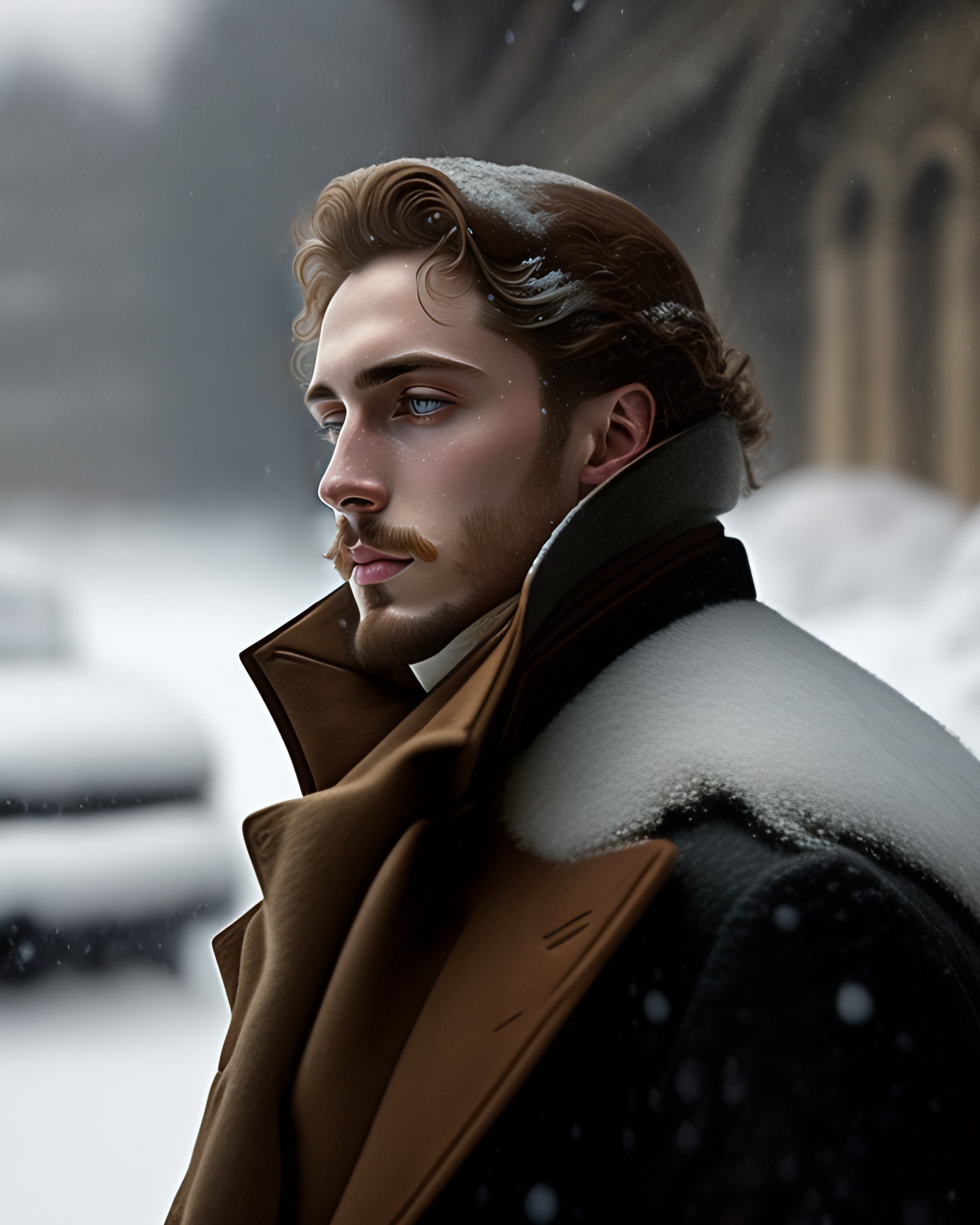 Aaron taylor-johnson blonde as georges duroy under a snowfall. 19th century