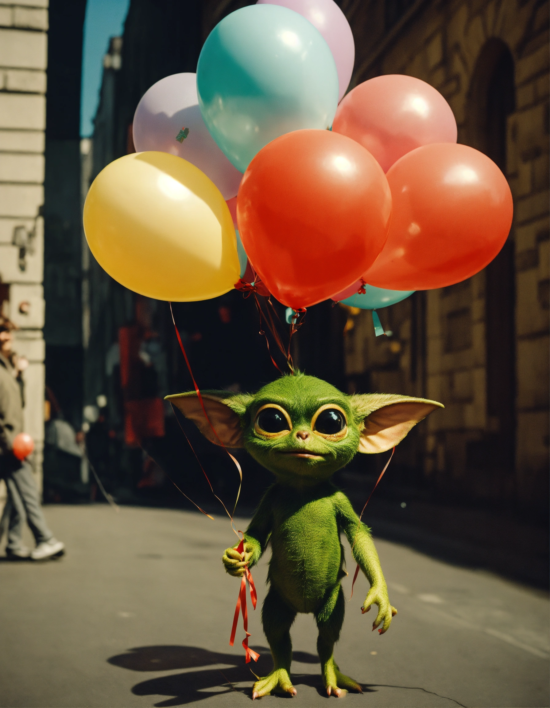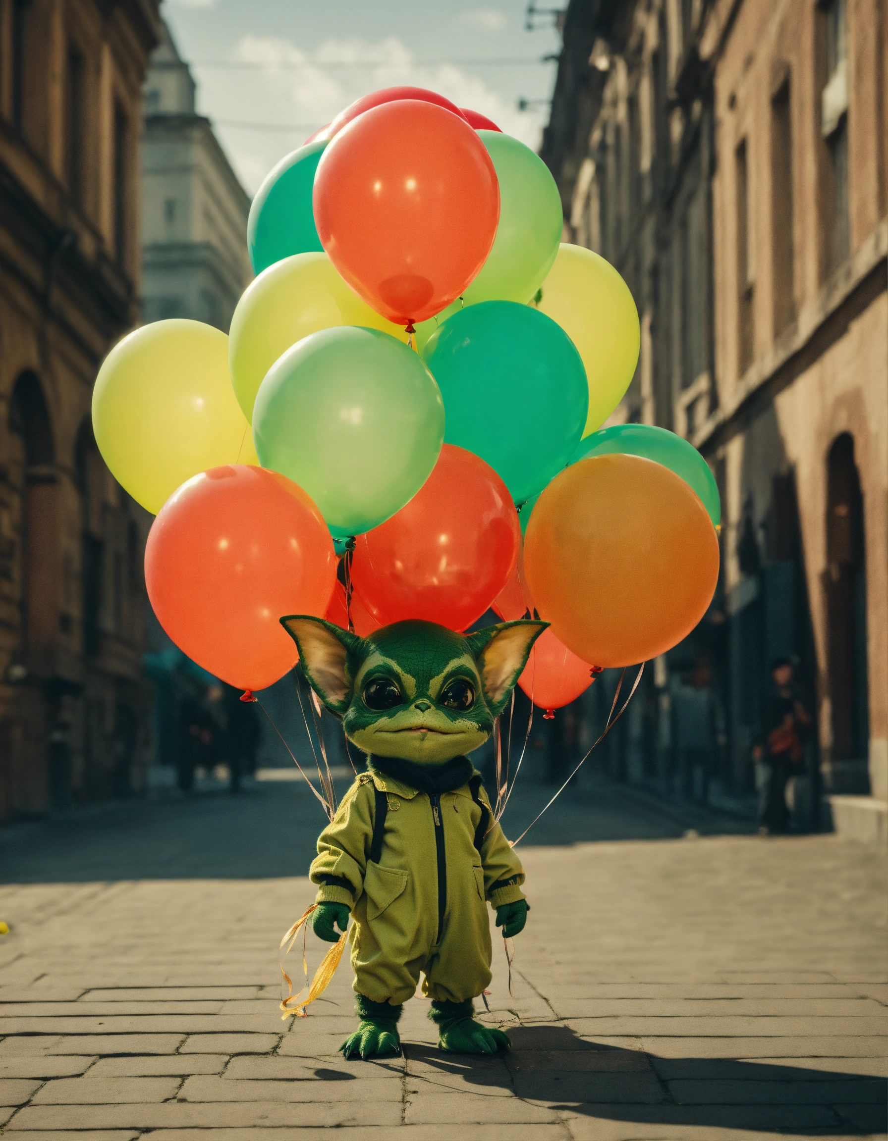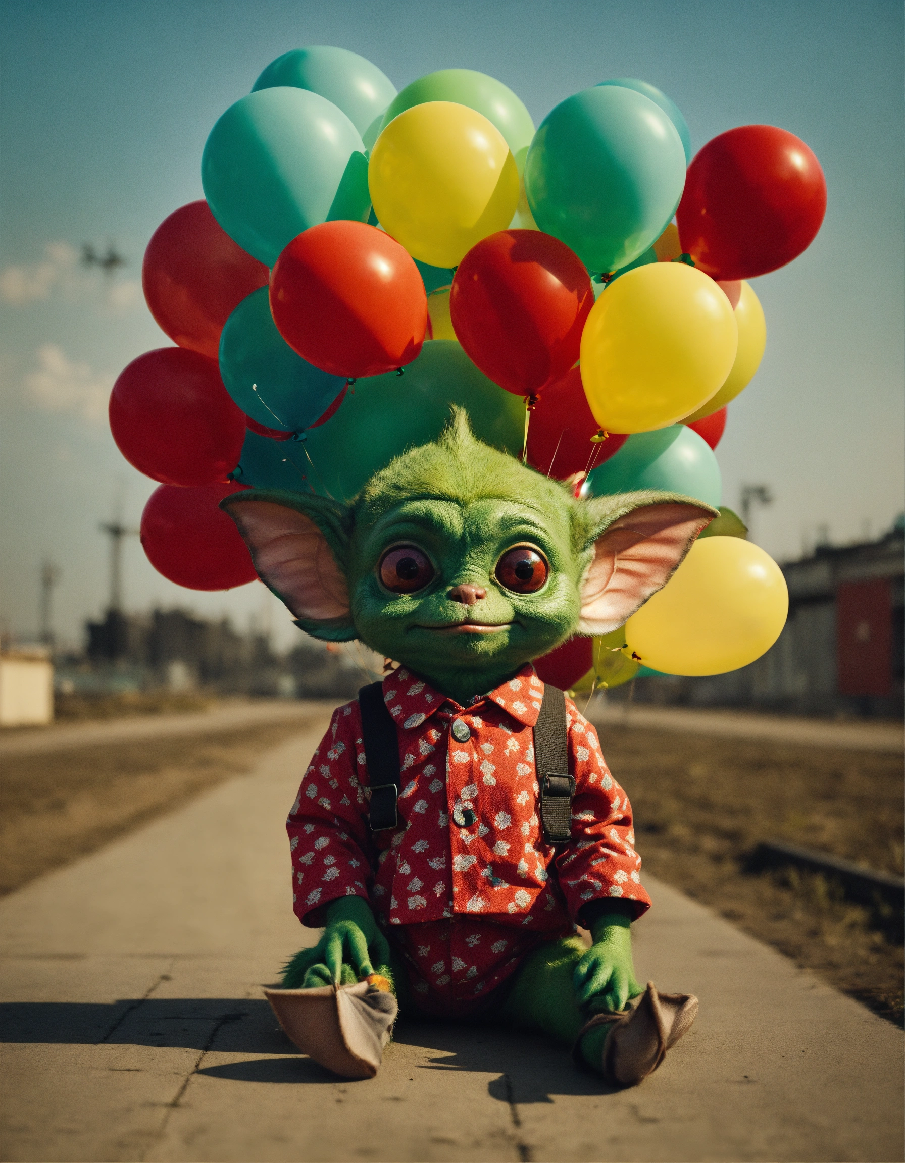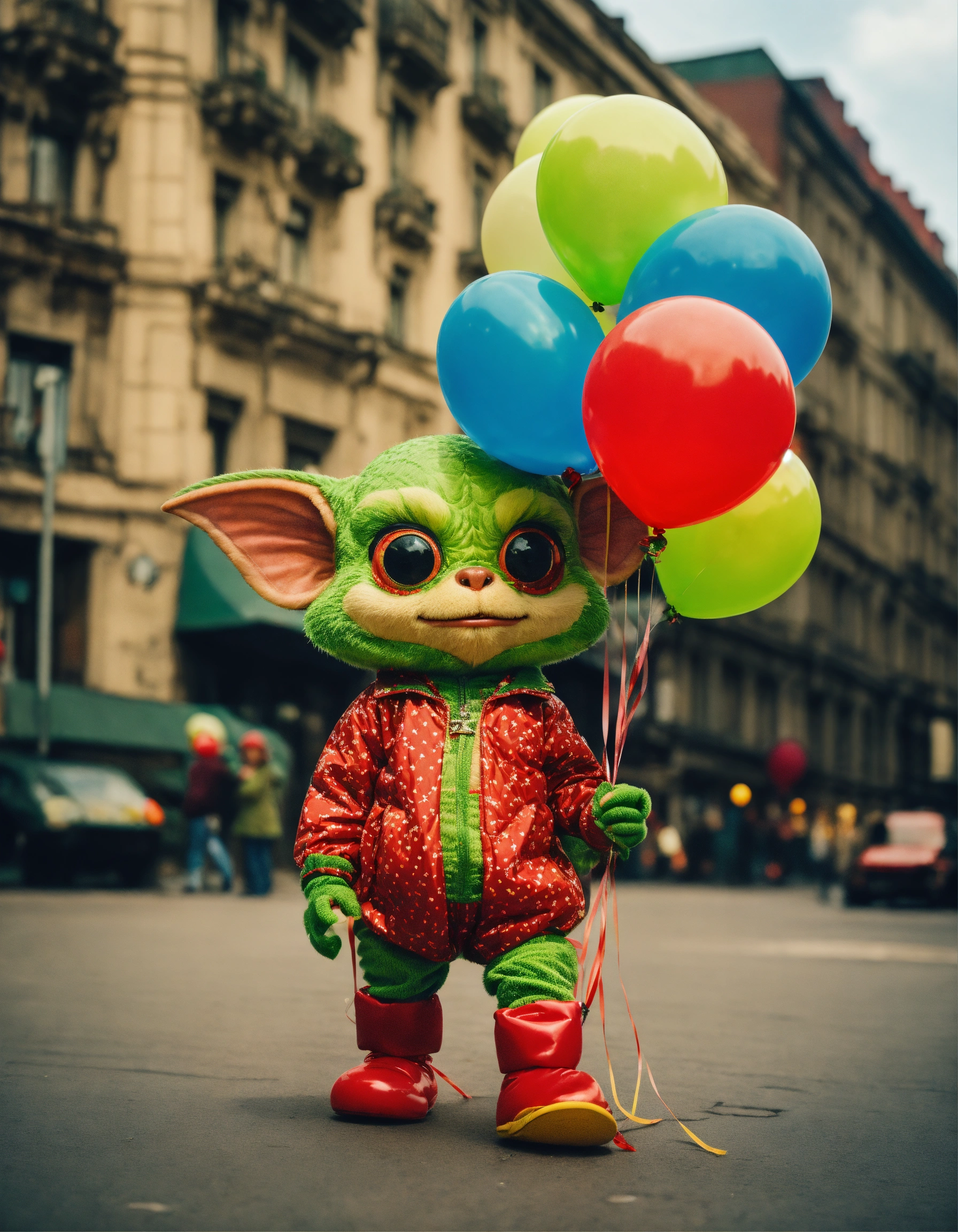 Leica portrait of a gremlin holding balloons, coded patterns, sparse and simple, uhd image, urbancore, sovietwave, period snapshot