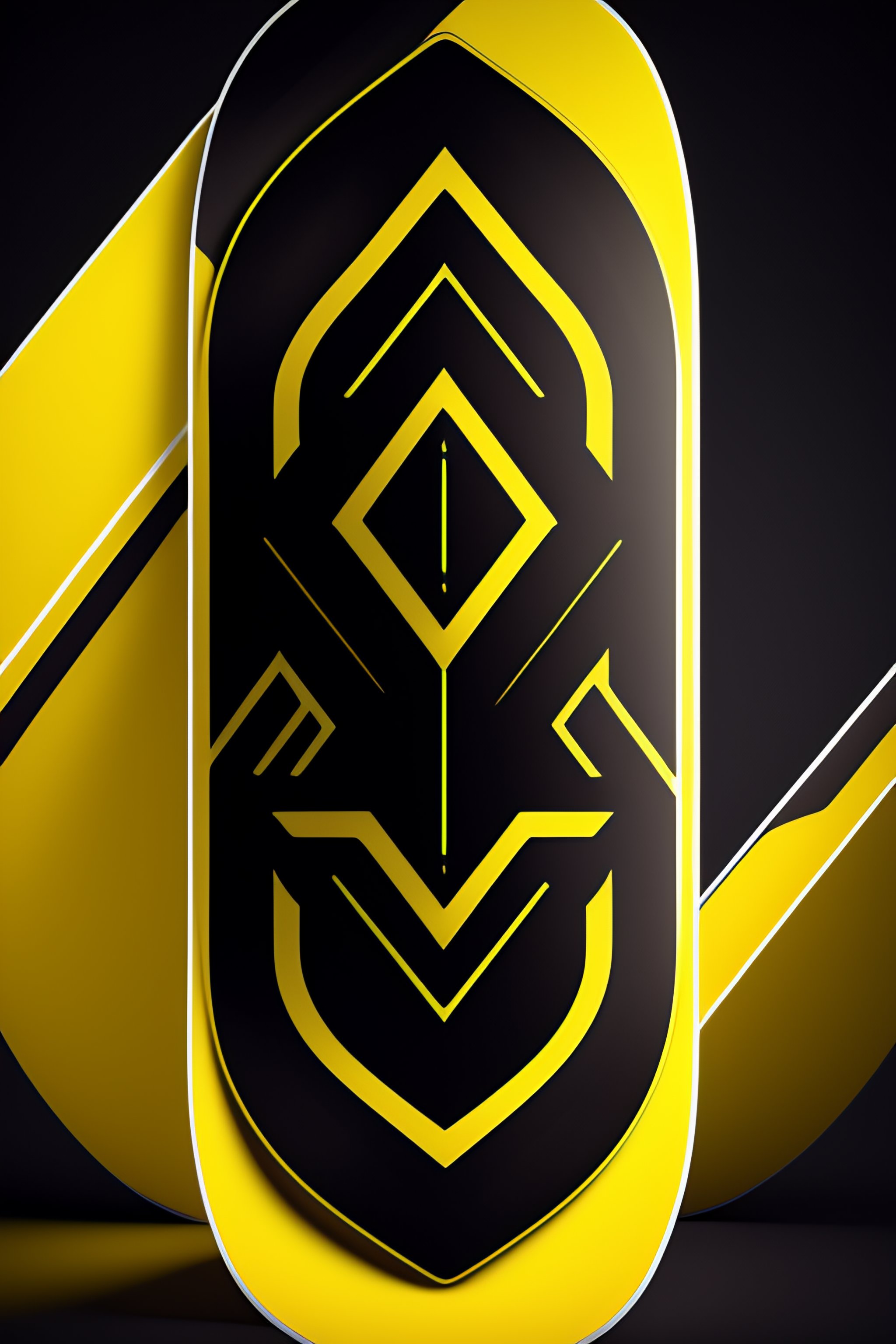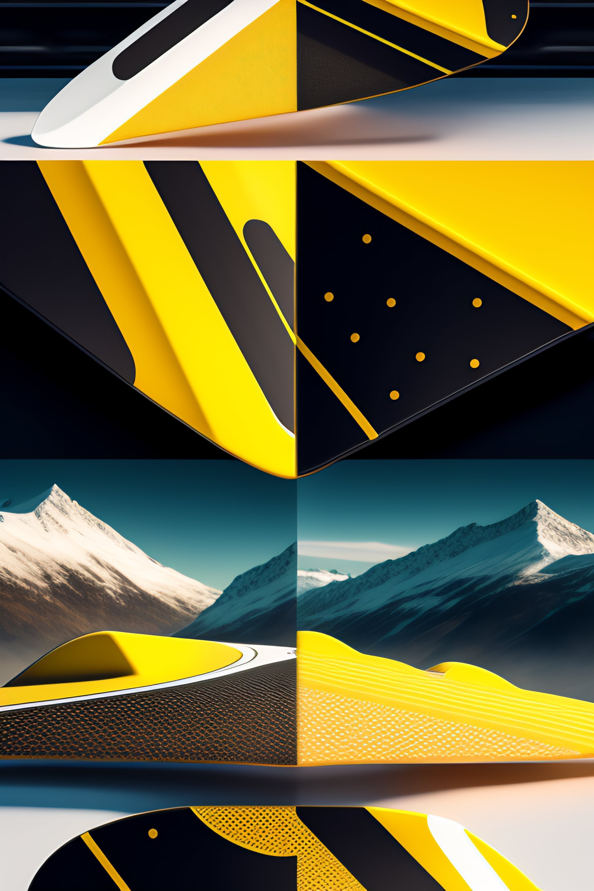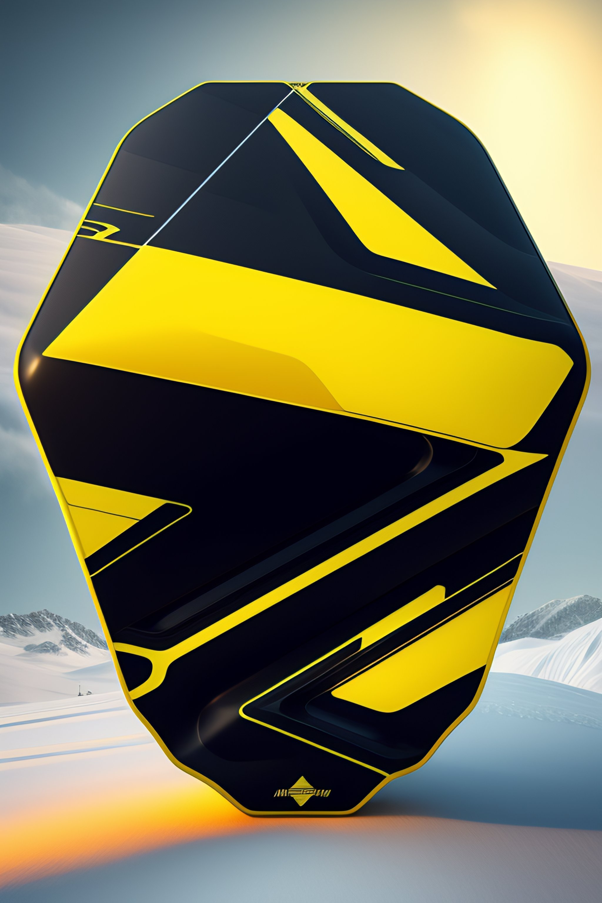 Futuristic snowboard designs featuring touches from 1980s product and graphic design, shaped like a long snowboard, hard edges, complex and vibrant, highly detailed, yellow and black hexagon pattern on the board itself, long oval board like a alpine board, unreal engine 5
