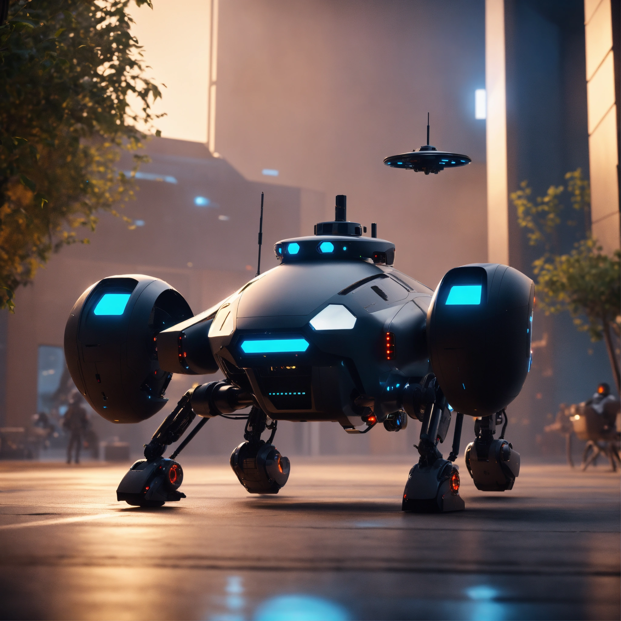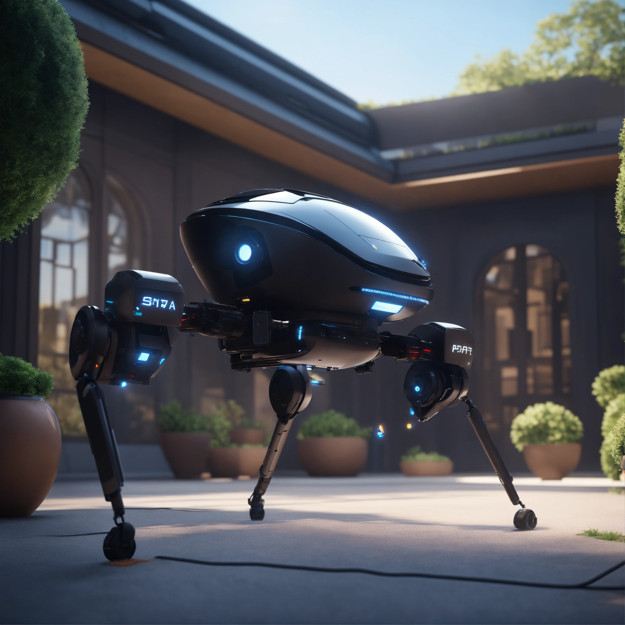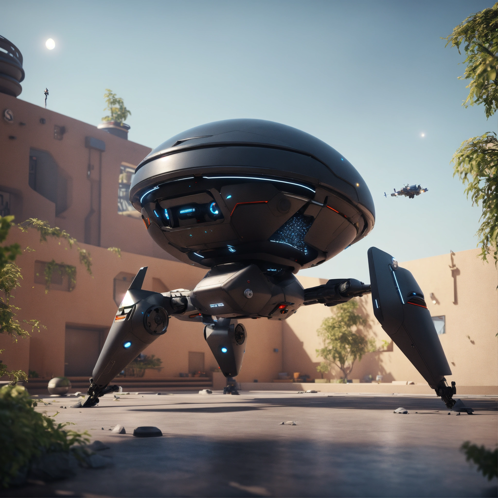 A black small flying robotic patrol bot ready to attack in the courtyard of a space port, realistic, futuristic, sci-fi, 8k, unreal engine, pixar, zaha hadid