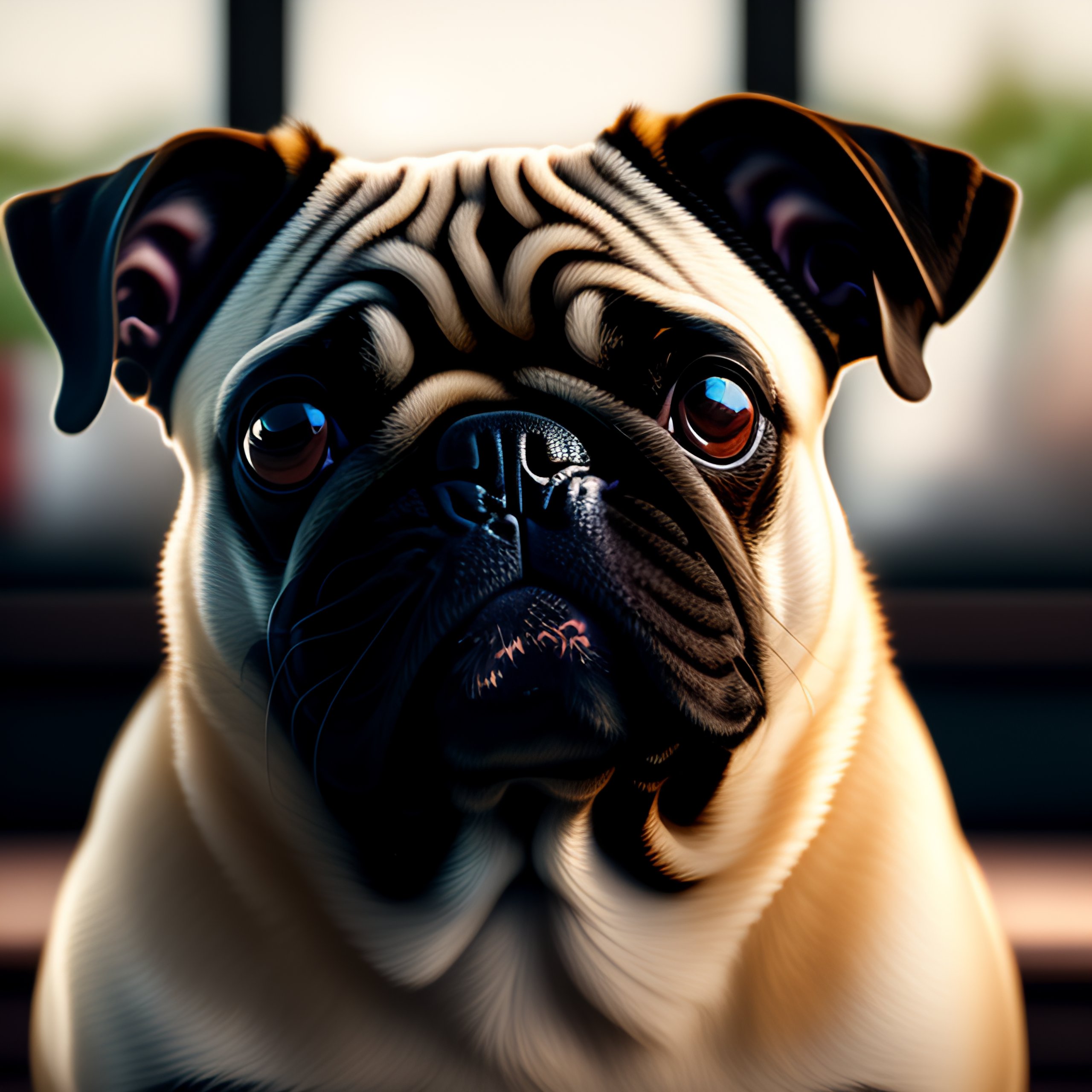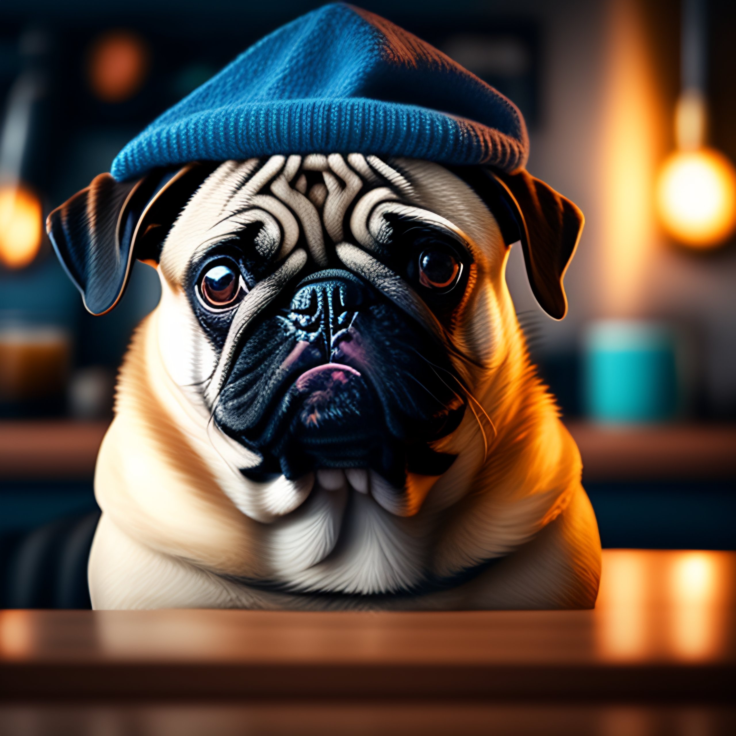 Portrait of a pug in front of a computer, head slightly tilted, in a beanie, natural light, complex, cinematic, sharp focus, highly detailed, digital painting, coffee shop environment, depth of field, ((professionally color graded)), 8k