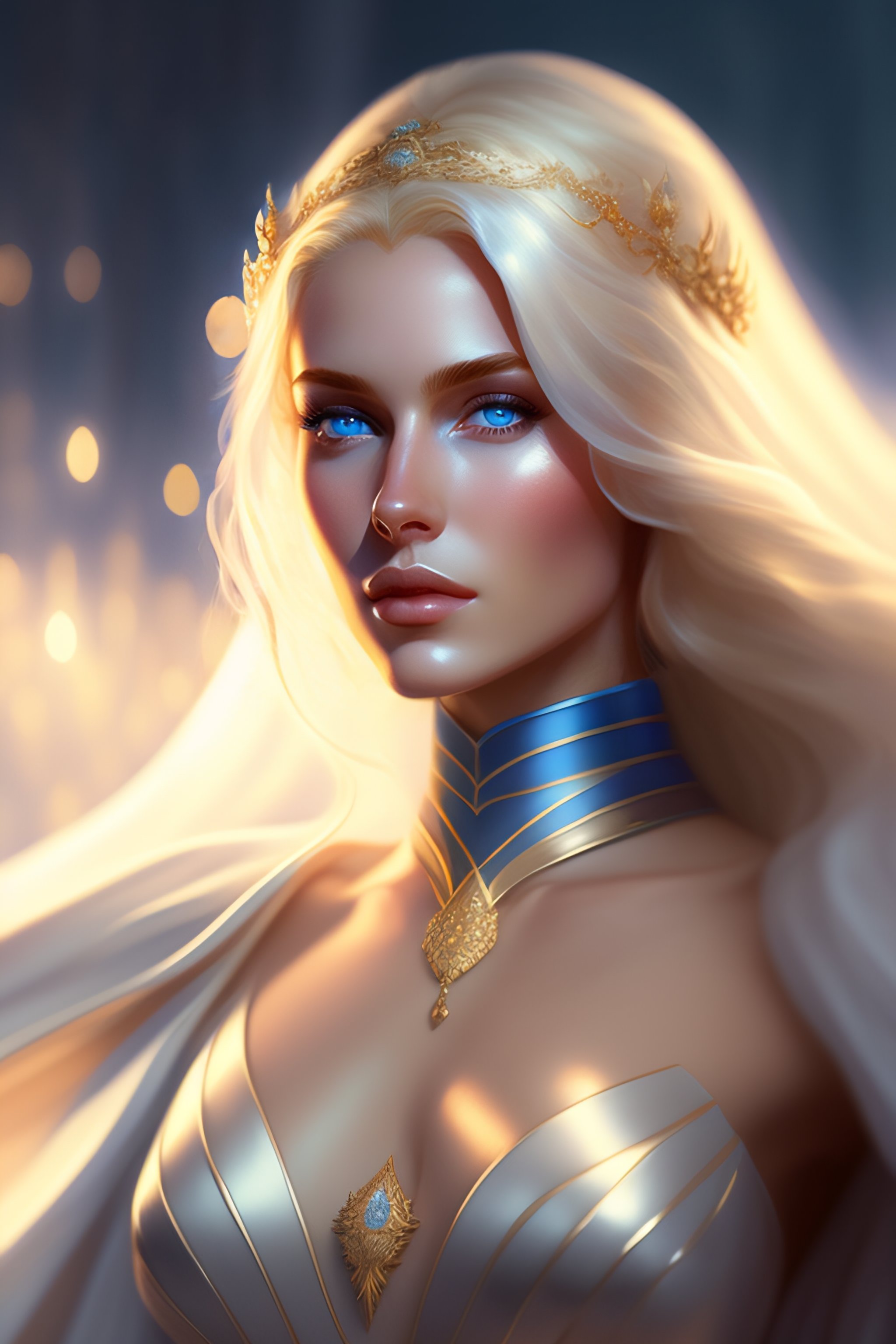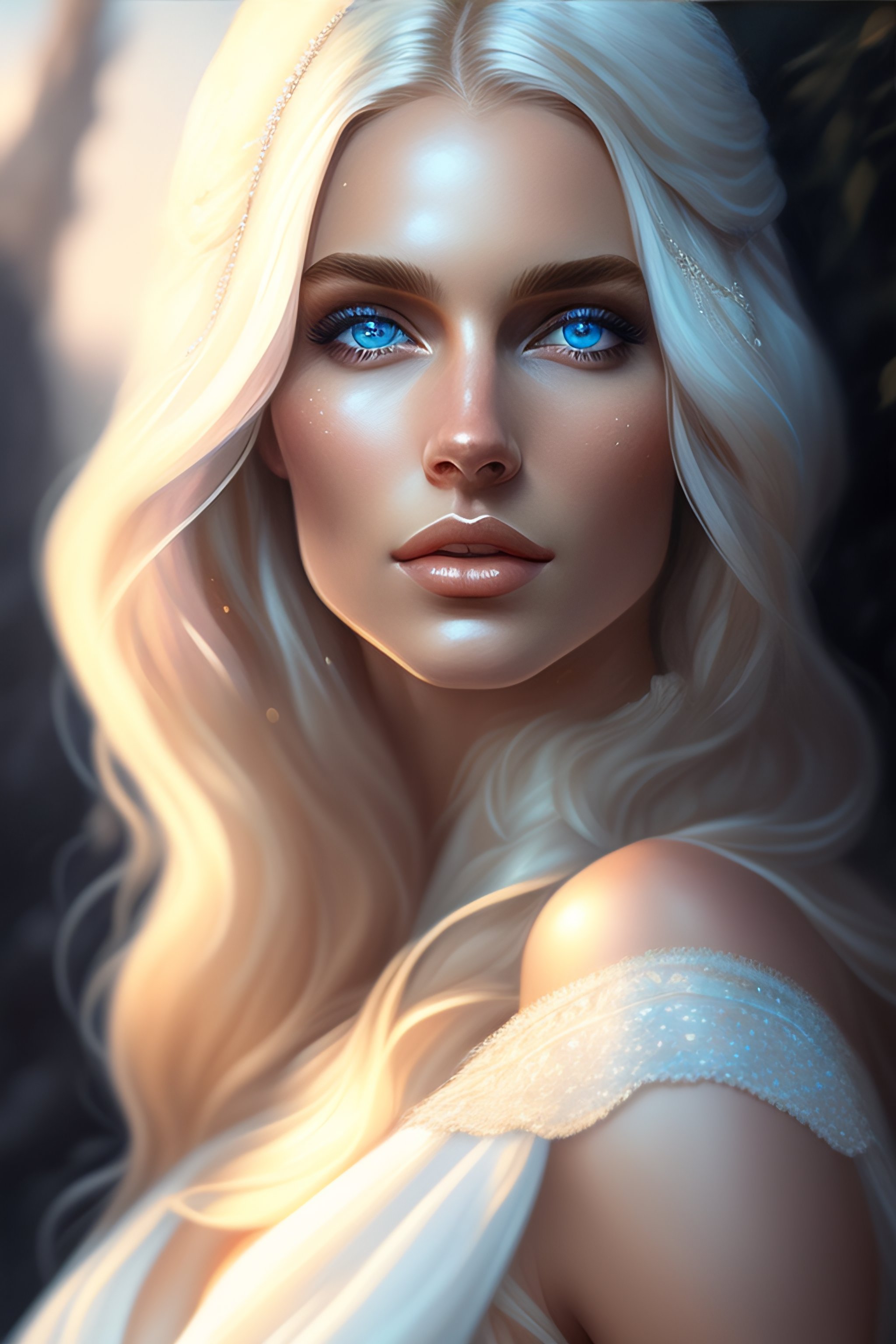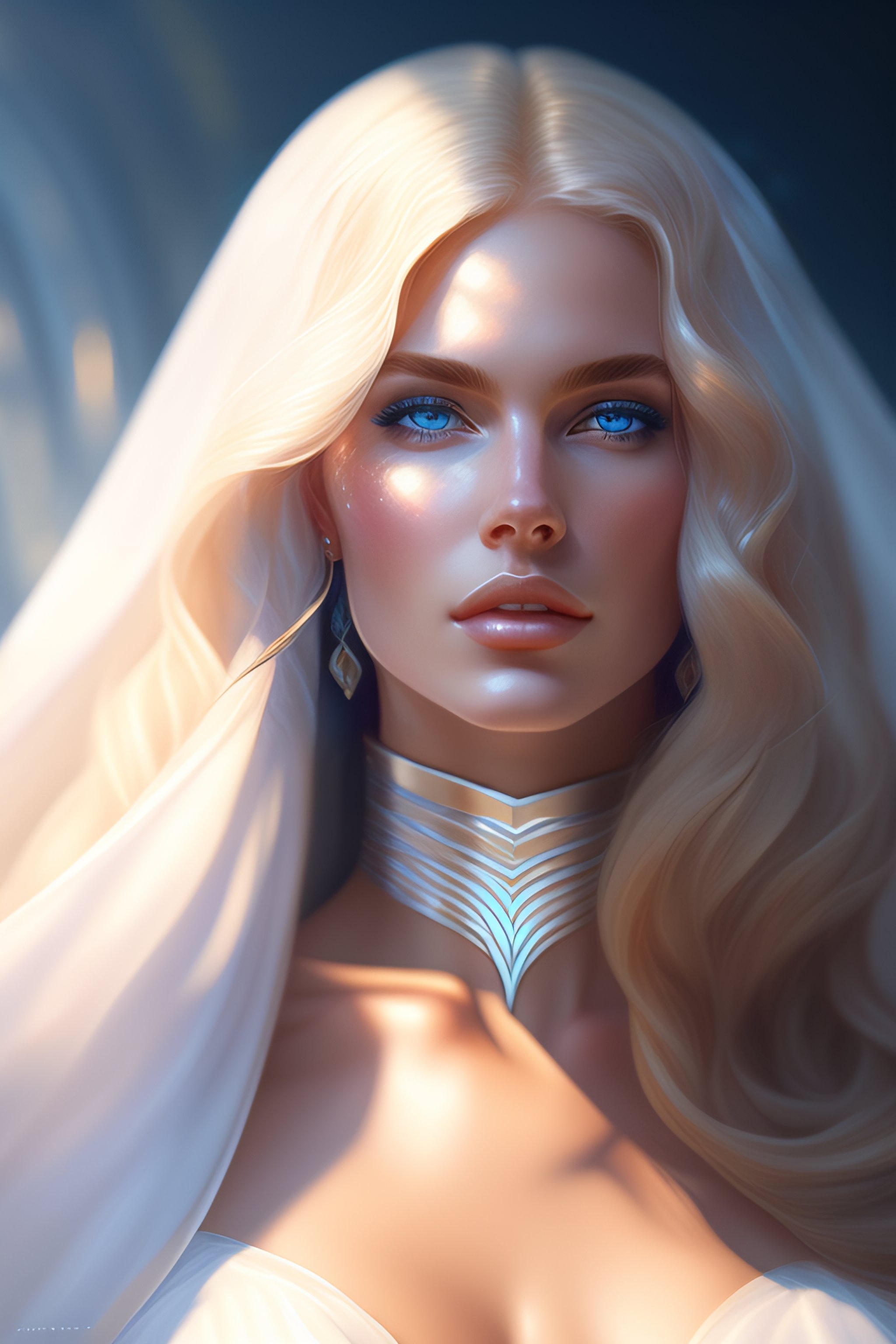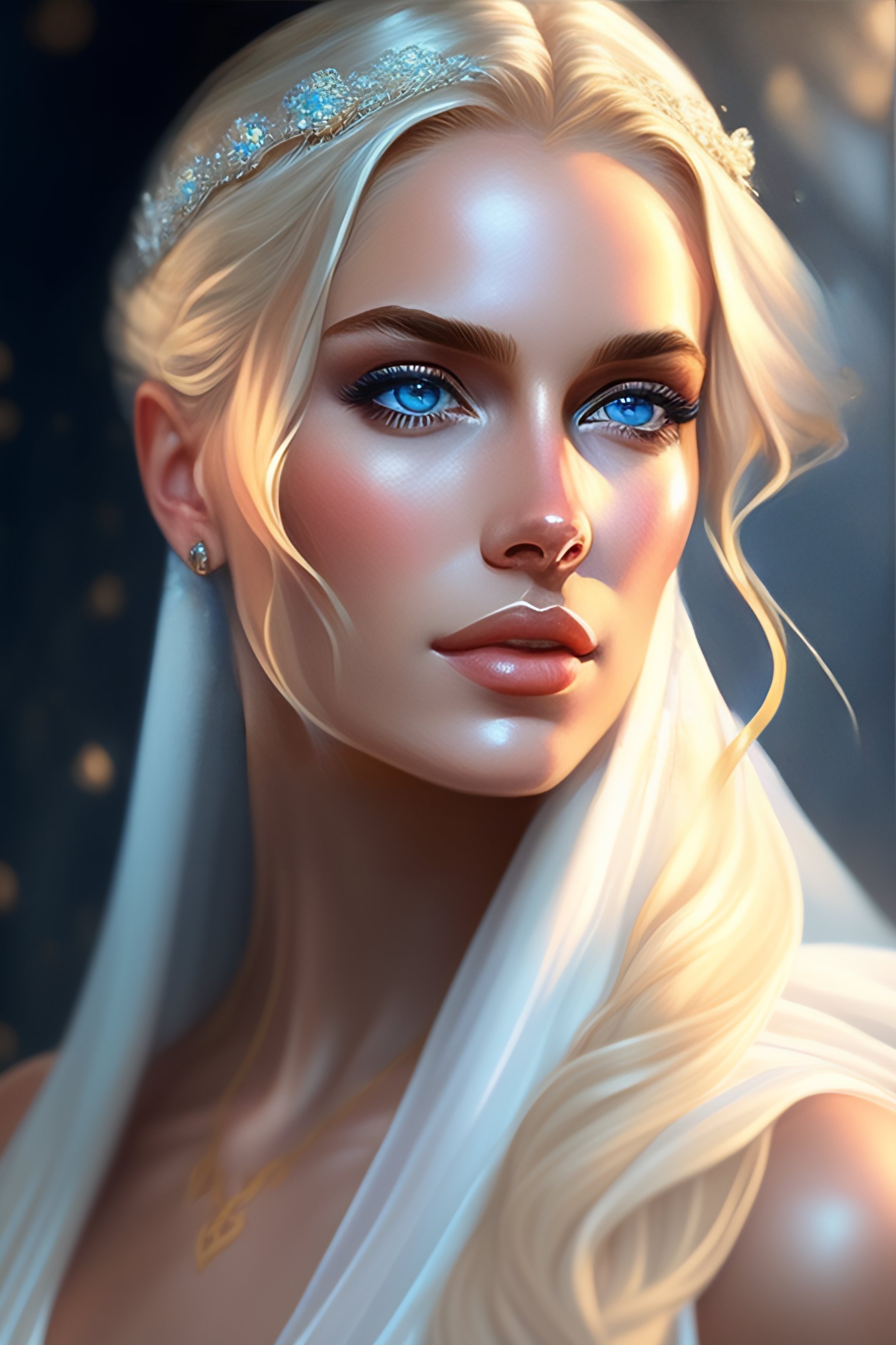 A photorealistic dramatic hyperrealistic, crystal blue eyes woman with blonde hair, white veil, elegant, striking, by wlop, artgerm, greg rutkowski, alphonse mucha, beautiful dynamic, shadows, artstation, concept design art, octane render, 8k, painting, watercolor