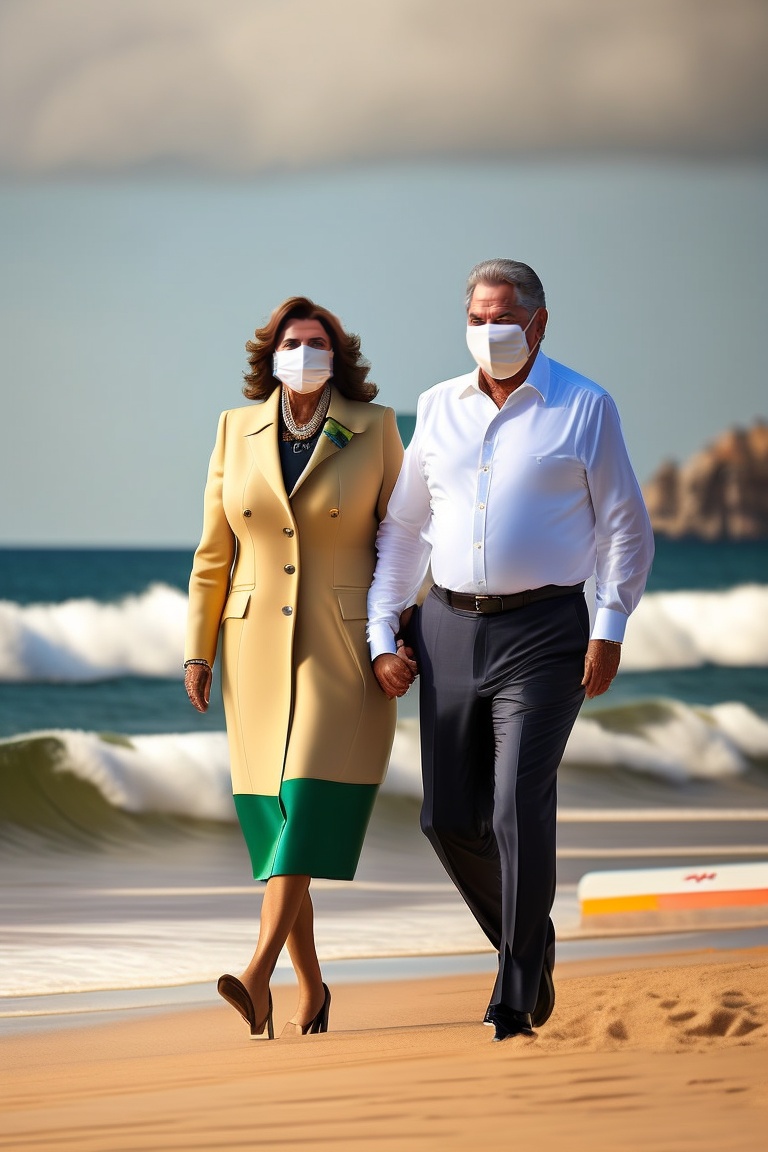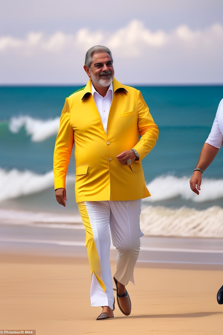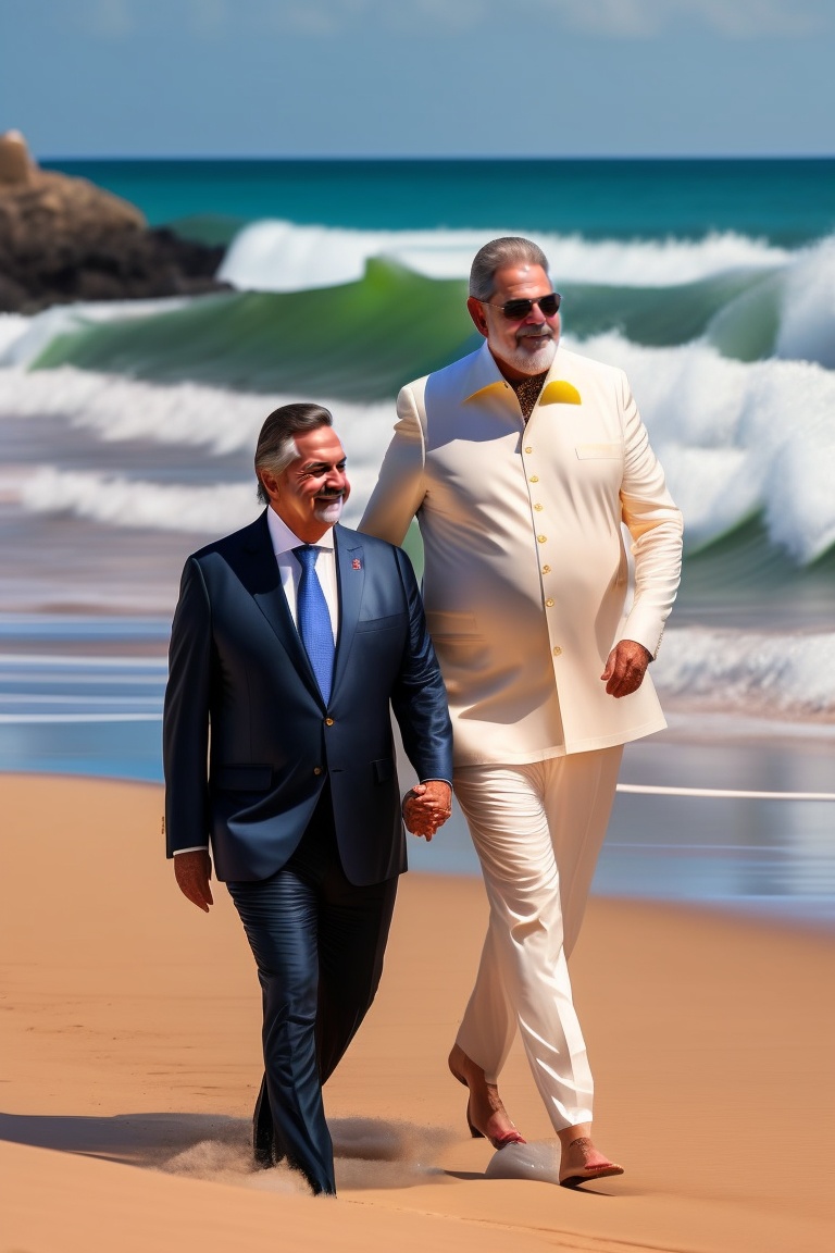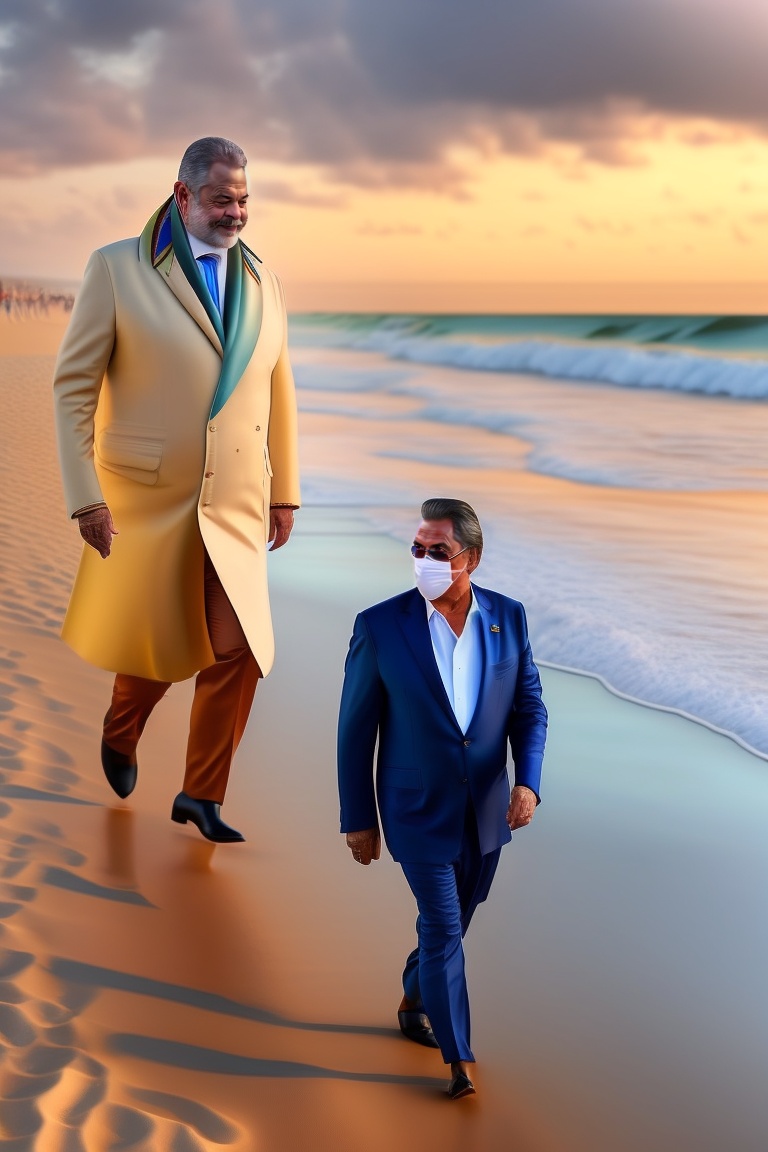 Brazil president luiz inacio lula da silva hand in hand with former president bolsonaro on a beach on a sunny day, both wearing coats