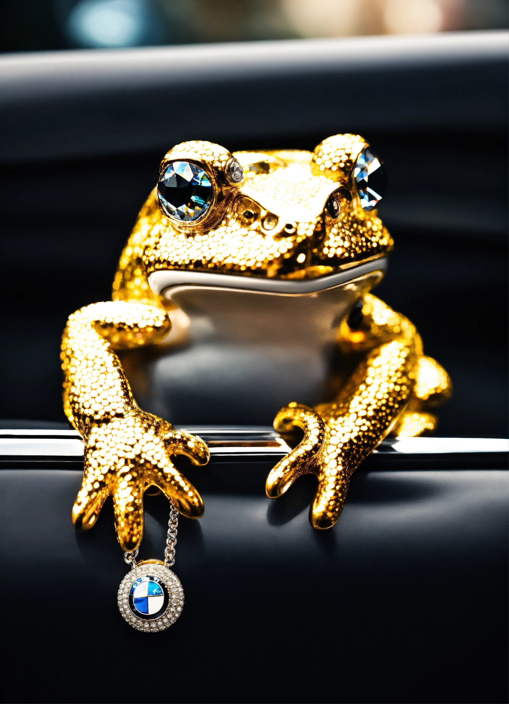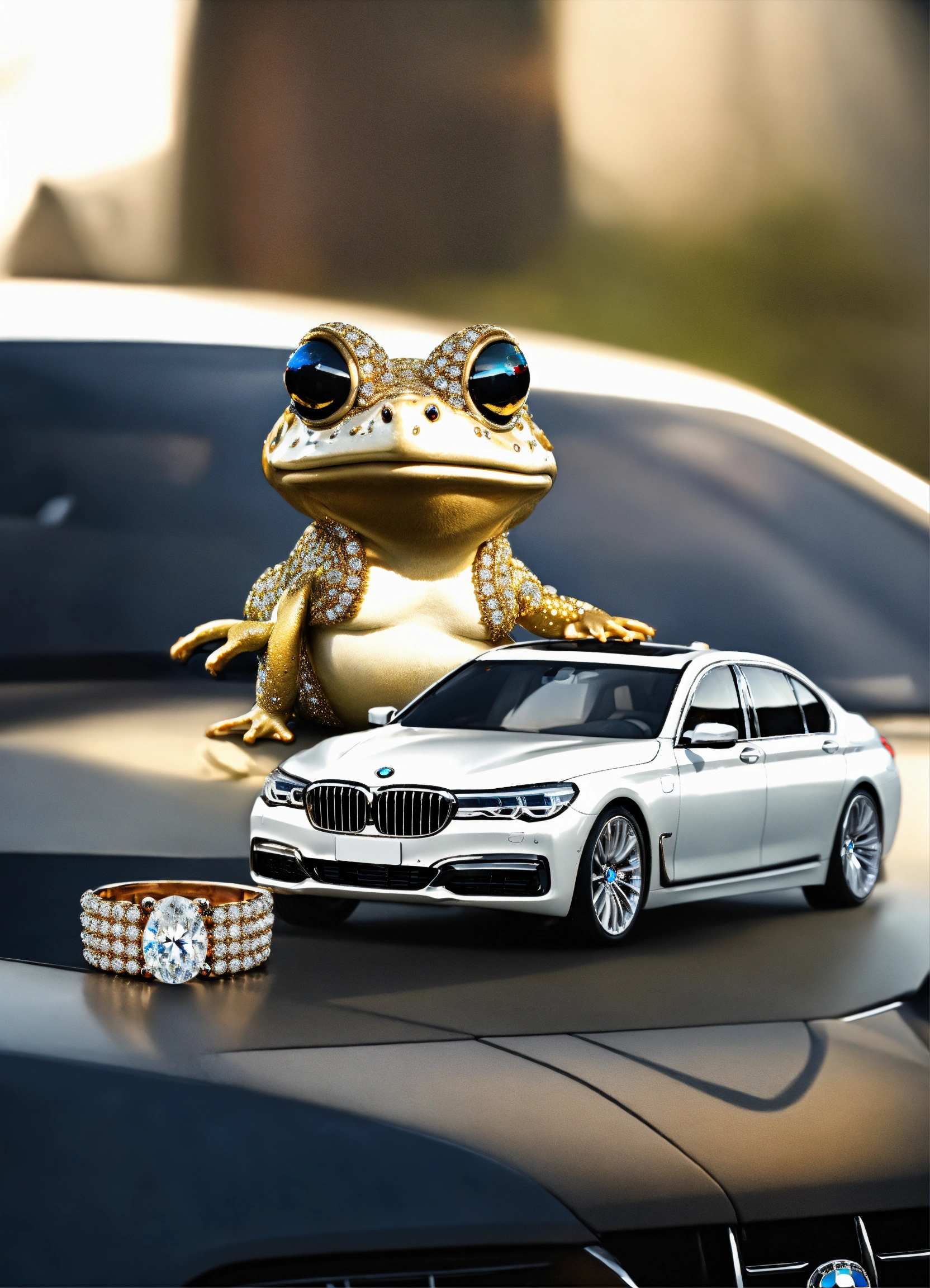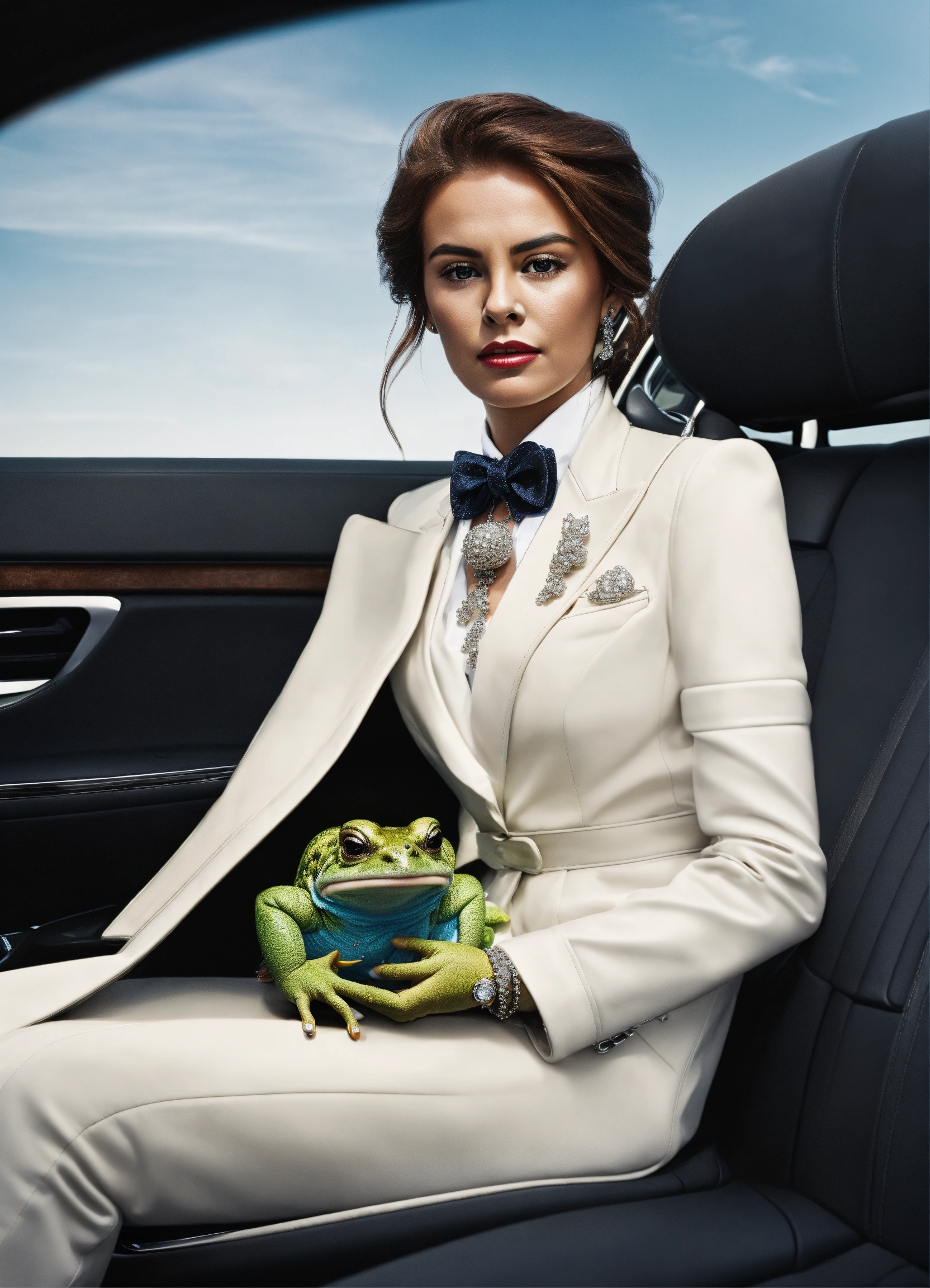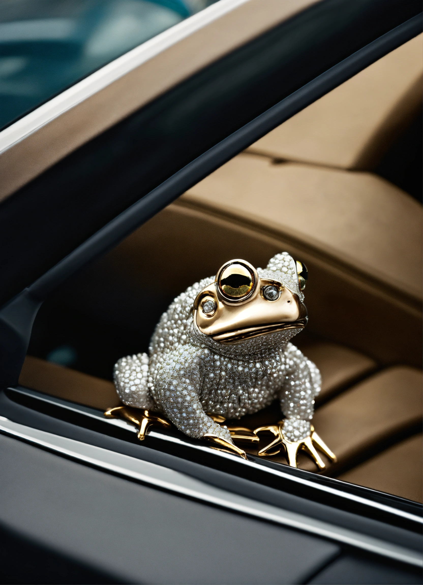 Photorealistic toad in white coat diamond necklace and diamond bracelet in the back of a bmw 7 series automobile