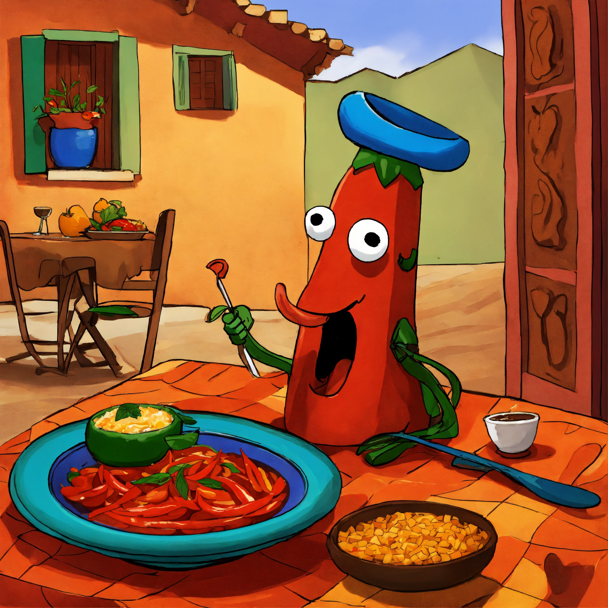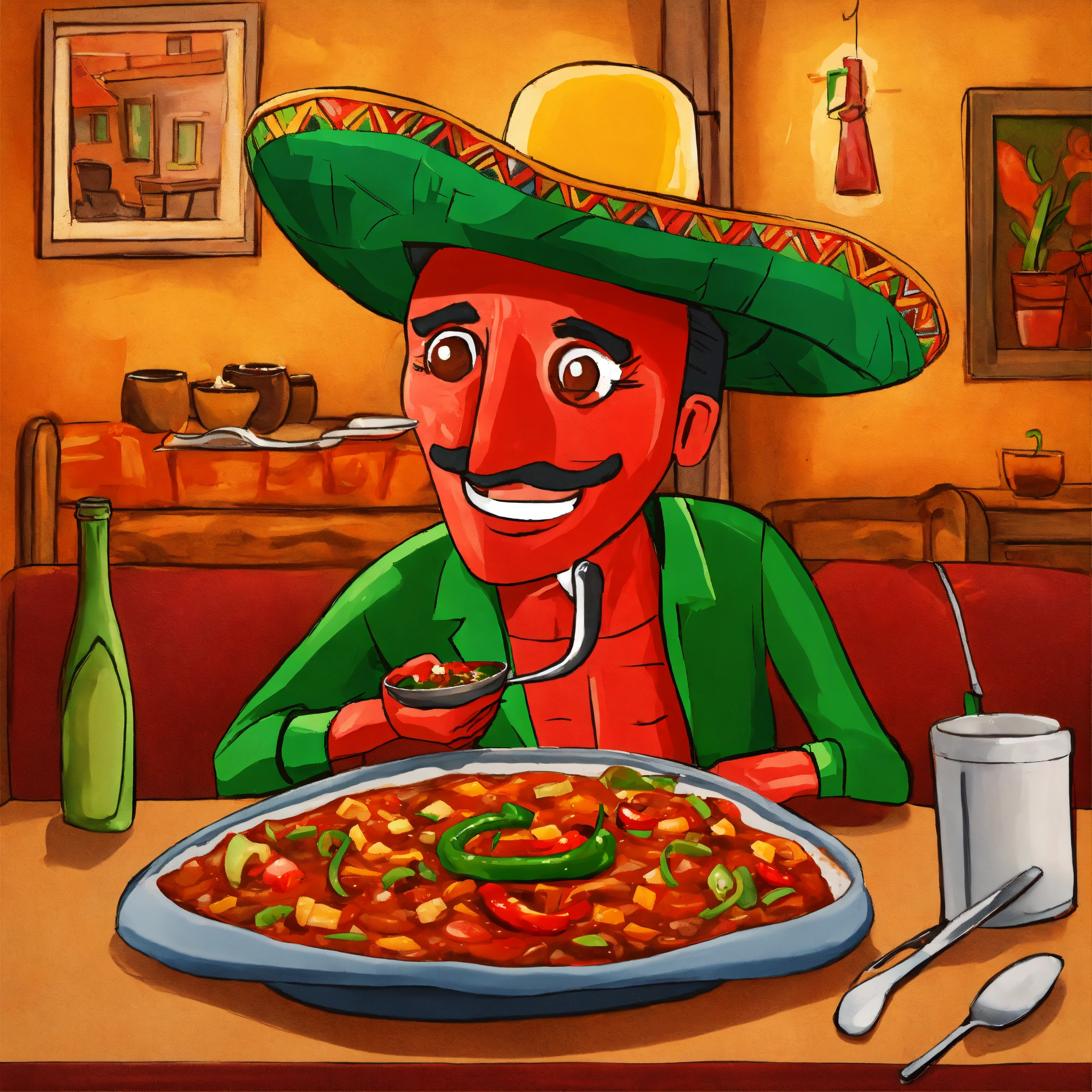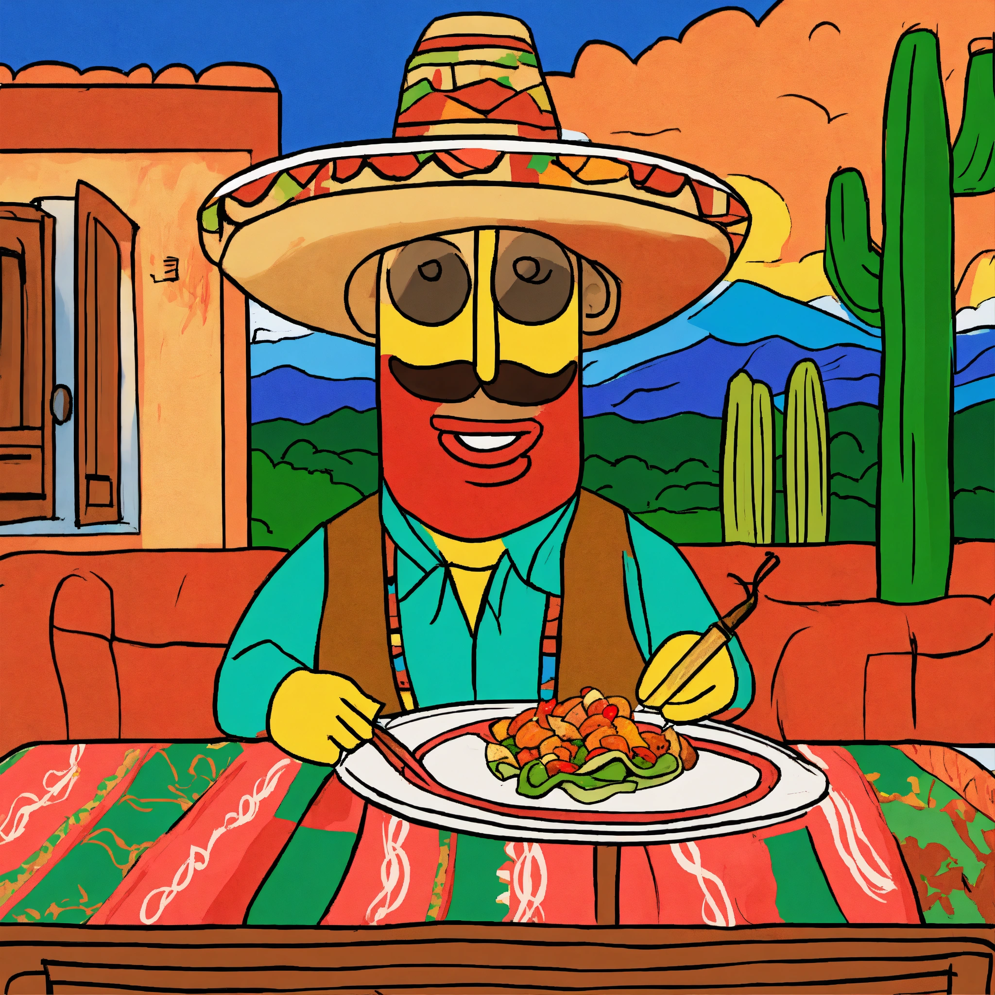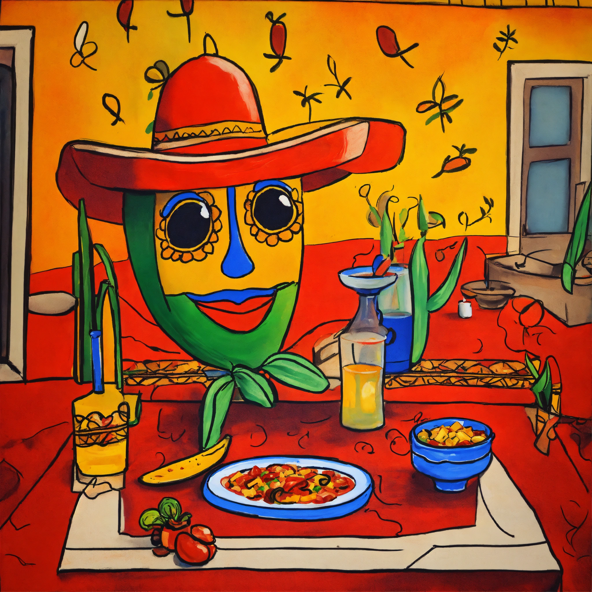 Draw a chili character having dinner with a mexican background as it was painted by picasso