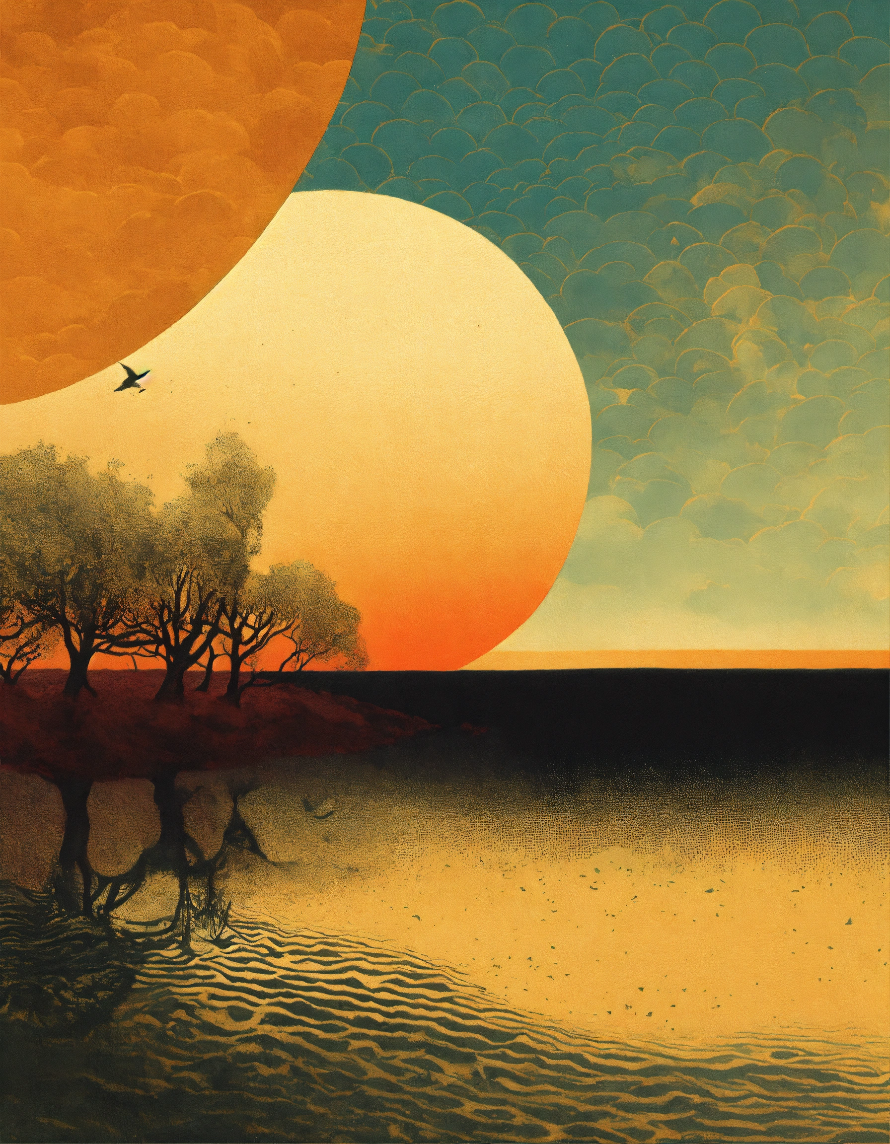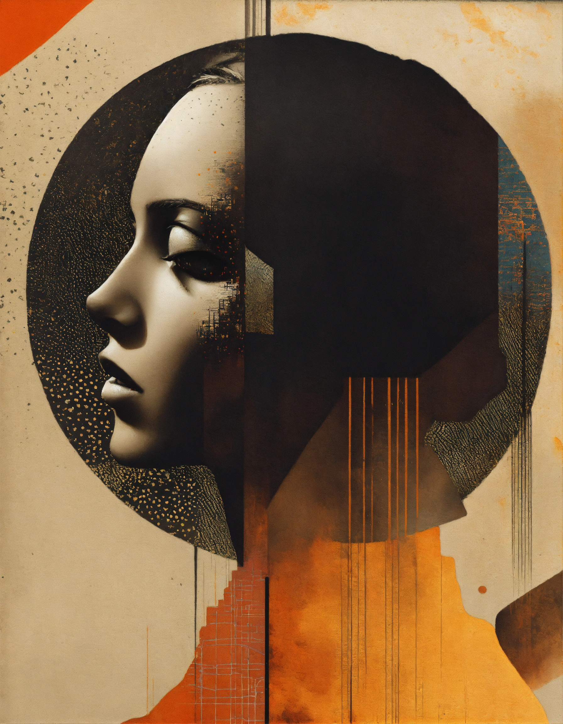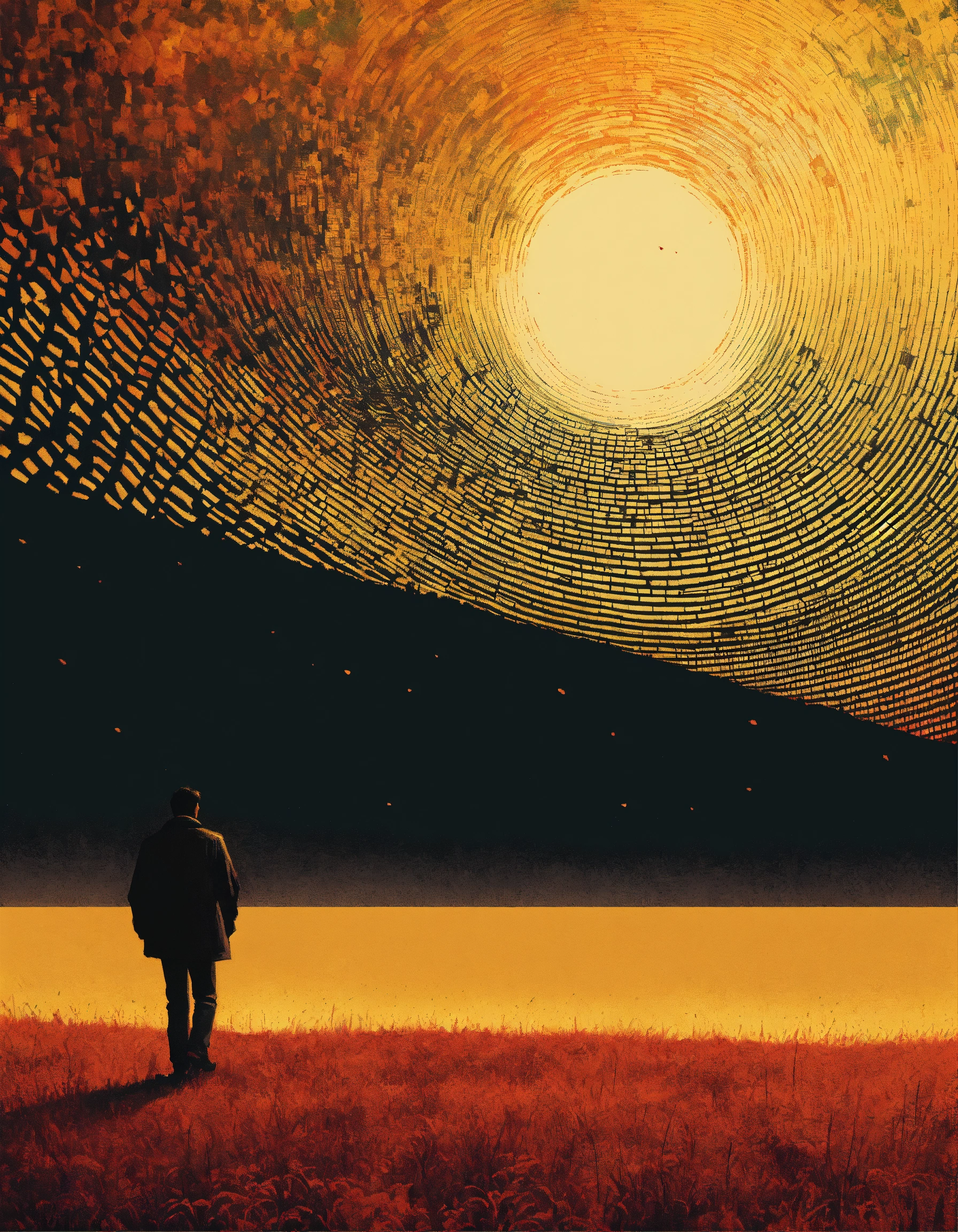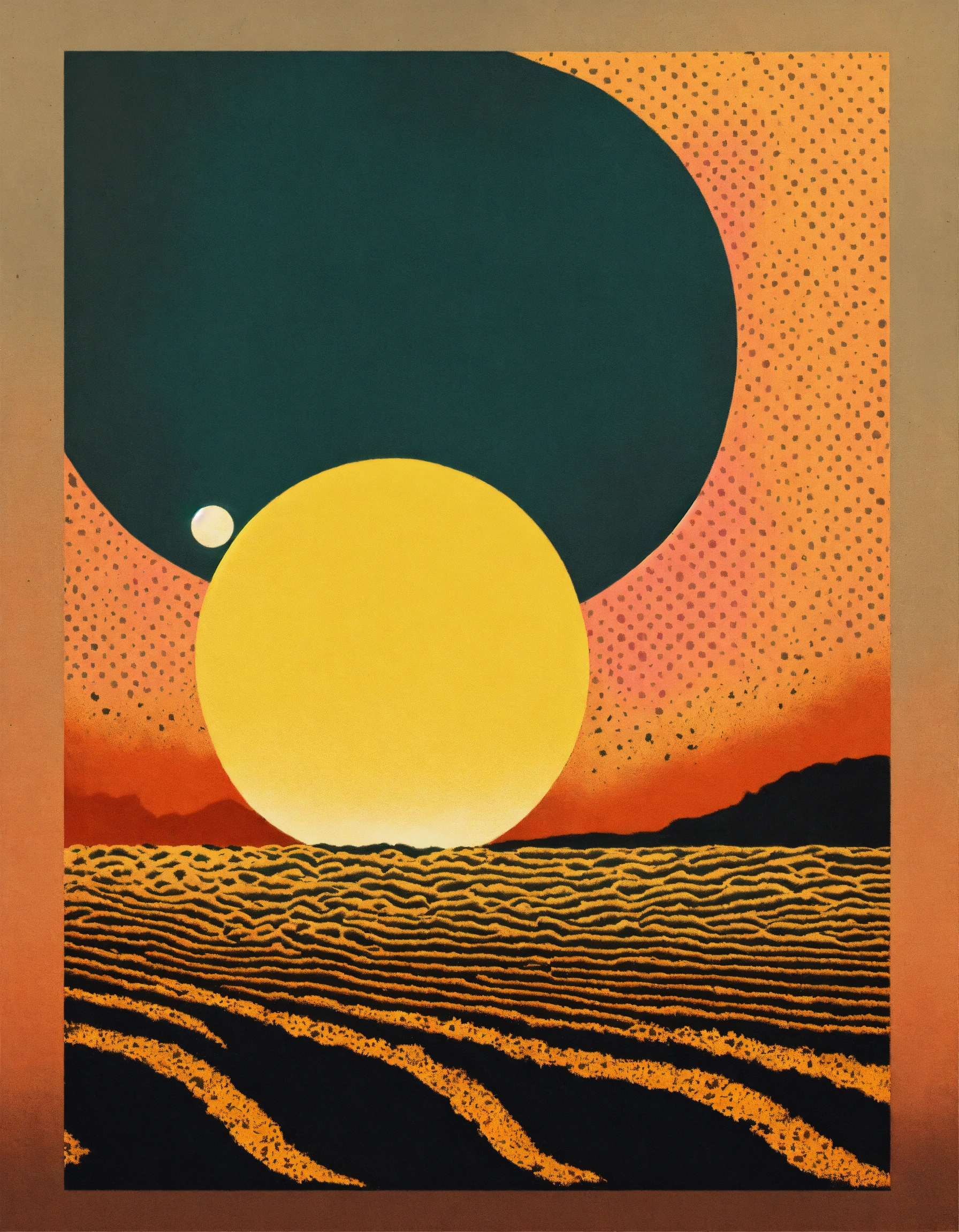 Sun profile + halftone pattern + editorial illustration of the memento morti + higly textured, genre defining mixed media collage painting + fringe absurdism + award winning halftone pattern illustration + simple flowing shapes + subtle shadows + paper texture + minimalist color scheme + inspired by zdzisław beksiński.