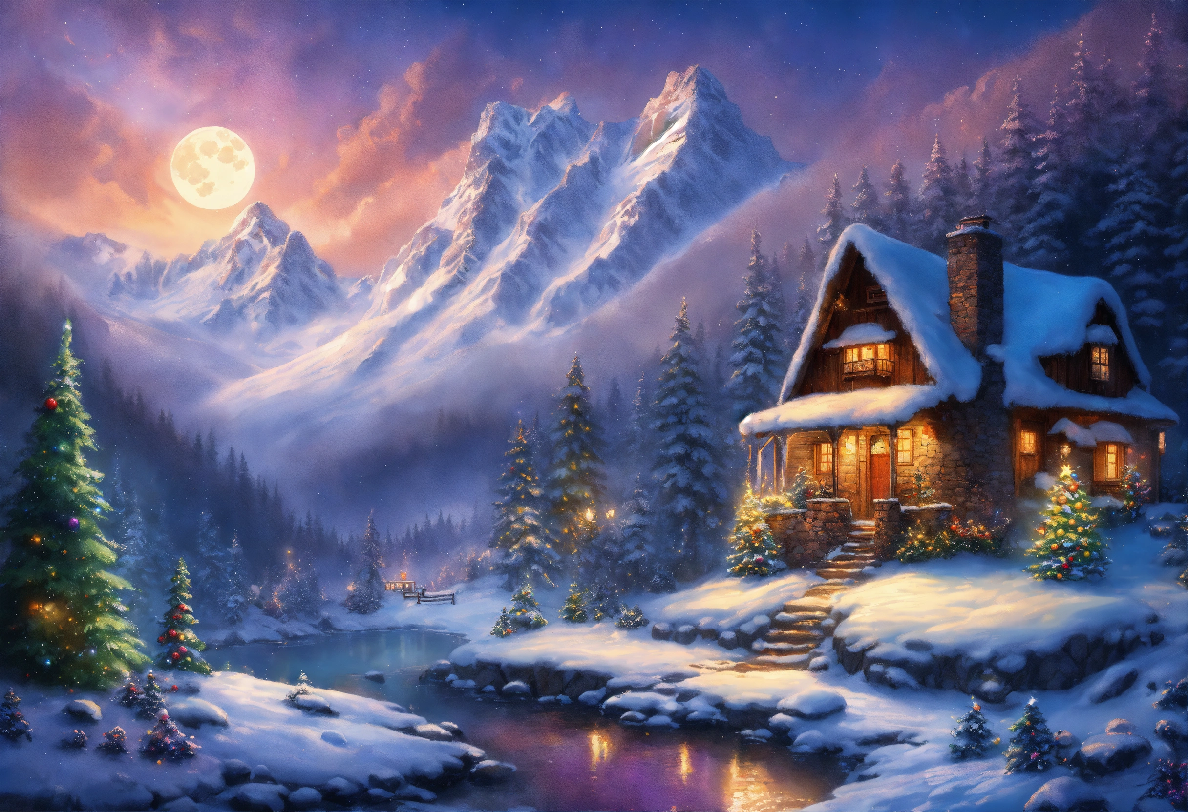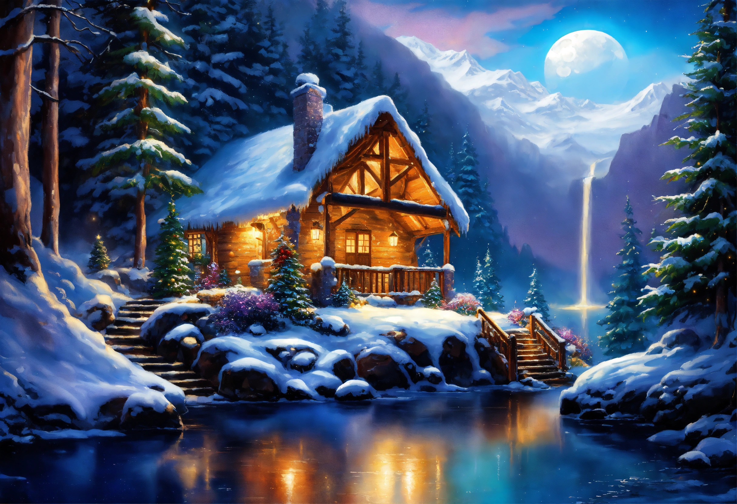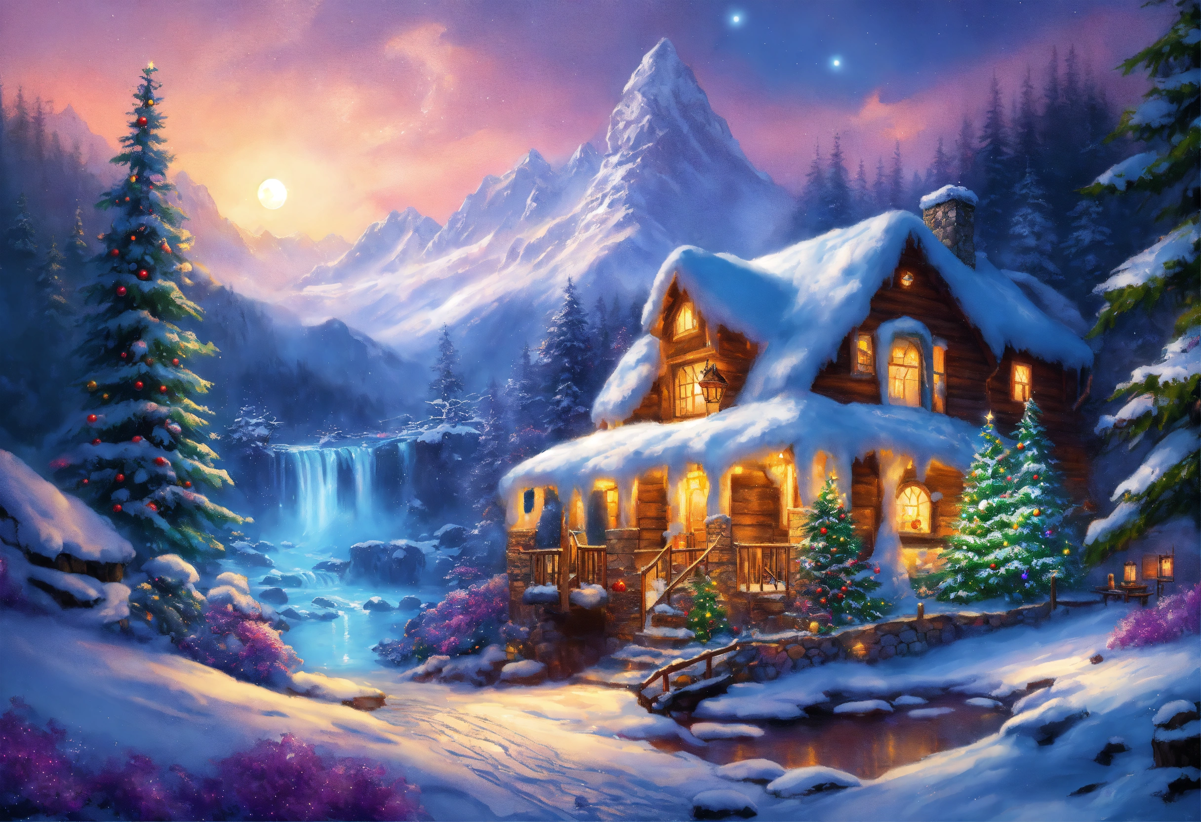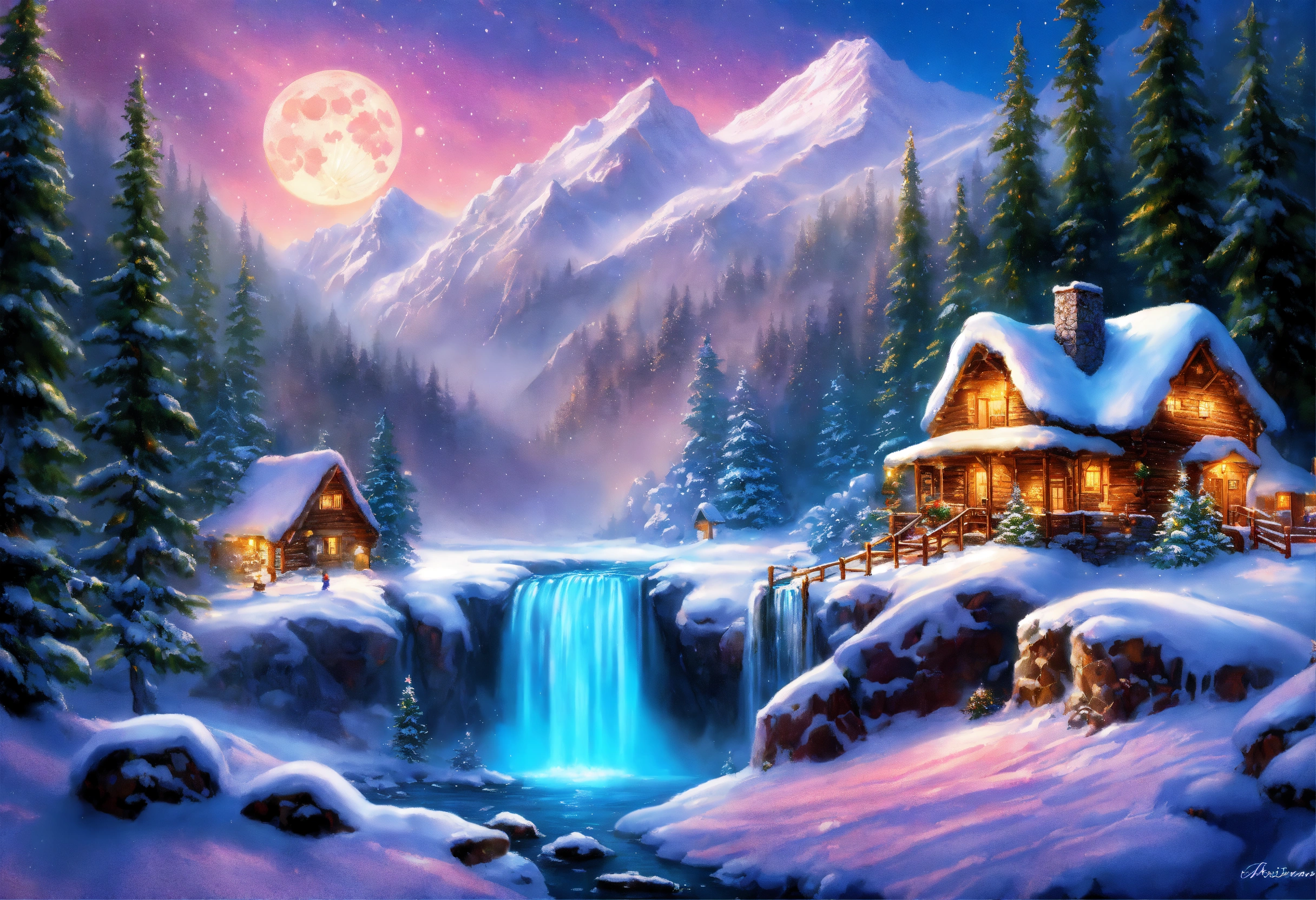 Charming cave, snow-covered decorated christmas trees, waterfal, warm inviting cabin, ultra sharp digital oil painting, snowflakes, mountains with waterfall, soft light far-away full moon, glitter, stars, stardust, hyper realistic, well rendered, detailed, vibrant, electric blue and purple sky in style of thomas kinkade