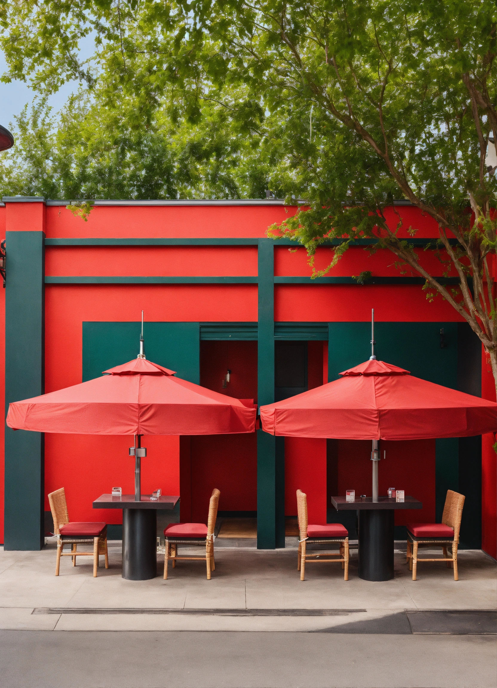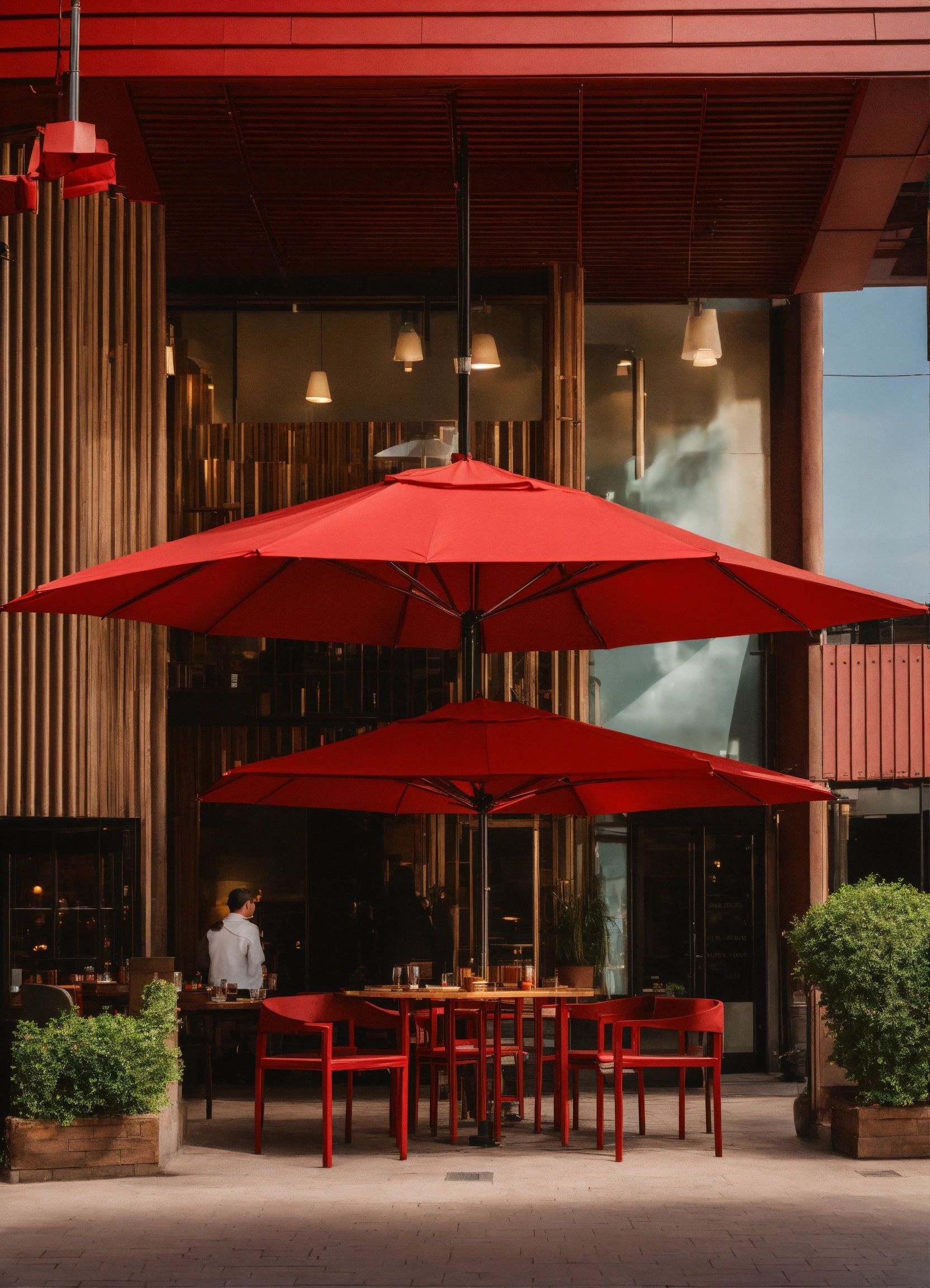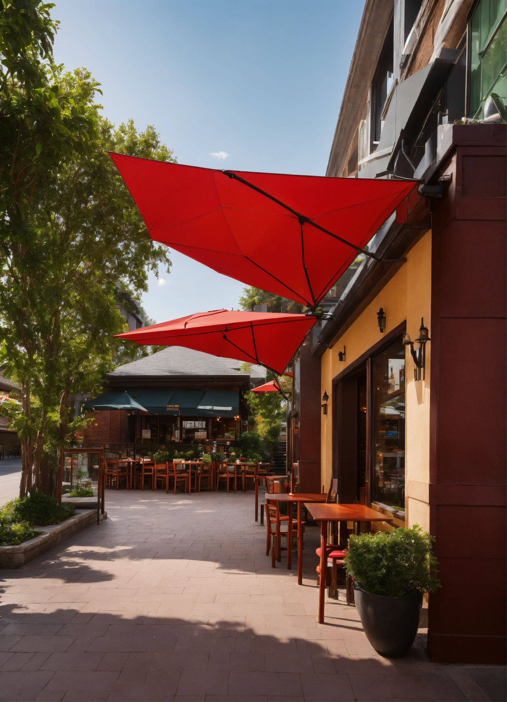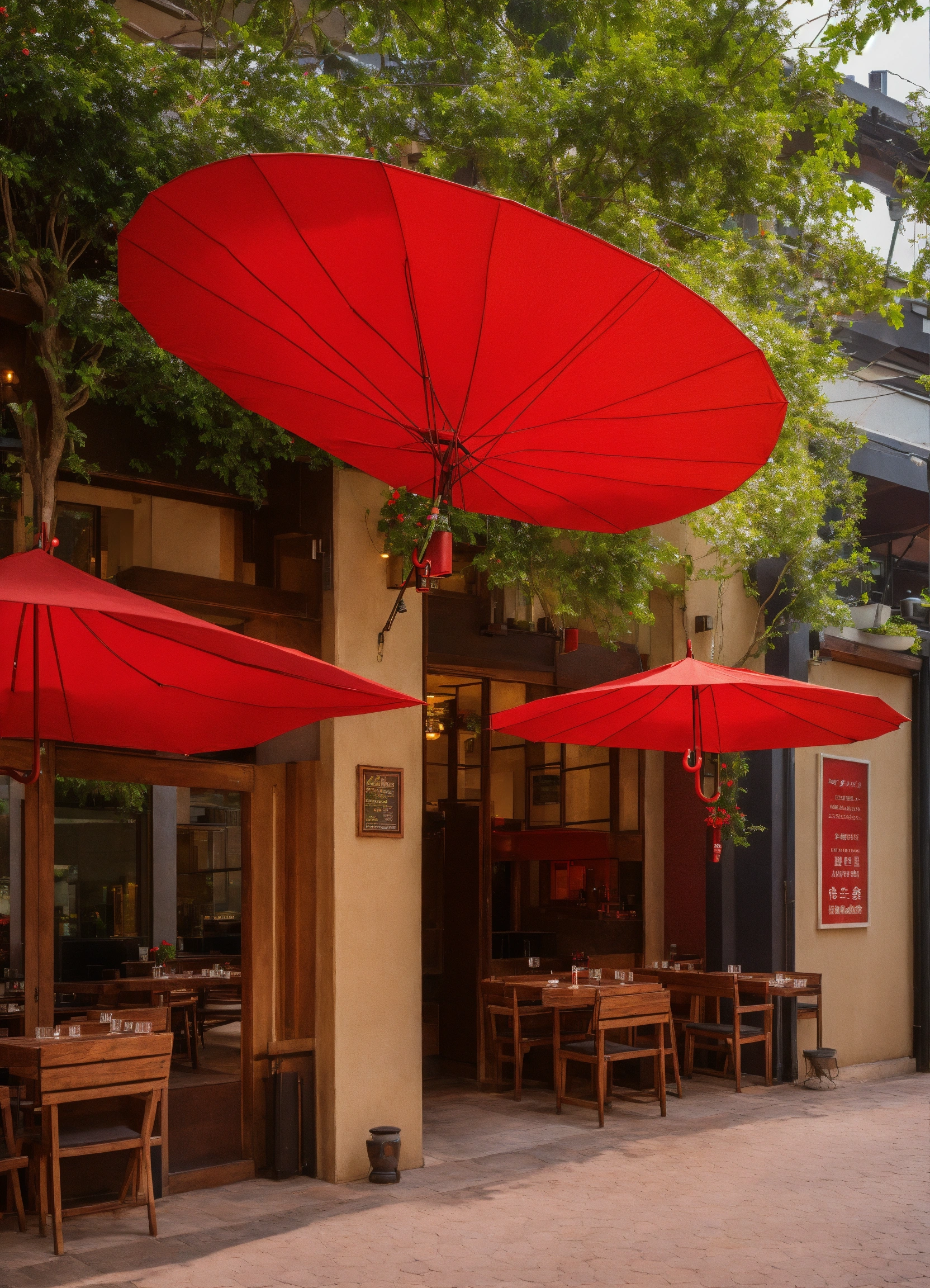 Three small red canopies shaped like half an umbrella over the entrance of restaurant