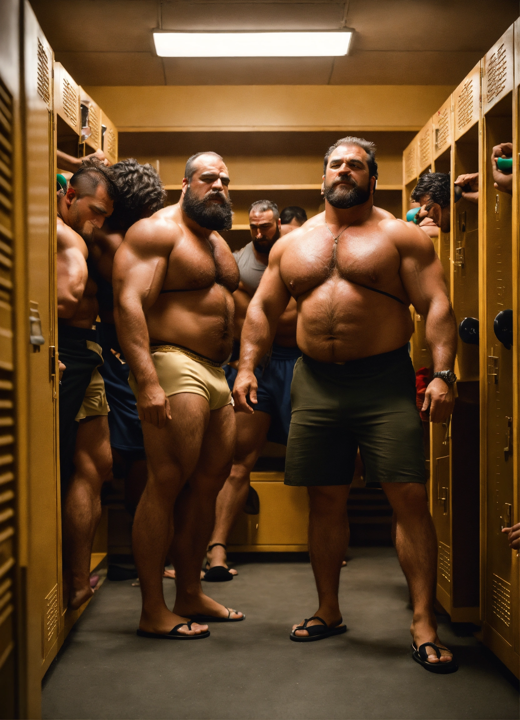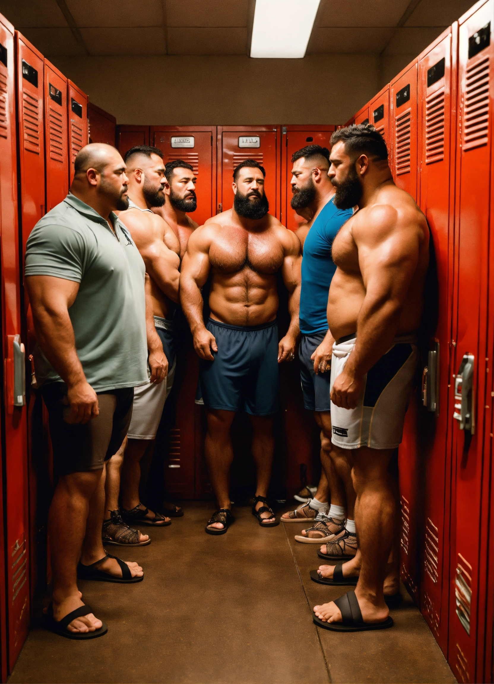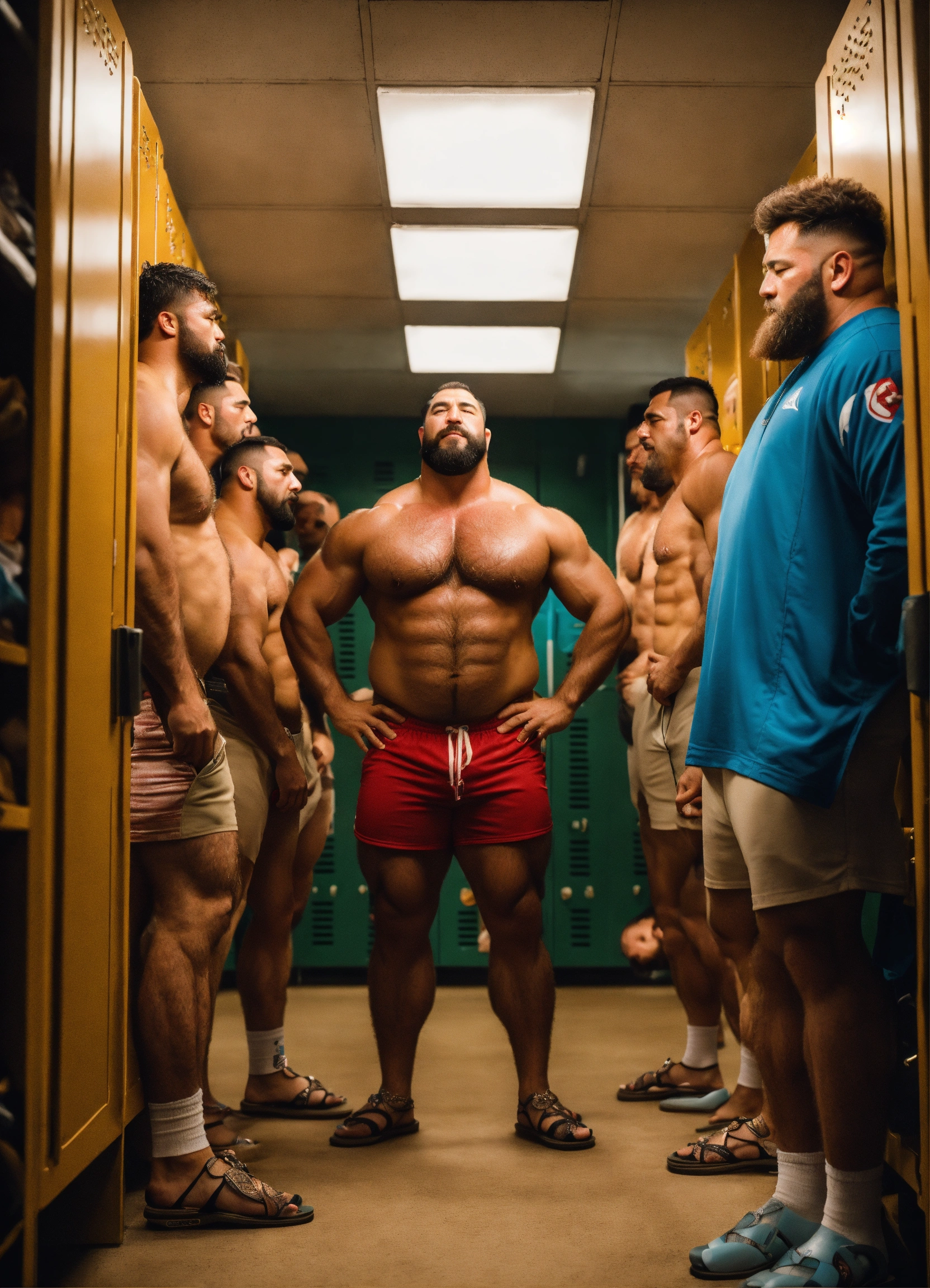 Group of friendly burly hairy manly ethnic strongmen worshipping each other's bodies in a locker room and flip flops, dad energy, epic, size difference, photography, high resolution, very detailed, smooth, clear, clean 4k