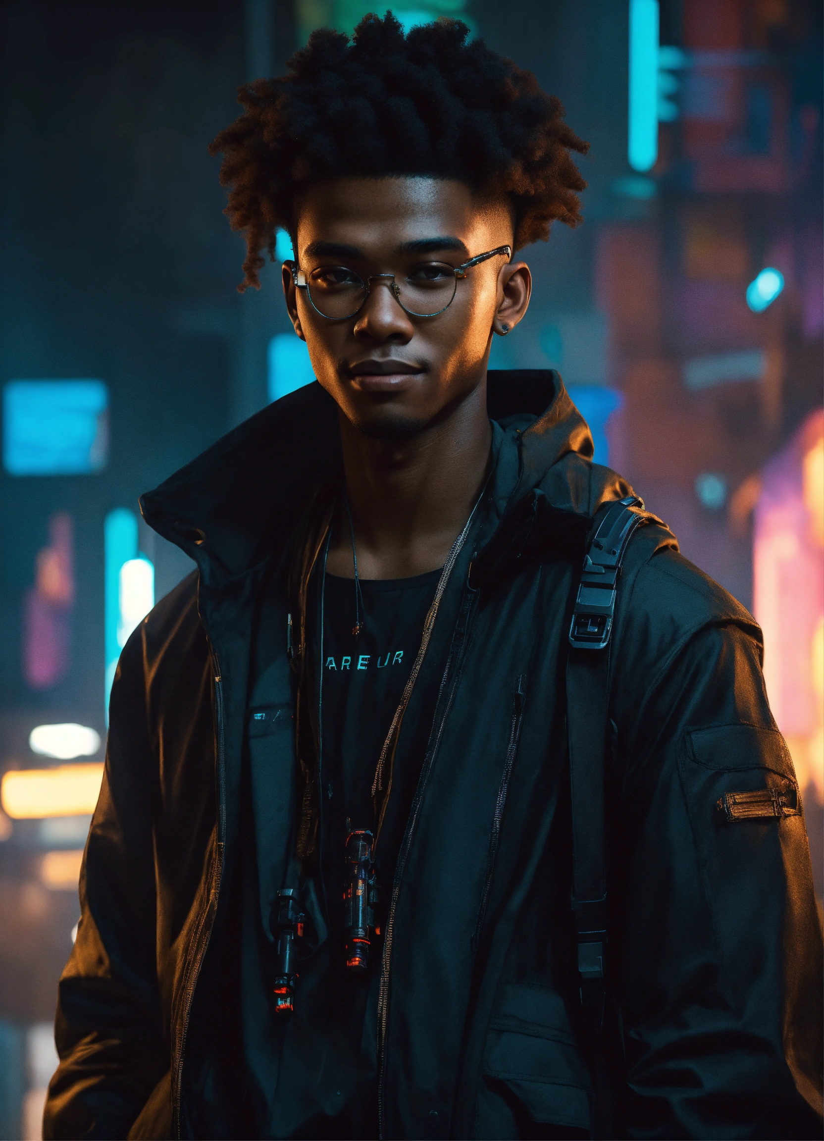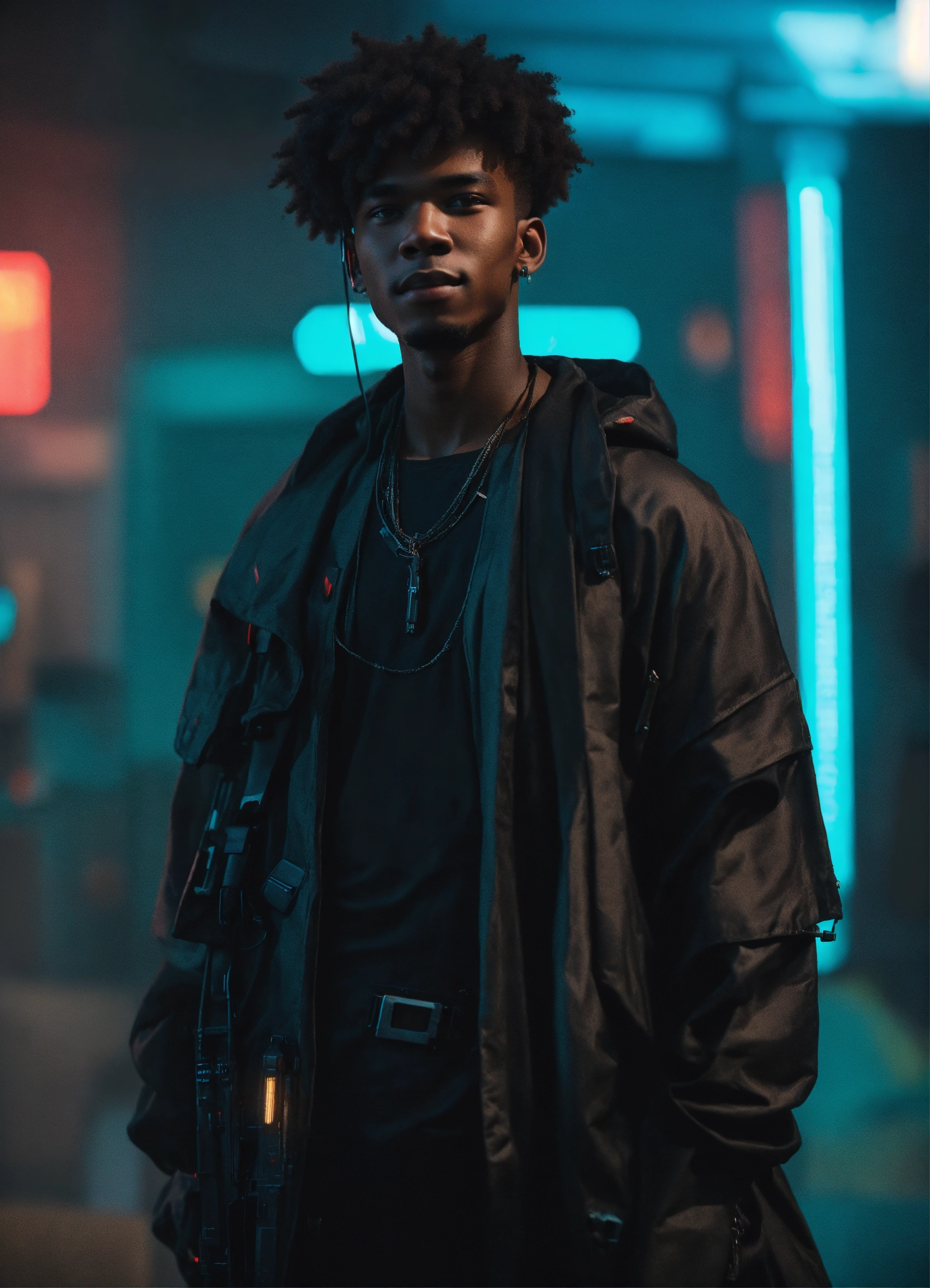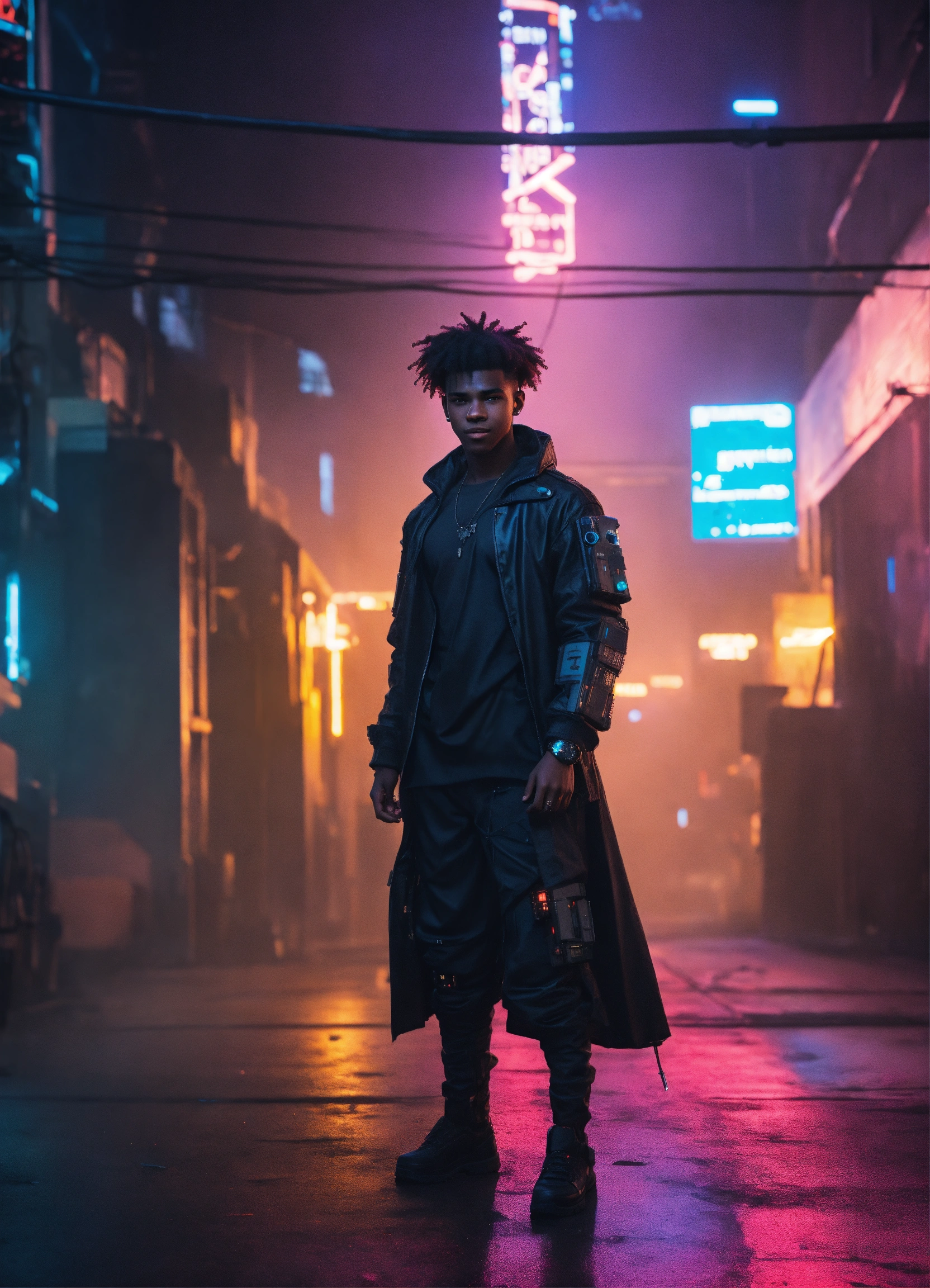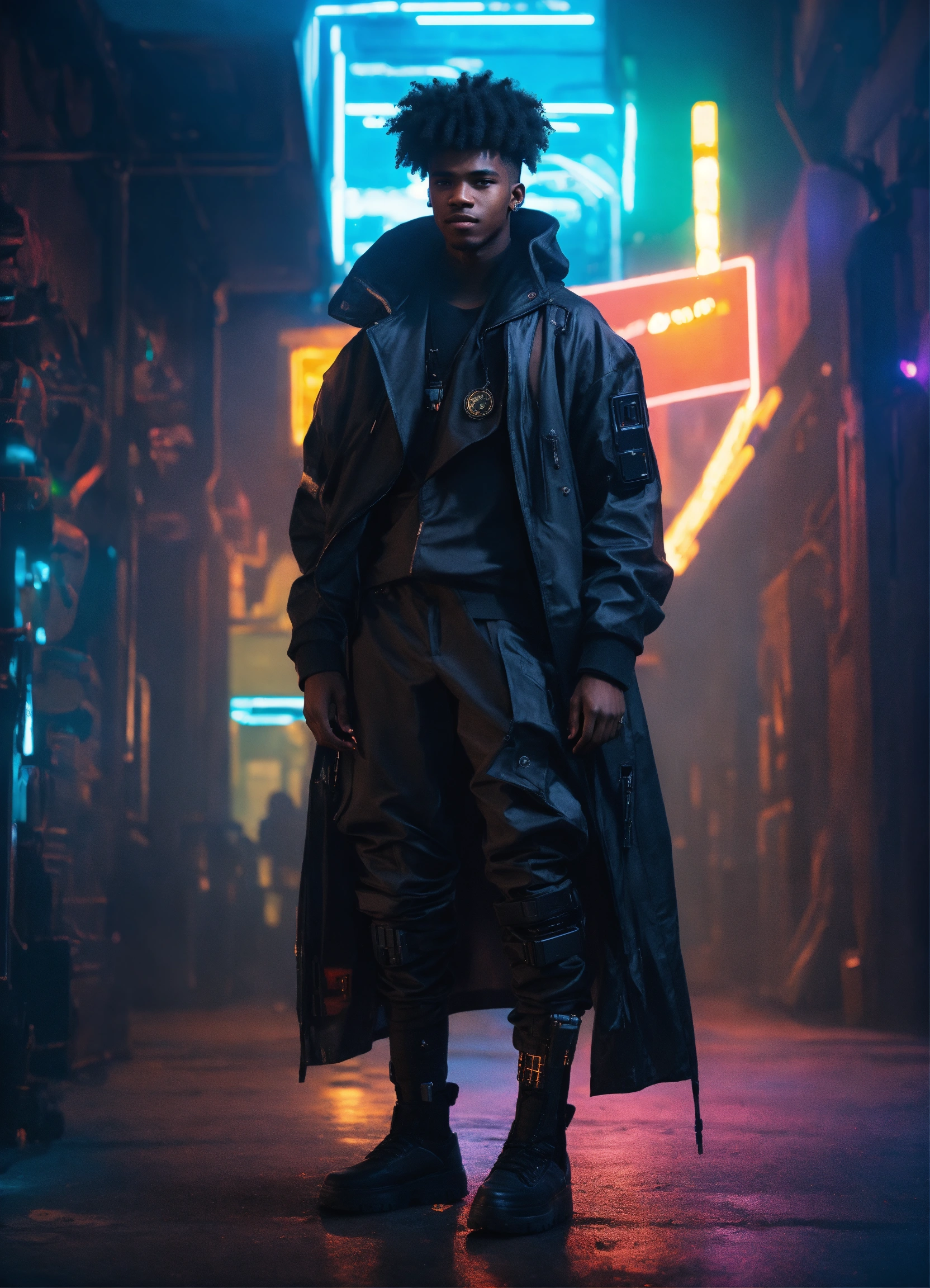 Full body photo of a black cyberpunk 18-year-old man wearing dark draped clothing, small smile, cool pallet, epic, alternative history, concept art, kind face, cinematic lighting, small fro, nice, nerdy looking