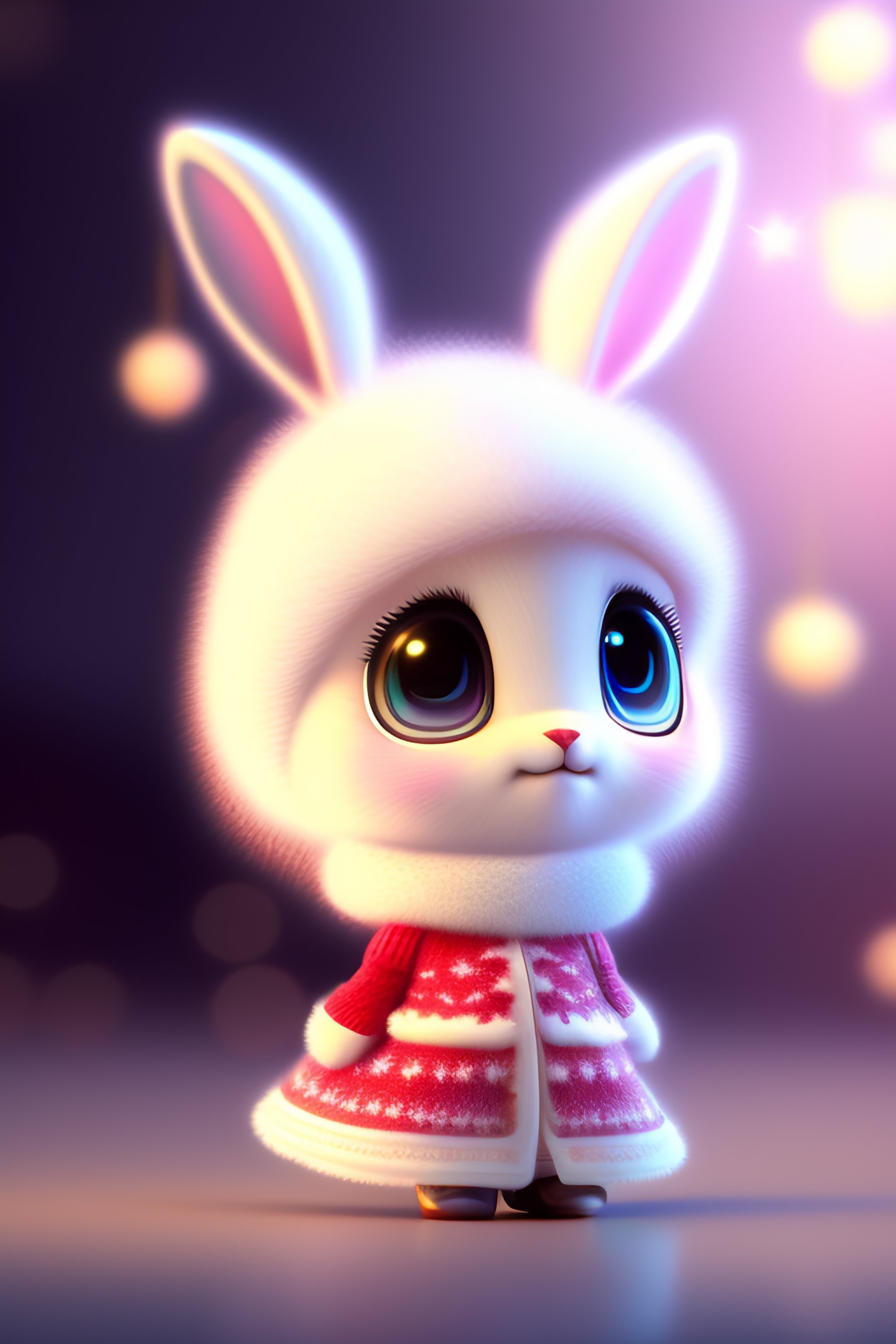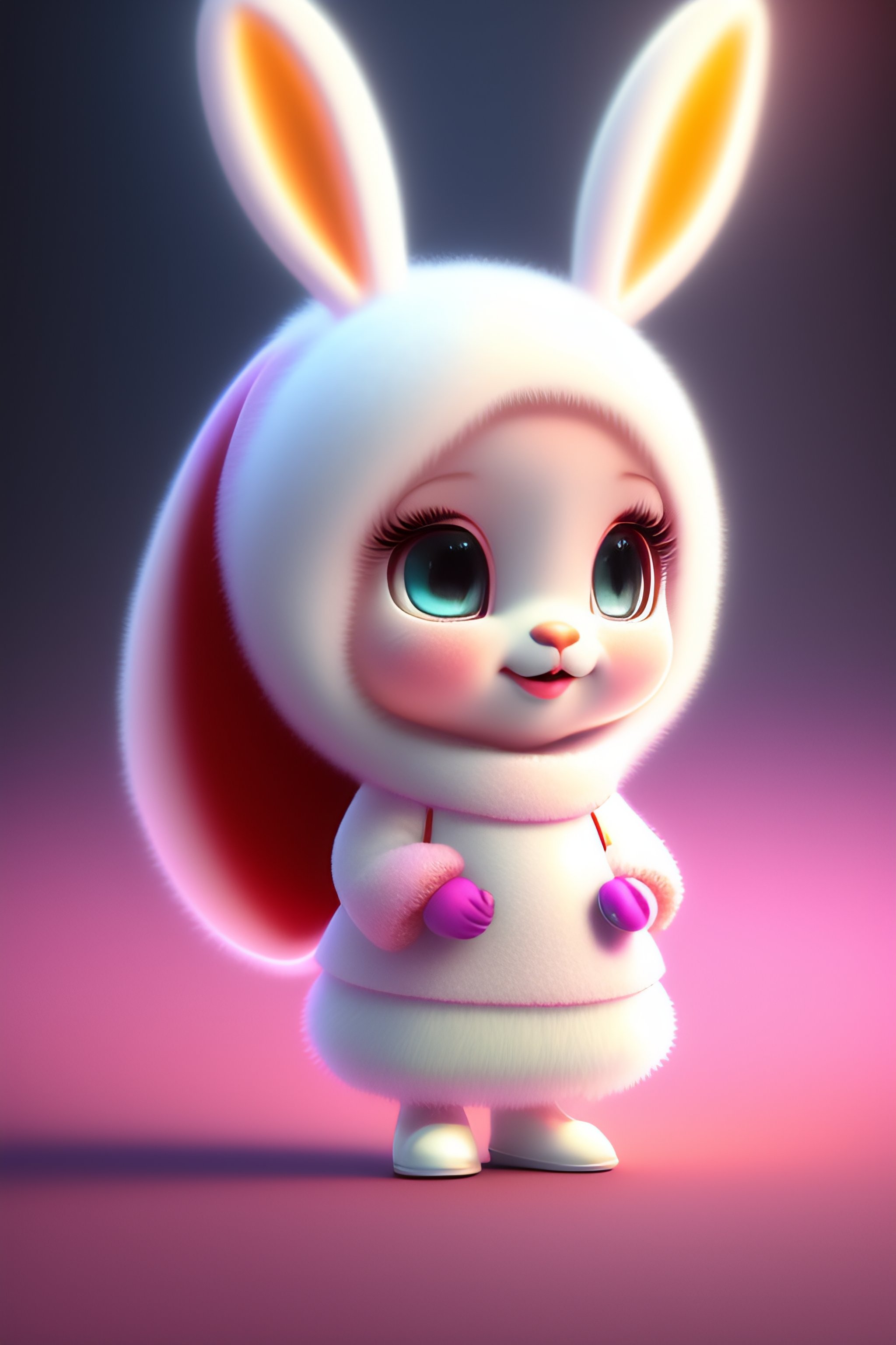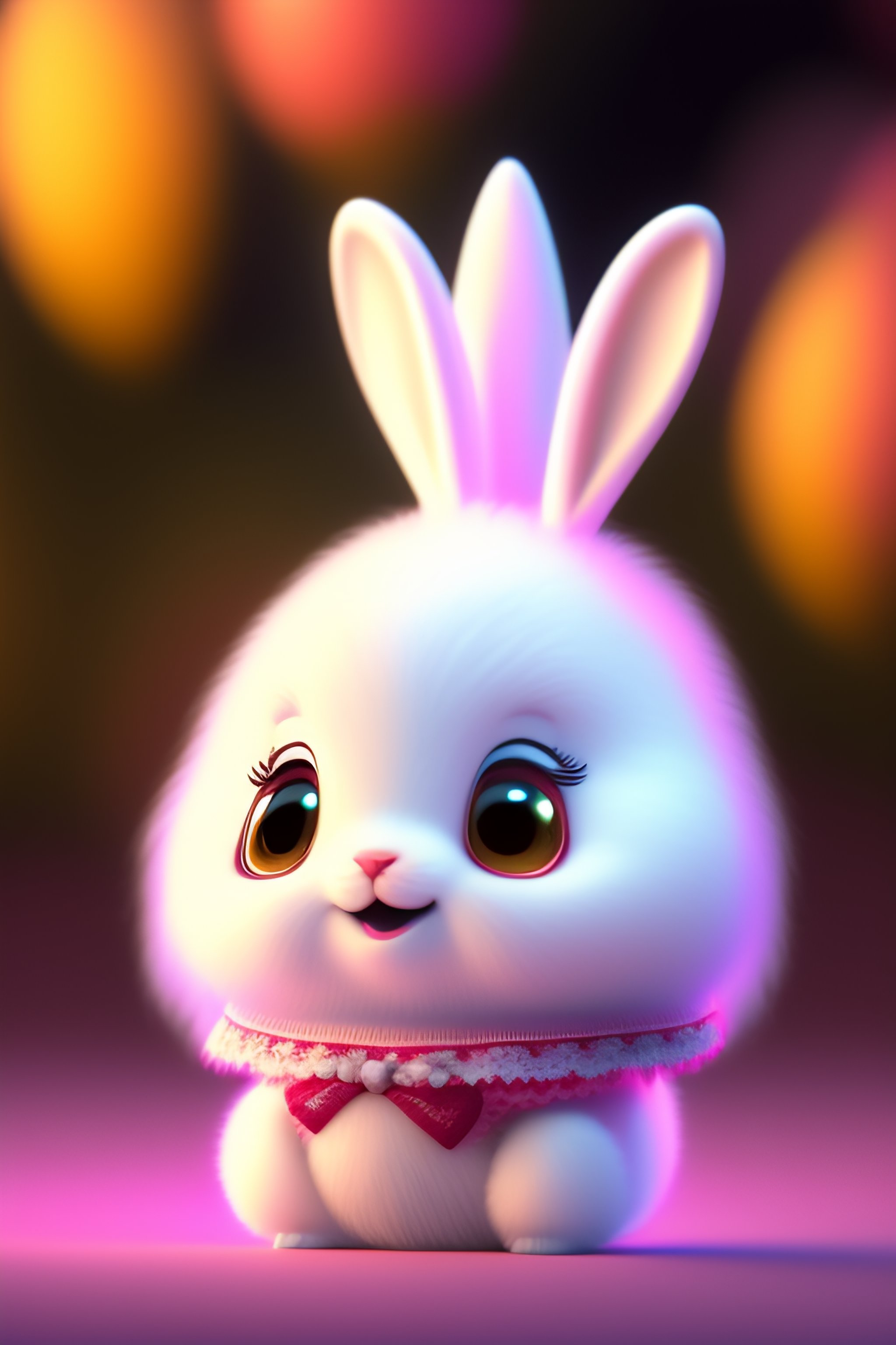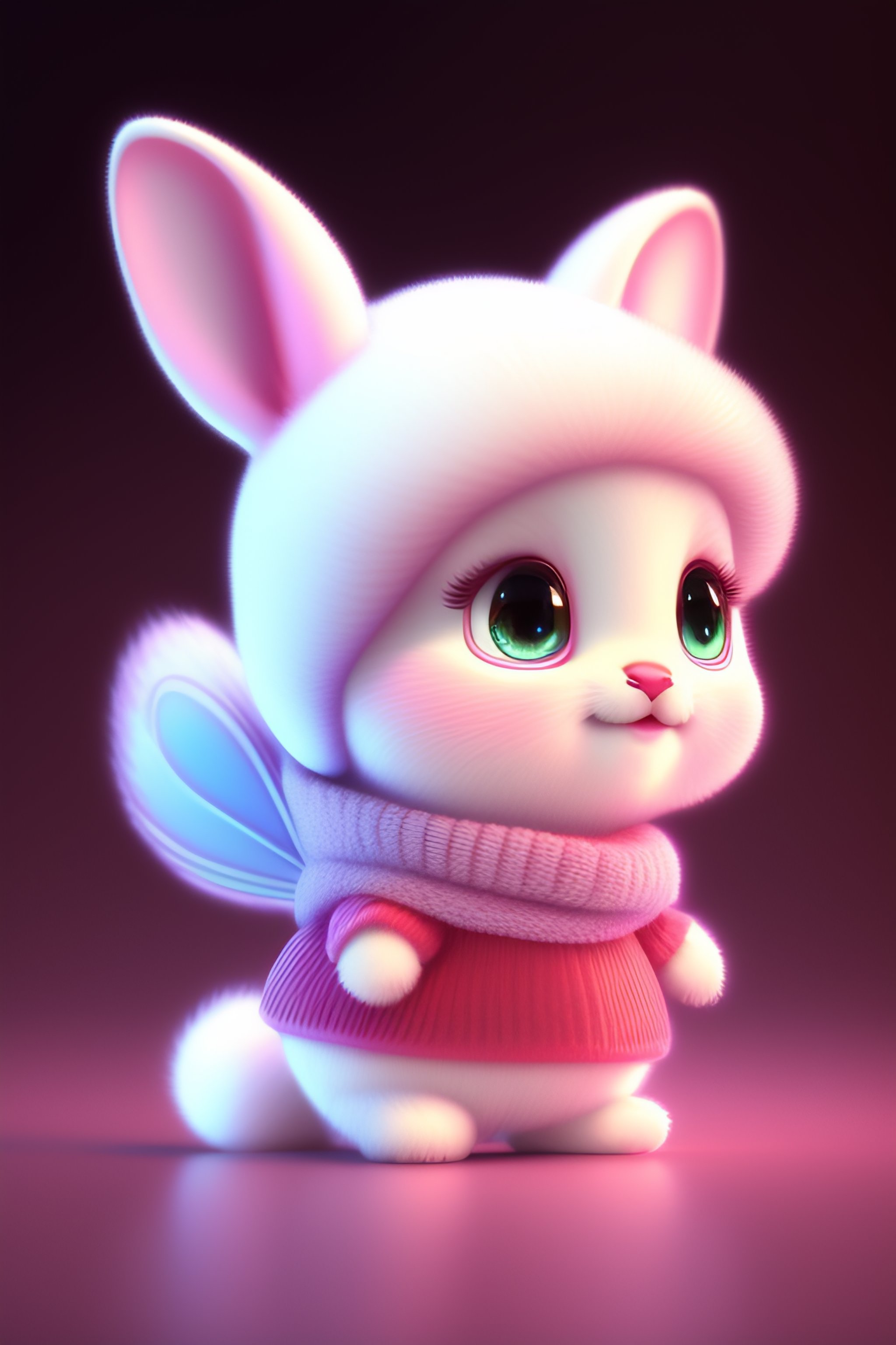 Cute baby pixar style white fairy rabbit, many pink lights, sing with a microphone, extremely detailed 3d animation, shiny snowwhite fluffy, big bright eyes, fluffy tail, wearing red sweater, wearing light yellow a hat smile, delicate and fine, fairy tales, incredibly high detailed, pixar style, bright color, natural light, simple background with pure color, 5 and octane render --v 4 --ar 2:3