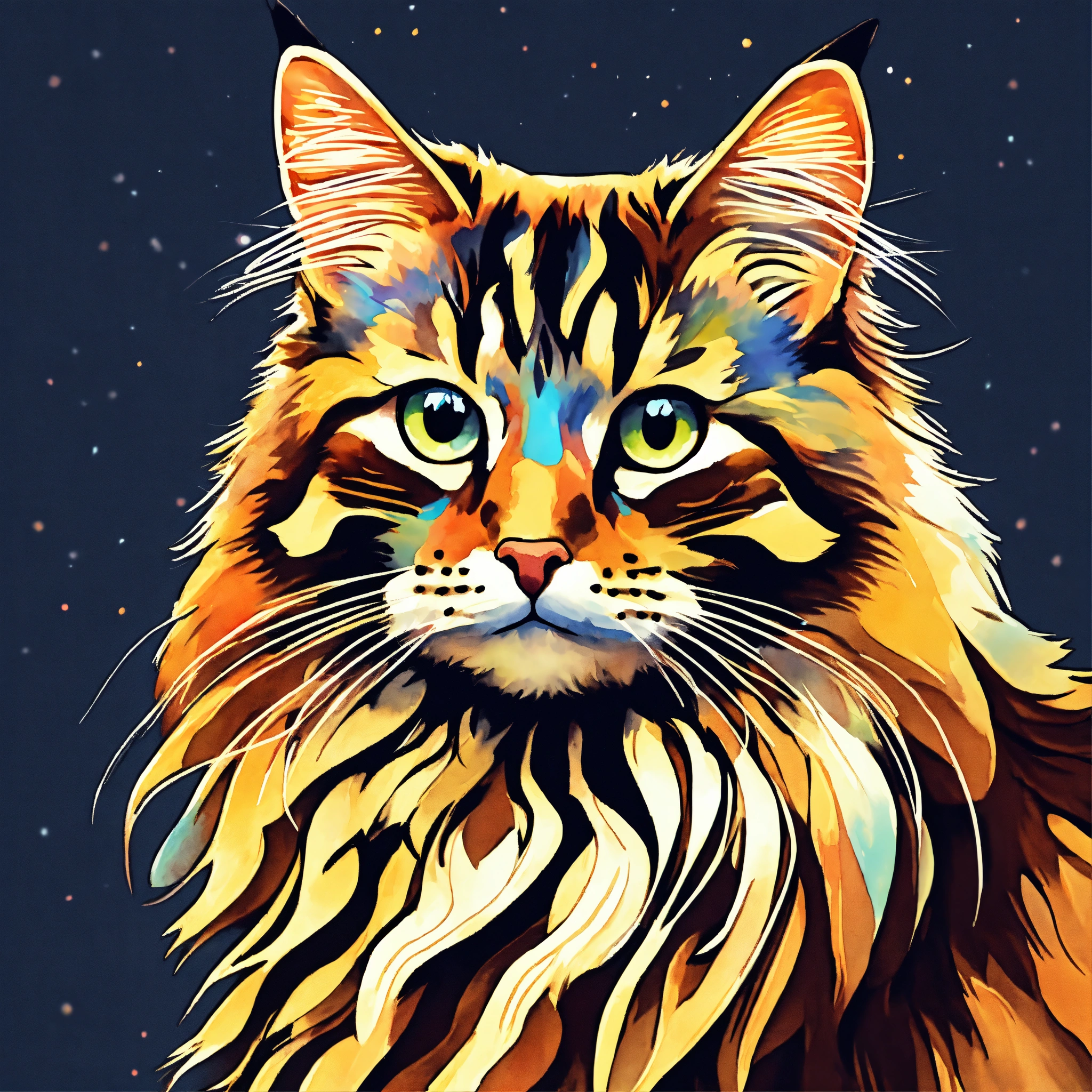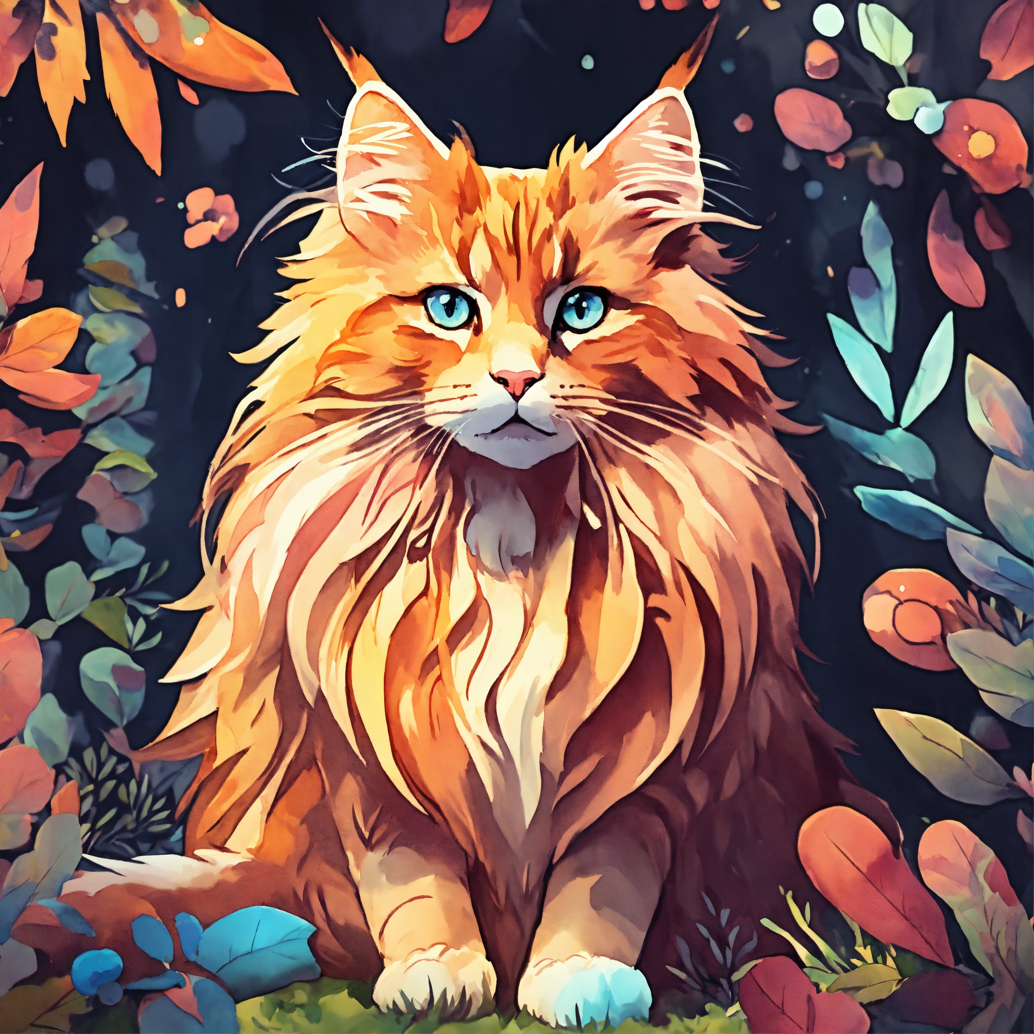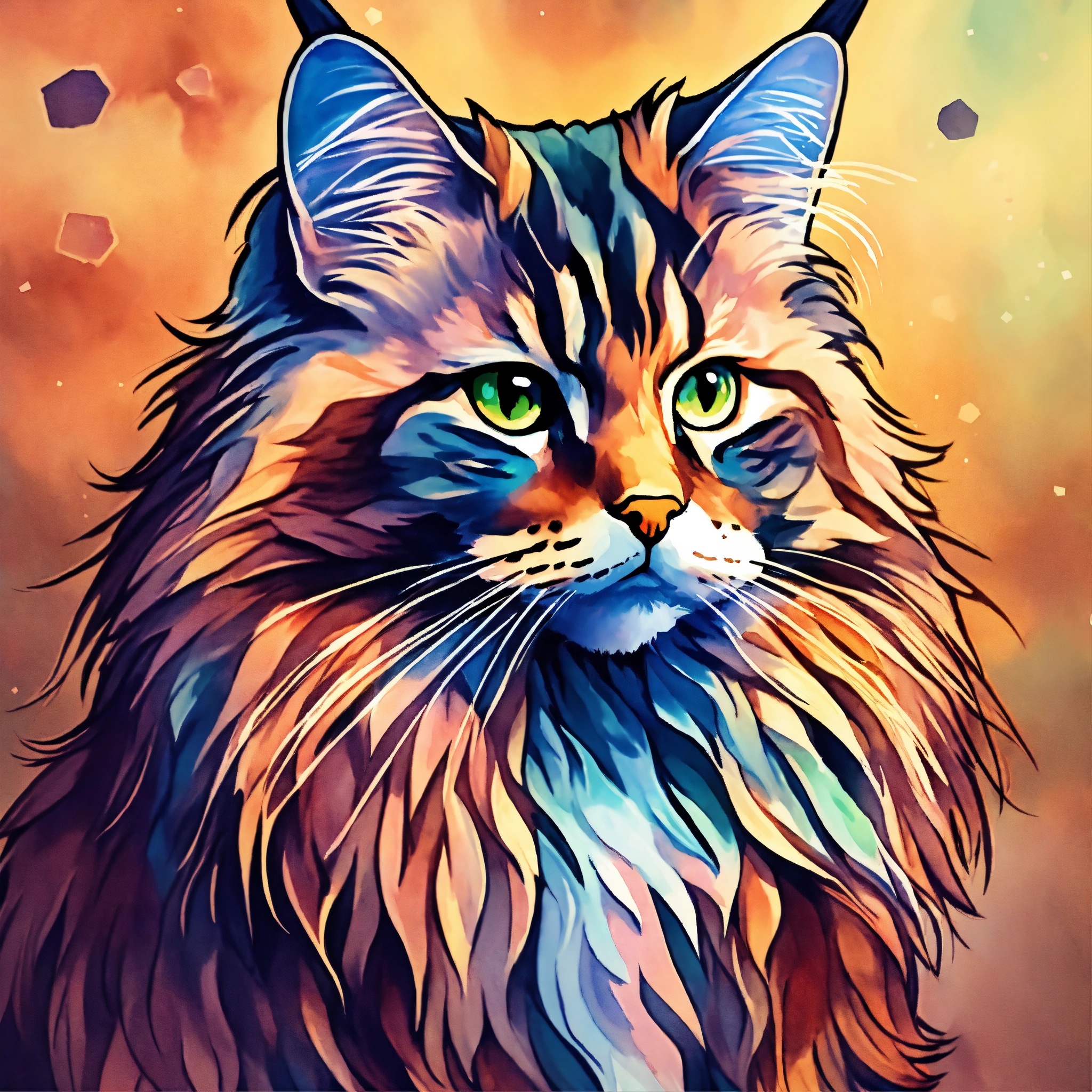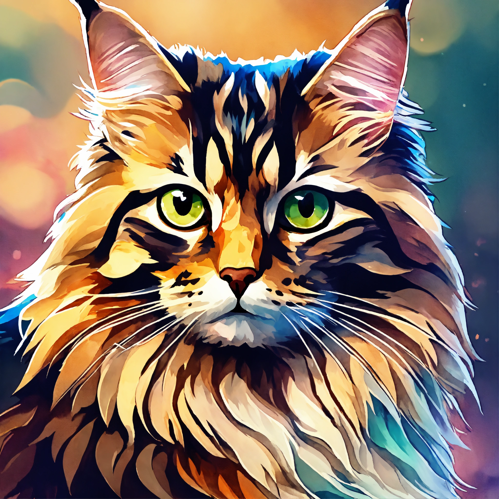 A detailed illustration of a print of a norwegian forest cat, vintage t-shirt design, in the style of watercolour, tetradic colors, 3d vector art, cute and quirky, fantasy art, watercolor effect, bokeh, hand-drawn, digital painting, low-poly, soft lighting, bird's-eye view, isometric style, retro aesthetic, focusedon the character, 4k resolution, photorealistic rendering, usingcinema 4d