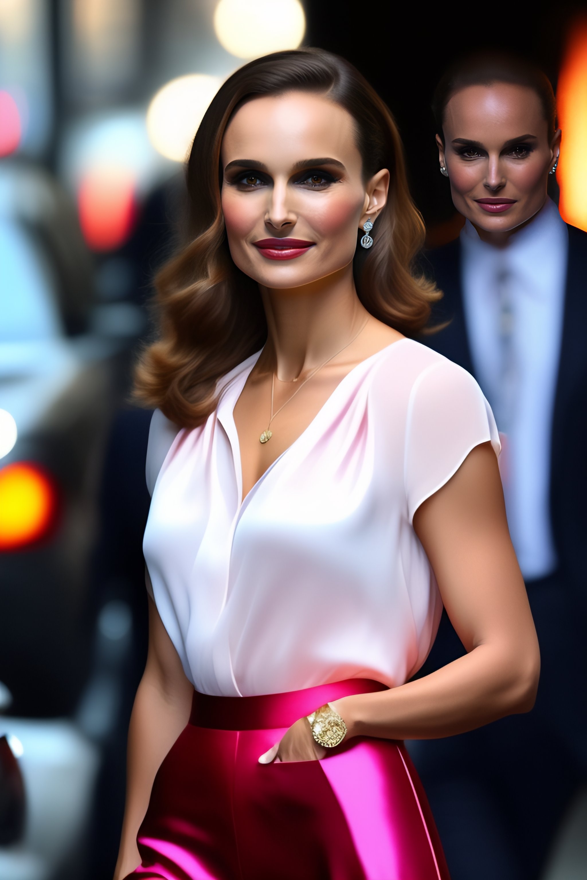 Natalie portman wearing shiny yoga pants and a satin blouse