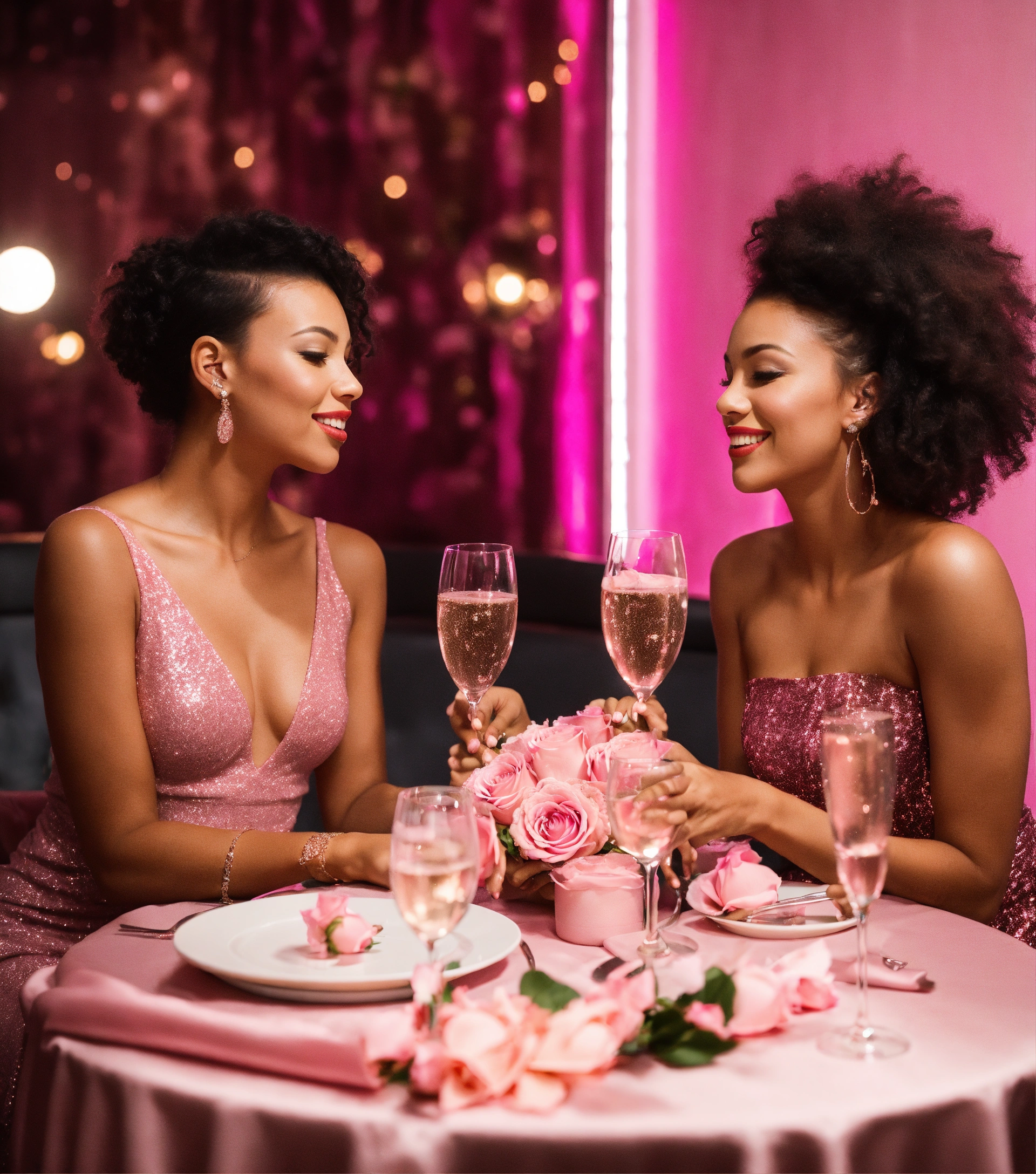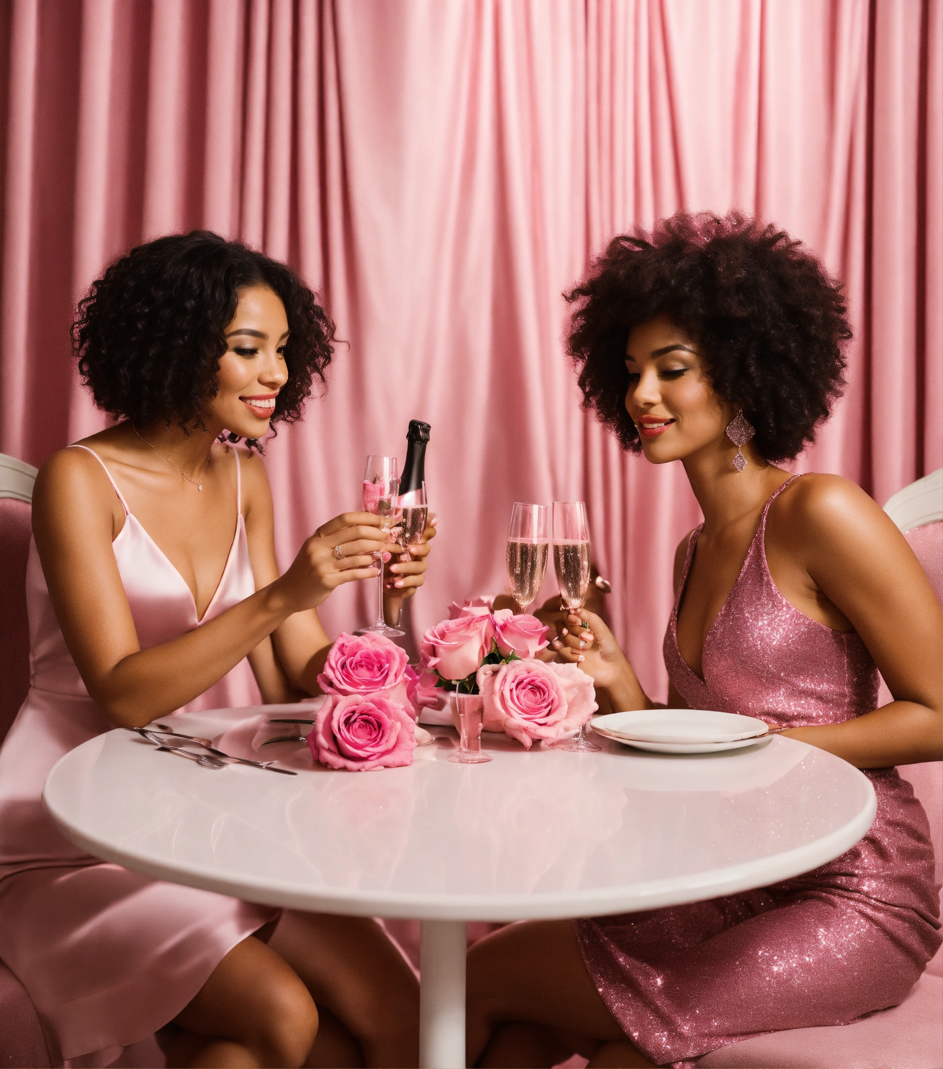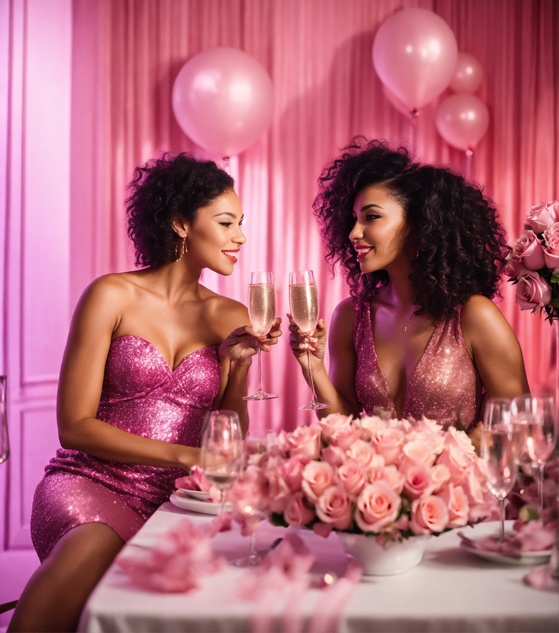 2 mixed race women in short pink party dresses for a nightclub, eating at a pink dinner table with pink champagne, pink roses and glitter, all white modern room