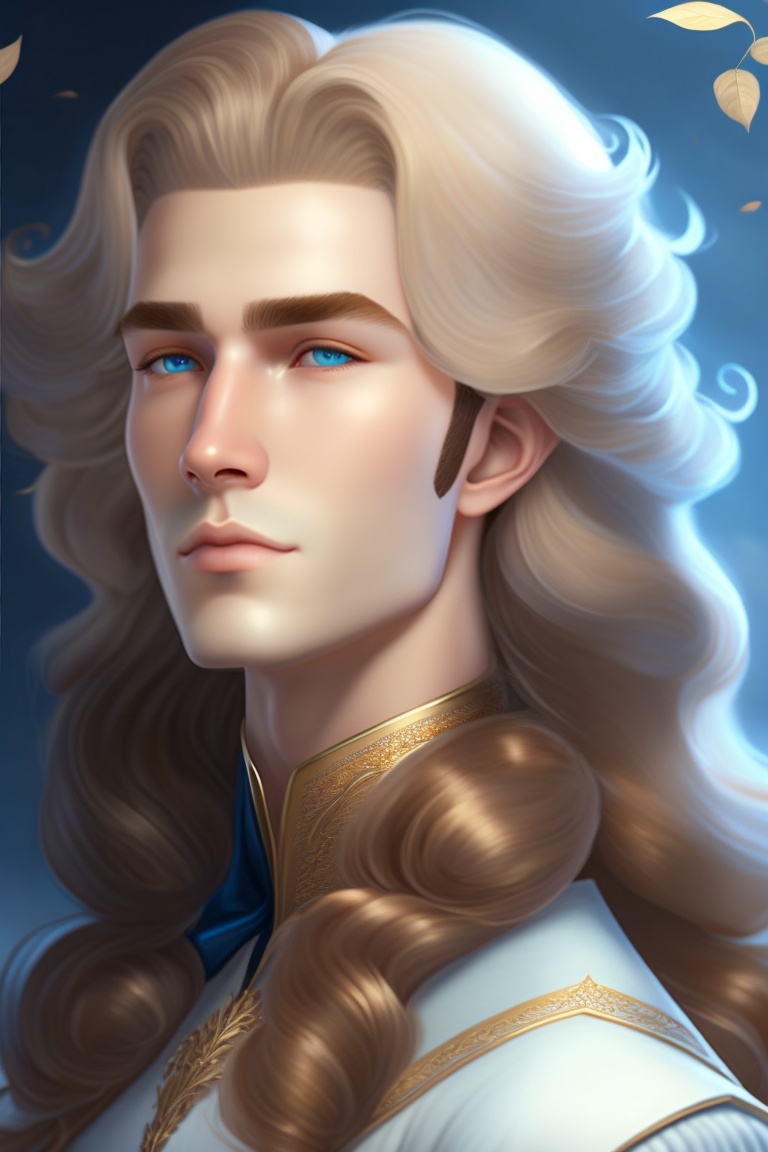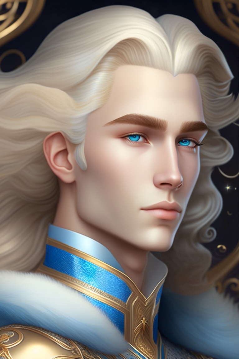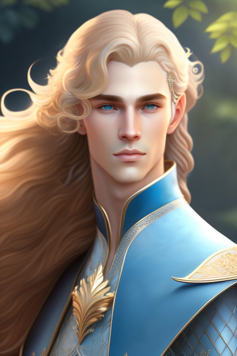 The elven prince stands regal and majestic, his ethereal beauty a testament to her royal lineage. his skin is a delicate shade of ivory, flawless and smooth to the touch. his facial features are delicate and fine, with high cheekbones, a straight nose, and full lips. his almond-shaped eyes are a vivid shade of blue, like the sky on a clear summer's day, with a hint of mischief and intelligence glinting in their depths. his long hair is a cascade of golden waves, falling in perfect ringlets down her back.