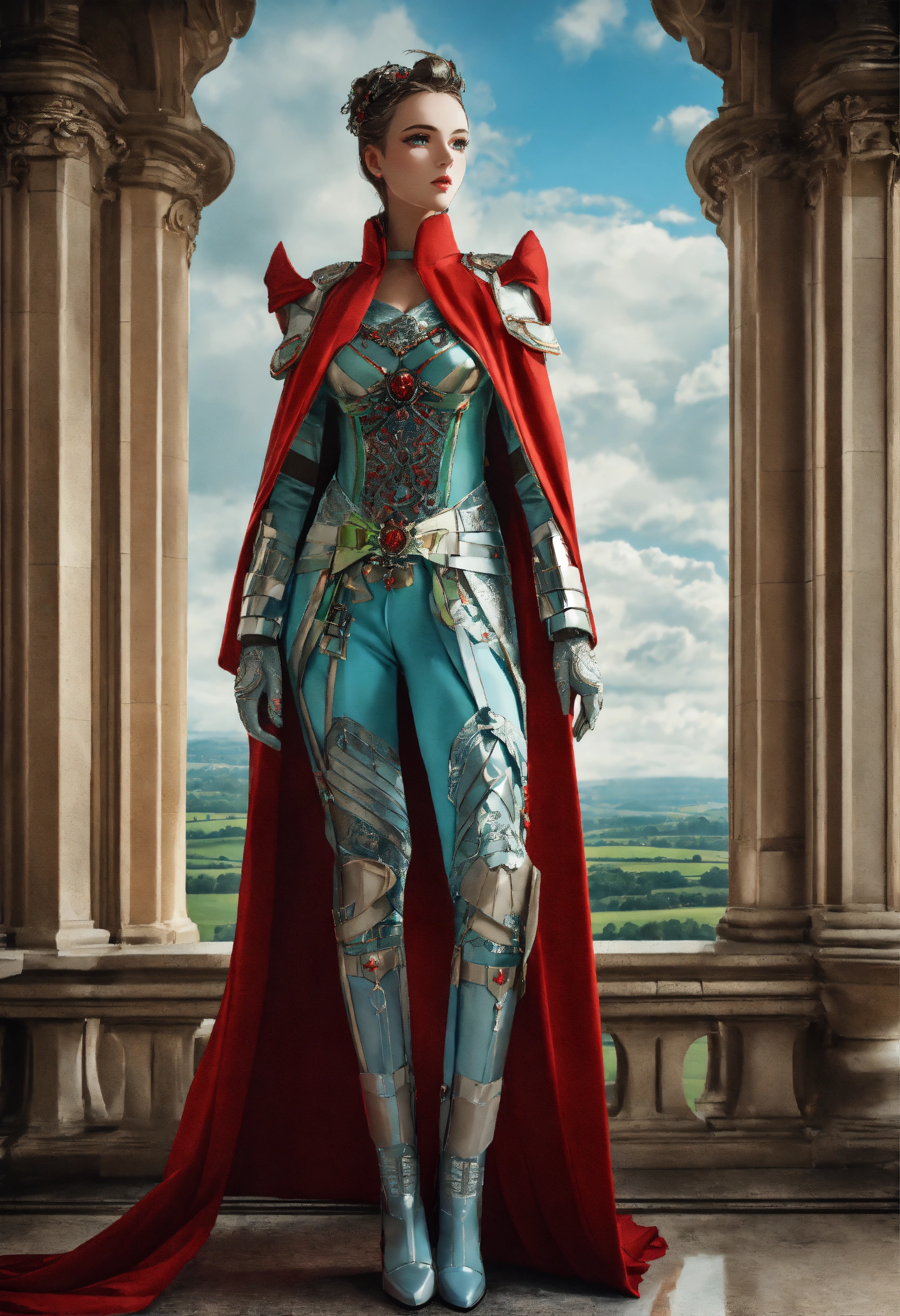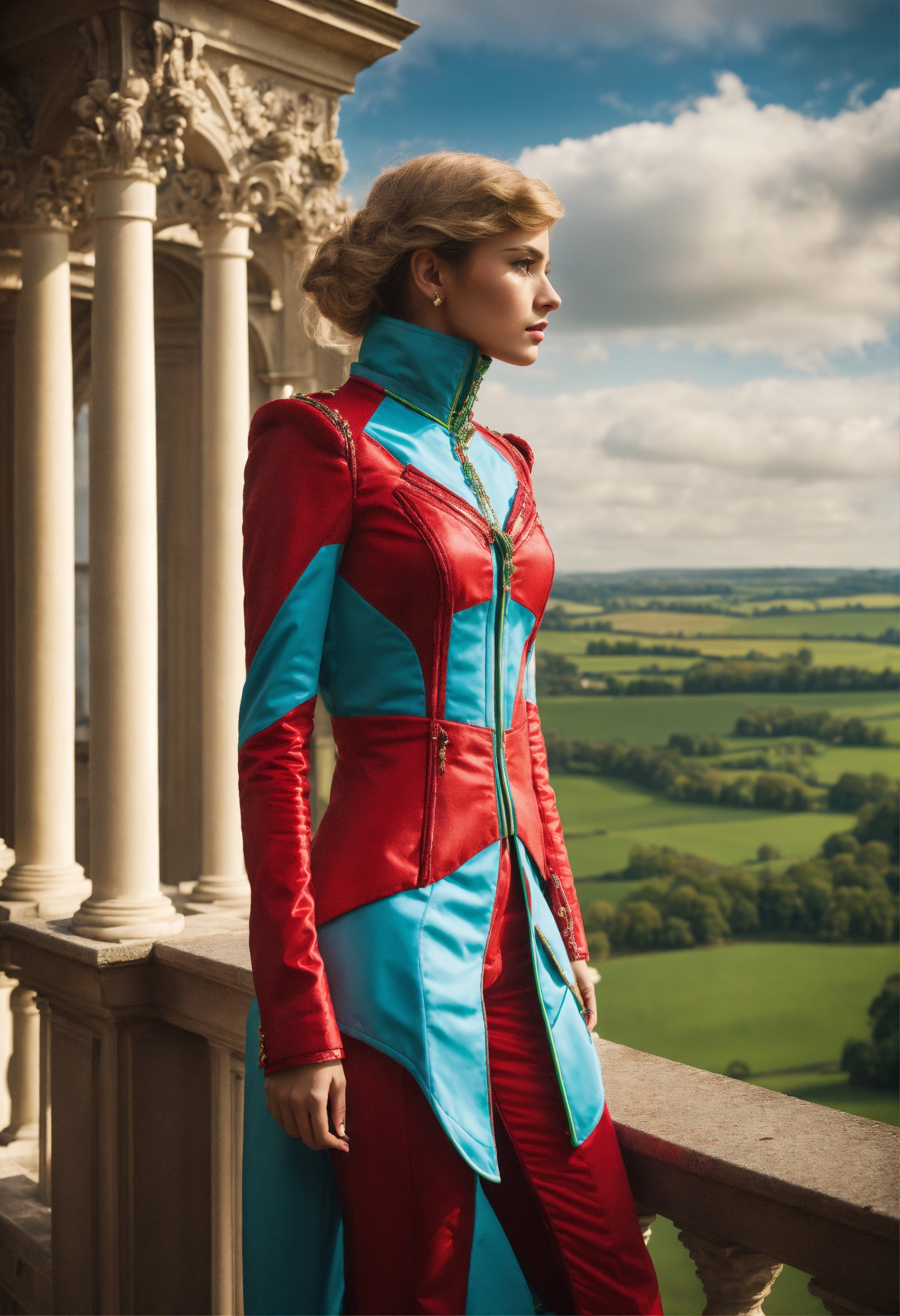 Highly detailed full body of a sci fi aristocrat, royalty, light blue and red and volt green futuristic outfit, standing on palace balcony overlooking the english countryside on a cloudy day, female, beautiful, 24 years old, highly detailed