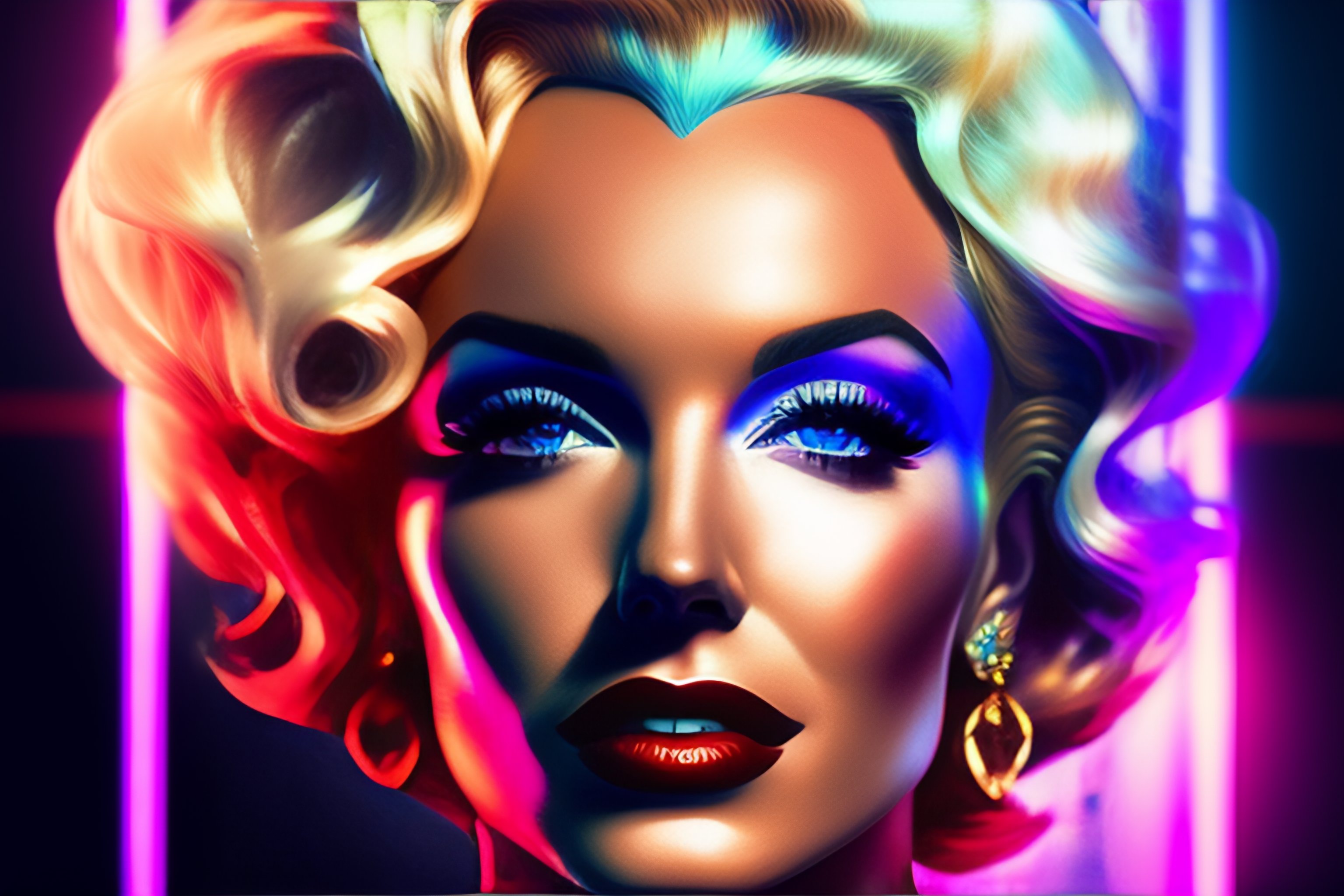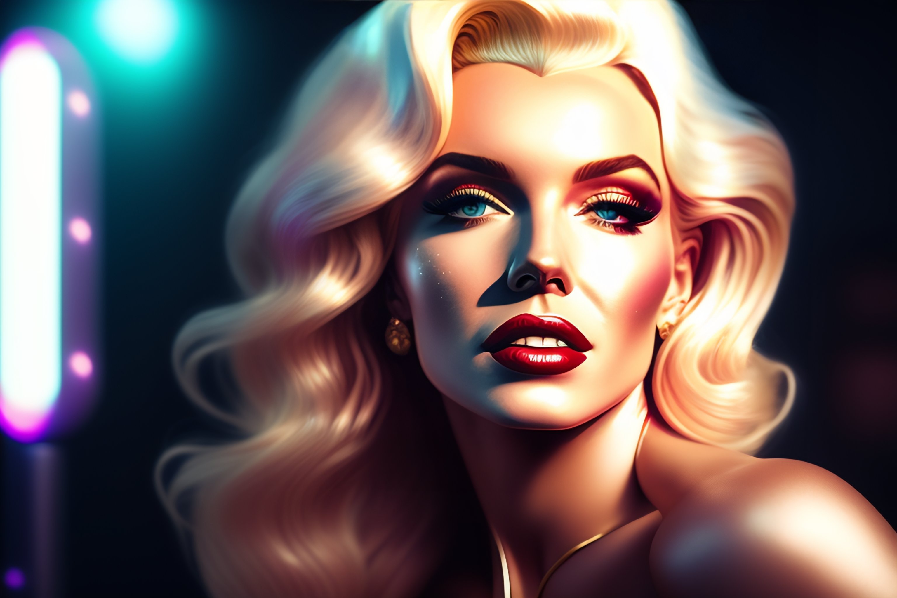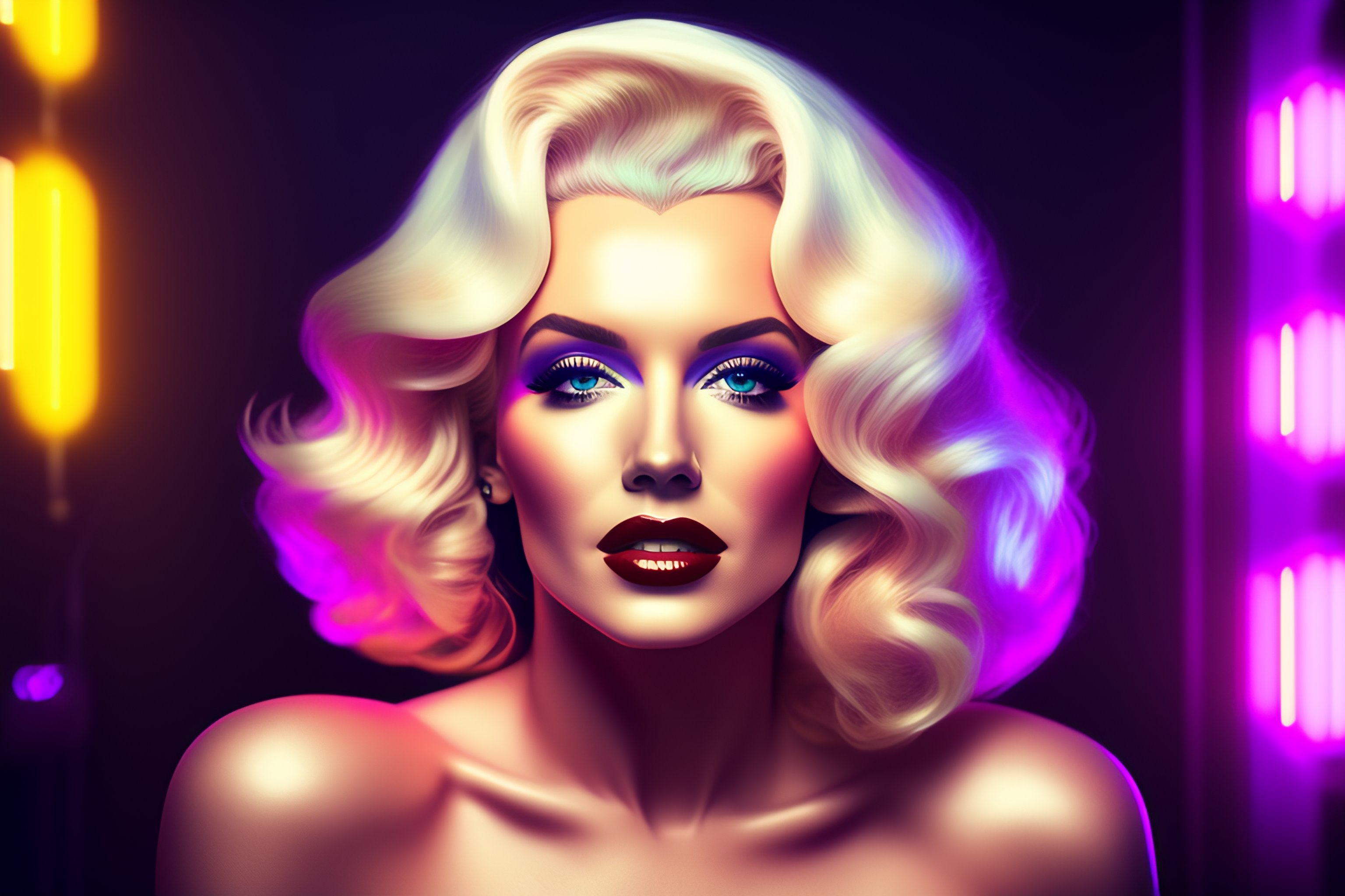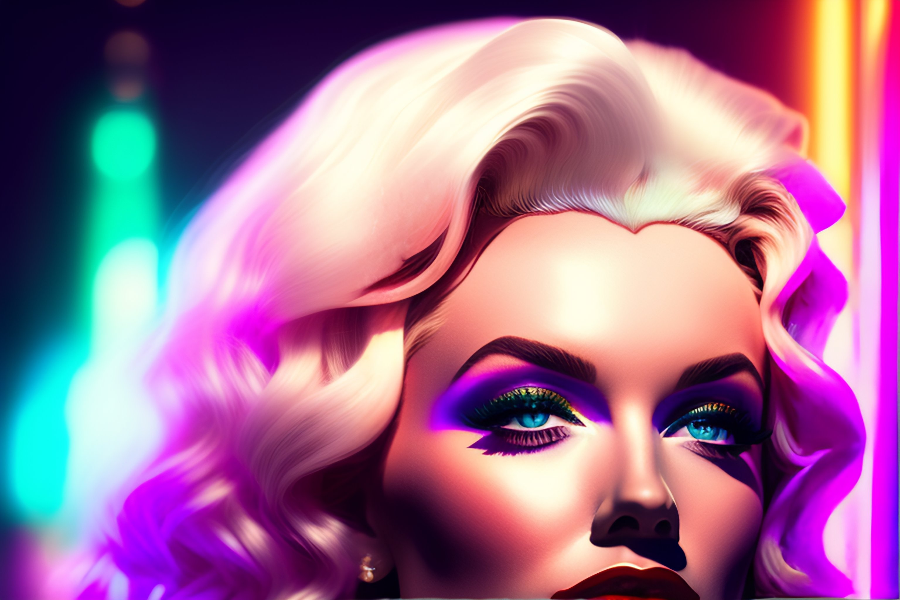 A portrait of marilyn monroe with long siver hair, cyber neon lightings, wide angle, highly detailed, cyberpunk high fashion, elegant, crispy quality, trending in artstation, trending in pinterest, glamor pose, no signature, no watermark, cinematic, octane render, art by artgerm, art by greg rutkowski, art by pascal blanche, andy warhol style