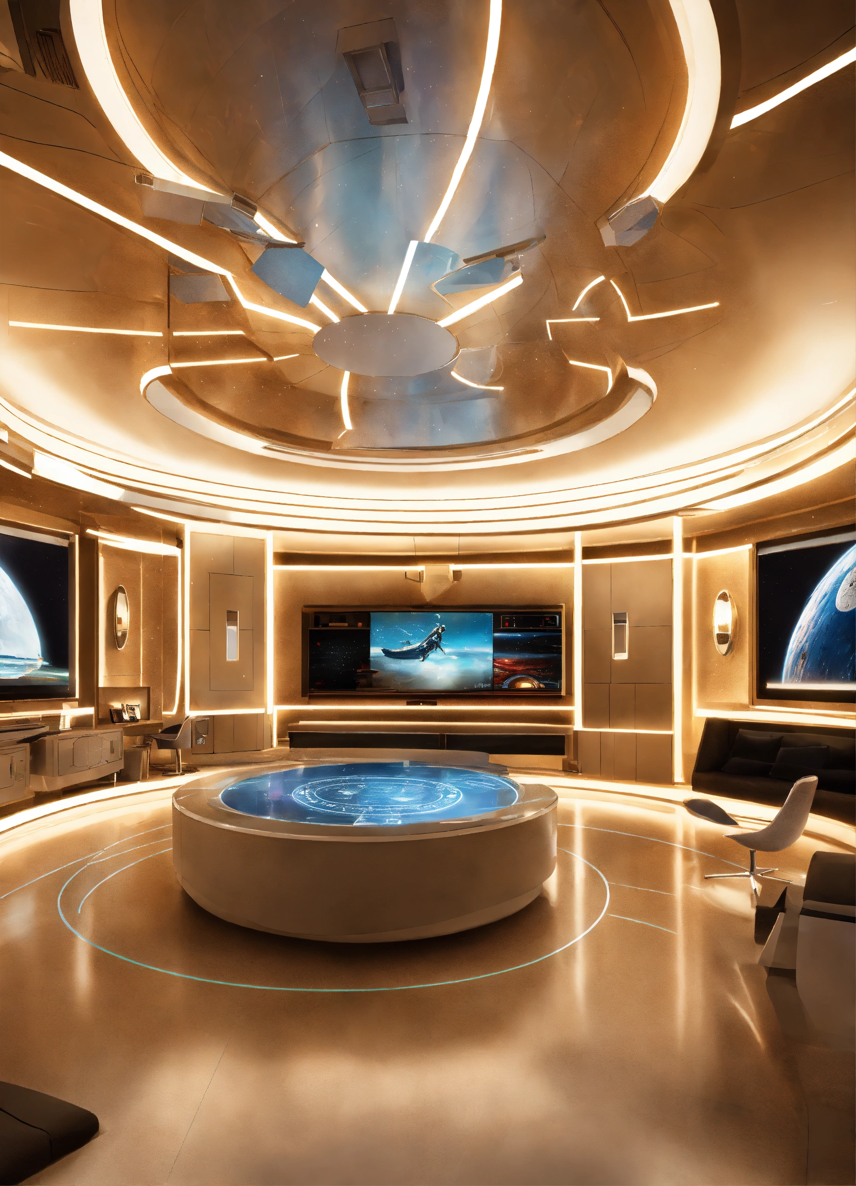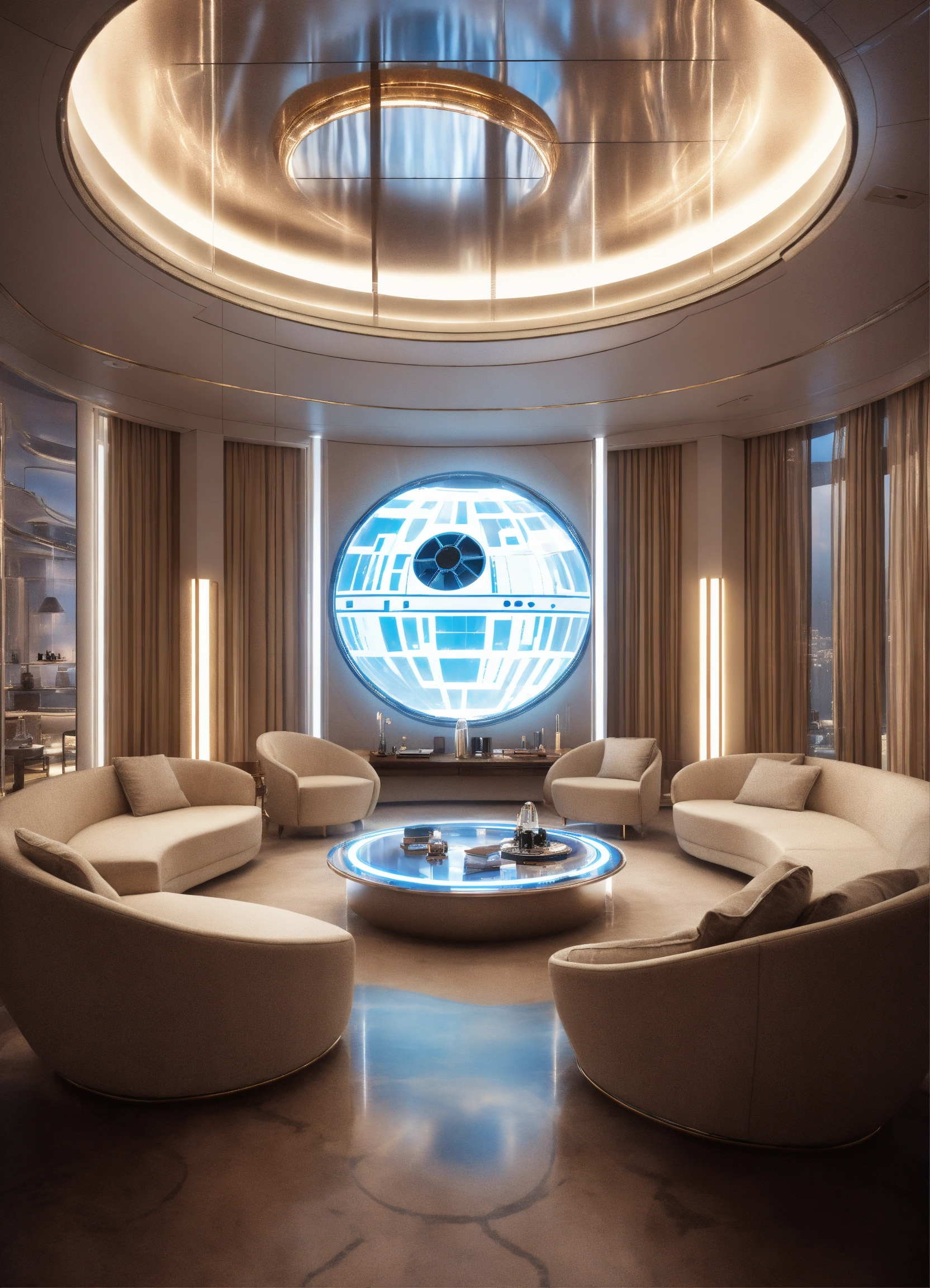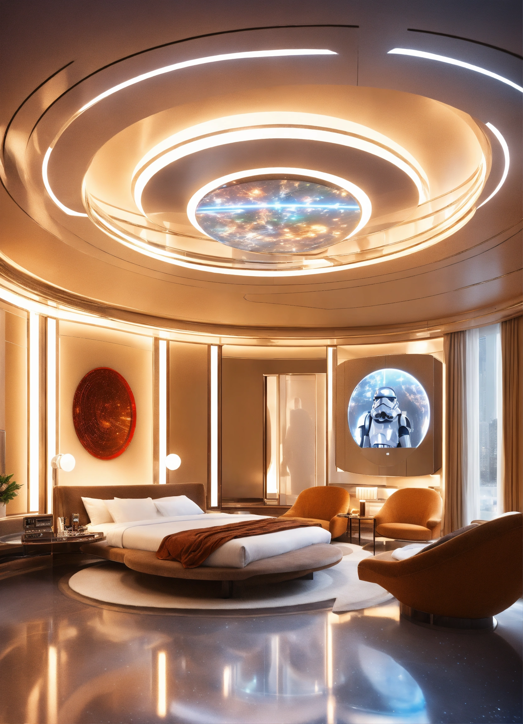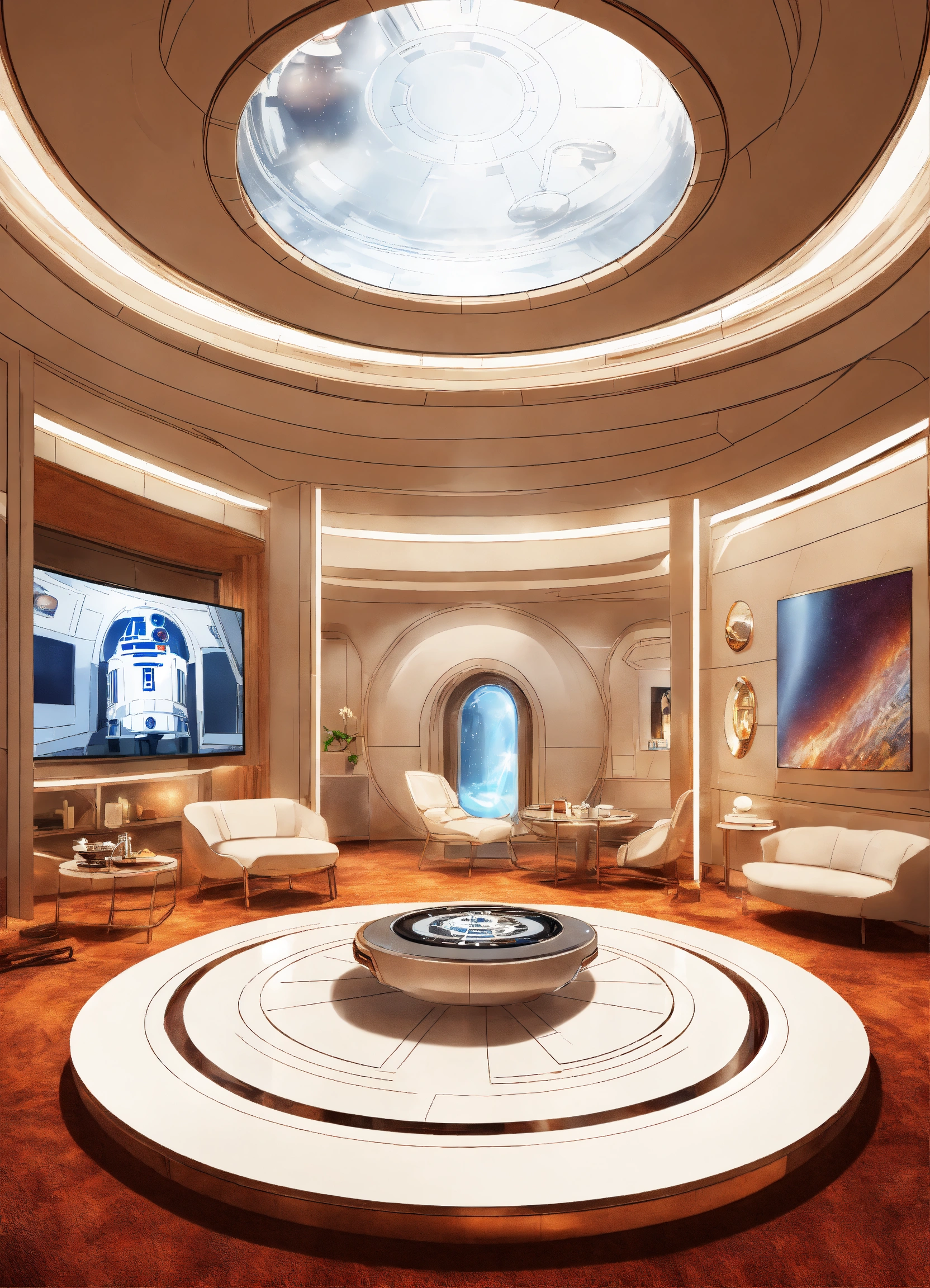 Digital art drawing of a white interior of a circular star wars luxury hotel suite, with a hologram television.