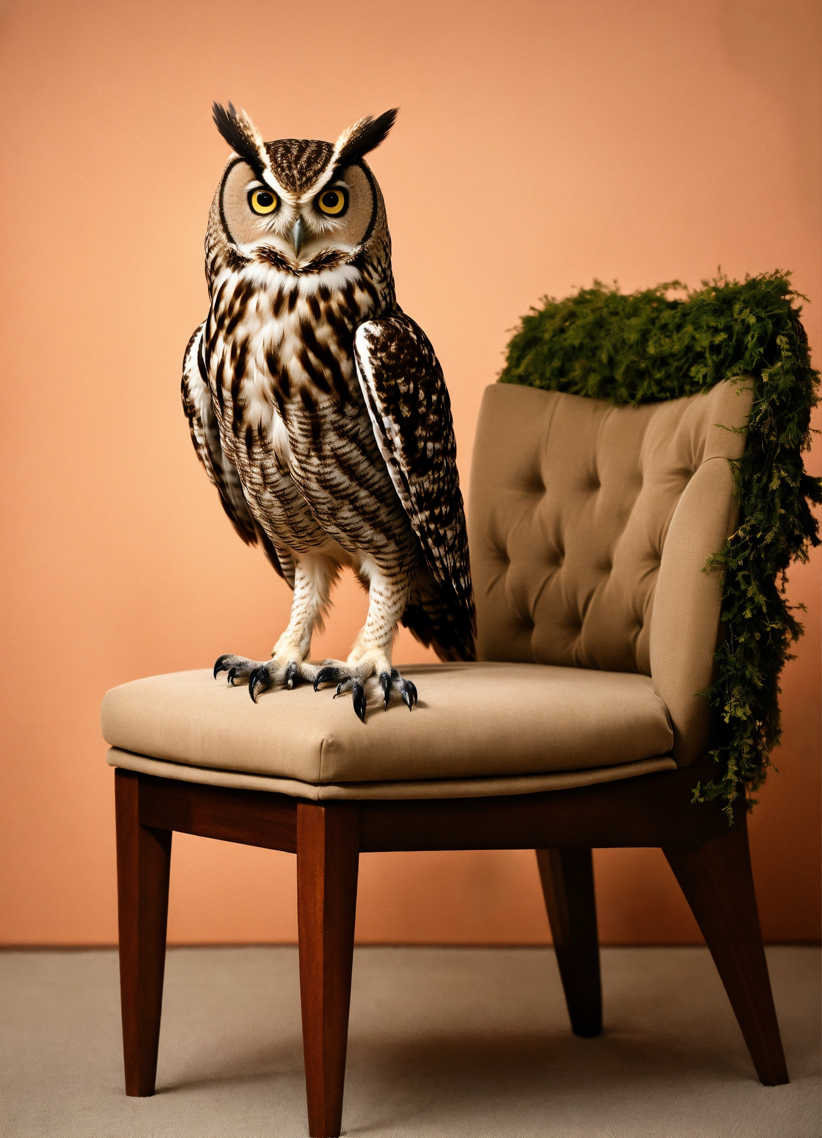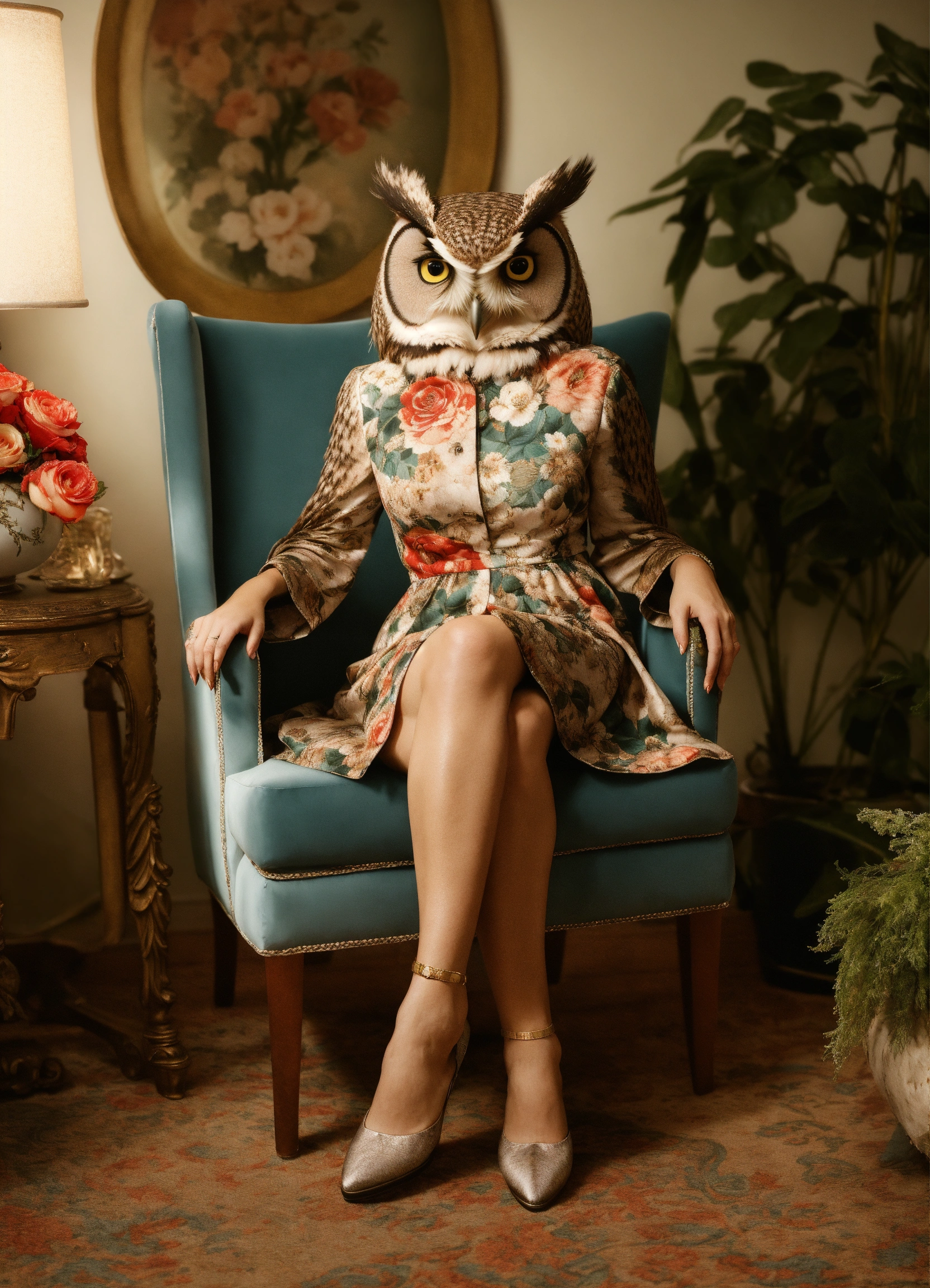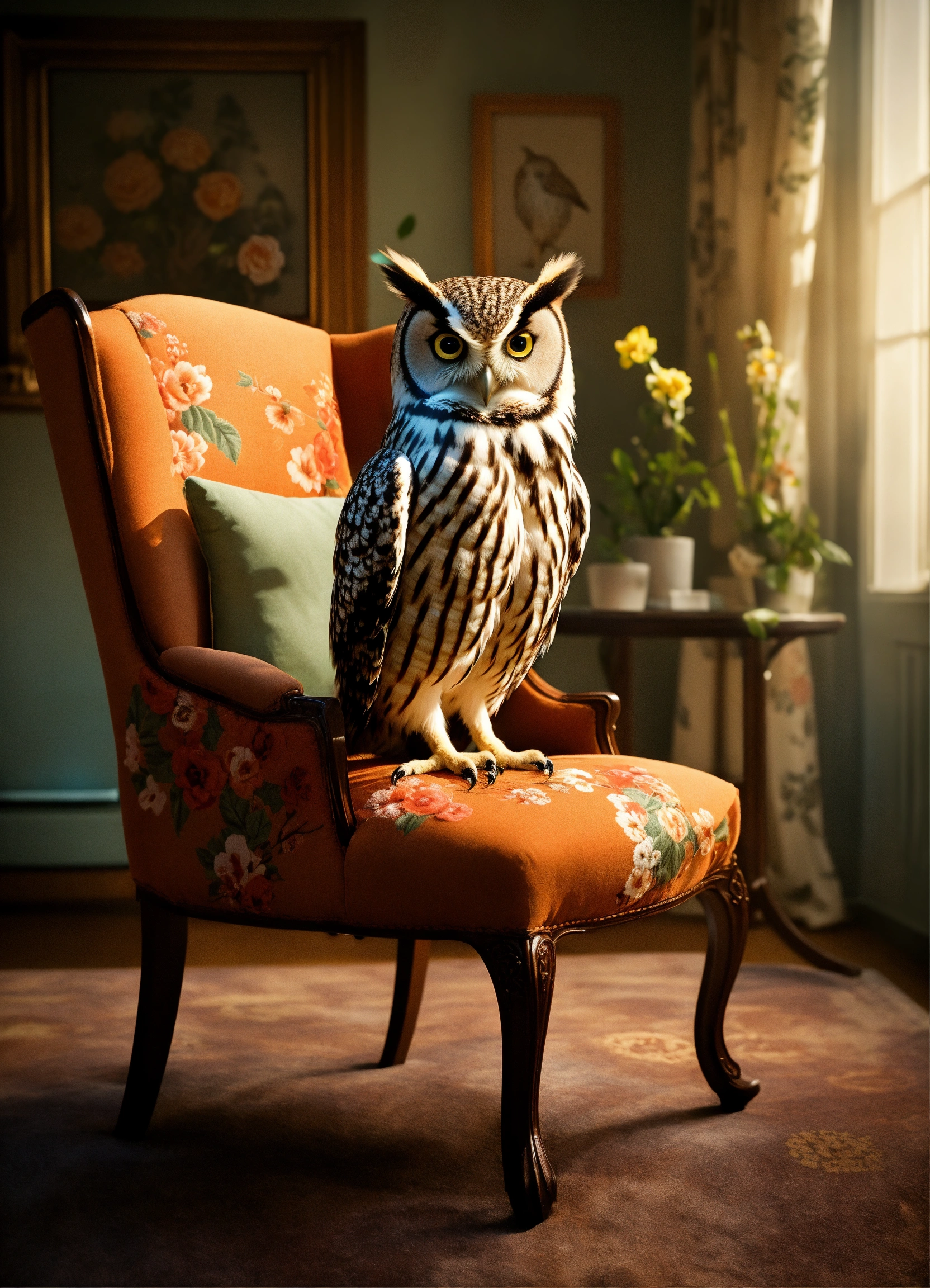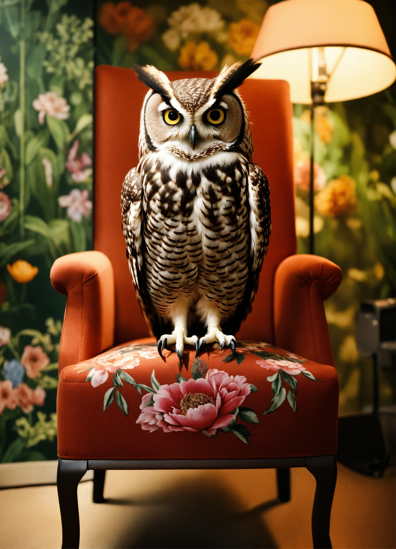 A photo realistic female owl dressed in a simple, casual mini dress with a floral design, sitting on a chair during an interview in a gretta van riel style, in a dynamic pose adressing her interviewer. anthropomorphic owl, intricate image, cinematic, daylite ambiance, tv minimalist studio decor, light colors, photo realistic but anthropomorphic
