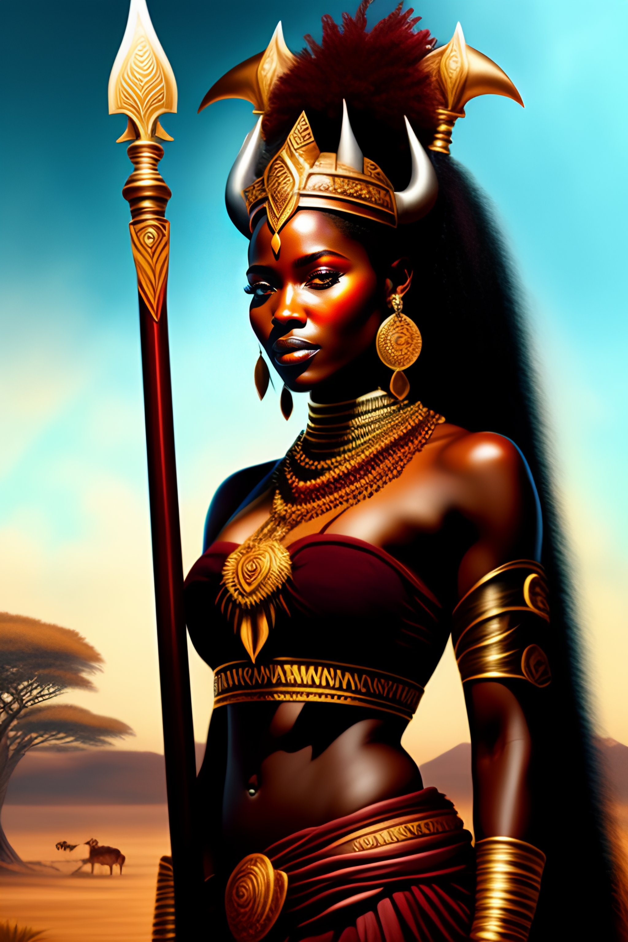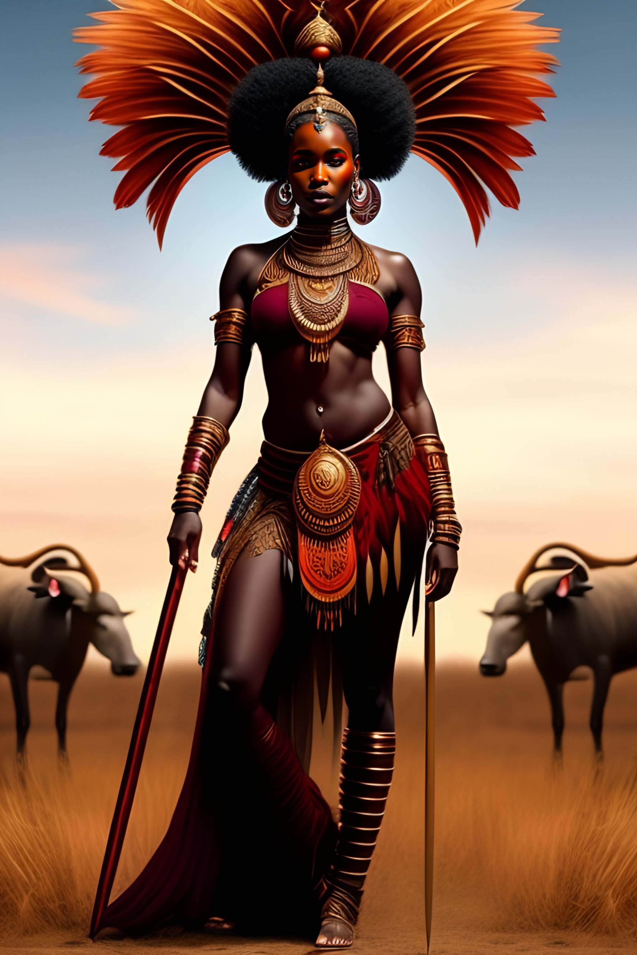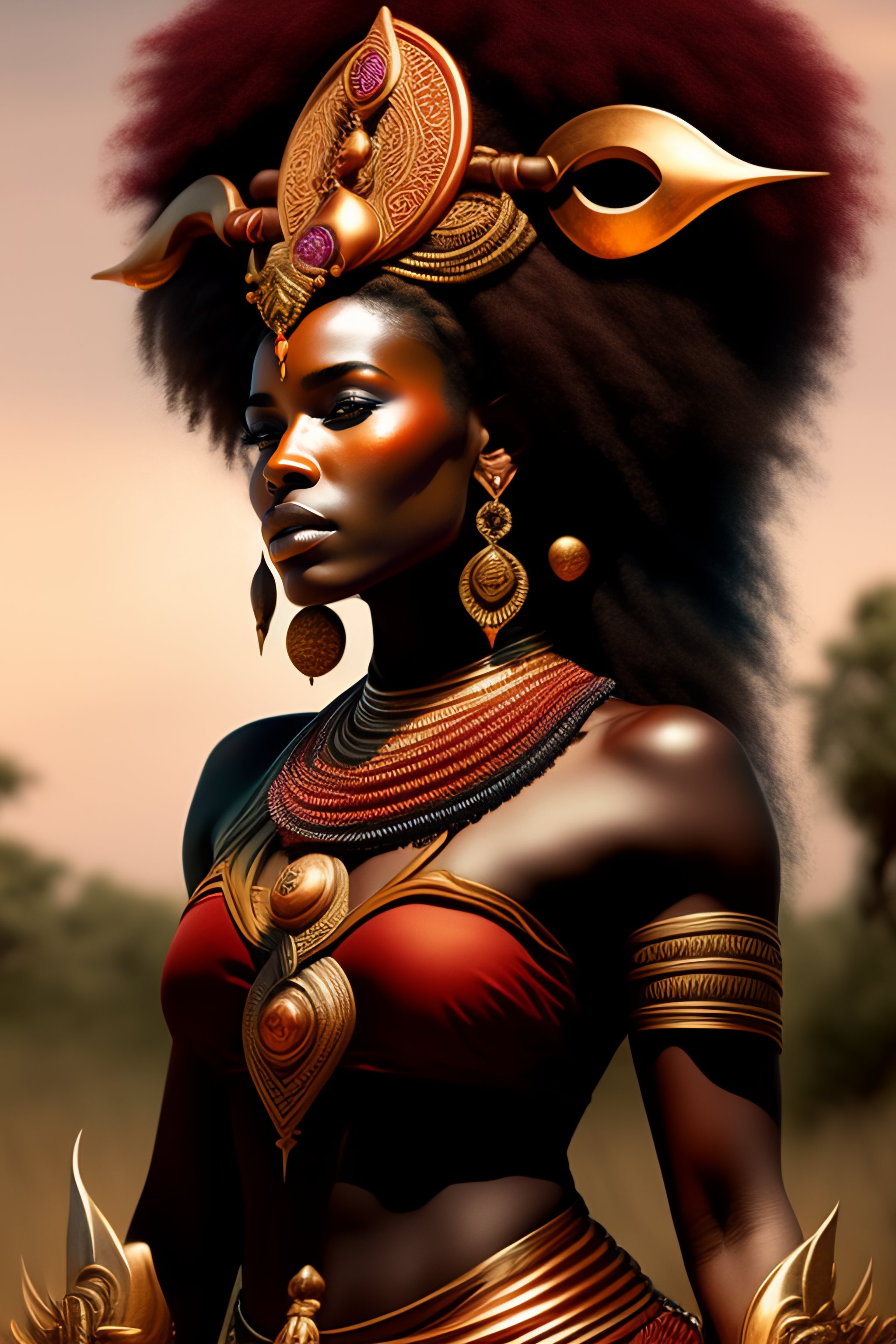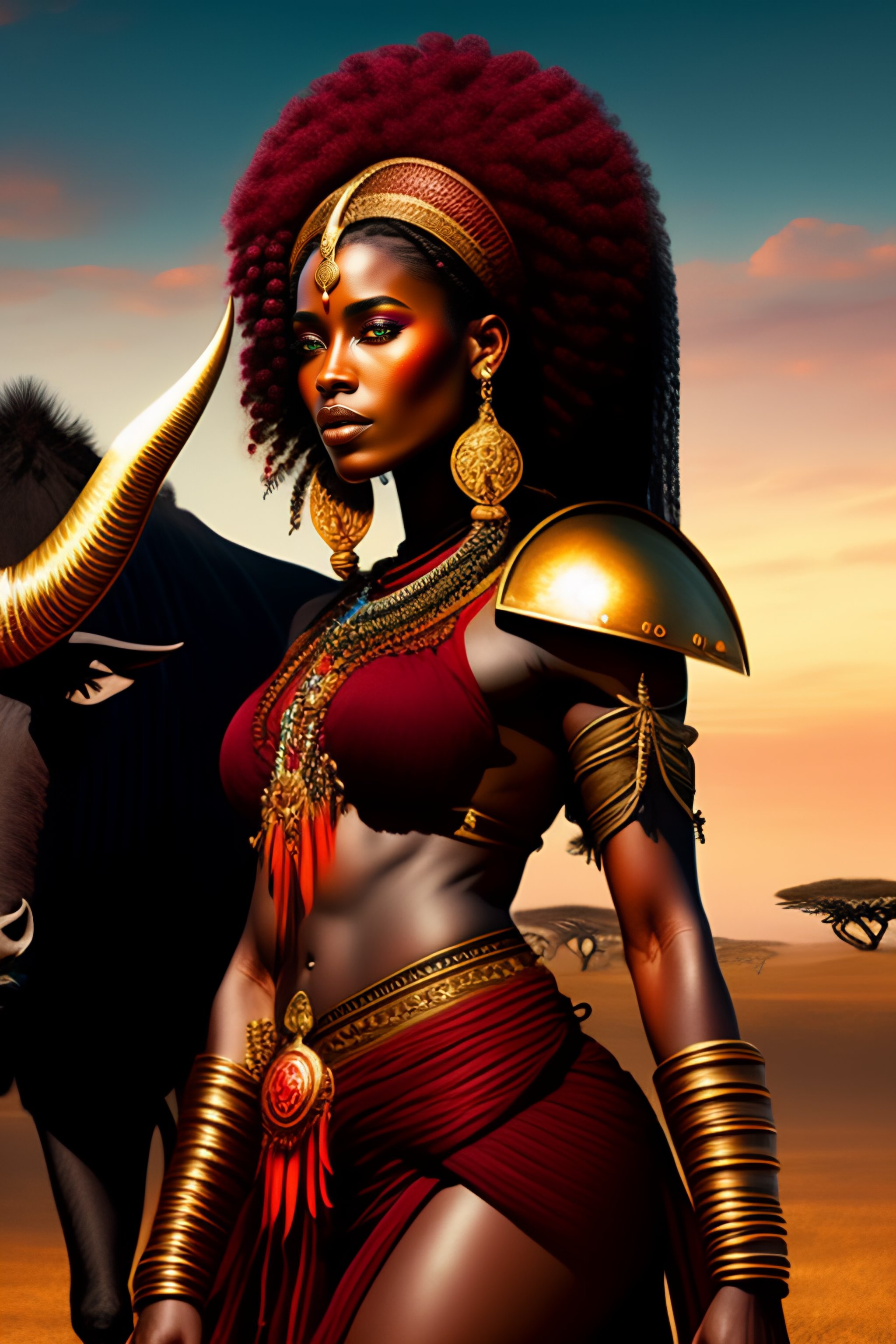 Beautiful african woman goddess of war, background with graveyard, woman wearing armor, wearing horns of a water buffalo, digital art hyper realistic acrylic paint full body, cypress, wearing copper maroon holding swords, oya orisha