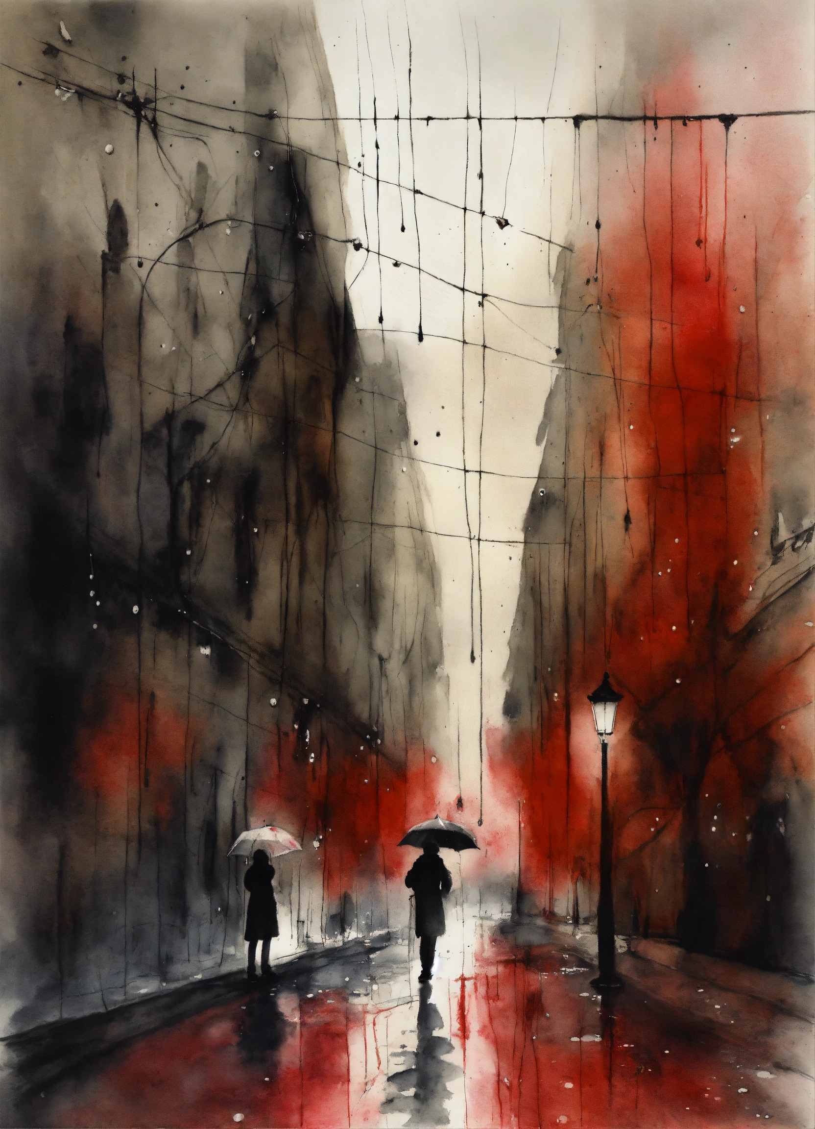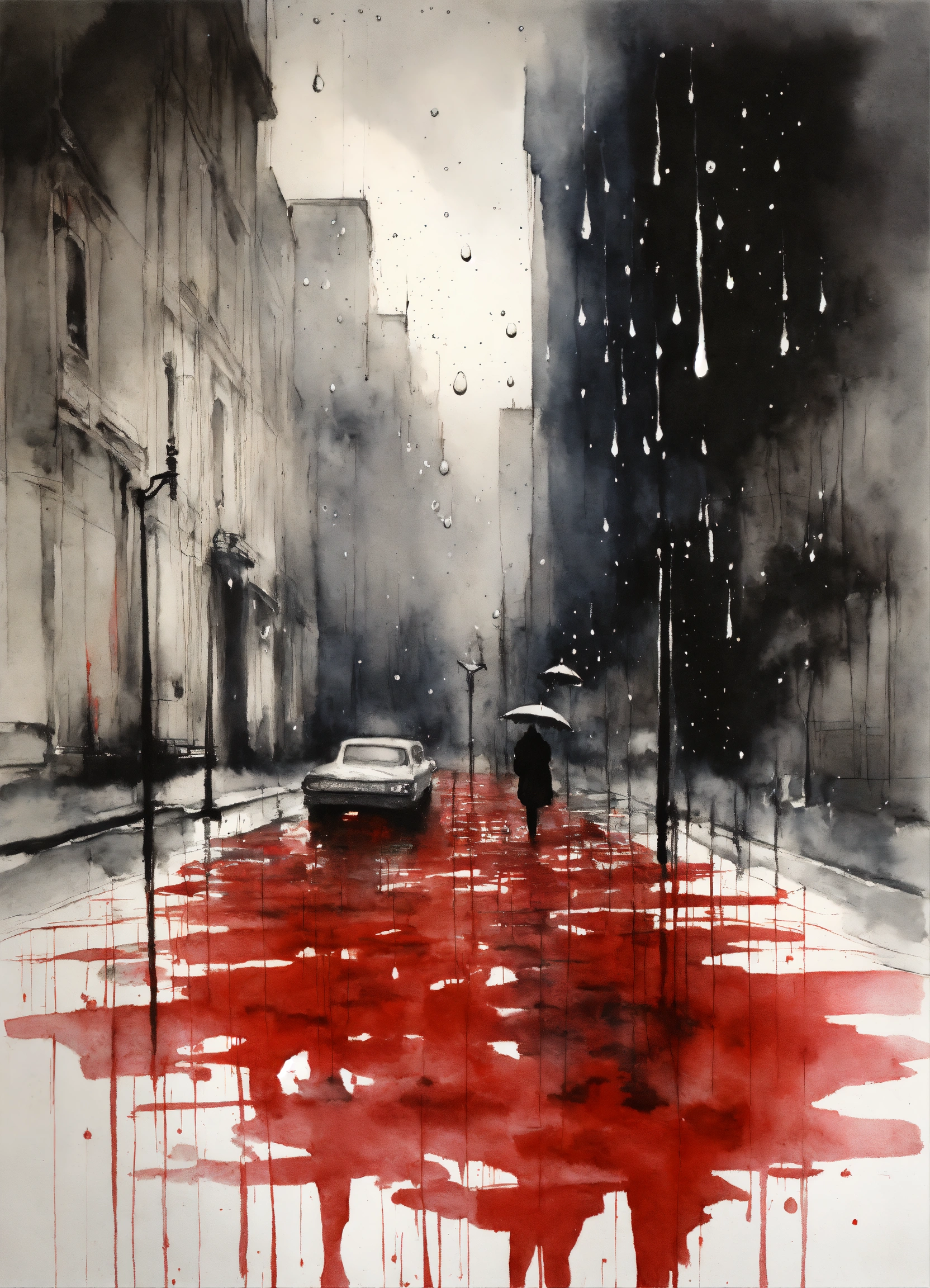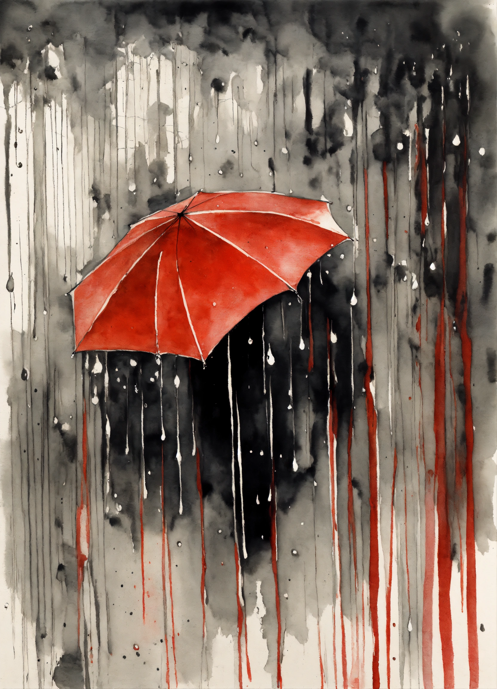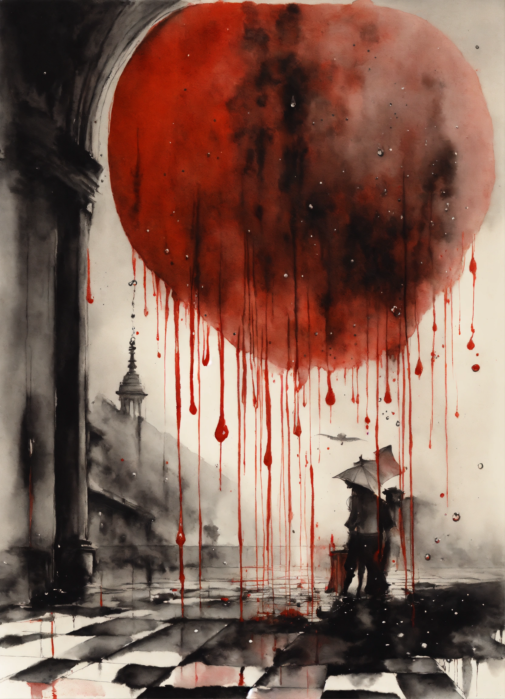 Stephen gammell style, dessin, aquarelle, aquarelles, noir et blanc et rouge, de marais, de sombres créatures, dégoulinant, the rain falling on the tiles large drops dripping