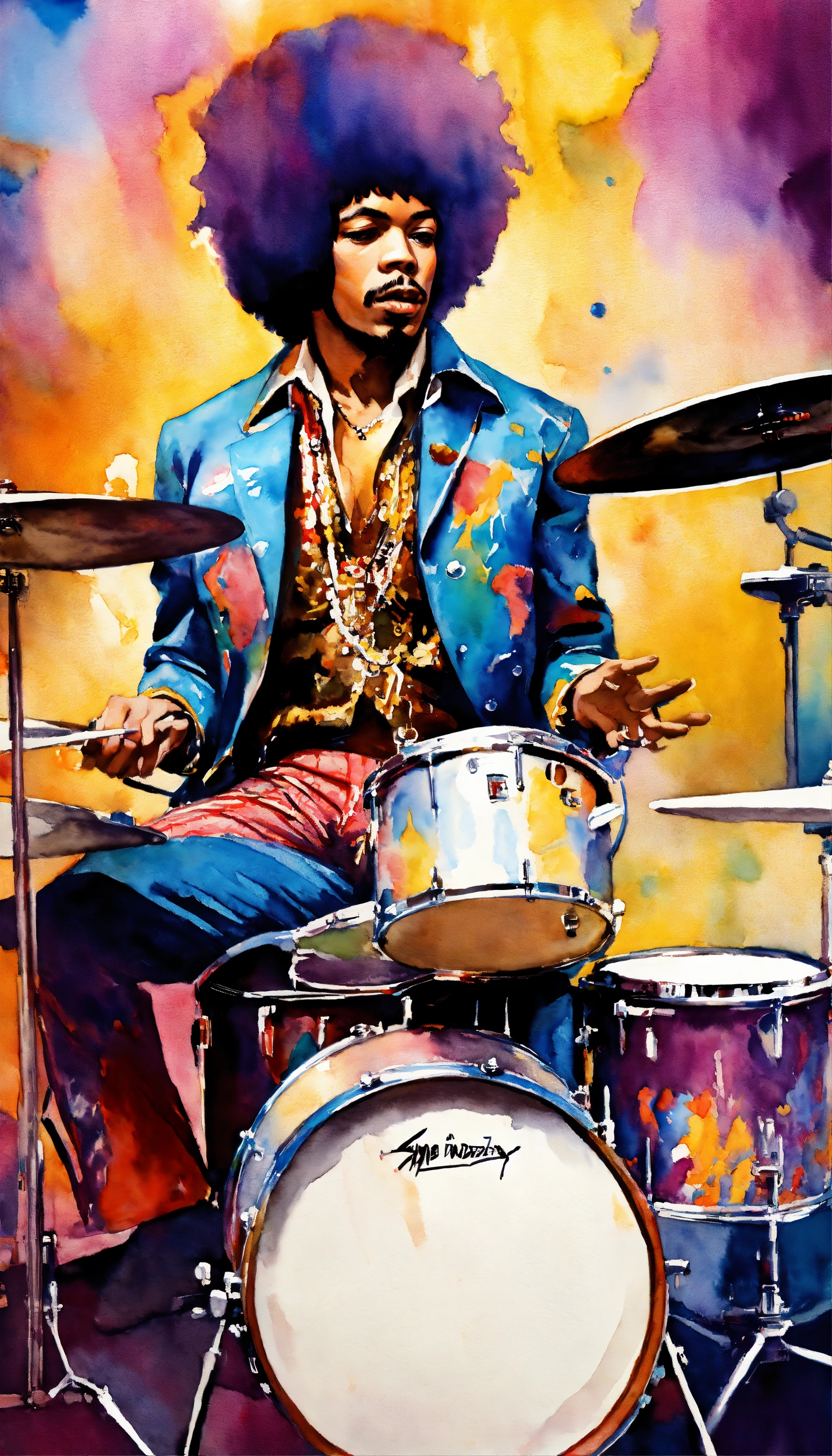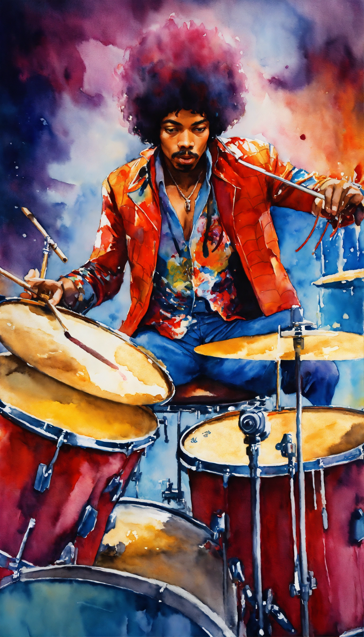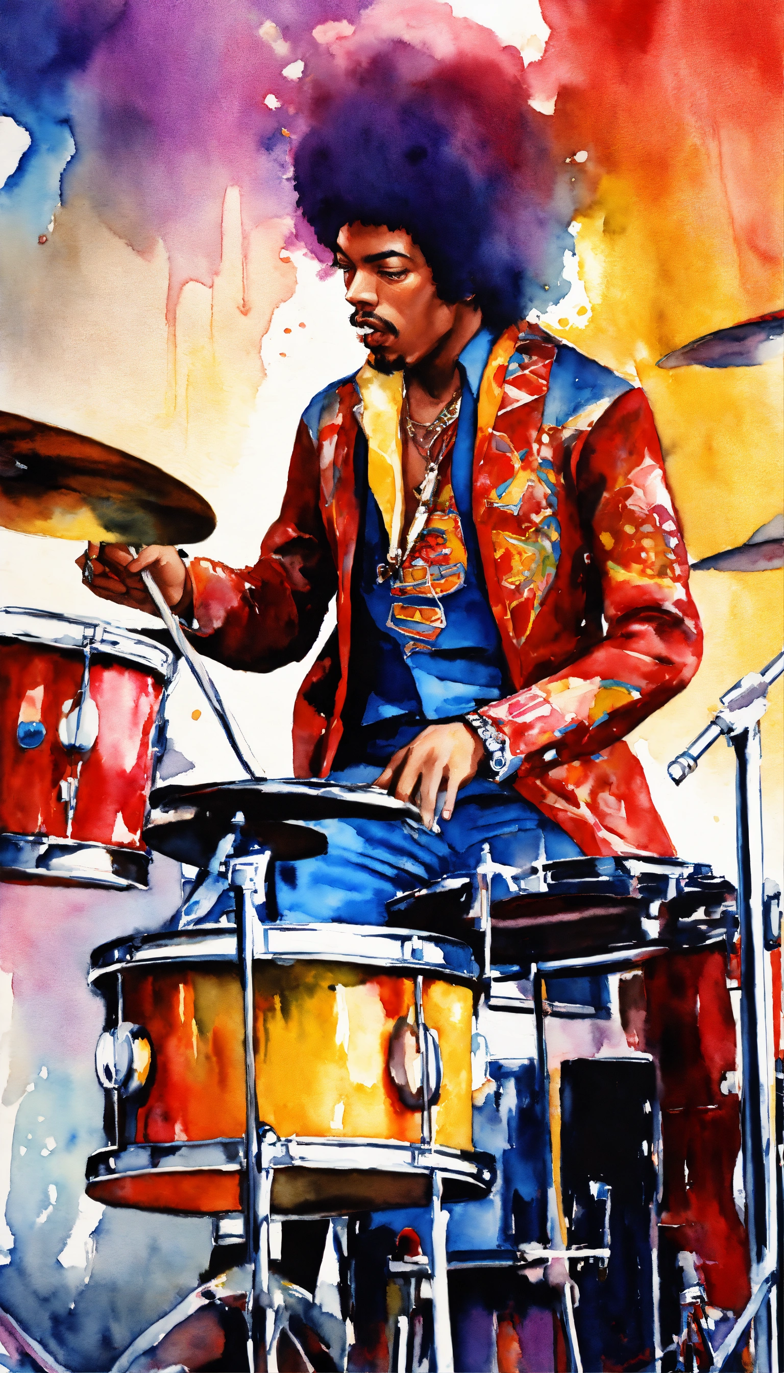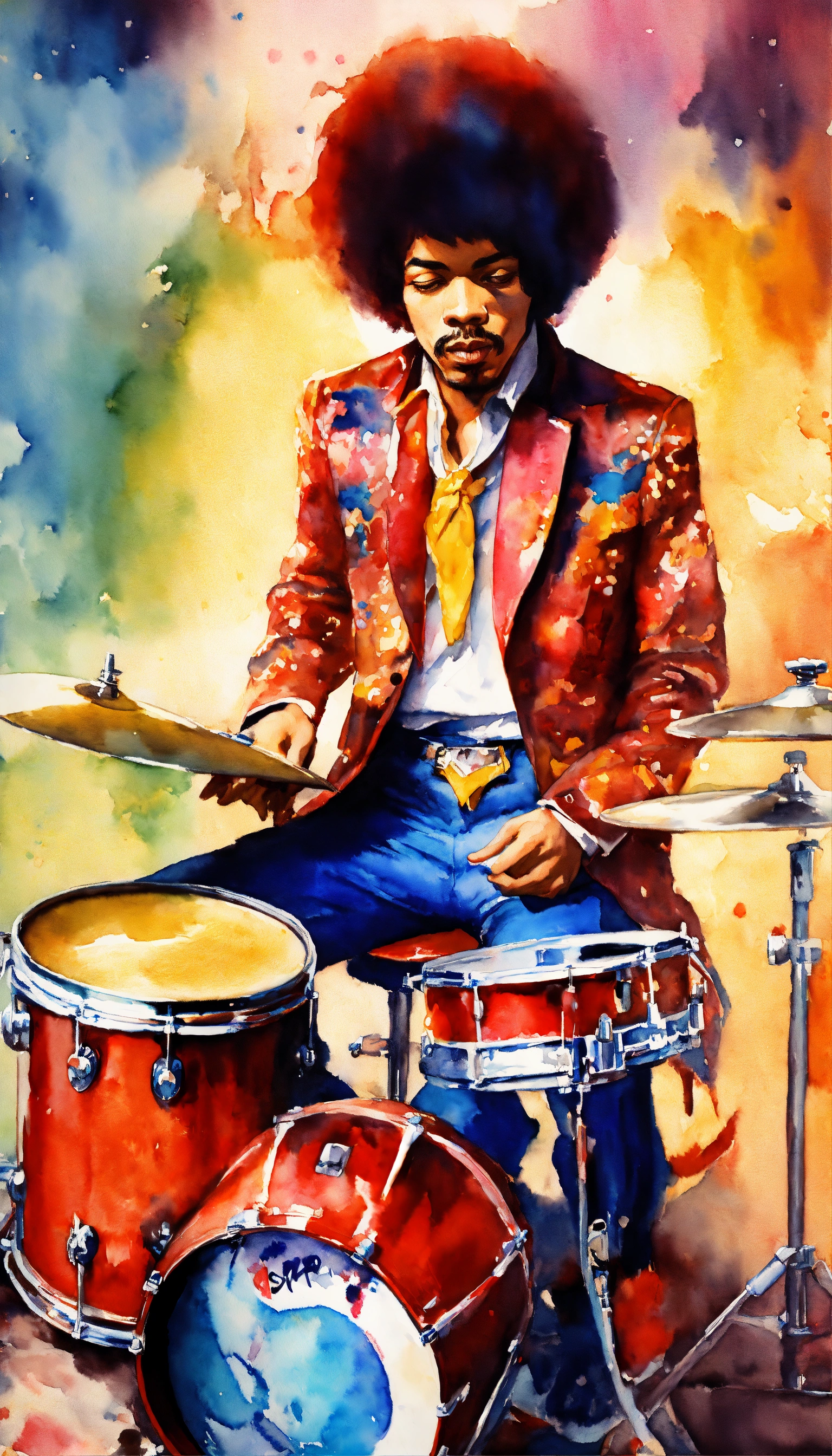 Masterpiece, fashion photoshoot, jimi hendrix as spiderman playing drums of band, detailed, colorful, energetic, futuristic, watercolor, 12k, cinematic