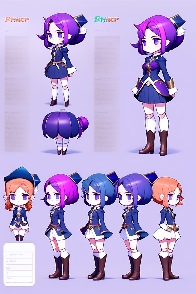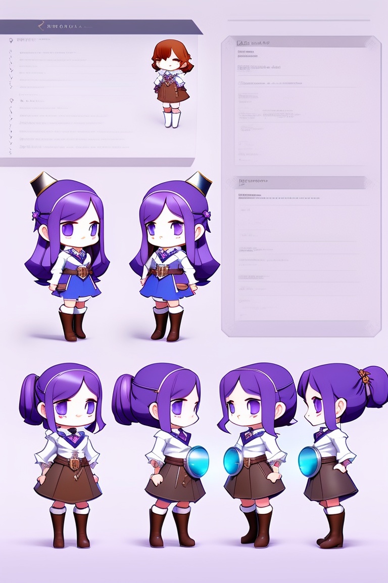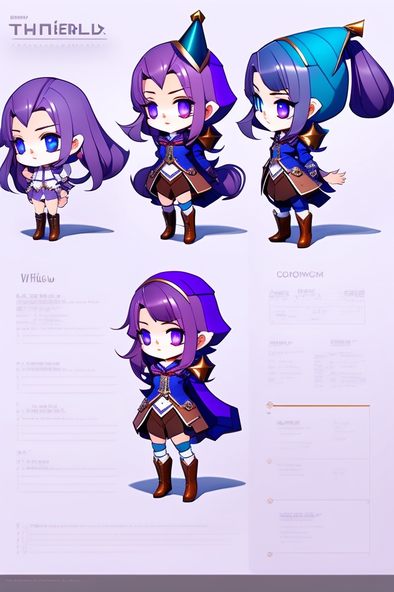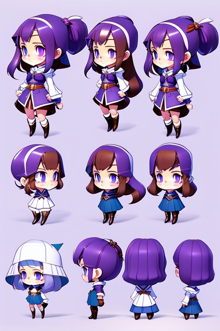 A character design reference sheet, cute chibi super deformed girl with purple hair and blue eyes, wizard, wearing a wizard hat, white corset, brown pants, knee-high boots, medium shot, best quality, high res, official art, standing, closed mouth, light smile, character sheet, model sheets, angles, reference, stylized, concept art, dynamic pose, full body, model sheet, turn around, full color, two thirds view, front view and back view. white background.