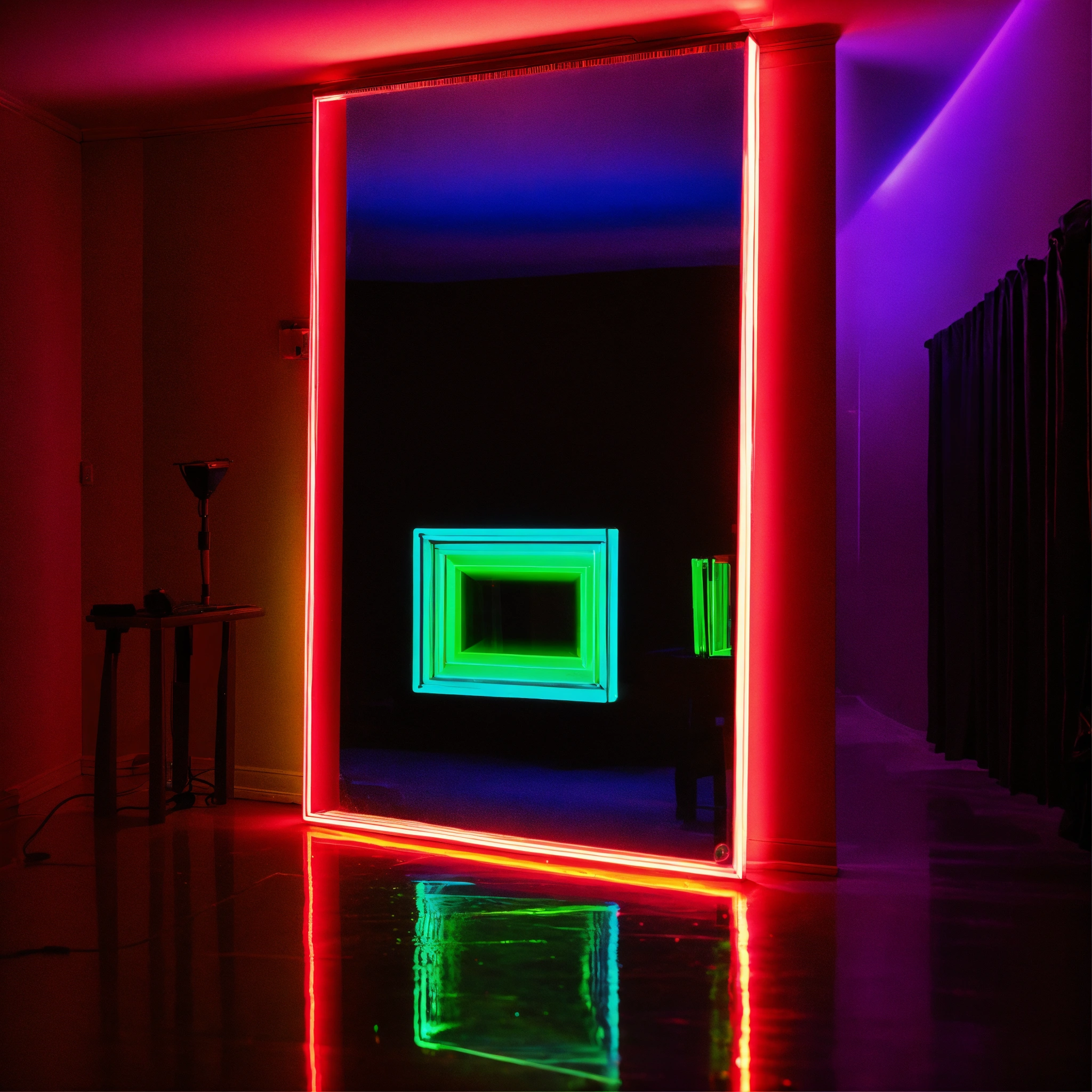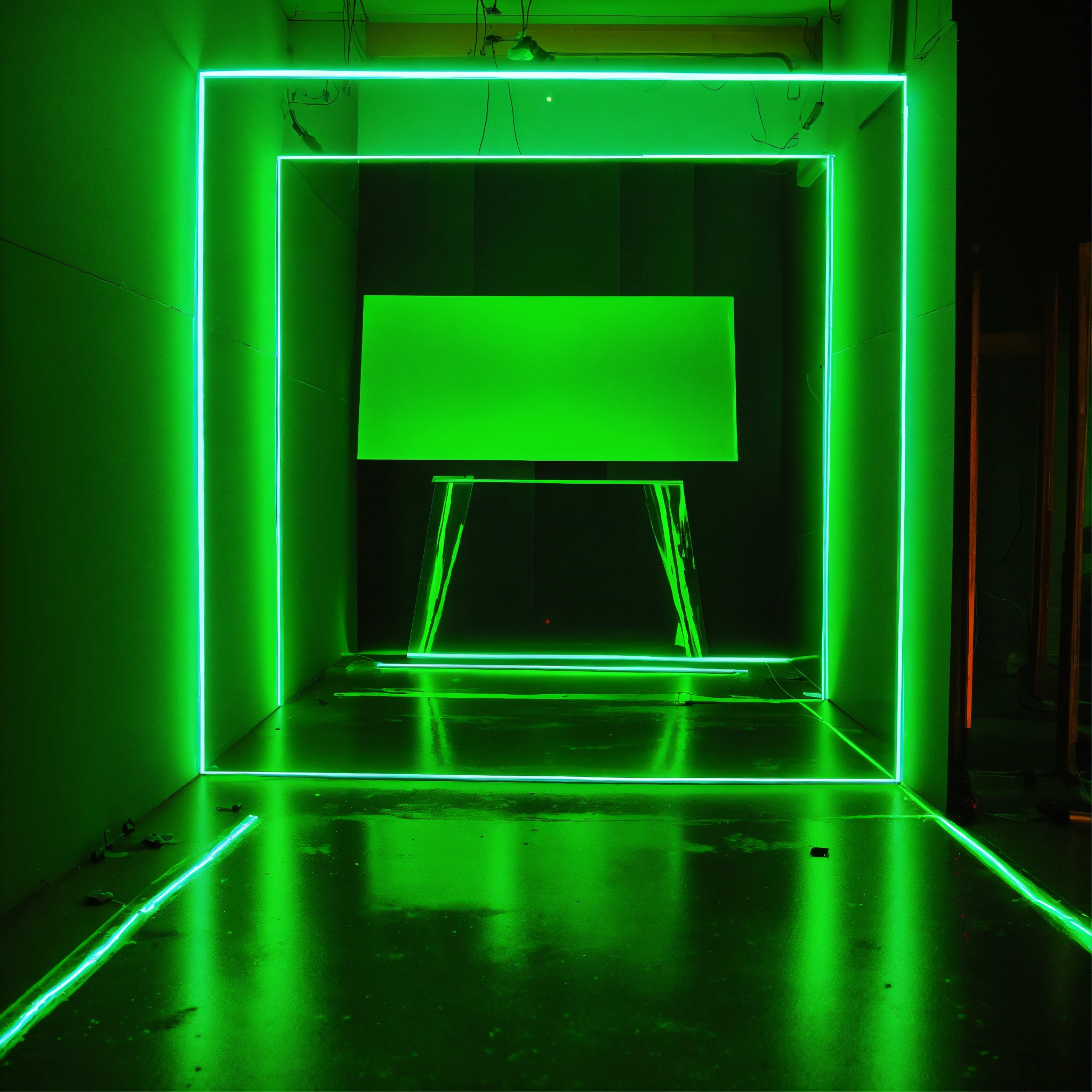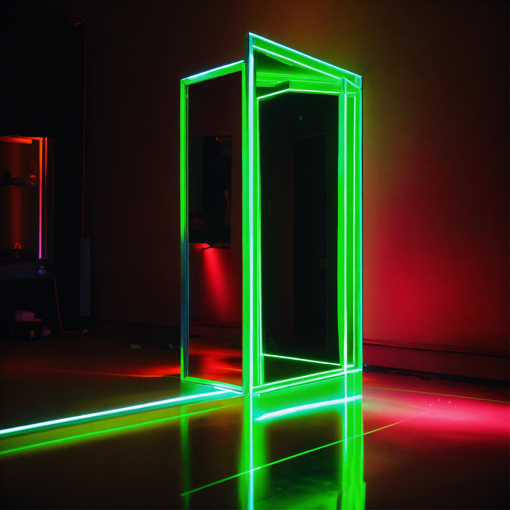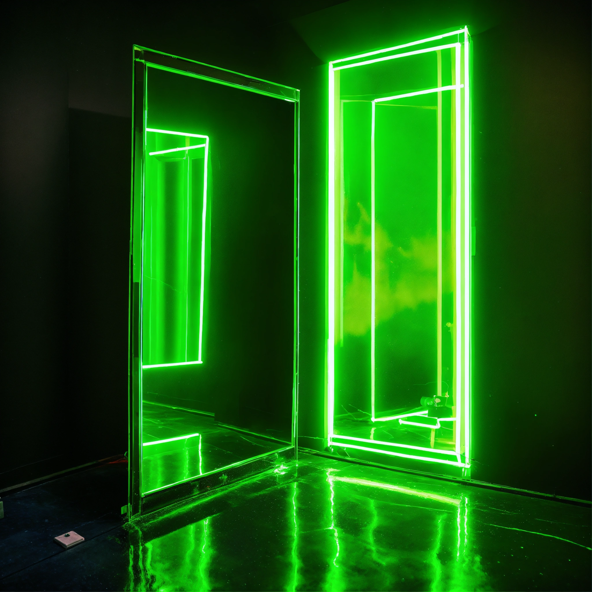 A neon green laser light prism passes through a mirror in a black room, on the other side of the mirror is water